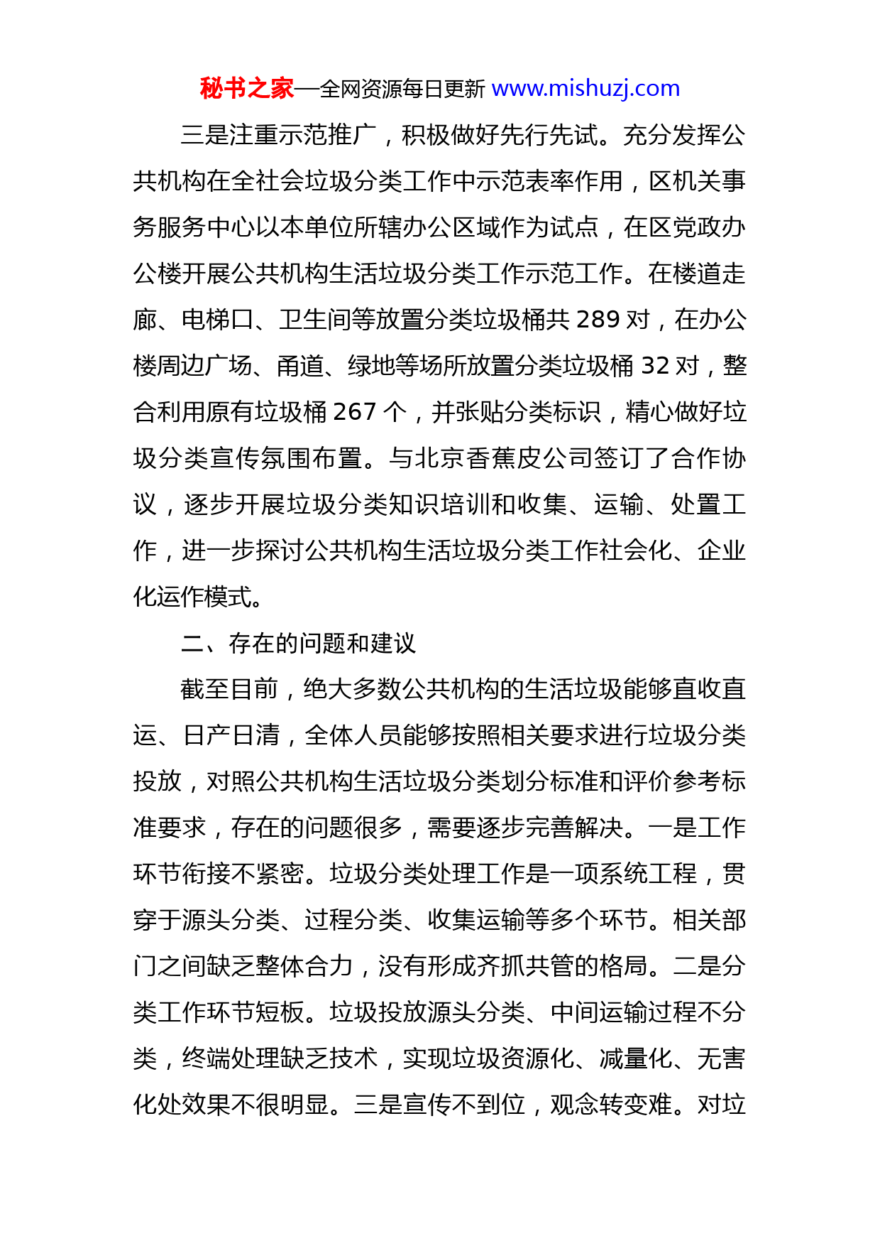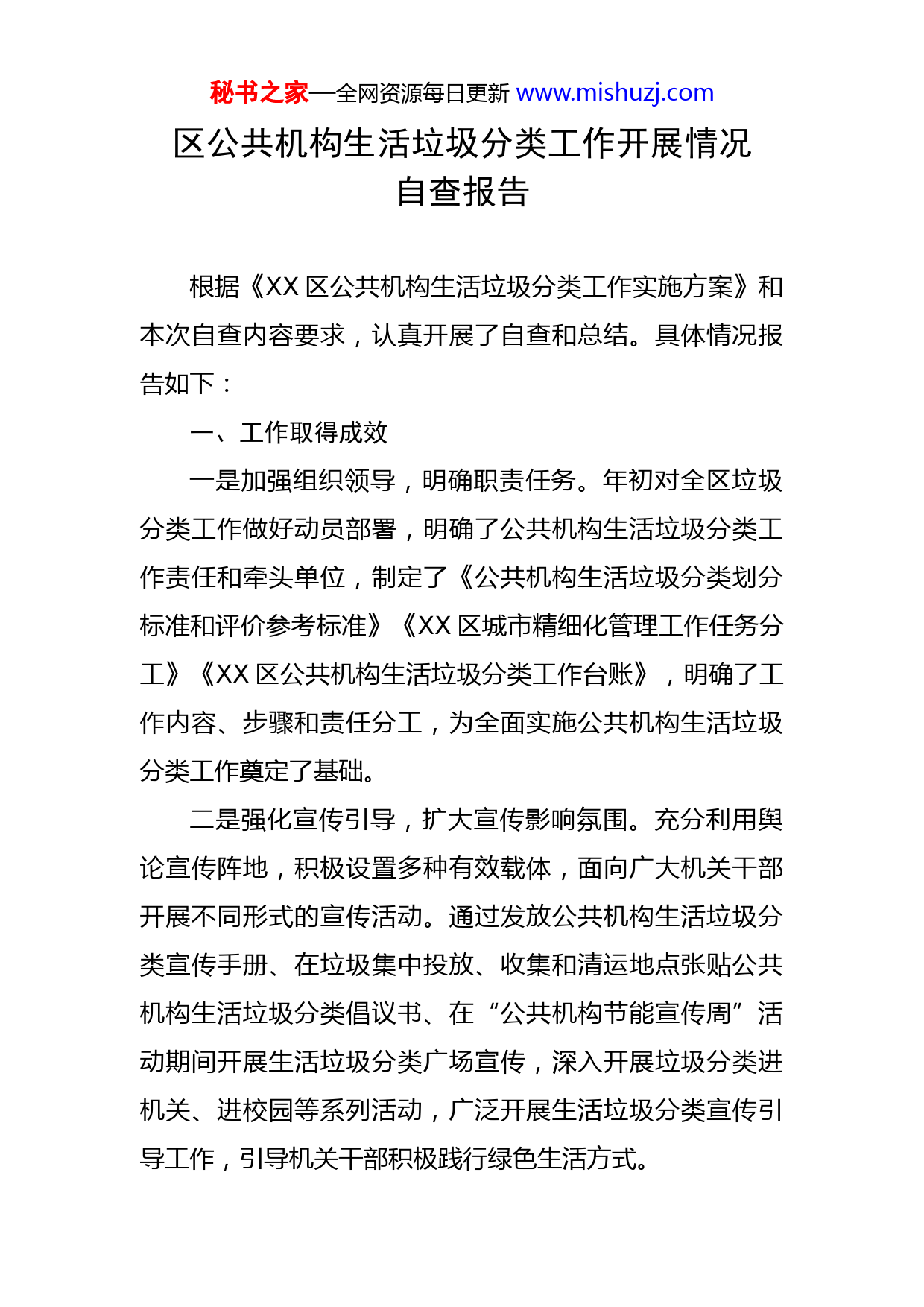 秘书之家—全网资源每日更新www.mishuzj.com区公共机构生活垃圾分类工作开展情况自查报告根据《XX区公共机构生活垃圾分类工作实施方案》和本次自查内容要求,认真开展了自查和总结。具体情况报告如下:一、工作取得成效一是加强组织领导,明确职责任务。年初对全区垃圾分类工作做好动员部署,明确了公共机构生活垃圾分类工作责任和牵头单位,制定了《公共机构生活垃圾分类划分标准和评价参考标准》《XX区城市精细化管理工作任务分工》《XX区公共机构生活垃圾分类工作台账》,明确了工作内容、步骤和责任分工,为全面实施公共机构生活垃圾分类工作奠定了基础。二是强化宣传引导,扩大宣传影响氛围。充分利用舆论宣传阵地,积极设置多种有效载体,面向广大机关干部开展不同形式的宣传活动。通过发放公共机构生活垃圾分类宣传手册、在垃圾集中投放、收集和清运地点张贴公共机构生活垃圾分类倡议书、在“公共机构节能宣传周”活动期间开展生活垃圾分类广场宣传,深入开展垃圾分类进机关、进校园等系列活动,广泛开展生活垃圾分类宣传引导工作,引导机关干部积极践行绿色生活方式。秘书之家—全网资源每日更新www.mishuzj.com三是注重示范推广,积极做好先行先试。充分发挥公共机构在全社会垃圾分类工作中示范表率作用,区机关事务服务中心以本单位所辖办公区域作为试点,在区党政办公楼开展公共机构生活垃圾分类工作示范工作。在楼道走廊、电梯口、卫生间等放置分类垃圾桶共289对,在办公楼周边广场、甬道、绿地等场所放置分类垃圾桶32对,整合利用原有垃圾桶267个,并张贴分类标识,精心做好垃圾分类宣传氛围布置。与北京香蕉皮公司签订了合作协议,逐步开展垃圾分类知识培训和收集、运输、处置工作,进一步探讨公共机构生活垃圾分类工作社会化、企业化运作模式。二、存在的问题和建议截至目前,绝大多数公共机构的生活垃圾能够直收直运、日产日清,全体人员能够按照相关要求进行垃圾分类投放,对照公共机构生活垃圾分类划分标准和评价参考标准要求,存在的问题很多,需要逐步完善解决。一是工作环节衔接不紧密。垃圾分类处理工作是一项系统工程,贯穿于源头分类、过程分类、收集运输等多个环节。相关部门之间缺乏整体合力,没有形成齐抓共管的格局。二是分类工作环节短板。垃圾投放源头分类、中间运输过程不分类,终端处理缺乏技术,实现垃圾资源化、减量化、无害化处效果不很明显。三是宣传不到位,观念转变难。对垃秘书之家—全网资源每日更新www.mishuzj.com圾分类知识知晓率较低,传统习惯仍然主导着日常生活,没有牢固树立垃圾分类的思想观念。在今后的工作中不断改进:一是进一步加大宣传引导力度。继续深入开展业务培训等形式多样的宣传教育活动,在机关内部营造良好的垃圾分类减量氛围。二是进一步加大日常执行力度。对少数职工参与垃圾分类的主动性不足、分类投放质量较差的情况,及时进行现场提醒、劝导,使广大工作人员入心入脑,形成自觉。三是党员干部示范先行。开展“垃圾分类、党员先行”主题党日活动,按照全区公共机构生活垃圾分类相关精神,进一步加大宣传力度,采取更有力的措施,确保各单位生活垃圾分类工作做精做细,在全区起到示范作用。