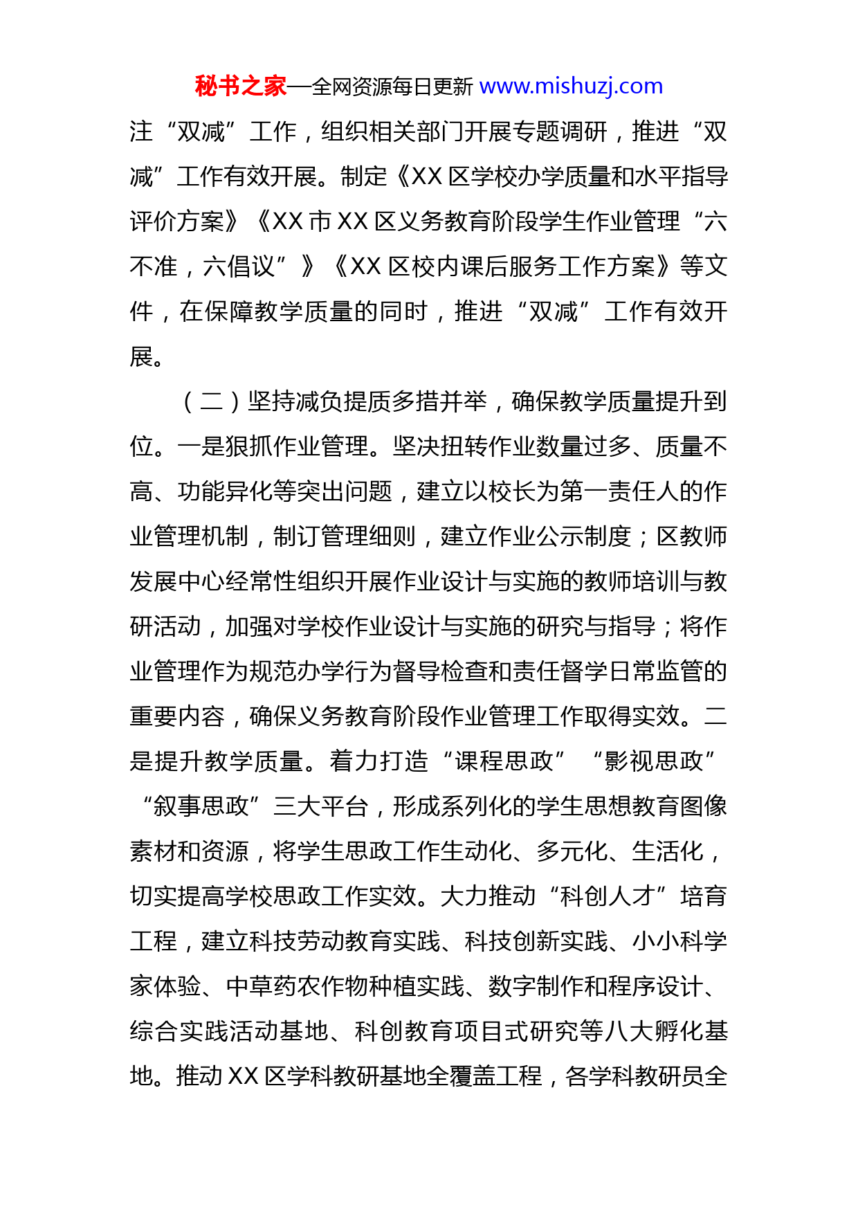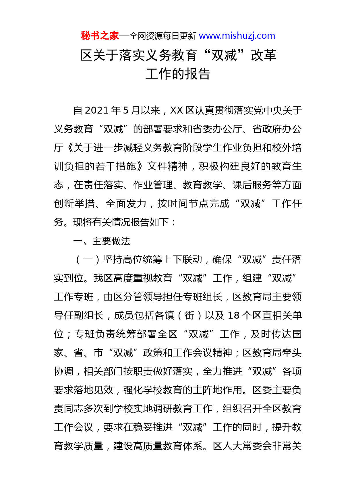 秘书之家—全网资源每日更新www.mishuzj.com区关于落实义务教育“双减”改革工作的报告自2021年5月以来,XX区认真贯彻落实党中央关于义务教育“双减”的部署要求和省委办公厅、省政府办公厅《关于进一步减轻义务教育阶段学生作业负担和校外培训负担的若干措施》文件精神,积极构建良好的教育生态,在责任落实、作业管理、教育教学、课后服务等方面创新举措、全面发力,按时间节点完成“双减”工作任务。现将有关情况报告如下:一、主要做法(一)坚持高位统筹上下联动,确保“双减”责任落实到位。我区高度重视教育“双减”工作,组建“双减”工作专班,由区分管领导担任专班组长,区教育局主要领导任副组长,成员包括各镇(街)以及18个区直相关单位;专班负责统筹部署全区“双减”工作,及时传达国家、省、市“双减”政策和工作会议精神;区教育局牵头协调,相关部门按职责做好落实,全力推进“双减”各项要求落地见效,强化学校教育的主阵地作用。区委主要负责同志多次到学校实地调研教育工作,组织召开全区教育工作会议,要求在稳妥推进“双减”工作的同时,提升教育教学质量,建设高质量教育体系。区人大常委会非常关秘书之家—全网资源每日更新www.mishuzj.com注“双减”工作,组织相关部门开展专题调研,推进“双减”工作有效开展。制定《XX区学校办学质量和水平指导评价方案》《XX市XX区义务教育阶段学生作业管理“六不准,六倡议”》《XX区校内课后服务工作方案》等文件,在保障教学质量的同时,推进“双减”工作有效开展。(二)坚持减负提质多措并举,确保教学质量提升到位。一是狠抓作业管理。坚决扭转作业数量过多、质量不高、功能异化等突出问题,建立以校长为第一责任人的作业管理机制,制订管理细则,建立作业公示制度;区教师发展中心经常性组织开展作业设计与实施的教师培训与教研活动,加强对学校作业设计与实施的研究与指导;将作业管理作为规范办学行为督导检查和责任督学日常监管的重要内容,确保义务教育阶段作业管理工作取得实效。二是提升教学质量。着力打造“课程思政”“影视思政”“叙事思政”三大平台,形成系列化的学生思想教育图像素材和资源,将学生思政工作生动化、多元化、生活化,切实提高学校思政工作实效。大力推动“科创人才”培育工程,建立科技劳动教育实践、科技创新实践、小小科学家体验、中草药农作物种植实践、数字制作和程序设计、综合实践活动基地、科创教育项目式研究等八大孵化基地。推动XX区学科教研基地全覆盖工程,各学科教研员全秘书之家—全网资源每日更新www.mishuzj.com面实施区、片区、学校三个层级的教研活动,形成多个教研模式和品牌。实施教学质量突破工程,探索教学质量全面突破新路径,启动教学改革、课堂模式、育人品牌等方面的研究推广,实现内部突破,打造独具特色和成效的“育人品牌”。三是做好课后服务。全面落实课后服务两个“全覆盖”及“5+2”模式,学校承担课后服务工作主体责任,通过公开招标引入两个信息管理服务平台和46家经验丰富、管理规范的培训机构,多方联动搭建起家校共育、政企合作的桥梁。探索出“1+N”的特色课程体系(1是基础托管,N是特色课程),由家长根据孩子自身发展需要灵活选择。目前,我区公办学校学生约XX万人,约X万人参加校内课后服务,其中课后基础托管XX万人,素质提升班XX万人(XX所学校开设XX个素质提升班)。据问卷调查结果显示,家长和学生对校内课后服务满意率达9X.X%。四是强化经费保障。贯彻XX市《关于进一步加强全市义务教育阶段公办学校校内课后服务工作的意见(试行)》精神,2021年设立了专项资金,明确补助标准,对开展校内课后服务的学校进行财政补助,用于改善课后服务场室设施条件、购买素质提升课程操作材料等方面支出。2021年秋季学期投入经费约XX万元,2022年预算加大财政投入力度,财政预算约XX万元,强化课后服务经费保障。秘书之家—全网资源每日更新www.mishuzj.com(三)坚持校内校外同步发力,确保教育乱象治理到位。一是全面摸排。目前我区取得办学许可证的校外培训机构共XX家,其中高中学科类培训机构XX家,中小学非学科类培训机构XX家,成人教育类培训机构XX家。另有非教育部门审批的教育机构(非学科类培训或教育咨询等)及托管机构有XX多家。组织全区X个镇(街)共分XX个网格对辖区内排查登记在册的非教育部门审批的XX多所校外培训机构、托管机构进行“地毡式”拉网排查,严厉打击以“家政服务”“众筹私教”“研学”等名义进行变相违规培训。二是严格执法。组织教育、民政、市场监管、公安等部门成立联合检查组,采取“四不两直”方式,实地督查“双减”政策落实情况。实施“双减”以来,已累计出动执法人员XX人次,检查了XX家校外培训机构,发放工作指引XX份,派发提醒书XX余份。加强校外培训机构广告监管,规范教育培训机构的广告发布行为,累计监测互联网广告XX次,暂未发现涉嫌违法线索。三是加强监管。切实做好校外培训信息公示,规范从业人员管理和规范合同使用,重点落实预收费须全部进入机构收费专用账户,明确各机构不得引导家长使用培训贷方式缴纳培训费用,不得一次性收取或以充值、次卡等形式变相收取时间跨度超过3个月或60课时的费用。(四)坚持