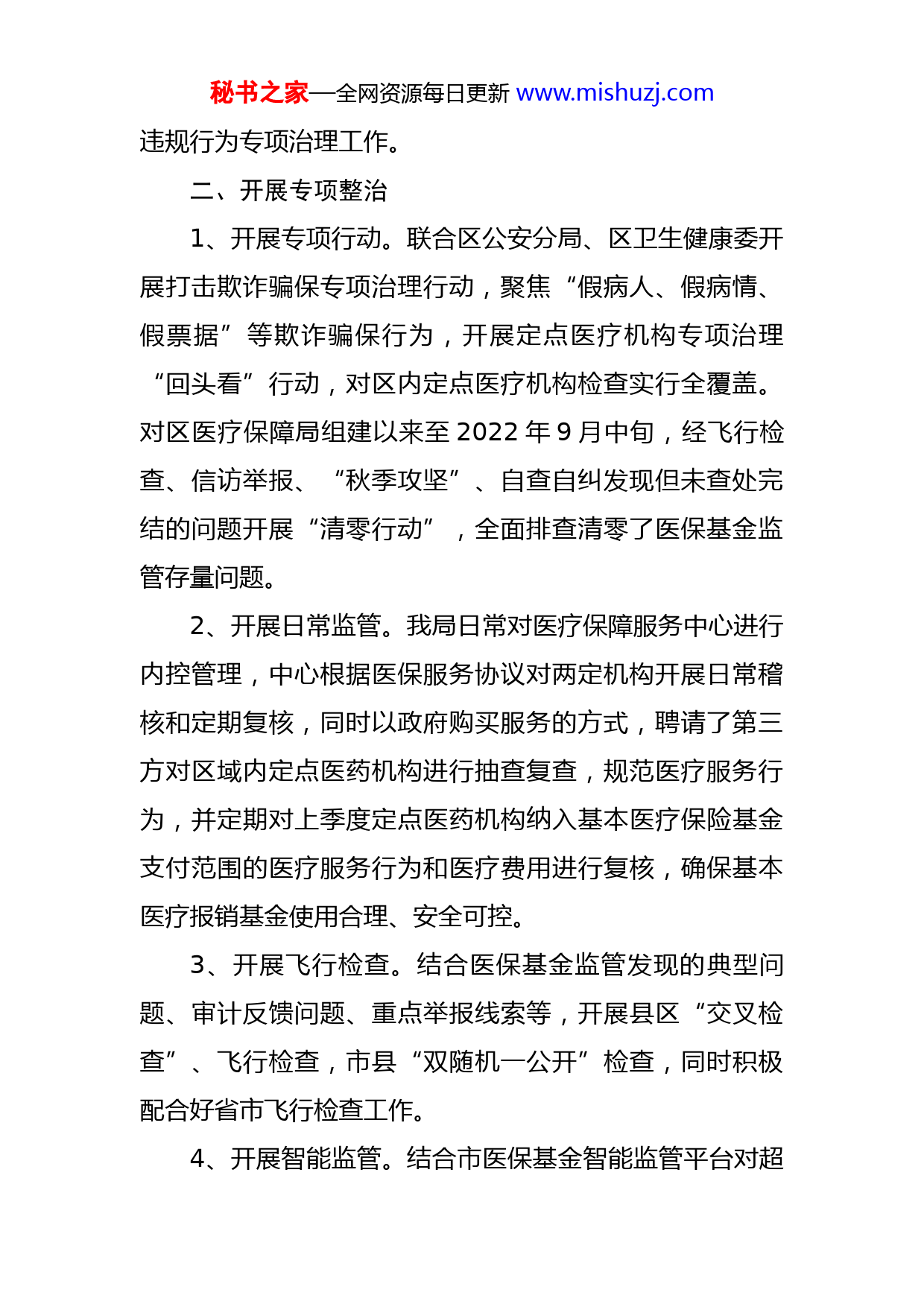 秘书之家—全网资源每日更新www.mishuzj.com区医疗保障局关于医保基金监管工作的报告医保基金是老百姓的看病钱、救命钱,关系着千家万户的幸福生活。为进一步保持打击欺诈骗保高压态势,维护全区医保基金安全,我局按照国家、省、市医疗保障局统一部署,在全区范围内开展打击欺诈骗保专项治理行动,确保医保基金安全高效、合理规范使用。一、加强组织领导我局成立了专项治理工作领导小组,由主要领导亲自抓,分管领导具体抓,区医疗保障服务中心主要负责人、局机关各股室负责人为小组成员。我局印发了《XX市XX区医疗保障局XX市XX区卫生健康委员会关于开展定点医疗机构专项治理“回头看”的通知》、《2022年XX市XX区“宣传贯彻条例加强基金监管”集中宣传月活动实施方案》、《XX市XX区医疗保障局2022年打击欺诈骗保专项治理实施方案》、《XX市XX区医疗保障局XX市XX区卫生健康委员会关于开展定点医疗机构医保基金审计反馈问题依单自查自纠工作的通知》、《XX市XX区开展打击“医疗机构内外勾结骗取、套取医保基金问题”专项整治行动实施方案》等文件,明确职责分工,层层压实责任,以规范医保基金使用行为为目标,统筹推进医保违法秘书之家—全网资源每日更新www.mishuzj.com违规行为专项治理工作。二、开展专项整治1、开展专项行动。联合区公安分局、区卫生健康委开展打击欺诈骗保专项治理行动,聚焦“假病人、假病情、假票据”等欺诈骗保行为,开展定点医疗机构专项治理“回头看”行动,对区内定点医疗机构检查实行全覆盖。对区医疗保障局组建以来至2022年9月中旬,经飞行检查、信访举报、“秋季攻坚”、自查自纠发现但未查处完结的问题开展“清零行动”,全面排查清零了医保基金监管存量问题。2、开展日常监管。我局日常对医疗保障服务中心进行内控管理,中心根据医保服务协议对两定机构开展日常稽核和定期复核,同时以政府购买服务的方式,聘请了第三方对区域内定点医药机构进行抽查复查,规范医疗服务行为,并定期对上季度定点医药机构纳入基本医疗保险基金支付范围的医疗服务行为和医疗费用进行复核,确保基本医疗报销基金使用合理、安全可控。3、开展飞行检查。结合医保基金监管发现的典型问题、审计反馈问题、重点举报线索等,开展县区“交叉检查”、飞行检查,市县“双随机一公开”检查,同时积极配合好省市飞行检查工作。4、开展智能监管。结合市医保基金智能监管平台对超秘书之家—全网资源每日更新www.mishuzj.com限范围用药、超物价收费、低标入院、分解住院、重复收费等审核规则筛选出的违规使用医保基金及时追回,根据药品进销存系统提示异常数据开展线上审核和线下稽核,强化监管手段,保障医保基金安全。5、抓好审计整改。全面落实2022年医保基金审计整改任务,并根据《XX市XX区医疗保障局XX市XX区卫生健康委员会关于开展定点医疗机构医保基金审计反馈问题依单自查自纠工作的通知》工作要求,在全区范围开展定点医疗机构依单自查自纠工作,区内定点医疗机构对照问题自查自纠,将整改工作落实落地。三、加大宣传培训结合“宣传贯彻条例加强基金监管”集中宣传月活动,我局在医保经办大厅窗口、乡镇医保经办窗口、两定医药机构宣传栏张贴《医疗保障基金使用监督管理条例》、打击欺诈骗保宣传海报,引导公众正确认知、主动参与医保基金监管工作,充分发挥群众监督作用。为提升宣传效果,X月XX日联合区内所有两定机构组织开展集中宣传日活动,在广场、区人民医院、区中医院设置“宣传广场”,安排工作人员现场宣讲,其他两定机构同步开展现场宣传,加强参保群众对《条例》、打击欺诈骗保的正确认知,并邀请电视台现场报道,营造人人知《条例》、个个守《条例》的良好氛围,自觉遵守并维护医保基金安秘书之家—全网资源每日更新www.mishuzj.com全。开展对医保基金监管、经办和两定机构相关人员的培训,通过多种形式的检查以查代训提高稽核能力,规范两定机构使用医保基金的能力。我区医保基金监管工作已实现全覆盖,截至目前,2022年上半年共追回医保违规金额XXXX.XX万元,逐步在全区医保领域形成了“不敢骗、不能骗、不想骗”的良好氛围。