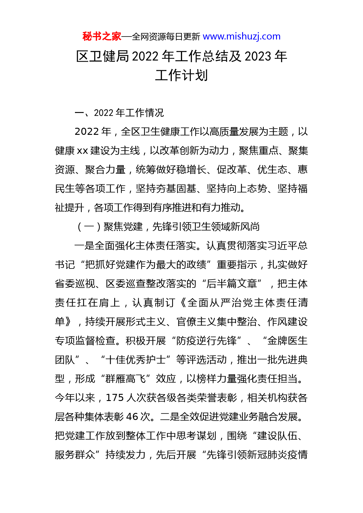 秘书之家—全网资源每日更新www.mishuzj.com区卫健局2022年工作总结及2023年工作计划一、2022年工作情况2022年,全区卫生健康工作以高质量发展为主题,以健康xx建设为主线,以改革创新为动力,聚焦重点、聚集资源、聚合力量,统筹做好稳增长、促改革、优生态、惠民生等各项工作,坚持夯基固基、坚持向上态势、坚持福祉提升,各项工作得到有序推进和有力推动。(一)聚焦党建,先锋引领卫生领域新风尚一是全面强化主体责任落实。认真贯彻落实习近平总书记“把抓好党建作为最大的政绩”重要指示,扎实做好省委巡视、区委巡查整改落实的“后半篇文章”,把主体责任扛在肩上,认真制订《全面从严治党主体责任清单》,持续开展形式主义、官僚主义集中整治、作风建设专项监督检查。积极开展“防疫逆行先锋”、“金牌医生团队”、“十佳优秀护士”等评选活动,推出一批先进典型,形成“群雁高飞”效应,以榜样力量强化责任担当。今年以来,175人次获各级各类荣誉表彰,相关机构获各层各种集体表彰46次。二是全效促进党建业务融合发展。把党建工作放到整体工作中思考谋划,围绕“建设队伍、服务群众”持续发力,先后开展“先锋引领新冠肺炎疫情秘书之家—全网资源每日更新www.mishuzj.com防控工作”、“党建引领提升适龄儿童水痘免疫水平”、“党建与家医服务互促共进”等项目,推动党建与业务创新融合、共同发展,推动党建水平整体跃升。注重把党建优势转化为扶贫优势,结对共建xx15个贫困户,为扶贫对象建立电子健康档案并进行动态管理;持续深化陕西省安康市镇坪县长效扶贫机制,先后输送7名优秀医疗卫生骨干到镇坪开展支医帮扶。三是全力确保高质量考核目标完成。标定“卫生健康事业高质量发展”方向,紧盯影响指标的项目建设、队伍发展、服务能力等关键要素,充分发挥党建优势,努力推动更多工作创特色、创品牌,实现更多工作在全市、全省争先进位。先后以“四不两直”的方式分别奔赴区疾病预防控制中心、xx镇卫生院、xx街道社区卫生服务中心等10家单位对项目进展、人才队伍建设、特色服务、现存困难等情况开展调研,对标高质量考核目标,排出举措、奋力赶超。(二)平战结合,编密织牢疾病防控新网络一是坚决打赢新冠肺炎疫情防控阻击战。新冠肺炎疫情发生后,局党委早于全市一周发出“全体党员停止休假,全力战疫”动员令,第一时间成立防控领导小组,制定疫情防控工作方案和应急预案,全系统领导干部连续133天24小时在岗带班值守,拼抢疫情防控的xx速度、xx效率。全市率先出台预检分诊、4合1上门摸排流秘书之家—全网资源每日更新www.mishuzj.com程,优化制定“医学观察、消毒消杀”等流程;组建5支专业应急队伍,科学有序规范地开展流行病学调查、疫点消毒、哨点监测等;高标准、严要求设置集中隔离医学观察点,代表全市经受住了国务院督导组高标准的考验,成为全市确诊病例数最少辖区,新冠肺炎疫情防控取得了阶段性胜利。二是全力确保经济社会发展稳定大局。围绕“防、控、治、保、稳”五字要求,充分运用大数据做好重点人群人员筛查,分级分类落实管控措施,积极做好核酸检测、血清采样等工作,确保重点人员管控一个不漏。累计采集密切接触者、入境人员、高风险地区回常人员、养老机构等人群核酸样本11726人次、血清样本626人。以突出重点、组建队伍、精准施策、行业管理为主,围绕医疗卫生行业和公共场所为两大重点,紧盯关键环节、重要岗位、重点对象,逐一排查,确保防控监督全覆盖、无遗漏。截至10月26日,累计开展疫情防控现场监督医疗机构523家次、集中医学观察点7户次、疾控中心2户次、高速卡口留验站1户次、放射诊疗机构29家次、公共场所829家次、学校308家次、复工企业共756家、废弃口罩收集桶巡查123个小区。首创健康“云”流程隔离管理措施,通过移动互联网、微信二维码、大数据等线上智能化创新手段,实现隔离点“全隔离、无纸化、零接触”的封闭式管理。三是压茬推进应急管理能力建设。依托现秘书之家—全网资源每日更新www.mishuzj.com有疾控机构和基层卫生机构人员,按照“统一指挥、协调联动、平战结合、快速高效”的原则,组建了流行病学调查、核酸检测、环境消杀、心理健康服务4支处置队伍。先后组织500人次参加省、市、区三级培训,10家基层医疗机构以桌面推演、情景模拟的方式,实施疫情防控应急演练,分类分级提升专业能力。xx区公共卫生中心建设项目正式开工,公共卫生机构、应急指挥中心、五大中心、公共卫生应急保障点等科学规划、合理布局、精心打造、系统升级。基层医疗机构的发热门诊建设有序推进中,xx街道社区卫生服务中心的发热门诊已建成,xx街道社区卫生服务中心和xx镇卫生院的发热门诊基建完成。xx区核酸检测实验室高分通过省卫健委、省疾控中心专家验收,预计每日最大检测量为540份样品,为筑牢防疫“钢铁长城”提供了强有力的技术支撑。(三)人才为基,确保实现队伍建设新突破一是合理调整事业单位岗位设置。开展事业单位岗位设置工作研讨会,出台《关于调整xx区卫生健康事业单位岗位设置管理的通知》(常钟卫〔2022〕31号),进一步推进“县管乡用”政策,新增正高岗位22个、副高岗位49个,大大缓解高职卫生人才聘用压力。按照《xx