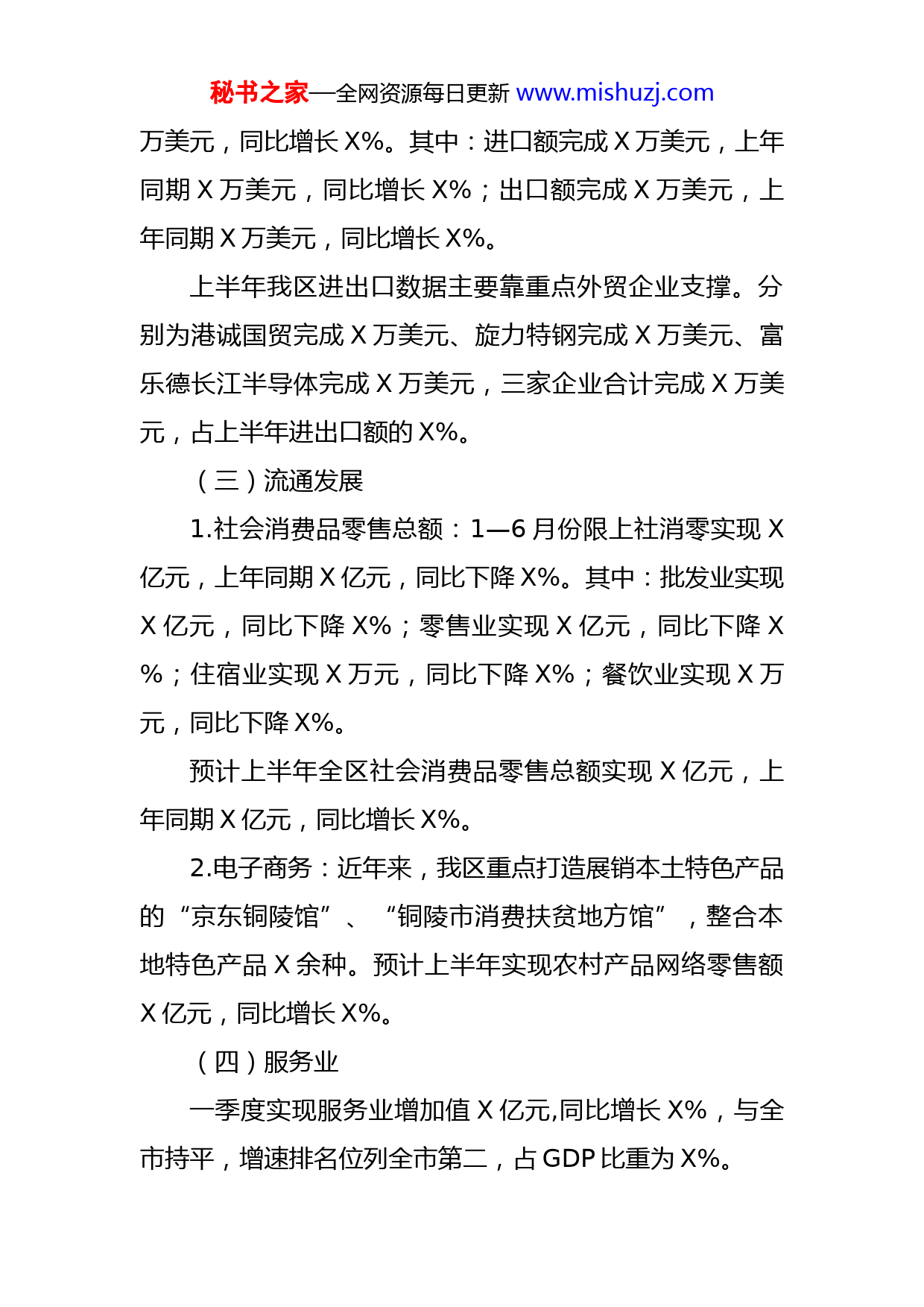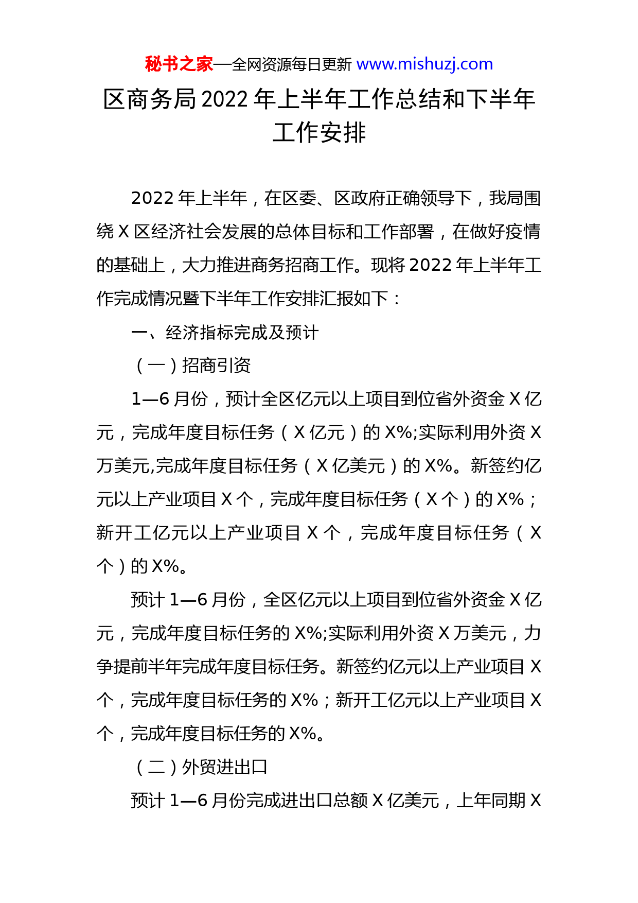 秘书之家—全网资源每日更新www.mishuzj.com区商务局2022年上半年工作总结和下半年工作安排2022年上半年,在区委、区政府正确领导下,我局围绕X区经济社会发展的总体目标和工作部署,在做好疫情的基础上,大力推进商务招商工作。现将2022年上半年工作完成情况暨下半年工作安排汇报如下:一、经济指标完成及预计(一)招商引资1—6月份,预计全区亿元以上项目到位省外资金X亿元,完成年度目标任务(X亿元)的X%;实际利用外资X万美元,完成年度目标任务(X亿美元)的X%。新签约亿元以上产业项目X个,完成年度目标任务(X个)的X%;新开工亿元以上产业项目X个,完成年度目标任务(X个)的X%。预计1—6月份,全区亿元以上项目到位省外资金X亿元,完成年度目标任务的X%;实际利用外资X万美元,力争提前半年完成年度目标任务。新签约亿元以上产业项目X个,完成年度目标任务的X%;新开工亿元以上产业项目X个,完成年度目标任务的X%。(二)外贸进出口预计1—6月份完成进出口总额X亿美元,上年同期X秘书之家—全网资源每日更新www.mishuzj.com万美元,同比增长X%。其中:进口额完成X万美元,上年同期X万美元,同比增长X%;出口额完成X万美元,上年同期X万美元,同比增长X%。上半年我区进出口数据主要靠重点外贸企业支撑。分别为港诚国贸完成X万美元、旋力特钢完成X万美元、富乐德长江半导体完成X万美元,三家企业合计完成X万美元,占上半年进出口额的X%。(三)流通发展1.社会消费品零售总额:1—6月份限上社消零实现X亿元,上年同期X亿元,同比下降X%。其中:批发业实现X亿元,同比下降X%;零售业实现X亿元,同比下降X%;住宿业实现X万元,同比下降X%;餐饮业实现X万元,同比下降X%。预计上半年全区社会消费品零售总额实现X亿元,上年同期X亿元,同比增长X%。2.电子商务:近年来,我区重点打造展销本土特色产品的“京东铜陵馆”、“铜陵市消费扶贫地方馆”,整合本地特色产品X余种。预计上半年实现农村产品网络零售额X亿元,同比增长X%。(四)服务业一季度实现服务业增加值X亿元,同比增长X%,与全市持平,增速排名位列全市第二,占GDP比重为X%。秘书之家—全网资源每日更新www.mishuzj.com预计上半年实现服务业增加值X亿元,同比增长X%。二、主要工作开展(一)聚焦“产业链”,戮力项目攻坚,推动招商引资提质效1.组队伍建机制。制定出台《关于进一步做深做实产业链招商工作的通知》,优化产业链组织架构。明确由区经信局、区科技局、区文旅局、区交通运输局、区农业农村局、区发改委分别对应市级六大产业链招商推进组,区级铁基、铝基等其他金属合金材料、汽车核心零部件、新型绿色建材等其他三条产业链仍围绕原有产业链开展工作。乡镇、办事处抽调人员组建九个驻外招商分局,分别在长三角和珠三角区域开展驻点招商。建立“链长负责+部门联动+驻外招商+载体承接”的产业链招商模式,招引专业人才充实产业链招商队伍,形成顶格谋划、顶格协调、顶格推进的工作格局。2.勤拜访深对接。1—6月份累计开展各类访商邀商活动X批次,分别为接待客商来访X批次,开展外出招商X批次,其中产业链链长带队开展外出招商活动X批次,重点拜访了华尚光电、福亿机械、彩虹光伏等企业,对接了高导通透明硅基电路板、智能装备制造产业园及光伏玻璃生产等重大招商项目。疫情期间,通过腾讯会议等网络形式开展“云对接”“云洽谈”,累计线上对接华尚光电、秘书之家—全网资源每日更新www.mishuzj.com易森碳、德尔汽车、纸联等X余家企业。目前,全区主要在谈项目X个,总投资X亿元。3.强调度促转化。落实招商引资五项工作机制,强化项目对接、落地、开工、建设、竣工全过程无缝对接。1—6月份,累计召开X次项目预审会和X次项目专题会,预审论证X个项目,专题研究X个项目,有力推动X个产业项目签约落地,其中华尚光电和景昌两个项目在全省重大项目云签约活动主会场屏幕显示签约。同时加大对签约未开工项目的跟踪推进力度,成功推动海铜、安皓瑞、双和等X个项目开工建设。4.优环境强服务。围绕推动经济高质量发展要求,在项目洽谈至投产运营全过程提供“店小二式”服务,深入开展“四送一服”双千工程。1—6月份,为铜勤、康恒、恒达等X家签约落地企业累计兑现首次招商引资扶持政策资金X万元,先后为博日、鸣顺等X家企业X名高管子女解决就近上学问题,营造了亲商安商富商的良好社会氛围。(二)紧盯物防监管,强化政策扶持,推动对外贸易稳增长1.牵头物防工作,积极应对疫情。按照疫情防控最新要求,牵头做好区疫情防控应急综合指挥部物防监管组工作,持续做好进口“非冷链”物品防控。今年上半年,累计完成进口非冷链集装箱物品现场核酸取样X台次,涉及秘书之家—全网资源每日更新www.mishuzj.comX件产品;完成涉外国际邮件现场核酸取样X批次,涉及X个快件;完成进口从业人员应检尽检核酸检测累计X人次。加强摸排调研,在做好疫情防控的基础上,帮助和协调解决外贸企业在复工、招工、物流、防疫物资等方面的困难和问题。持续支持双源卫生用品等企业开展医疗物资生产出口,上半年已实现群益新材料新增出口。2.强化对企服务,优化营商环境。持续推进“四送一服”工作,上半年已密集走访十余家企业。对潜在的外贸企业,全程陪同办理注册、海关登记等流程,积极协调帮扶实现自营出