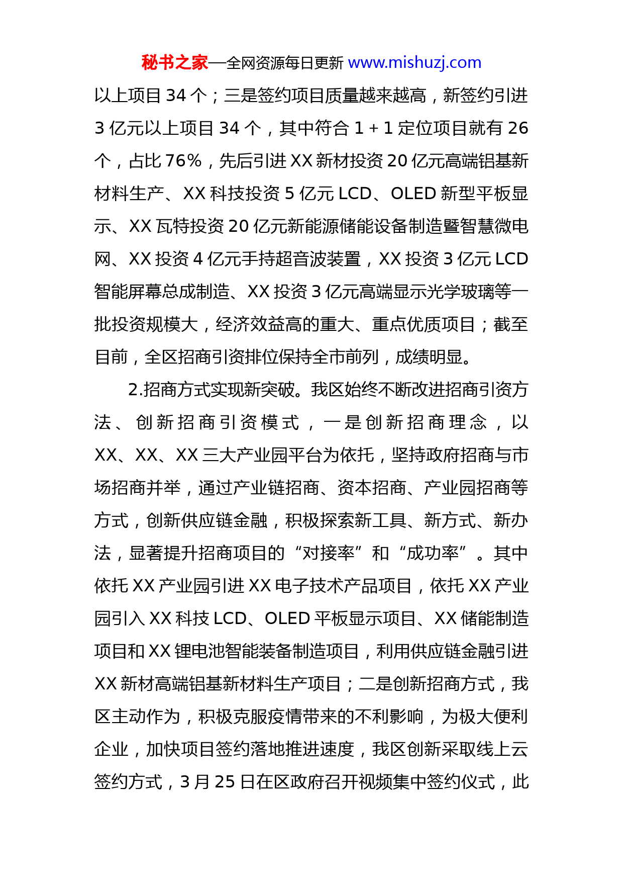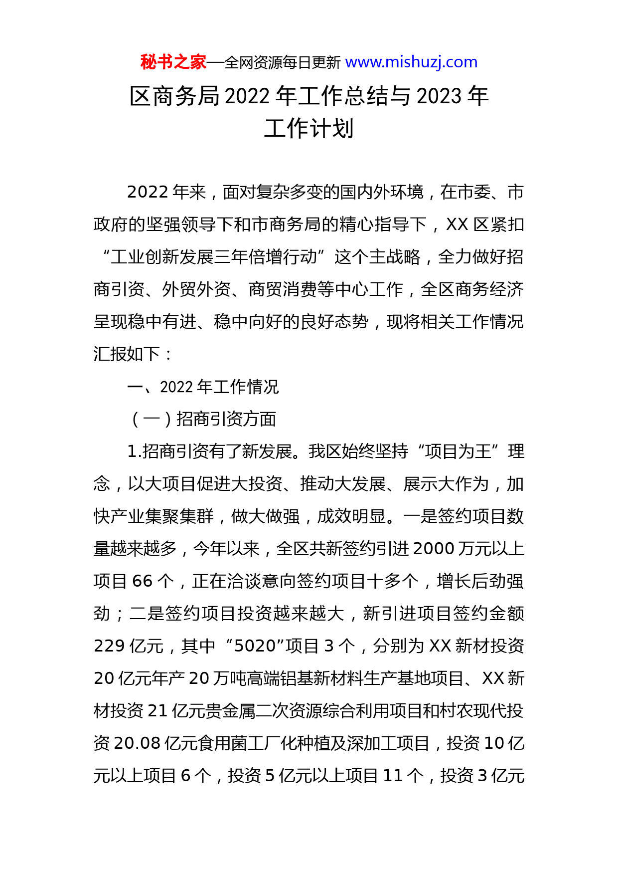 秘书之家—全网资源每日更新www.mishuzj.com区商务局2022年工作总结与2023年工作计划2022年来,面对复杂多变的国内外环境,在市委、市政府的坚强领导下和市商务局的精心指导下,XX区紧扣“工业创新发展三年倍增行动”这个主战略,全力做好招商引资、外贸外资、商贸消费等中心工作,全区商务经济呈现稳中有进、稳中向好的良好态势,现将相关工作情况汇报如下:一、2022年工作情况(一)招商引资方面1.招商引资有了新发展。我区始终坚持“项目为王”理念,以大项目促进大投资、推动大发展、展示大作为,加快产业集聚集群,做大做强,成效明显。一是签约项目数量越来越多,今年以来,全区共新签约引进2000万元以上项目66个,正在洽谈意向签约项目十多个,增长后劲强劲;二是签约项目投资越来越大,新引进项目签约金额229亿元,其中“5020”项目3个,分别为XX新材投资20亿元年产20万吨高端铝基新材料生产基地项目、XX新材投资21亿元贵金属二次资源综合利用项目和村农现代投资20.08亿元食用菌工厂化种植及深加工项目,投资10亿元以上项目6个,投资5亿元以上项目11个,投资3亿元秘书之家—全网资源每日更新www.mishuzj.com以上项目34个;三是签约项目质量越来越高,新签约引进3亿元以上项目34个,其中符合1+1定位项目就有26个,占比76%,先后引进XX新材投资20亿元高端铝基新材料生产、XX科技投资5亿元LCD、OLED新型平板显示、XX瓦特投资20亿元新能源储能设备制造暨智慧微电网、XX投资4亿元手持超音波装置,XX投资3亿元LCD智能屏幕总成制造、XX投资3亿元高端显示光学玻璃等一批投资规模大,经济效益高的重大、重点优质项目;截至目前,全区招商引资排位保持全市前列,成绩明显。2.招商方式实现新突破。我区始终不断改进招商引资方法、创新招商引资模式,一是创新招商理念,以XX、XX、XX三大产业园平台为依托,坚持政府招商与市场招商并举,通过产业链招商、资本招商、产业园招商等方式,创新供应链金融,积极探索新工具、新方式、新办法,显著提升招商项目的“对接率”和“成功率”。其中依托XX产业园引进XX电子技术产品项目,依托XX产业园引入XX科技LCD、OLED平板显示项目、XX储能制造项目和XX锂电池智能装备制造项目,利用供应链金融引进XX新材高端铝基新材料生产项目;二是创新招商方式,我区主动作为,积极克服疫情带来的不利影响,为极大便利企业,加快项目签约落地推进速度,我区创新采取线上云签约方式,3月25日在区政府召开视频集中签约仪式,此秘书之家—全网资源每日更新www.mishuzj.com次线上签约金额50亿,签约项目2个,分别是投资20亿元的年产20万吨高端铝基新材料生产基地项目和投资30亿元的风电新能源及风机、塔筒配套生产制造项目。3.营商环境得到新优化。我区始终高度重优化营商环境设,坚定不移狠抓项目进度。项目落地后,跟踪服务单位全程做好服务,帮助企业代办项目前期手续;项目建设中,区领导多次到一线了解和协调解决项目推进过程中存在的困难,帮助企业解决用电、用水、用工、融资等问题,并每月组织召开政企恳谈会,倾听收集企业遇到的难点、痛点问题,及时帮助协调解决,努力创造最优的营商环境,让项目引得进、留得住、办得好。2022年来,各签约项目进展良好,尤其是XX新材投资20亿元的年产20万吨高端铝基新材料生产基地、村农现代投资20.08亿元的食用菌工厂化种植及深加工等5020项目均实现当年申报,当年建成,当年投产,创造XX发展新速度。(二)外资外贸方面一是外贸情况。2022年XX区持续通过开拓外贸出口工作新领域,围绕我区电子信息产业、新材料等主导产业开展招商工作,引进具有核心竞争力的生产型出口企业、外贸新业态企业,跨境电商企业、促进生产型出口型企业尽快生产、销售;新引进的跨境电商企业十多家,其中七家企业已开展进出口业务,出口额约8亿元人民币。全面秘书之家—全网资源每日更新www.mishuzj.com贯彻中央、省、市外经贸扶持政策和“三同”政策,今年已落实各级专项资金867.4236万元,有效降低企业生产及物流成本,提高企业国际竞争力及物流时效。今年持续深挖细找有资质无业绩的企业出口潜力,供货外省出口企业自营出口,加大帮扶支持力度,引导新的外贸企业积极走出去,不断夯实和扩大出口规模,特别是协助重点生产型企业XX省XX服饰有限公司、XX市XXX洁具有限公司等企业扩大及转回出口。1-9月份XX省XX服饰有限公司预计出口2.85亿元人民币,同比增长71.02%,同时整合XX省XX服饰有限公司(集团)资源由XX省领衫服饰有限公司为统一平台扩大及转回出口,1-9月预计出口0.45亿元人民币;1-9月XX市XXX洁具有限公司预计出口1.3亿元人民币,同比增长16.72%;XX机电有限公司成立的XX金丝路进出口贸易有限公司,整合其相关企业资源已开展出口业务;XX(XX)科技有限公司申请设立了自用型保税仓库,目前调试设备试产中;XX电池科技有限公司、XX市XX洁具有限公司、XX科技股份有限公司、XX旅游用品有限公司、XX科技有限公司等企业均有较大转回自营出口。引导企业参加各类线上线下国际国内展会,开拓国际市场,抢抓订单,并且帮助企业深入了解《区域全面经济伙伴关系协定》(RCEP)以及新形势下的国际经贸规则,组织外贸企业参加商务部国际司主办、商秘书之家—全网资源每日更新www.mishuzj.com务部外贸发展局承办的全国《区域全面经济伙伴