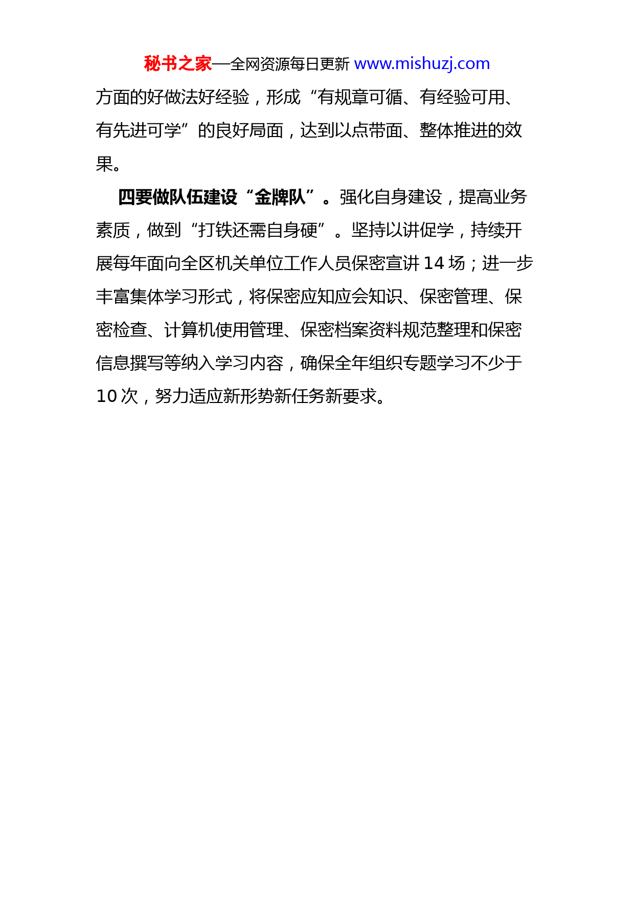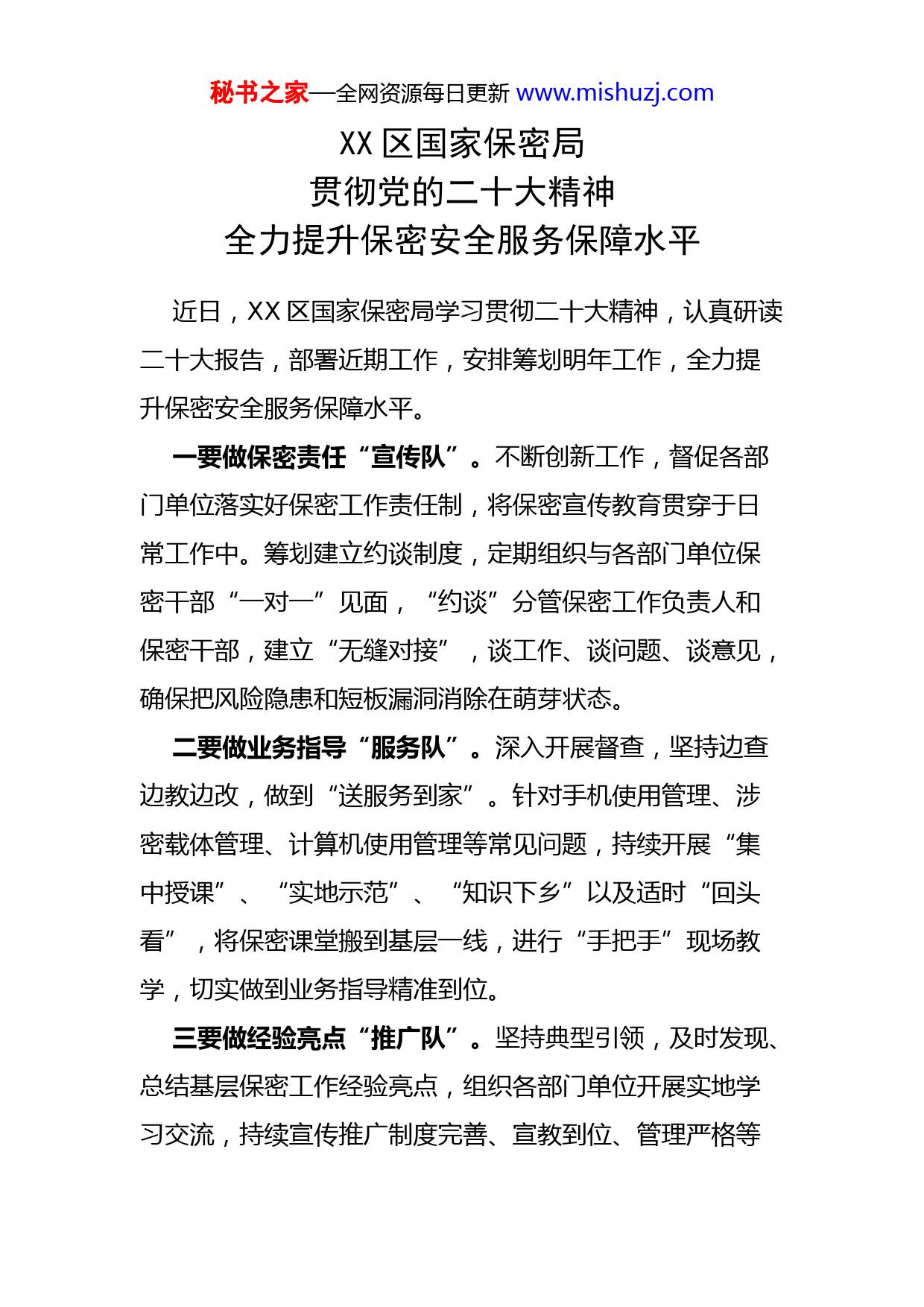 秘书之家—全网资源每日更新www.mishuzj.comXX区国家保密局贯彻党的二十大精神全力提升保密安全服务保障水平近日,XX区国家保密局学习贯彻二十大精神,认真研读二十大报告,部署近期工作,安排筹划明年工作,全力提升保密安全服务保障水平。一要做保密责任“宣传队”。不断创新工作,督促各部门单位落实好保密工作责任制,将保密宣传教育贯穿于日常工作中。筹划建立约谈制度,定期组织与各部门单位保密干部“一对一”见面,“约谈”分管保密工作负责人和保密干部,建立“无缝对接”,谈工作、谈问题、谈意见,确保把风险隐患和短板漏洞消除在萌芽状态。二要做业务指导“服务队”。深入开展督查,坚持边查边教边改,做到“送服务到家”。针对手机使用管理、涉密载体管理、计算机使用管理等常见问题,持续开展“集中授课”、“实地示范”、“知识下乡”以及适时“回头看”,将保密课堂搬到基层一线,进行“手把手”现场教学,切实做到业务指导精准到位。三要做经验亮点“推广队”。坚持典型引领,及时发现、总结基层保密工作经验亮点,组织各部门单位开展实地学习交流,持续宣传推广制度完善、宣教到位、管理严格等秘书之家—全网资源每日更新www.mishuzj.com方面的好做法好经验,形成“有规章可循、有经验可用、有先进可学”的良好局面,达到以点带面、整体推进的效果。四要做队伍建设“金牌队”。强化自身建设,提高业务素质,做到“打铁还需自身硬”。坚持以讲促学,持续开展每年面向全区机关单位工作人员保密宣讲14场;进一步丰富集体学习形式,将保密应知应会知识、保密管理、保密检查、计算机使用管理、保密档案资料规范整理和保密信息撰写等纳入学习内容,确保全年组织专题学习不少于10次,努力适应新形势新任务新要求。