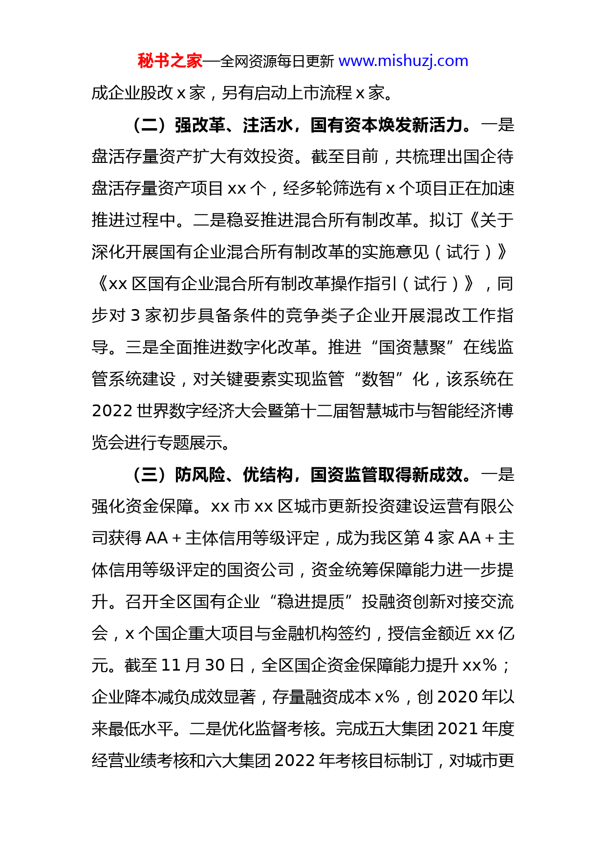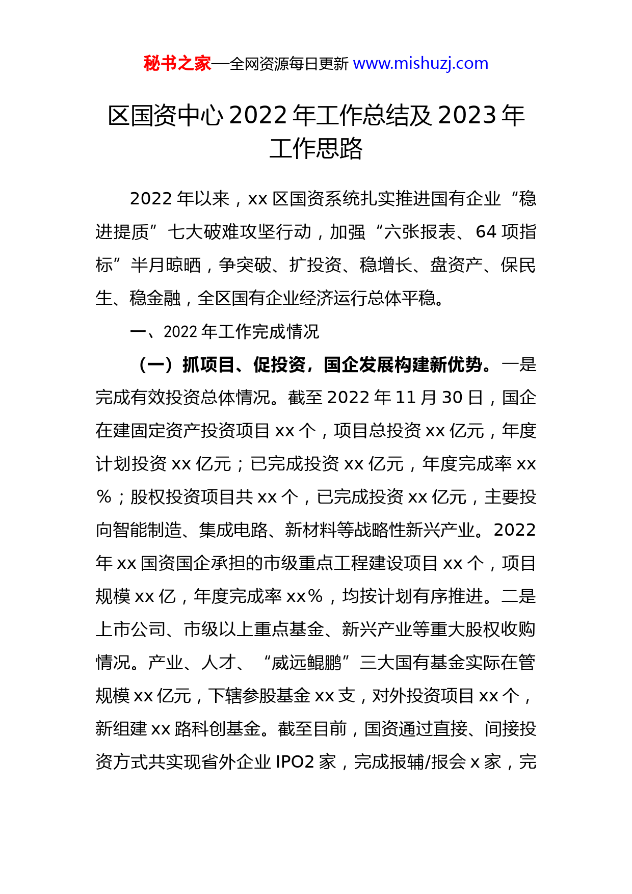 秘书之家—全网资源每日更新www.mishuzj.com区国资中心2022年工作总结及2023年工作思路2022年以来,xx区国资系统扎实推进国有企业“稳进提质”七大破难攻坚行动,加强“六张报表、64项指标”半月晾晒,争突破、扩投资、稳增长、盘资产、保民生、稳金融,全区国有企业经济运行总体平稳。一、2022年工作完成情况(一)抓项目、促投资,国企发展构建新优势。一是完成有效投资总体情况。截至2022年11月30日,国企在建固定资产投资项目xx个,项目总投资xx亿元,年度计划投资xx亿元;已完成投资xx亿元,年度完成率xx%;股权投资项目共xx个,已完成投资xx亿元,主要投向智能制造、集成电路、新材料等战略性新兴产业。2022年xx国资国企承担的市级重点工程建设项目xx个,项目规模xx亿,年度完成率xx%,均按计划有序推进。二是上市公司、市级以上重点基金、新兴产业等重大股权收购情况。产业、人才、“威远鲲鹏”三大国有基金实际在管规模xx亿元,下辖参股基金xx支,对外投资项目xx个,新组建xx路科创基金。截至目前,国资通过直接、间接投资方式共实现省外企业IPO2家,完成报辅/报会x家,完秘书之家—全网资源每日更新www.mishuzj.com成企业股改x家,另有启动上市流程x家。(二)强改革、注活水,国有资本焕发新活力。一是盘活存量资产扩大有效投资。截至目前,共梳理出国企待盘活存量资产项目xx个,经多轮筛选有x个项目正在加速推进过程中。二是稳妥推进混合所有制改革。拟订《关于深化开展国有企业混合所有制改革的实施意见(试行)》《xx区国有企业混合所有制改革操作指引(试行)》,同步对3家初步具备条件的竞争类子企业开展混改工作指导。三是全面推进数字化改革。推进“国资慧聚”在线监管系统建设,对关键要素实现监管“数智”化,该系统在2022世界数字经济大会暨第十二届智慧城市与智能经济博览会进行专题展示。(三)防风险、优结构,国资监管取得新成效。一是强化资金保障。xx市xx区城市更新投资建设运营有限公司获得AA+主体信用等级评定,成为我区第4家AA+主体信用等级评定的国资公司,资金统筹保障能力进一步提升。召开全区国有企业“稳进提质”投融资创新对接交流会,x个国企重大项目与金融机构签约,授信金额近xx亿元。截至11月30日,全区国企资金保障能力提升xx%;企业降本减负成效显著,存量融资成本x%,创2020年以来最低水平。二是优化监督考核。完成五大集团2021年度经营业绩考核和六大集团2022年考核目标制订,对城市更秘书之家—全网资源每日更新www.mishuzj.com新公司开展“三位一体”试考核,引导激励作用明显。三是量化日常监管。探索建立以财务管控为主的企业债务风险防控体系,将xx家资产负债率超xx%、xx家已获利息倍数为负的企业纳入重点监管对象,确保不发生重大财务危机和债券兑付危机,实现企业资产负债水平总体稳中有降。严控为非关联企业和超股比担保,并落实风险防范措施。二、2023年工作思路深入学习贯彻党的二十大精神,对标“两个先行”标准,聚焦“稳进提质”目标,持续深化国资国企改革,在推动企业高质量发展上寻求新突破、探索新路径、激发新动能,在建设现代化滨海大都市先行示范区中强化国企战略功能、展现更大担当。(一)扩投资优结构。一是固定投资加速放量。坚持国资国企项目推进“一盘棋”,发挥“领头雁”、“顶梁柱”、“排头兵”作用,进一步加大在城市建设、产业转型、生态治理、民生服务等重点领域的投资放量,持续推动投资结构优化。加强项目谋划储备,做到“开工一批、储备一批、谋划一批”。二是股权投资优化布局。充分发挥国资基金群撬动作用,以直投、基金投资等方式,按照“上市一批、培育一批、储备一批”的思路,加强对国资投资的上市潜力企业培育。坚持引育并重,引进一批关联秘书之家—全网资源每日更新www.mishuzj.com度高、技术优、辐射带动强的产业项目,增强企业造血能力。三是加快存量资产盘活。进一步加大全区国企资产清点和盘活力度,聚焦特许经营、不动产权证补办、自然资源有效盘活、基础设施REITs等方式,分类注入盘活的有效资产,使企业净资产规模做大、负债率降低、经营性现金流做强,力争全年盘活账面资产资源超20亿元。(二)稳增长促发展。一是推动国有资本和国有企业做强做优做大。加强对区属国企跟踪督导,切实提高经济运行质量,压紧压实资产、营收、利润总额等核心指标,加强月通报、季分析、年总结,持续优化全区国有企业经济运行情况动态监测,对关键运营指标加强研判、统筹调度。二是规划引领强化发展布局。做好顶层设计,指导区属国企加快编制新一轮企业发展规划,确定发展战略目标,促进国企聚焦主责主业,进一步优化主营业务和培育业务的投资布局,持续推进经营板块的整合提升和延伸拓展,不断提升企业核心竞争力。三是保障民生展现担当。以保障城市运行、优化公共治理、优质服务供给等为目标,持续放大国企公共服务功能,深度参与城市更新、全域国土空间整治等专项行动,积极助力文明城市创建、疫情联防联控、防汛防台等工作,展现国企责任担当。(三)稳金融防风险。一是提升企业信用评级。按照“保障性支撑+市场化运营”的总体思路,在做大资产规秘书之家—全网资源每日更新www.mishuzj.com模、做实资产质量、实现现金流平衡
