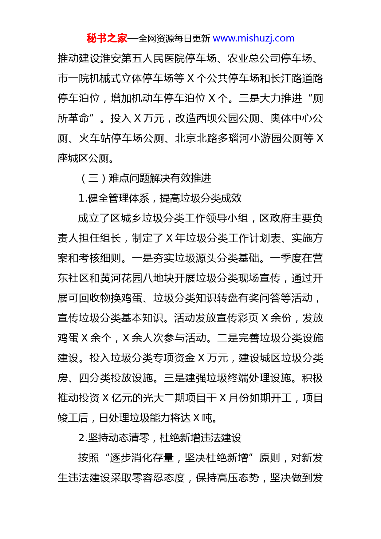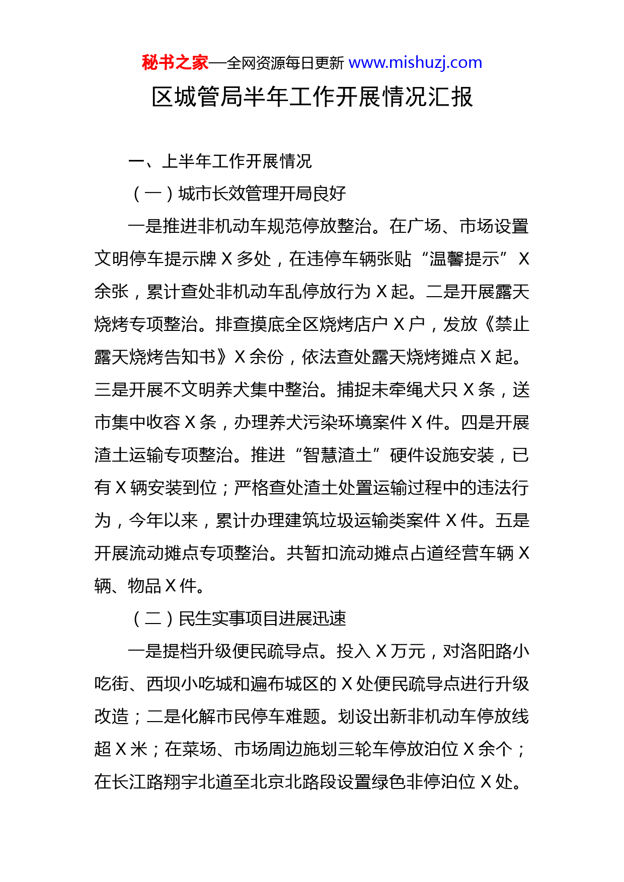 秘书之家—全网资源每日更新www.mishuzj.com区城管局半年工作开展情况汇报一、上半年工作开展情况(一)城市长效管理开局良好一是推进非机动车规范停放整治。在广场、市场设置文明停车提示牌X多处,在违停车辆张贴“温馨提示”X余张,累计查处非机动车乱停放行为X起。二是开展露天烧烤专项整治。排查摸底全区烧烤店户X户,发放《禁止露天烧烤告知书》X余份,依法查处露天烧烤摊点X起。三是开展不文明养犬集中整治。捕捉未牵绳犬只X条,送市集中收容X条,办理养犬污染环境案件X件。四是开展渣土运输专项整治。推进“智慧渣土”硬件设施安装,已有X辆安装到位;严格查处渣土处置运输过程中的违法行为,今年以来,累计办理建筑垃圾运输类案件X件。五是开展流动摊点专项整治。共暂扣流动摊点占道经营车辆X辆、物品X件。(二)民生实事项目进展迅速一是提档升级便民疏导点。投入X万元,对洛阳路小吃街、西坝小吃城和遍布城区的X处便民疏导点进行升级改造;二是化解市民停车难题。划设出新非机动车停放线超X米;在菜场、市场周边施划三轮车停放泊位X余个;在长江路翔宇北道至北京北路段设置绿色非停泊位X处。秘书之家—全网资源每日更新www.mishuzj.com推动建设淮安第五人民医院停车场、农业总公司停车场、市一院机械式立体停车场等X个公共停车场和长江路道路停车泊位,增加机动车停车泊位X个。三是大力推进“厕所革命”。投入X万元,改造西坝公园公厕、奥体中心公厕、火车站停车场公厕、北京北路多瑙河小游园公厕等X座城区公厕。(三)难点问题解决有效推进1.健全管理体系,提高垃圾分类成效成立了区城乡垃圾分类工作领导小组,区政府主要负责人担任组长,制定了X年垃圾分类工作计划表、实施方案和考核细则。一是夯实垃圾源头分类基础。一季度在营东社区和黄河花园八地块开展垃圾分类现场宣传,通过开展可回收物换鸡蛋、垃圾分类知识转盘有奖问答等活动,宣传垃圾分类基本知识。活动发放宣传彩页X余份,发放鸡蛋X余个,X余人次参与活动。二是完善垃圾分类设施建设。投入垃圾分类专项资金X万元,建设城区垃圾分类房、四分类投放设施。三是建强垃圾终端处理设施。积极推动投资X亿元的光大二期项目于X月份如期开工,项目竣工后,日处理垃圾能力将达X吨。2.坚持动态清零,杜绝新增违法建设按照“逐步消化存量,坚决杜绝新增”原则,对新发生违法建设采取零容忍态度,保持高压态势,坚决做到发秘书之家—全网资源每日更新www.mishuzj.com现一起、拆除一起。今年以来累计拆除违建X余处,面积X平方米,遏制了开源珑城、左岸王府、天鹅湾等别墅区违法建设蔓延势头,防违治违工作取得阶段性成果。二、下一步工作打算(一)优化市容环境秩序。一是推进文明典范城市创建工作。二是深入开展市容环境整治。(二)擦亮洁净城市底色。一是持续推进精细化保洁。二是持续提升生活垃圾处理能力。三是持续深化城市“公厕革命”。(三)规范文明养犬行为。一是宣传倡导文明、科学、合法养宠理念,引导居民自觉主动文明养犬。二是常态化开展对不符合规定犬只的捕捉收容,依法查处饲养犬只干扰他人正常生活和放任犬只恐吓他人、犬只污染环境等行为。(四)完善停车设施建设。一是千方百计增加停车泊位。二是持之以恒开展停车秩序治理。三是全面推进城区智慧停车系统建设。(五)保持违建治理力度。一是修订完善防治违法建设工作机制。二是充分发挥防违办牵头协调、督查指导、考核评价作用。三是按照法定职责要求,及时规范查办违法建设案件。四是落实违建失信行为联合惩戒机制。五是要充分发挥示范引领作用。秘书之家—全网资源每日更新www.mishuzj.com(六)持续推进垃圾分类。一是建立生活垃圾分类工作协调机制。二是强化生活垃圾分类达标小区创建。三是建立健全“分类投放、分类收集、分类运输、分类处理”的全链条垃圾处理体系。四是广泛开展生活垃圾分类宣教活动。(七)继续强化渣土监管。严格遵守大气污染预防管控要求,继续实施多部门联合审批机制;积极推进公安+城管+住建+交通联合执法,严厉打击建筑垃圾处置过程中的各类违法行为,实现建筑垃圾处置全过程闭合监管;(八)提高统筹协调成效。全面梳理城市长效管理领导小组办公室、防治违法建设领导小组办公室、养犬管理领导小组办公室、停车场管理领导小组办公室等区级领导小组办公室的职责,借助领导小组力量,充分发挥统筹协调、监督指导、考核评价职能,全力构建“1+N”大城管体系。