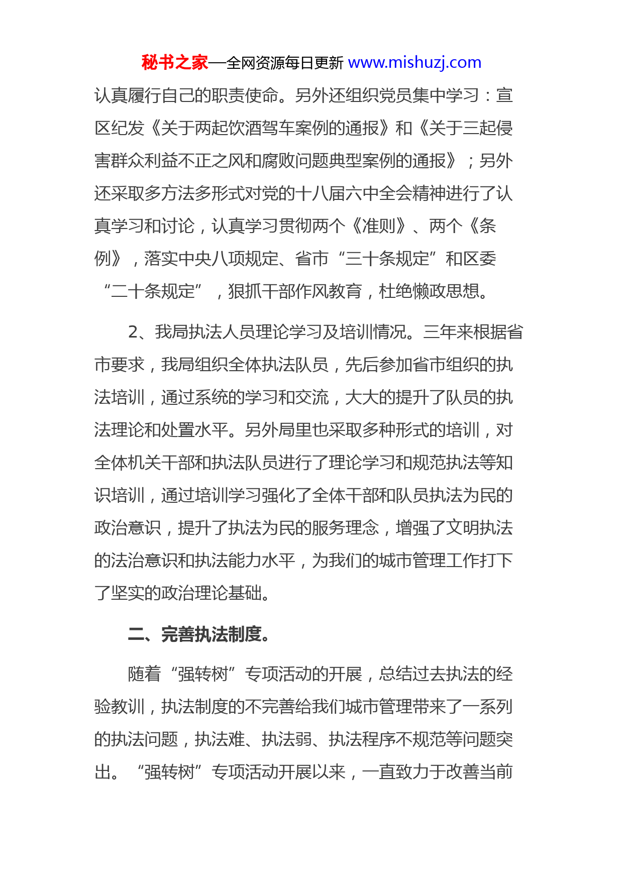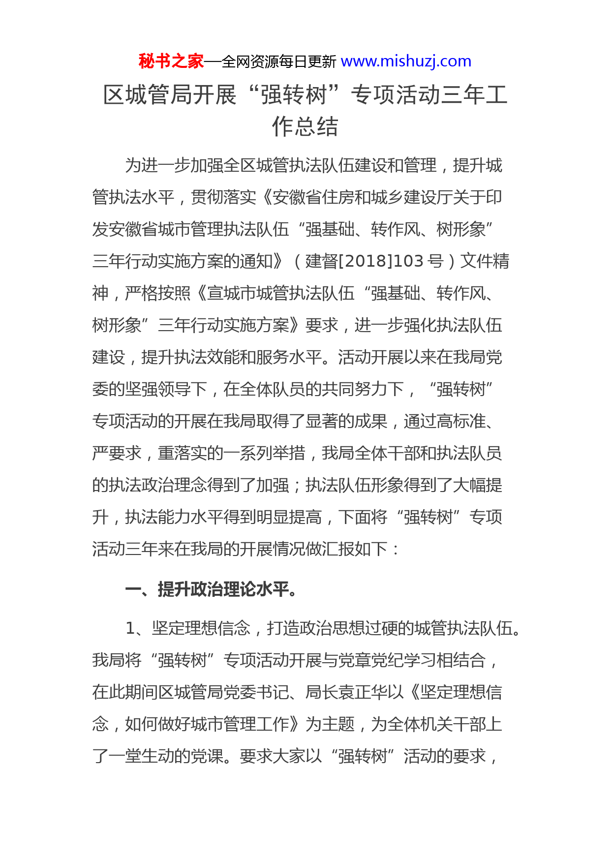秘书之家—全网资源每日更新www.mishuzj.com区城管局开展“强转树”专项活动三年工作总结为进一步加强全区城管执法队伍建设和管理,提升城管执法水平,贯彻落实《安徽省住房和城乡建设厅关于印发安徽省城市管理执法队伍“强基础、转作风、树形象”三年行动实施方案的通知》(建督[2018]103号)文件精神,严格按照《宣城市城管执法队伍“强基础、转作风、树形象”三年行动实施方案》要求,进一步强化执法队伍建设,提升执法效能和服务水平。活动开展以来在我局党委的坚强领导下,在全体队员的共同努力下,“强转树”专项活动的开展在我局取得了显著的成果,通过高标准、严要求,重落实的一系列举措,我局全体干部和执法队员的执法政治理念得到了加强;执法队伍形象得到了大幅提升,执法能力水平得到明显提高,下面将“强转树”专项活动三年来在我局的开展情况做汇报如下:一、提升政治理论水平。1、坚定理想信念,打造政治思想过硬的城管执法队伍。我局将“强转树”专项活动开展与党章党纪学习相结合,在此期间区城管局党委书记、局长袁正华以《坚定理想信念,如何做好城市管理工作》为主题,为全体机关干部上了一堂生动的党课。要求大家以“强转树”活动的要求,秘书之家—全网资源每日更新www.mishuzj.com认真履行自己的职责使命。另外还组织党员集中学习:宣区纪发《关于两起饮酒驾车案例的通报》和《关于三起侵害群众利益不正之风和腐败问题典型案例的通报》;另外还采取多方法多形式对党的十八届六中全会精神进行了认真学习和讨论,认真学习贯彻两个《准则》、两个《条例》,落实中央八项规定、省市“三十条规定”和区委“二十条规定”,狠抓干部作风教育,杜绝懒政思想。2、我局执法人员理论学习及培训情况。三年来根据省市要求,我局组织全体执法队员,先后参加省市组织的执法培训,通过系统的学习和交流,大大的提升了队员的执法理论和处置水平。另外局里也采取多种形式的培训,对全体机关干部和执法队员进行了理论学习和规范执法等知识培训,通过培训学习强化了全体干部和队员执法为民的政治意识,提升了执法为民的服务理念,增强了文明执法的法治意识和执法能力水平,为我们的城市管理工作打下了坚实的政治理论基础。二、完善执法制度。随着“强转树”专项活动的开展,总结过去执法的经验教训,执法制度的不完善给我们城市管理带来了一系列的执法问题,执法难、执法弱、执法程序不规范等问题突出。“强转树”专项活动开展以来,一直致力于改善当前秘书之家—全网资源每日更新www.mishuzj.com的执法环境,解决执法难,程序复杂的问题,宣城市先后出台了《宣城市城市管理办法》、《宣城市违法建设认定处置办法》、《宣城市规划区内违法建设简易程序查处暂行办法》等,着力打造能执法、敢执法、规范执法的执法体系和执法队伍。1、完善了执法队伍内部规范化管理制度和执法制度,建立了内部监督机构和考核机制。2、完善了标准化中队建设,提升了硬件设施配备标准,打造信息化,网络化的新城管。3、完善了城管执法权力清单和责任清单,向社会公布了城市管理执法职能职责、执法依据、处罚标准、运行流程、监督途径、问责机制等.(4)完善了执法监督机制,建立健全重大案件集体讨论机制、案卷评查检查工作,强化内部监督,杜绝了执法不严,执法不公的问题发生。(5)严格落实住建部建督综函【2016】1号文件,按照宣城市城市管理执法全程记录管理办法,推行城市管理执法全程记录工作。三、改变工作作风,打造服务型城管。秘书之家—全网资源每日更新www.mishuzj.com“721”工作法是“强转树”专项活动的要求,也是城市管理工作的方向。随着“721”工作法在我局的推广,全体执法人员和机关干部,严格按照“721”工作法落实工作制度,突出服务为先,变被动管理为主动服务的理念,变末端执法为源头治理的方法。让70%的问题用服务手段解决;20%的问题用管理手段解决;10%的问题用执法手段解决的工作模式已经在我局全面展开深入每名执法队员的心中和行动中。活动开展以来我们由被动管理转为主动服务,主动帮助市民、社区村(居)民解决难题,管理方法的改变明显提升了管理效能,群众的满意度也得到了大幅提升,城市管理的效果更加明显。四、严明工作纪律,打造清正廉洁的城管队伍。坚持廉洁自律的道德操守,打造清清白白的城管执法队伍,是我局一直以来坚持的职业操守标准。特别是“强转树”专项活动开展以来,我局严格按照《中国共产党廉洁自律准则》和《中国共产党纪律处分条例》狠抓队伍建设,增强干部职工的宗旨意识、廉政意识、责任意识、遵纪守法意识,杜绝机关干部和执法队员在工作中依靠职能权限以权谋私,滥用职权等现象的发生。“强基础、转作风、树形象”对于城市管理工作,永远在路上,我局将一如既往地的按照活动要求,严格要求自秘书之家—全网资源每日更新www.mishuzj.com己,加强学习,树立新风,以认真负责,文明热情的态度,全心全意为人民服务。我们也将结合“强转树”活动的开展继续开拓创新,为城市管理工作谋求更好的工作机制和服务。在城管队伍建设新的历史起点上,一切都是崭新的开始,一支崭新的城管队伍将迎来新的机遇和挑战,我们要肩负起城市建设发展