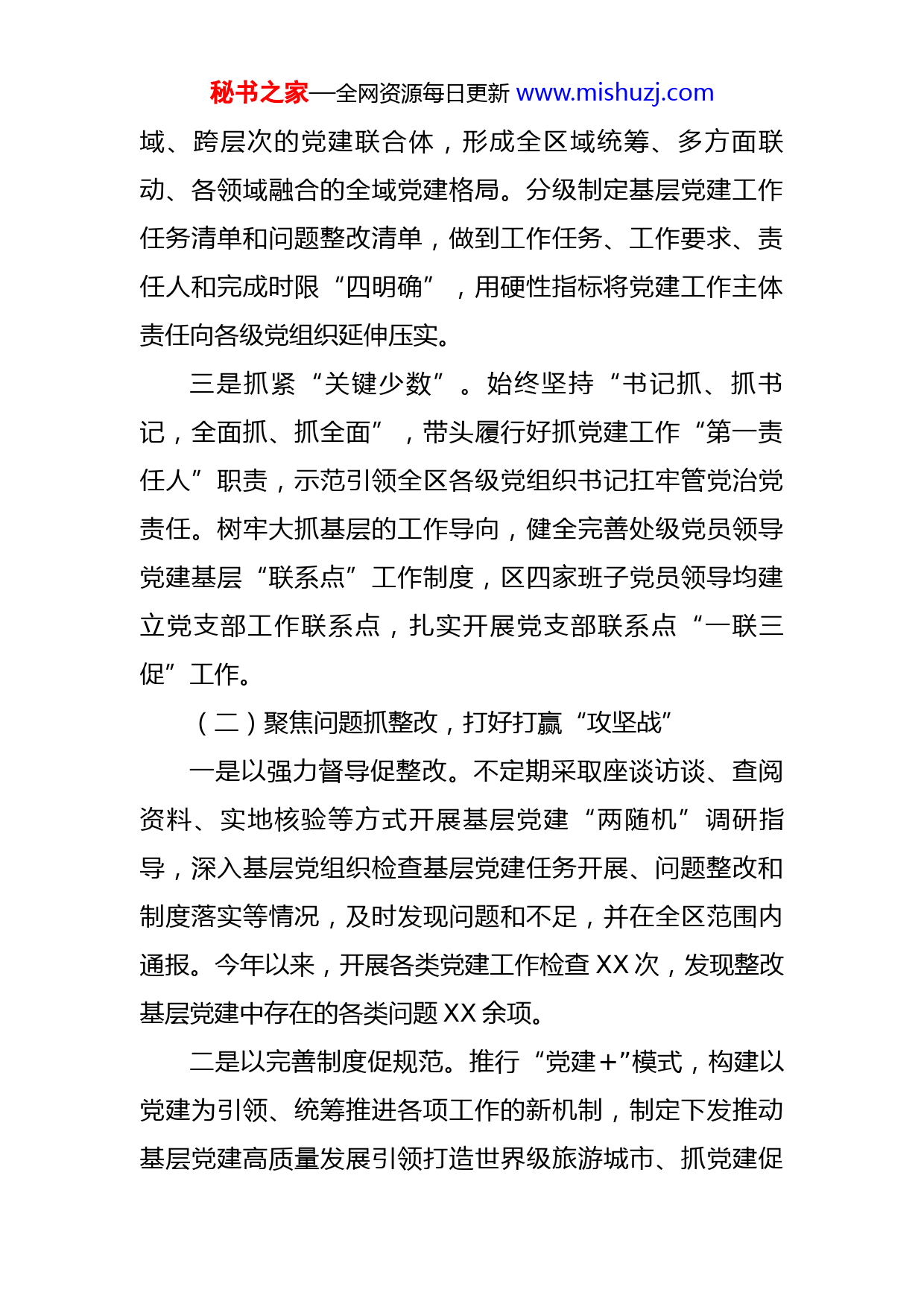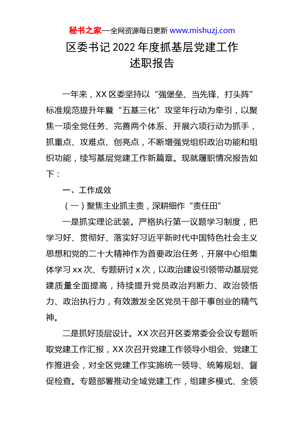 秘书之家—全网资源每日更新www.mishuzj.com区委书记2022年度抓基层党建工作述职报告一年来,XX区委坚持以“强堡垒、当先锋、打头阵”标准规范提升年暨“五基三化”攻坚年行动为牵引,以聚焦一项全党任务、完善两个体系、开展六项行动为抓手,抓重点、攻难点、创亮点,不断增强党组织政治功能和组织功能,续写基层党建工作新篇章。现就履职情况报告如下:一、工作成效(一)聚焦主业抓主责,深耕细作“责任田”一是抓实理论武装。严格执行第一议题学习制度,把学习好、贯彻好、落实好习近平新时代中国特色社会主义思想和党的二十大精神作为首要政治任务,开展中心组集体学习xx次、专题研讨x次,以政治建设引领带动基层党建质量全面提高,持续提升党员政治判断力、政治领悟力、政治执行力,有效激发全区党员干部干事创业的精气神。二是抓好顶层设计。XX次召开区委常委会会议专题听取党建工作汇报,XX次召开党建工作领导小组会、党建工作推进会,对全区党建工作实施统一领导、统筹规划、督促检查。专题部署推动全域党建工作,组建多模式、全领秘书之家—全网资源每日更新www.mishuzj.com域、跨层次的党建联合体,形成全区域统筹、多方面联动、各领域融合的全域党建格局。分级制定基层党建工作任务清单和问题整改清单,做到工作任务、工作要求、责任人和完成时限“四明确”,用硬性指标将党建工作主体责任向各级党组织延伸压实。三是抓紧“关键少数”。始终坚持“书记抓、抓书记,全面抓、抓全面”,带头履行好抓党建工作“第一责任人”职责,示范引领全区各级党组织书记扛牢管党治党责任。树牢大抓基层的工作导向,健全完善处级党员领导党建基层“联系点”工作制度,区四家班子党员领导均建立党支部工作联系点,扎实开展党支部联系点“一联三促”工作。(二)聚焦问题抓整改,打好打赢“攻坚战”一是以强力督导促整改。不定期采取座谈访谈、查阅资料、实地核验等方式开展基层党建“两随机”调研指导,深入基层党组织检查基层党建任务开展、问题整改和制度落实等情况,及时发现问题和不足,并在全区范围内通报。今年以来,开展各类党建工作检查XX次,发现整改基层党建中存在的各类问题XX余项。二是以完善制度促规范。推行“党建+”模式,构建以党建为引领、统筹推进各项工作的新机制,制定下发推动基层党建高质量发展引领打造世界级旅游城市、抓党建促秘书之家—全网资源每日更新www.mishuzj.com乡村振兴、加强新时代党建带群建工作等制度文件,推进党建工作和中心工作深度融合,以党建工作成效推动“三大振兴”各项任务落实落地。三是以共联共建促提升。发挥党建联盟效应,组建“红雁相思”党建联盟,定期召开“红雁相思”发展论坛,在品牌建设、村企合作、校地合作等方面共享资源,开展校园进万家、学生进企业等活动,让党建联盟成员党组织相互提升、共同创优。建立完善校地协作机制,依托人才合作联盟平台,立足科教组团优势,做好校地企合作文章,活用机制、引育、科技“三轴”同向发力,汇聚人才强劲动能,人才工作经验做法在市委人才工作会议上做书面交流。(三)聚焦重点抓提升,把稳握牢“方向盘”一是党建引领乡村振兴。大力实施党建引领乡村振兴战略,以XX田园综合体为载体,统筹组织建设、阵地建设、人才支撑、乡村治理、产业振兴“五大行动”,推动田园综合体党建工作提档升级。以盘活资产、土地流转、产业融合、“人才回流”、项目驱动为重要抓手,不断探索多元化村级集体经济发展路子,XX个行政村集体经济年收入均达到5万元以上,其中XX个达到20万元以上,XX个达到50万元以上。二是党建引领文旅腾飞。在积极融入世界级旅游城市秘书之家—全网资源每日更新www.mishuzj.com建设中深度嵌入党建工作,争创国家全域旅游示范区和国家级旅游度假区,文旅品牌建设成效明显。XX区成功入选2022年国家全域旅游示范区初审验收达标名单,2022年广西广播电视台中秋晚会等重要活动在XX举办,融创旅游度假区入选国家级夜间文化和旅游消费集聚区、国家AAAA级旅游景区和自治区级旅游度假区,乡谣里获评2022年“广西休闲农业与乡村旅游示范点”。三是党建引领民生福祉。突出服务功能,组织全区党员干部“当先锋、作表率、站排头”,为夺取疫情防控和服务民生“双胜利”提供坚强组织保证。组织XX余名党员干部深入社区、村屯防控卡口,参与和支援疫情防控,织密防控网络。持续推进为民办实事工程,XX学校实现开学,XX公交环线顺利开通,XX医院XX院区、XX区中心卫生院等项目加快推进,XX大学附属外国语学校(校本部)、XX高级中等19个重点项目实现开工。全市打击治理电信网络新型违法犯罪工作现场会在XX召开,全国人大调研组到XX调研时对XX区漓江生态环境保护成效给予充分肯定。(四)聚焦基层抓保障,夯实建强“主阵地”一是强化基础保障。持续深化基层党组织标准化规范化建设,优先保障基层党建投入,落实落足村级组织运转经费,村干部报酬居全市前列;全力抓好阵地建设,多渠秘书之家—全网资源每日更新www.mishuzj.com道筹措资金XX万元,实施基层阵地建设提档升级项目XX个。新建XX乡党建振兴广场,建设XX村屯级党群服务中心,打通服务群众“最后一百米”。二是强抓载体建设。打造“红湾”