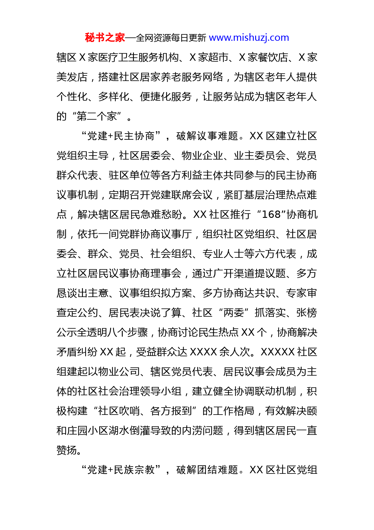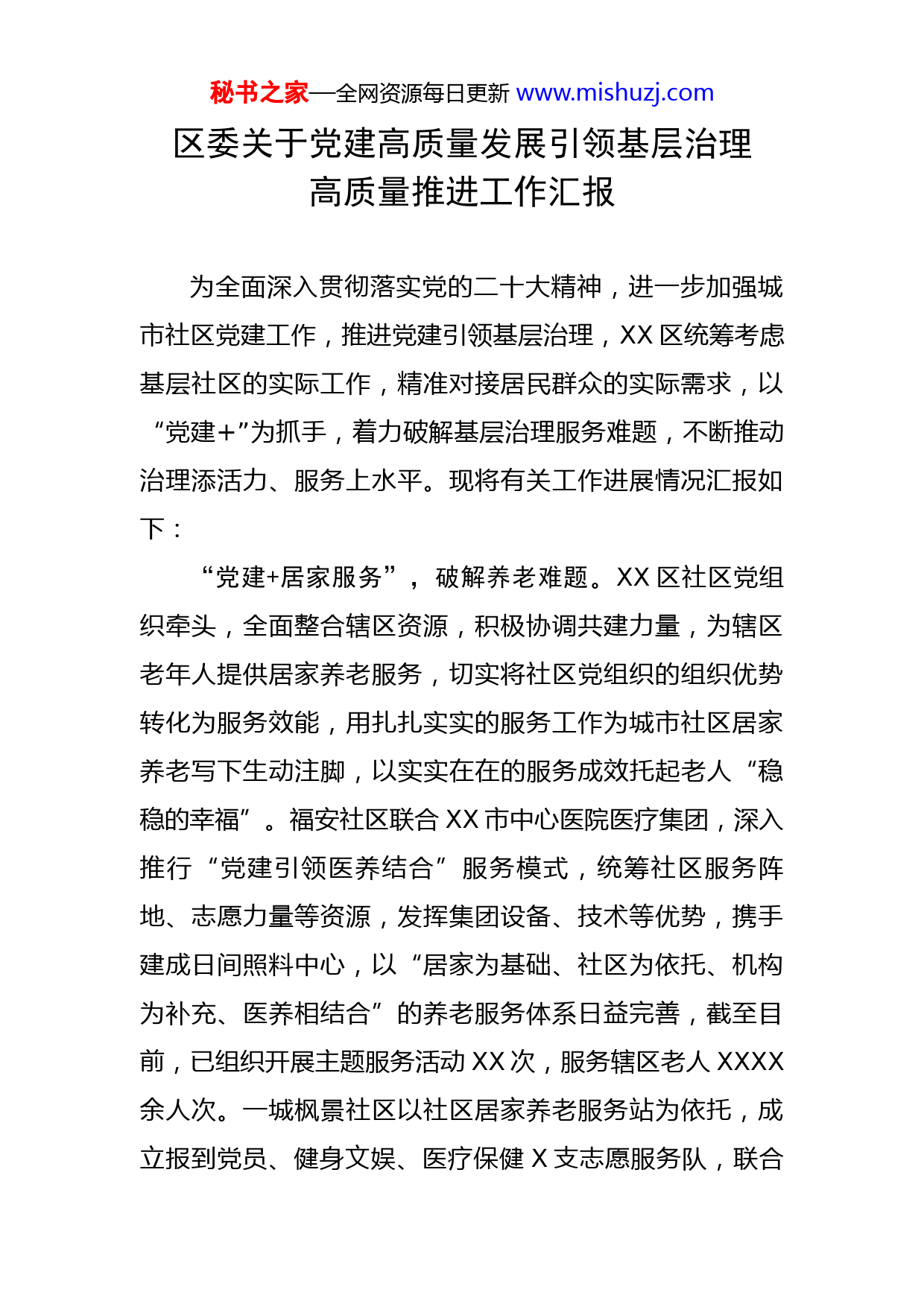 秘书之家—全网资源每日更新www.mishuzj.com区委关于党建高质量发展引领基层治理高质量推进工作汇报为全面深入贯彻落实党的二十大精神,进一步加强城市社区党建工作,推进党建引领基层治理,XX区统筹考虑基层社区的实际工作,精准对接居民群众的实际需求,以“党建+”为抓手,着力破解基层治理服务难题,不断推动治理添活力、服务上水平。现将有关工作进展情况汇报如下:“党建+居家服务”,破解养老难题。XX区社区党组织牵头,全面整合辖区资源,积极协调共建力量,为辖区老年人提供居家养老服务,切实将社区党组织的组织优势转化为服务效能,用扎扎实实的服务工作为城市社区居家养老写下生动注脚,以实实在在的服务成效托起老人“稳稳的幸福”。福安社区联合XX市中心医院医疗集团,深入推行“党建引领医养结合”服务模式,统筹社区服务阵地、志愿力量等资源,发挥集团设备、技术等优势,携手建成日间照料中心,以“居家为基础、社区为依托、机构为补充、医养相结合”的养老服务体系日益完善,截至目前,已组织开展主题服务活动XX次,服务辖区老人XXXX余人次。一城枫景社区以社区居家养老服务站为依托,成立报到党员、健身文娱、医疗保健X支志愿服务队,联合秘书之家—全网资源每日更新www.mishuzj.com辖区X家医疗卫生服务机构、X家超市、X家餐饮店、X家美发店,搭建社区居家养老服务网络,为辖区老年人提供个性化、多样化、便捷化服务,让服务站成为辖区老年人的“第二个家”。“党建+民主协商”,破解议事难题。XX区建立社区党组织主导,社区居委会、物业企业、业主委员会、党员群众代表、驻区单位等各方利益主体共同参与的民主协商议事机制,定期召开党建联席会议,紧盯基层治理热点难点,解决辖区居民急难愁盼。XX社区推行“168”协商机制,依托一间党群协商议事厅,组织社区党组织、社区居委会、群众、党员、社会组织、专业人士等六方代表,成立社区居民议事协商理事会,通过广开渠道提议题、多方恳谈出主意、议事组织拟方案、多方协商达共识、专家审查定公约、居民表决说了算、社区“两委”抓落实、张榜公示全透明八个步骤,协商讨论民生热点XX个,协商解决矛盾纠纷XX起,受益群众达XXXX余人次。XXXXX社区组建起以物业公司、辖区党员代表、居民议事会成员为主体的社区社会治理领导小组,建立健全协调联动机制,积极构建“社区吹哨、各方报到”的工作格局,有效解决颐和庄园小区湖水倒灌导致的内涝问题,得到辖区居民一直赞扬。“党建+民族宗教”,破解团结难题。XX区社区党组秘书之家—全网资源每日更新www.mishuzj.com织把民族宗教工作纳入基层党建重要议事日程,嵌入社区治理日常工作,坚持宣传引导和服务引领双管齐下,进一步推动基层党建与民族宗教工作同频共振,让每一颗“石榴籽”色泽更鲜红、果肉更紧实。民主社区围绕“共同团结奋斗,共同繁荣发展”主题,创新民族团结宣传教育形式,建成XX余米长的民族文化宣传长廊,制作宣传展板XX余块,图文并茂地展示各族群众的友好交往、生活交融、文化交流;定期召开少数民族座谈会,开辟“回族文化大讲堂”,以少数民族重大节日和民族团结宣传月为契机,广泛开展系列宣传活动XX余场;打造少数民族流动人口服务站,推行一站式服务,为少数民族居民办理业务提供便利条件。黄河西路社区结合网格化管理,统筹辖区网格员、楼门长等力量,积极开展以送政策、送文化、送健康、送服务为主要内容的“四送”活动,积极营造民族大团结、人民大联合的浓厚氛围。“党建+国防教育”,破解双拥难题。XX区以社区阵地建设为切入点,以拥军优属活动为着力点,推动党建工作与国防教育有效结合、深度融合,在全区范围内大力营造支持国防建设、落实双拥政策的舆论氛围。解放西路社区依托社区国防教育基地,开设国防教育模拟课堂,每月组织一次国防教育讲座,让适龄青年普遍接收革命传统和爱国主义教育,每年受众达XXXX余人次。丽景社区牢牢秘书之家—全网资源每日更新www.mishuzj.com抓住“八一”、国庆等重要时间节点,组织辖区青少年参观社区国防教育活动中心,邀请社区国防教育宣传员武春章宣讲《中华人民共和国国防教育法》,大力普及国防教育知识。XX社区退役军人服务站每年组织评选辖区“最美军属”,组织退役军人重温军旅生活,组织退伍军人及部分军属到革命圣地开展爱国主义教育,联合部队举办“七夕心连心军民联谊会”,为退役军人家庭发放光荣牌,截至目前共发放XX个,军政关系日益紧密,军民关系持续巩固。专此报告!