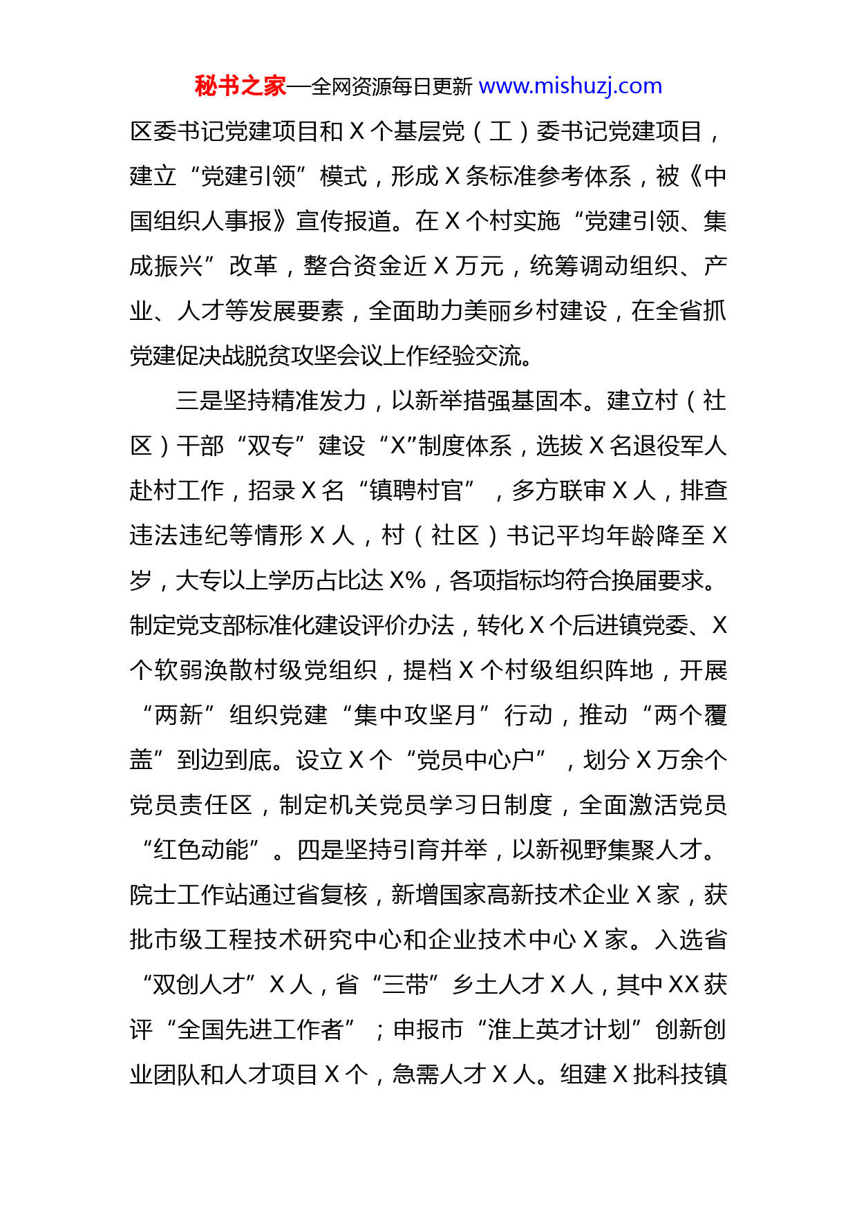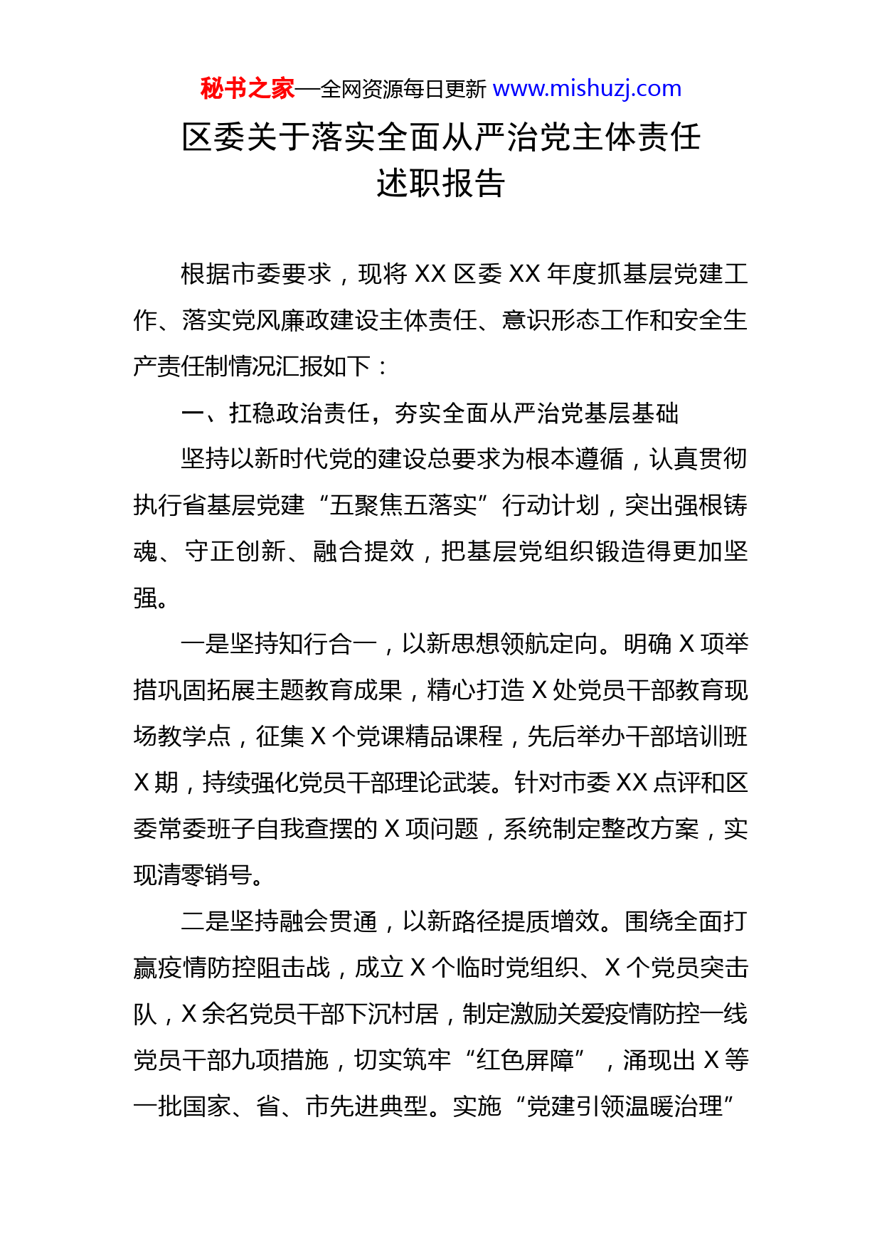 秘书之家—全网资源每日更新www.mishuzj.com区委关于落实全面从严治党主体责任述职报告根据市委要求,现将XX区委XX年度抓基层党建工作、落实党风廉政建设主体责任、意识形态工作和安全生产责任制情况汇报如下:一、扛稳政治责任,夯实全面从严治党基层基础坚持以新时代党的建设总要求为根本遵循,认真贯彻执行省基层党建“五聚焦五落实”行动计划,突出强根铸魂、守正创新、融合提效,把基层党组织锻造得更加坚强。一是坚持知行合一,以新思想领航定向。明确X项举措巩固拓展主题教育成果,精心打造X处党员干部教育现场教学点,征集X个党课精品课程,先后举办干部培训班X期,持续强化党员干部理论武装。针对市委XX点评和区委常委班子自我查摆的X项问题,系统制定整改方案,实现清零销号。二是坚持融会贯通,以新路径提质增效。围绕全面打赢疫情防控阻击战,成立X个临时党组织、X个党员突击队,X余名党员干部下沉村居,制定激励关爱疫情防控一线党员干部九项措施,切实筑牢“红色屏障”,涌现出X等一批国家、省、市先进典型。实施“党建引领温暖治理”秘书之家—全网资源每日更新www.mishuzj.com区委书记党建项目和X个基层党(工)委书记党建项目,建立“党建引领”模式,形成X条标准参考体系,被《中国组织人事报》宣传报道。在X个村实施“党建引领、集成振兴”改革,整合资金近X万元,统筹调动组织、产业、人才等发展要素,全面助力美丽乡村建设,在全省抓党建促决战脱贫攻坚会议上作经验交流。三是坚持精准发力,以新举措强基固本。建立村(社区)干部“双专”建设“X”制度体系,选拔X名退役军人赴村工作,招录X名“镇聘村官”,多方联审X人,排查违法违纪等情形X人,村(社区)书记平均年龄降至X岁,大专以上学历占比达X%,各项指标均符合换届要求。制定党支部标准化建设评价办法,转化X个后进镇党委、X个软弱涣散村级党组织,提档X个村级组织阵地,开展“两新”组织党建“集中攻坚月”行动,推动“两个覆盖”到边到底。设立X个“党员中心户”,划分X万余个党员责任区,制定机关党员学习日制度,全面激活党员“红色动能”。四是坚持引育并举,以新视野集聚人才。院士工作站通过省复核,新增国家高新技术企业X家,获批市级工程技术研究中心和企业技术中心X家。入选省“双创人才”X人,省“三带”乡土人才X人,其中XX获评“全国先进工作者”;申报市“淮上英才计划”创新创业团队和人才项目X个,急需人才X人。组建X批科技镇秘书之家—全网资源每日更新www.mishuzj.com长团,协助企业申报专利X项,合作建立研发平台X个。一年来,全区基层党建工作取得显著成效,但也还存在一些问题:一是党建典型培育工作还需进一步加强,示范创建处习的系统性、集成性有待提升。二是党建资源整合力度还需进一步加大,不同领域党组织统筹联动机制有待完善。三是企业引才用才主体作用还需进一步发挥,企业科技创新的内生动力不足,核心技术相对缺乏。下一步,我们将深入贯彻落实党的二十大精神,推动基层党建工作上新台阶。一是在党建品牌做精做深上下功夫,建立健全党建品牌培育机制,全力提升品牌向心力、影响力和美誉度。二是在党建资源共创共享上下功夫,完善统筹联动工作体系,加快形成组织全覆盖、工作区域化、活动开放式的党建新格局。三是在产才融合互动互促上下功夫,坚持聚焦产业、聚力创新、聚集人才,不断凝聚人才工作合力、提升科技创新质效。二、持续正风肃纪,直击全面从严治党要点要害紧紧抓住党风廉政建设,持之以恒改进作风,坚定不移惩治腐败,不断营造风清气正的政治生态。一是坚持政治引领,突出担当作为。坚决落实中央和省、市委重大决策部署,以实际行动践行“两个维护”。紧盯“三大攻坚秘书之家—全网资源每日更新www.mishuzj.com战”,全区XX个低收入村和经济薄弱村年收入达X万元以上,打造全省普惠金融试点样板区,助力产业扶贫,发放普惠金融贷款X万元,实现阶段性收益X万元,相关低收入户户均增收X万元,得到了省纪委XX书记的充分肯定,人民网专访推介;生态环境持续向好;政府债务风险总体可控。全面落实稳企惠民政策,搭建“亲清双月谈”平台,创新经济“网格化”服务管理,开展“六稳”“六保”专项巡察,相关做法被《中国纪检监察报》头版刊发推介。二是坚持责任引领,突出从严治党。制定出台《中共XX区委XX年度全面从严治党主体责任清单》,区委常委会全年X次专题研究党风廉政建设,上报集体履责信息X条、班子成员履责信息X条。深化完善“明责、督责、考责、问责”责任传导机制,印发专题通报X期,对X家党组织、X名党员干部予以问责。三是坚持纪律引领,突出民生保障。坚持反腐力度不减、节奏不变、尺度不松,全年处置问题线索X条,精准运用“四种形态”处理干部X人次。聚焦民政、教育、医疗、住房等重点民生领域突出问题开展专项治理,推动化解问题楼盘X个,加快建设农房改善项目X个,治理城区幼儿园X所,建立健全制度X项,查处群众身边的腐败和不正之风问题X起,给予党纪政务处分X人次,相关做法被省纪委专刊推介。四是坚持作风引领,突出实干争先。驰而不息纠“四风”、树新秘书之家—全网资源每日更新www.mishuzj.com风,实施作风攻坚专项行动,建立红旗激励、黄牌预警“双向”工作机制,