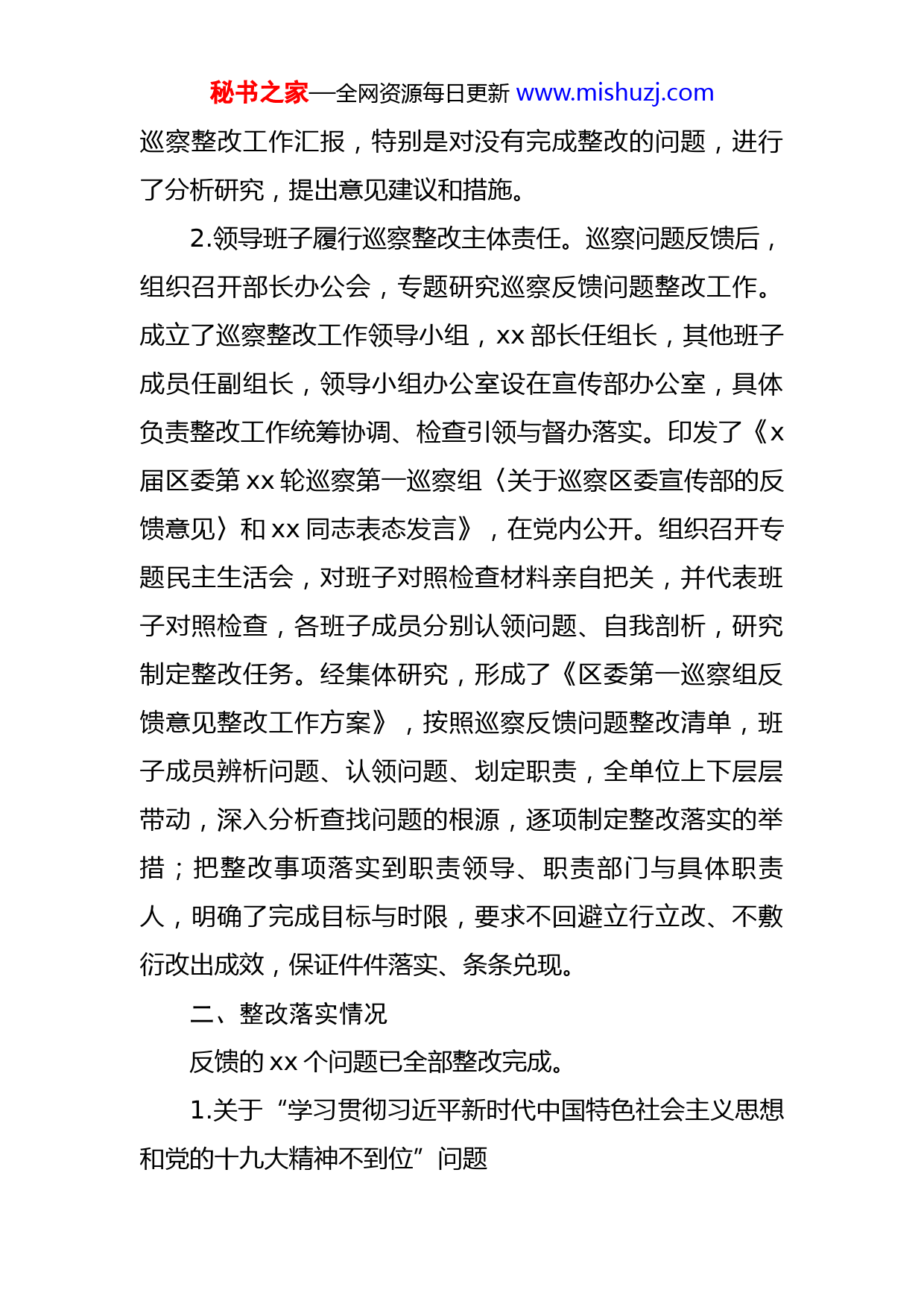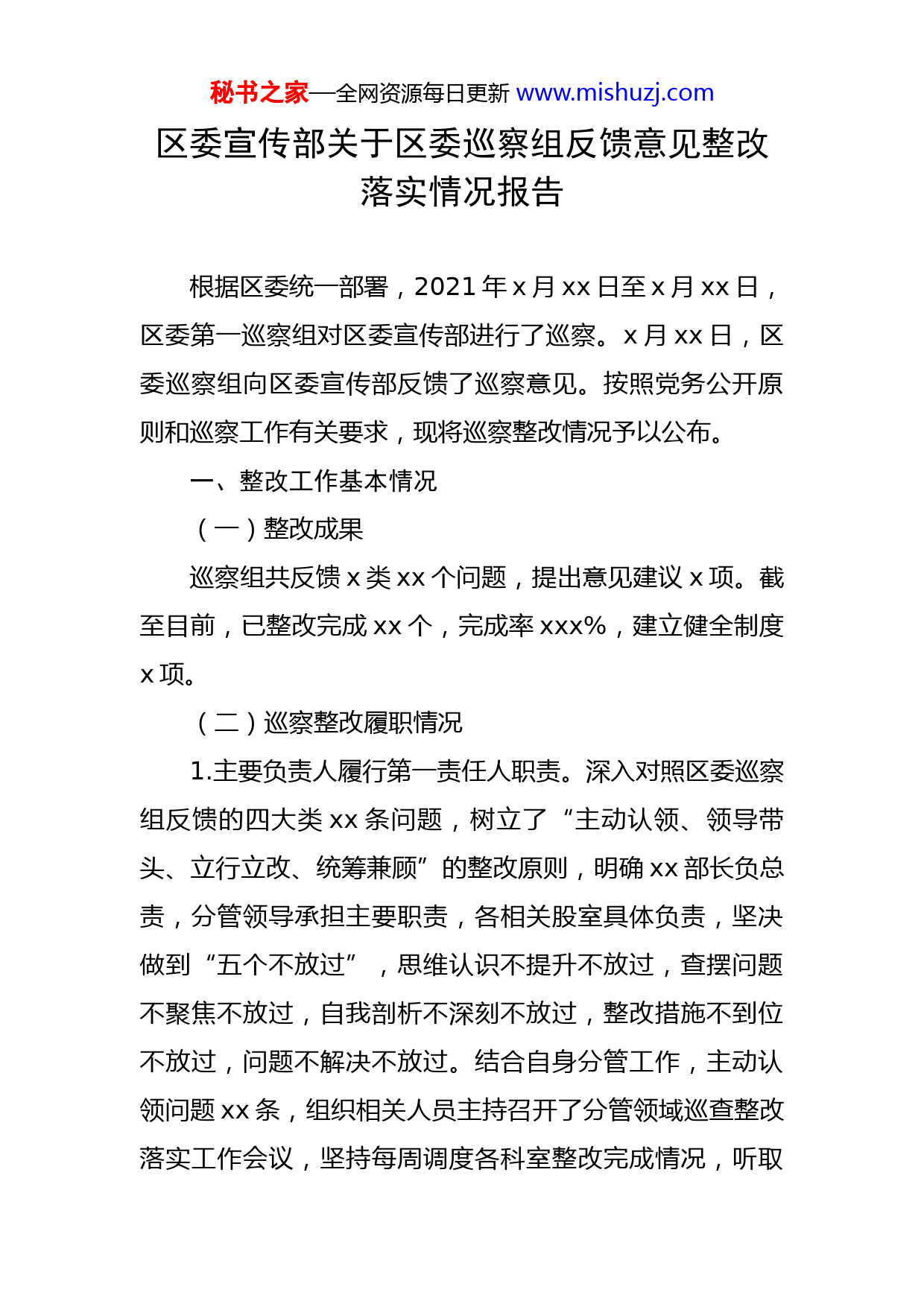 秘书之家—全网资源每日更新www.mishuzj.com区委宣传部关于区委巡察组反馈意见整改落实情况报告根据区委统一部署,2021年x月xx日至x月xx日,区委第一巡察组对区委宣传部进行了巡察。x月xx日,区委巡察组向区委宣传部反馈了巡察意见。按照党务公开原则和巡察工作有关要求,现将巡察整改情况予以公布。一、整改工作基本情况(一)整改成果巡察组共反馈x类xx个问题,提出意见建议x项。截至目前,已整改完成xx个,完成率xxx%,建立健全制度x项。(二)巡察整改履职情况1.主要负责人履行第一责任人职责。深入对照区委巡察组反馈的四大类xx条问题,树立了“主动认领、领导带头、立行立改、统筹兼顾”的整改原则,明确xx部长负总责,分管领导承担主要职责,各相关股室具体负责,坚决做到“五个不放过”,思维认识不提升不放过,查摆问题不聚焦不放过,自我剖析不深刻不放过,整改措施不到位不放过,问题不解决不放过。结合自身分管工作,主动认领问题xx条,组织相关人员主持召开了分管领域巡查整改落实工作会议,坚持每周调度各科室整改完成情况,听取秘书之家—全网资源每日更新www.mishuzj.com巡察整改工作汇报,特别是对没有完成整改的问题,进行了分析研究,提出意见建议和措施。2.领导班子履行巡察整改主体责任。巡察问题反馈后,组织召开部长办公会,专题研究巡察反馈问题整改工作。成立了巡察整改工作领导小组,xx部长任组长,其他班子成员任副组长,领导小组办公室设在宣传部办公室,具体负责整改工作统筹协调、检查引领与督办落实。印发了《x届区委第xx轮巡察第一巡察组〈关于巡察区委宣传部的反馈意见〉和xx同志表态发言》,在党内公开。组织召开专题民主生活会,对班子对照检查材料亲自把关,并代表班子对照检查,各班子成员分别认领问题、自我剖析,研究制定整改任务。经集体研究,形成了《区委第一巡察组反馈意见整改工作方案》,按照巡察反馈问题整改清单,班子成员辨析问题、认领问题、划定职责,全单位上下层层带动,深入分析查找问题的根源,逐项制定整改落实的举措;把整改事项落实到职责领导、职责部门与具体职责人,明确了完成目标与时限,要求不回避立行立改、不敷衍改出成效,保证件件落实、条条兑现。二、整改落实情况反馈的xx个问题已全部整改完成。1.关于“学习贯彻习近平新时代中国特色社会主义思想和党的十九大精神不到位”问题秘书之家—全网资源每日更新www.mishuzj.com针对存在问题,制定学习计划,加强学习习近平新时代中国特色社会主义思想和党的十九大精神的力度,采取集中学习、自学相结合的方式,着重学习了《习近平新时代中国特色社会主义思想学习纲要》、十九大报告,并对应知应会内容进行归纳发给每位党员,确保习近平新时代中国特色社会主义思想和党的十九大精神入心入脑。支部经常督促党员积极学习,定期抽查党员学习情况,来促进党员持续高效的学习。通过学习,党员们在“学懂弄通做实”上有了提升,为进一步树牢“四个意识”,坚定“四个自信”,做到“两个维护”打下了更坚定的思想基础。2.关于“主题教育开展不认真”问题严格上级决策部署和要求,认真组织开展党史学习教育教育,部长办公会专题研究部机关开展党史学习教育2次。制定完善了区委宣传部“三重一大”制度,并严格执行,重大事项决策均经集体讨论后部署开展。3.关于“学习贯彻本部门文件精神不全面”问题召开部长办公会研究学习了《中国共产党党和国家机关基层组织工作条例》《中国共产党宣传工作条例》,制定了学习计划,特别将本部门文件精神作为党员学习的教材,纳入党员干部教育培训内容,切实提高党员干部的理论基础和业务水平。坚持领导班子带头学与全体人员集体学相结合,部长办公会经常研究学习中央和省市区委有关秘书之家—全网资源每日更新www.mishuzj.com理论内容,指导督促全体干部开展学习。4.关于“网络正面舆论引导不足”问题结合区委区政府重点工作,利用“xx发布”网宣矩阵做好重要会议、重大活动、重要节点的网络宣传工作。聚焦我区创城工作,“图说价值观·巧手绘文明”、“记录小康工程——家乡巨变我来晒”、“城市蜕变——聚焦区域性中心城市建设”等活动的线上宣推。整改以来,根据不同的时间节点,陆续开展中国共产党成立100周年、普法、暑期防溺水宣传、战秋汛、国庆等宣传工作,制作漫画、长图、短视频新媒体作品开展网上宣传。落实省市相关要求,做好常态化宣传工作,普及疫情防控知识,唱好“四季歌”。开展2021xx网络文明周、国家网络安全宣传周等活动,组织校园日、法治日、电信日等主题日活动,及时报道活动动态信息、制作转发系列新媒体作品,线上线下合力,营造浓厚的宣传氛围。强化亮点收集。加大对全区工作亮点的收集,通过组织开展网络媒体走进xx区活动,进一步发现亮点、推宣亮点,扩大了网络宣传工作的引导力、传播力。密切联系区内重点媒体、自媒体,组织“花开盛世·赏xxxx”网络媒体行等活动,组建xx区网宣素材共享群,推动网宣集群效应,落实网上宣传“一盘棋”的工作要求。5.关于“创城宣传氛围营造不浓”问题秘书之家—全网资源每日更新www.mishuzj.com一是持续加大创城公益广告设置,各类沿街商铺LED屏滚动播出创城公益宣传图和标语,持续更