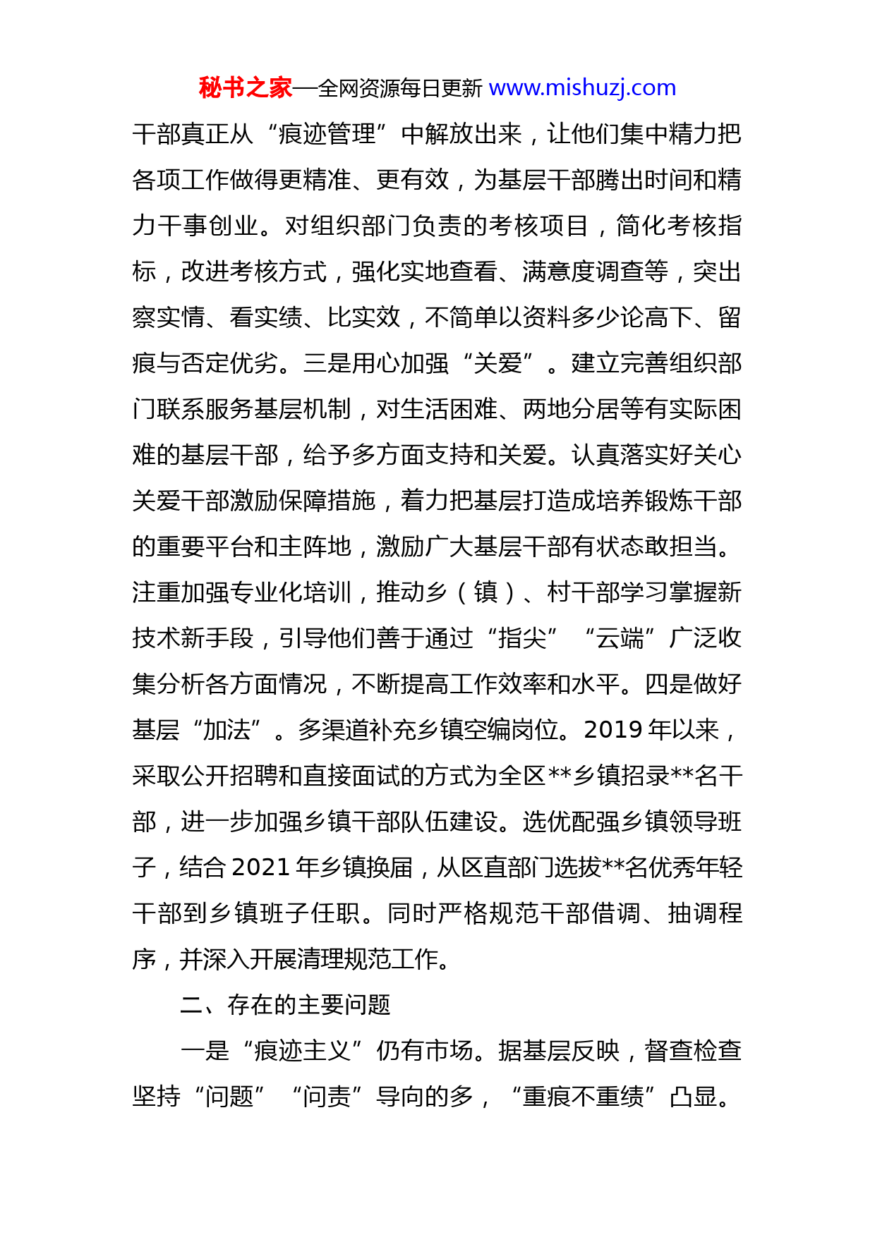 秘书之家—全网资源每日更新www.mishuzj.com区委组织部整治形式主义为基层减负工作情况汇报党的十九大以来,区委组织部深入贯彻落实上级关于解决形式主义突出问题为基层减负的部署要求,措施有力、持续发力,上级文件精神得到有效落实,基层减负效果明显,广大干部担当作为、干事创业的劲头竞相迸发。一、主要做法和成效区委组织部坚持问题导向、需求导向、效果导向,强化源头控制,带头改进作风,切实为基层松绑减负。一是狠下功夫“精减”。每年年初开出文山会海“瘦身处方”,干部、党建、人才等各方面工作能合并发文的,不再单独发文,减少普发性文件,做到可发可不发的文件一律不发。内容相似、时间接近或参会人员交叉的会议,一般合并召开或套开,可开可不开的会议一律不开。提倡蹲点调研、“解剖麻雀”,坚决防止“痕迹主义”。开展综合性督查检查时,同类事项合并进行,可查可不查的检查一律削减。探索运用新技术新手段推动工作,进一步强化“先锋e坊”平台的运用,用大数据来管理和调度基层党建工作。二是从上到下“简约”。部领导下乡调研轻车简从,不踩点,不打招呼,不陪同。资料管理适度留“痕”,即不过度留“痕”,也不特意留“痕”,把基层秘书之家—全网资源每日更新www.mishuzj.com干部真正从“痕迹管理”中解放出来,让他们集中精力把各项工作做得更精准、更有效,为基层干部腾出时间和精力干事创业。对组织部门负责的考核项目,简化考核指标,改进考核方式,强化实地查看、满意度调查等,突出察实情、看实绩、比实效,不简单以资料多少论高下、留痕与否定优劣。三是用心加强“关爱”。建立完善组织部门联系服务基层机制,对生活困难、两地分居等有实际困难的基层干部,给予多方面支持和关爱。认真落实好关心关爱干部激励保障措施,着力把基层打造成培养锻炼干部的重要平台和主阵地,激励广大基层干部有状态敢担当。注重加强专业化培训,推动乡(镇)、村干部学习掌握新技术新手段,引导他们善于通过“指尖”“云端”广泛收集分析各方面情况,不断提高工作效率和水平。四是做好基层“加法”。多渠道补充乡镇空编岗位。2019年以来,采取公开招聘和直接面试的方式为全区乡镇招录名干部,进一步加强乡镇干部队伍建设。选优配强乡镇领导班子,结合2021年乡镇换届,从区直部门选拔名优秀年轻干部到乡镇班子任职。同时严格规范干部借调、抽调程序,并深入开展清理规范工作。二、存在的主要问题一是“痕迹主义”仍有市场。据基层反映,督查检查坚持“问题”“问责”导向的多,“重痕不重绩”凸显。秘书之家—全网资源每日更新www.mishuzj.com检查组带着“显微镜”“放大镜”开展督查检查,只负责“发现问题”,协调帮助和指导服务不力。督查检查偏重资料,每项工作都要拍照片、做笔记、建台账,重留痕轻实绩检查考核成了常态。有的乡镇反映,为更好地迎接检查,经常在一个多议题的会议中频繁变更会标,只为拍照留存佐证。二是文山会海没有根除。会议仍然较多,同一个会议从中央到基层的“层层贯彻落实”,变成了“层层开会专题研究”,乡镇、村经常多次参加相同主题内容会议,占用了大量时间,增加了行政成本。文件仍然较多,文件与上级雷同多,结合工作实际、下级情况情不够,有以文件落实文件的倾向。据统计2019、2020、2021区委组织部三年发文分别为82件、81件和85件,发文数量没有实现逐年递减。一些工作在检查考核、指标设定、时限要求等方面“层层加码”,没有充分考虑基层实际,从而使“今天喊明天要”“刚布置马上要”等现象屡屡发生。三是关爱激励还需加强。容错纠错机制的配套制度不健全,《容错纠错办法(试行)》中明确规定五种情形属可容错的行为,但没有具体实施细则及其相关配套政策作为指引,具有较大的弹性解释空间,存在认定自由裁量空间,容易导致容错的边界和尺度难以把握。落实公务员职务与职级并行政策不够到位,有少部分日常表现较好、工作能力较突出的基层干部因职级数少而不能晋升。秘书之家—全网资源每日更新www.mishuzj.com三、对策建议整治形式主义为基层减负工作是一项系统工程,容易反弹反复,必须长效治理、久久为功。一要抓住“以上率下”这个关键。要层层压实责任。基层减负不是一时一事,需要持续督促各级领导干部加强减负政策的学习,主动履行主体责任,严格执行减负工作要求,确保减负成果持续巩固。要发挥表率作用。持续推动各级领导干部以身作则、率先垂范,带头规范督查检查考核事项,保持对精文简会的刚性约束,坚持“四不两直”开展调研,着力解决政策执行“一刀切”、层层加码等问题。二要坚持“权责统一”这个原则。要强化部门履责。厘清机关、基层职责边界,督促部门单位切实履行工作责任,严格执行减负措施,防止以“属地管理”之名、行“推卸责任”之实,做到权责统一、各负其责。要引导基层担责。坚持减负不减责、松绑不松懈,督促引导基层干部履职尽责,树立更加务实的工作作风,营造更加良好的履责氛围,保障基层各项工作提质增效,更好地服务发展、服务群众。三要用好“正向激励”这个措施。要强化鼓励激励。加强对基层干部政治上的激励关怀,拓宽基层干部晋升流动渠道。基层干部选拔任用向肯吃苦、
