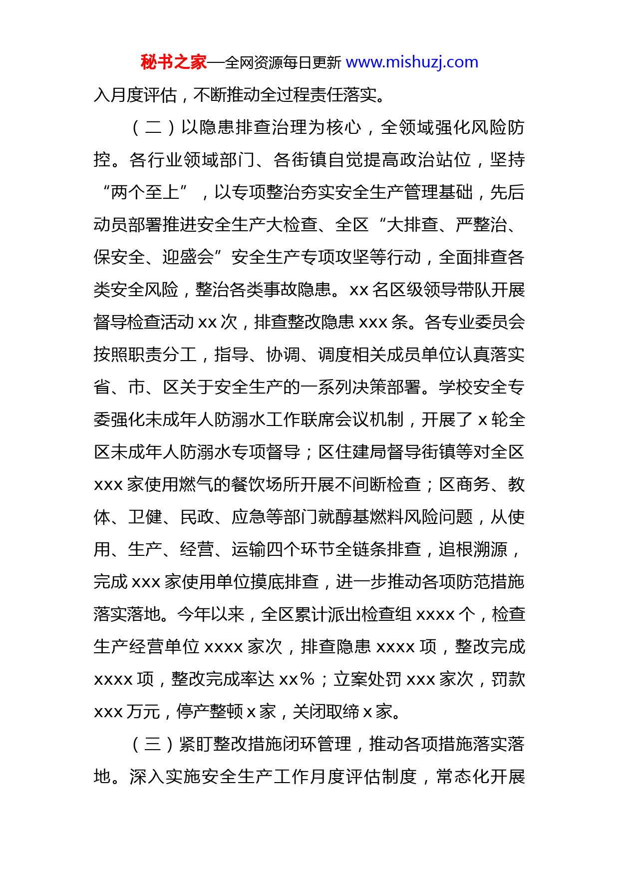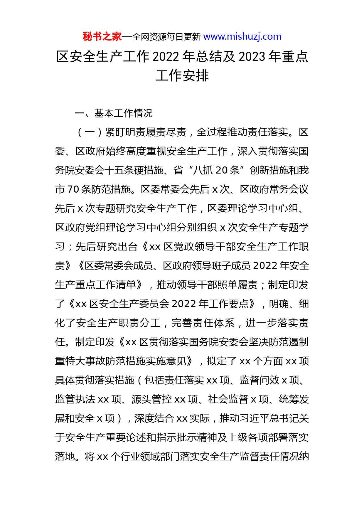 秘书之家—全网资源每日更新www.mishuzj.com区安全生产工作2022年总结及2023年重点工作安排一、基本工作情况(一)紧盯明责履责尽责,全过程推动责任落实。区委、区政府始终高度重视安全生产工作,深入贯彻落实国务院安委会十五条硬措施、省“八抓20条”创新措施和我市70条防范措施。区委常委会先后x次、区政府常务会议先后x次专题研究安全生产工作,区委理论学习中心组、区政府党组理论学习中心组分别组织x次安全生产专题学习;先后研究出台《xx区党政领导干部安全生产工作职责》《区委常委会成员、区政府领导班子成员2022年安全生产重点工作清单》,推动领导干部照单履责;制定印发了《xx区安全生产委员会2022年工作要点》,明确、细化了安全生产职责分工,完善责任体系,进一步落实责任。制定印发《xx区贯彻落实国务院安委会坚决防范遏制重特大事故防范措施实施意见》,拟定了xx个方面xx项具体贯彻落实措施(包括责任落实xx项、监督问效x项、监管执法xx项、源头管控xx项、社会监督x项、统筹发展和安全x项),深度结合xx实际,推动习近平总书记关于安全生产重要论述和指示批示精神及上级各项部署落实落地。将xx个行业领域部门落实安全生产监督责任情况纳秘书之家—全网资源每日更新www.mishuzj.com入月度评估,不断推动全过程责任落实。(二)以隐患排查治理为核心,全领域强化风险防控。各行业领域部门、各街镇自觉提高政治站位,坚持“两个至上”,以专项整治夯实安全生产管理基础,先后动员部署推进安全生产大检查、全区“大排查、严整治、保安全、迎盛会”安全生产专项攻坚等行动,全面排查各类安全风险,整治各类事故隐患。xx名区级领导带队开展督导检查活动xx次,排查整改隐患xxx条。各专业委员会按照职责分工,指导、协调、调度相关成员单位认真落实省、市、区关于安全生产的一系列决策部署。学校安全专委强化未成年人防溺水工作联席会议机制,开展了x轮全区未成年人防溺水专项督导;区住建局督导街镇等对全区xxx家使用燃气的餐饮场所开展不间断检查;区商务、教体、卫健、民政、应急等部门就醇基燃料风险问题,从使用、生产、经营、运输四个环节全链条排查,追根溯源,完成xxx家使用单位摸底排查,进一步推动各项防范措施落实落地。今年以来,全区累计派出检查组xxxx个,检查生产经营单位xxxx家次,排查隐患xxxx项,整改完成xxxx项,整改完成率达xx%;立案处罚xxx家次,罚款xxx万元,停产整顿x家,关闭取缔x家。(三)紧盯整改措施闭环管理,推动各项措施落实落地。深入实施安全生产工作月度评估制度,常态化开展秘书之家—全网资源每日更新www.mishuzj.com“专家查隐患”活动,目前已完成x个街镇、xx个行业领域部门1-11月份月度评估工作,并每月排名通报,下发警示告知书x次,约谈x个街镇、x个部门;对重点事项进行督办交办,跟进督导。有效推动国务院“十五条硬措施”、省政府“八抓二十项”创新举措、市区具体贯彻措施落实落地。(四)紧盯强基层打基础建设,强化安全生产管理服务。以建立全员安全生产主体责任为抓手,推动企业加强自我管理,自我提高主动性、自觉性,落实包保工作x项职责,寓监管于服务之中,强化基层基础工作。一是送检上门。实施“全要素”安全评价、“大诊断”,聘请x家中介机构对企业整体安全状况进行免费“查体”,帮助企业找问题、补短板。完成了xxx家企业评价工作,帮助企业排查治理隐患x万余项。二是常态化服务。持续实施专家常驻服务,采取政府购买服务模式,聘请中介机构专家实施常驻服务,常态化指导企业自查自改,助力企业夯实安全基础。三是搭建共治平台。以行业相同、类型相近、管理相似原则,搭建同行业企业交流共治平台,引导企业由“单打独斗”向“抱团升级”转变,今年以来,安全联盟累计开展培训讲座xx次、警示教育xx次、经验交流会xx次、互查活动x批xxx家企业、发现并消除安全隐患x万余项。四是实施包保帮扶。对xxx家企业开展包保服秘书之家—全网资源每日更新www.mishuzj.com务,累计指导企业开展风险管控、警示教育、应急演练、工作述职等专项工作x万余次,解决了一批企业“急、难、愁、盼”的问题。(五)坚持氛围营造,紧盯宣教落实。一是认真开展“安全生产月”宣传活动,制定实施《xx区2022年“安全生产月”活动实施方案》,围绕“遵守安全生产法当好第一责任人”活动主题组织实施6大类22项活动,先后组织了安全文化书画展,“xx杯”安全知识竞赛,“xx杯”“安全伴我行”演讲比赛和“xx杯”征文比赛等群众性活动,被评为全市“安全生产月”活动优秀组织单位。二是加强媒体宣传,在“安全xx”微信公众号发布动态xxx余篇,市级媒体发布xx篇,在xx融媒、xx发布、xx电视台开设专栏,发布作品xx篇。《中国应急管理报》以《因时制宜讲安全部门联动抓落实》为题,报道了我区“安全进校园”方面的做法。三是实现新《安全生产法》宣传全覆盖,开展“第一责任人”“七个一”活动,督促“第一责任人”履行法定职责。(六)坚持创新措施,紧盯精准施治。一是实施行业自律。分区、街镇两个层级成立涵盖xxx家重点企业的x个区级“安全联盟”和覆盖xxx余家小微企业的xx个街镇级特色“安全联盟”,今年2月份,省应急管理厅党委委员、副厅长xxx同志到我区就行业“安全联盟”