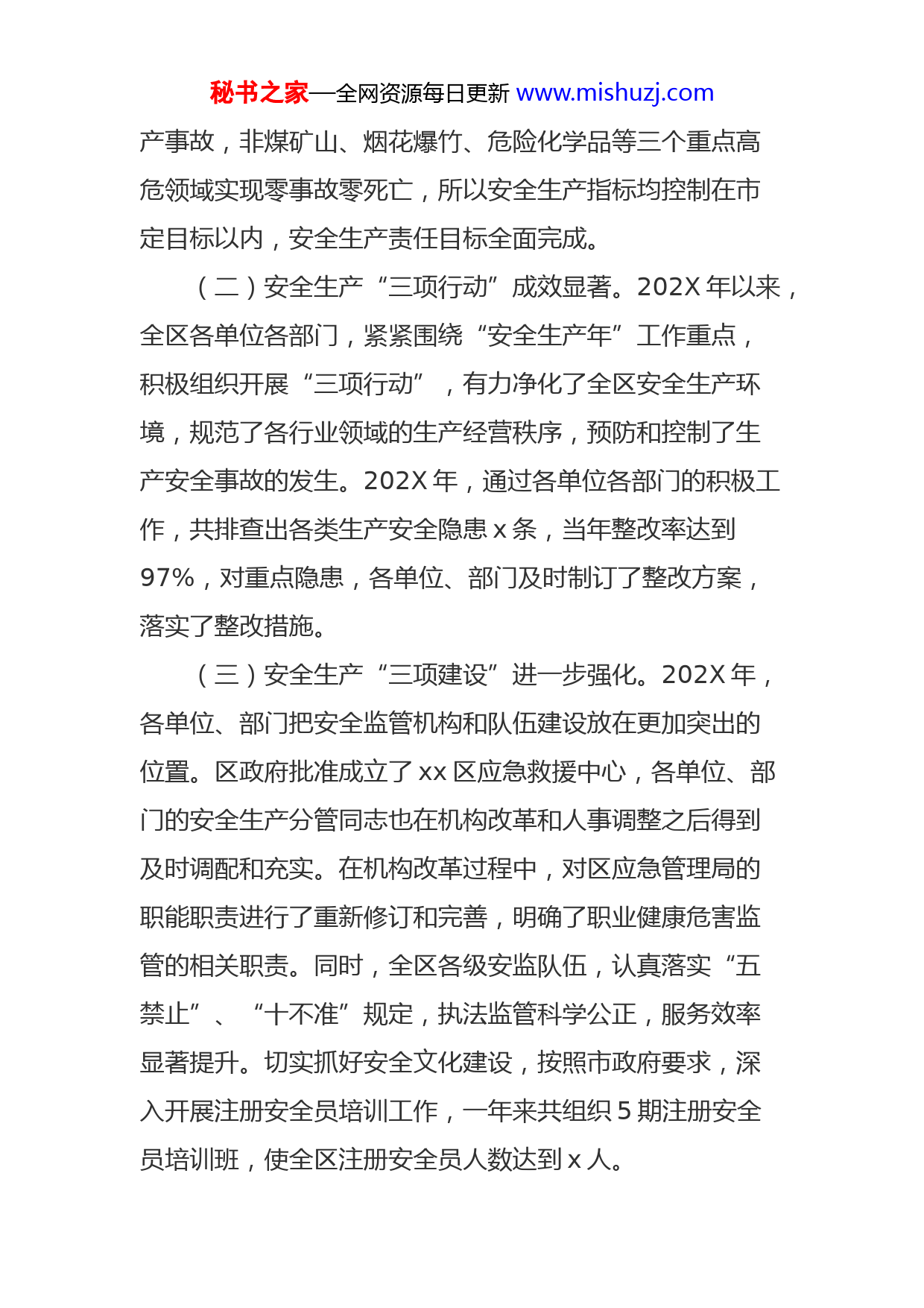 秘书之家—全网资源每日更新www.mishuzj.com区安委会关于对202X安全生产责任目标考核情况的通报根据区政府目标管理和区安委会年度目标考核的有关要求,区安委会组织了四个考核组,在各单位、各部门自查的基础上,采取全面考核、重点检查、随机抽查、查验档案资料等相结合的方式,于20xx年x月x日至x日,对x个乡、镇、办事处和29个承担安全生产责任目标的委局的年度安全生产目标完成情况进行了考核。现将考核情况通报如下:一、安全生产工作完成情况(一)安全生产责任目标全面完成。202X年,在区委、区政府的正确领导下,全区各单位、各部门以科学发展观为指导,认真贯彻落实省、市、区安全生产工作会议精神,牢固树立安全发展、发谐发展理念,以开展“安全生产年”活动为主线,紧紧围绕安全生产中心任务,全面落实“三项行动”,积极推进“三项建设”,以夯实安全基础和遏制重特大事故为目标,不断加大监督检查力度,深入开展重点行业领域的安全专项整治,积极推行注册安全员制度,继续推进企业安全生产标准化建设,全区安全生产工作继续保持着稳定好转的发展态势。202X年,全区工矿商贸领域共发生一般事故4起,未发生较大及以上安全生秘书之家—全网资源每日更新www.mishuzj.com产事故,非煤矿山、烟花爆竹、危险化学品等三个重点高危领域实现零事故零死亡,所以安全生产指标均控制在市定目标以内,安全生产责任目标全面完成。(二)安全生产“三项行动”成效显著。202X年以来,全区各单位各部门,紧紧围绕“安全生产年”工作重点,积极组织开展“三项行动”,有力净化了全区安全生产环境,规范了各行业领域的生产经营秩序,预防和控制了生产安全事故的发生。202X年,通过各单位各部门的积极工作,共排查出各类生产安全隐患x条,当年整改率达到97%,对重点隐患,各单位、部门及时制订了整改方案,落实了整改措施。(三)安全生产“三项建设”进一步强化。202X年,各单位、部门把安全监管机构和队伍建设放在更加突出的位置。区政府批准成立了xx区应急救援中心,各单位、部门的安全生产分管同志也在机构改革和人事调整之后得到及时调配和充实。在机构改革过程中,对区应急管理局的职能职责进行了重新修订和完善,明确了职业健康危害监管的相关职责。同时,全区各级安监队伍,认真落实“五禁止”、“十不准”规定,执法监管科学公正,服务效率显著提升。切实抓好安全文化建设,按照市政府要求,深入开展注册安全员培训工作,一年来共组织5期注册安全员培训班,使全区注册安全员人数达到x人。秘书之家—全网资源每日更新www.mishuzj.com二、存在问题(一)个别单位对注册安全员制度重视不够,工作开展不平衡,达到市政府的要求任务还相当艰巨。(二)生产安全与企业发展的关系,在一部分企业负责人和管理人员中还没能引起足够重视,全民安全生产意识还需进一步提升。(三)安全生产投入良莠不齐,部分单位和部门的隐患排查治理工作还有滞后。(四)少数单位安全生产档案极不完善。三、考核结果优秀单位名单省略