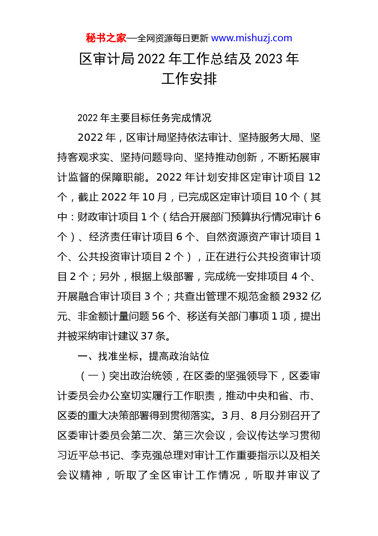 秘书之家—全网资源每日更新www.mishuzj.com区审计局2022年工作总结及2023年工作安排2022年主要目标任务完成情况2022年,区审计局坚持依法审计、坚持服务大局、坚持客观求实、坚持问题导向、坚持推动创新,不断拓展审计监督的保障职能。2022年计划安排区定审计项目12个,截止2022年10月,已完成区定审计项目10个(其中:财政审计项目1个(结合开展部门预算执行情况审计6个)、经济责任审计项目6个、自然资源资产审计项目1个、公共投资审计项目2个),正在进行公共投资审计项目2个;另外,根据上级部署,完成统一安排项目4个、开展融合审计项目3个;共查出管理不规范金额2932亿元、非金额计量问题56个、移送有关部门事项1项,提出并被采纳审计建议37条。一、找准坐标,提高政治站位(一)突出政治统领,在区委的坚强领导下,区委审计委员会办公室切实履行工作职责,推动中央和省、市、区委的重大决策部署得到贯彻落实。3月、8月分别召开了区委审计委员会第二次、第三次会议,会议传达学习贯彻习近平总书记、李克强总理对审计工作重要指示以及相关会议精神,听取了全区审计工作情况,听取并审议了秘书之家—全网资源每日更新www.mishuzj.com《2022年审计项目计划》(草案)、2021年度财政预算执行和其他财政收支情况的审计结果报告,并就做好下一步审计工作,提出了重要意见。(二)加强党建强审,自觉增强“四个意识”,坚定“四个自信”,做到“两个维护”。一是把党的建设与中心工作同谋划、同部署、同推进,制定全面从严治党主体责任清单,明确并落实好30项重点工作。二是落实好疫情防控,全力支持做好“六稳”、落实“六保”等重点工作。三是夯实党建阵地建设,学习贯彻全国两会精神及二十大精神、与市局第五支部在红炉馆联合开展主题党日活动、组织机关党员参与“微心愿”认领活动等。(三)筑牢思想根基,把党的思想建设作为基础性建设来抓。一是制定并落实党组理论学习中心组专题学习计划,共组织理论学习12次、集中研讨6次。二是严格落实意识形态工作责任制,持续加强审计领域意识形态阵地建设和管理,开展“弘扬抗疫精神,践行责任担当”道德讲堂活动、组织观看“绽放战役青春·坚定制度自信”宣讲直播,选派2名优秀年轻干部担任基层宣讲员、2022年拍摄的《xxxx:智慧审计让政务服务更高效》记录短片被学习强国xx学习平台采用发布。(四)深化作风建设,扎实推进党风廉政建设。一是紧盯春节、“五一”、“国庆”等重要节点,严格落实中秘书之家—全网资源每日更新www.mishuzj.com央八项规定,以及省市、区委相关规定要求。二是巩固“一学习两整治”成果,对照各级巡视、巡察等反馈意见整改工作要求,扎实做好整改“后半篇文章”。三是配合区纪委开展专项督查工作,深入排查廉政风险点和监管机制漏洞。四是制定印发《审计组廉政监督员制度》,督促审计人员廉洁从审,组织开展“清风行”廉政教育活动。五是做好与派驻纪检监察组的密切沟通和协作,全力支持配合好派驻纪检监察组的工作,全年向派驻组报备重要事项4次。(五)增强组织建设,以提升组织力为重点,推动机关党建高质量发展。一是强化责任担当,新冠肺炎疫情爆发后,第一时间组建党员干部先锋队,下沉xx街道xx街社区参与社区全天候防控执勤累计次数达173人次;组织全体党员干部下沉xx、进网入格,助力社会治理工作,累计次数达96人次。二是重视干部培养,通过“中国审计数字在线网”,运用面向审计系统干部学习的平台,着力突出审计干部专门化、专业化、精细化能力建设。二、提升水平,服务发展大局区审计局按照《关于推进审计全覆盖的指导意见》要求,围绕党委、政府的决策部署,紧扣重大政策措施落实、公共资金运用、公共权力行使,研究审计项目计划,统筹审计力量,稳步推进审计全覆盖,全心助力xx新发秘书之家—全网资源每日更新www.mishuzj.com展。(一)找准结合点和切入点,突出审计重点1围绕保障重大政策措施落实,持续开展政策跟踪审计。面对统筹推进疫情防控和经济社会发展的特殊形势,聚焦上级及区委重大决策部署落实、“三大攻坚战”、民生实事等,积极统筹调配审计力量,上下联动,参与并完成2021年度四季度、2022年上半年政府债务和隐性债务风险防范跟踪审计、保障性安居工程资金投入和使用绩效审计、就业促进政策跟踪审计、水污染防治专项审计;阶段性完成应对新冠肺炎疫情防控资金和捐赠款物专项审计、新增财政资金直达市县基层直接惠企利民情况专项审计完成,充分发挥审计监督服务高质量发展的建设性作用。2围绕提高公共资金使用绩效,深化财政和专项资金审计。完成2021年度本级预算执行情况及决算草案审计;结合开展2021年度区本级一级预算单位预算执行情况审计,充分运用信息化手段,实现一级预算单位数据采集全覆盖,并加大重点单位核查力度,重点对区城管局等6家单位进行核查;融合开展2021年度省级转移支付资金专项审计、债券资金审计、2021年区部分重点民生项目审计调查。目前,审计涉及单位已报送审计查出问题整改结果报告,下一步,整改汇总情况将上报区委、区政府,向区人秘书之家—全网资源每日更新www.mishuzj.com大常委会汇报。3围绕权力制约和责任落实,加强经济责任审计。重点关注领导干部履行经济发展、民生保障
