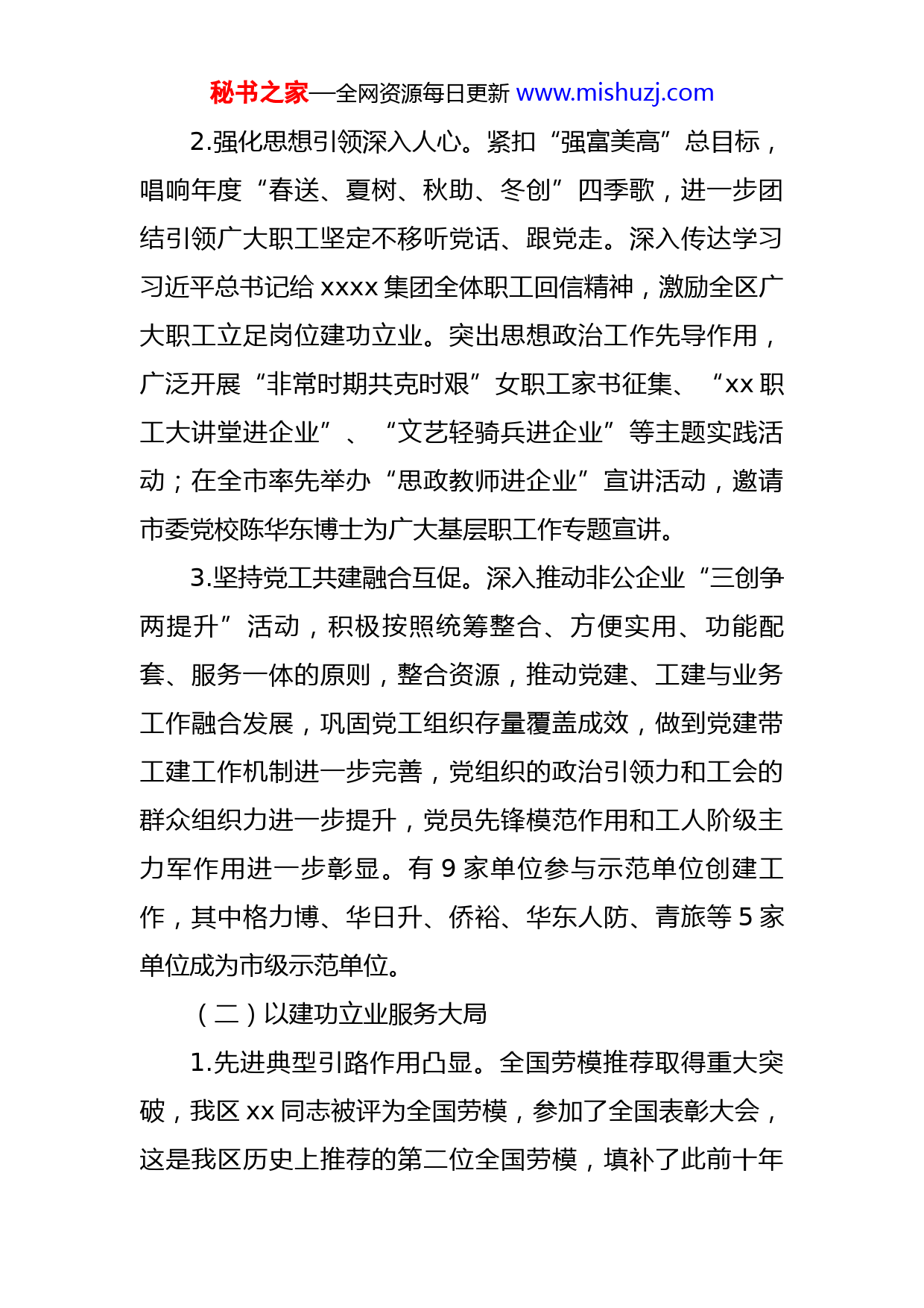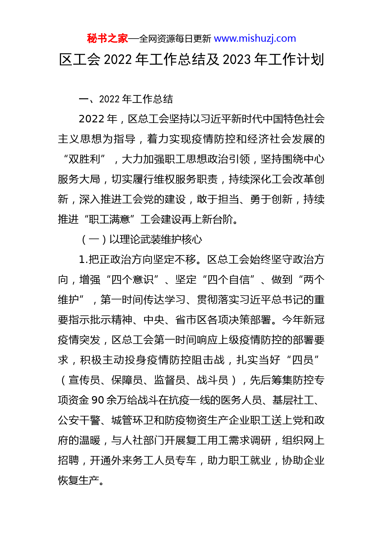 秘书之家—全网资源每日更新www.mishuzj.com区工会2022年工作总结及2023年工作计划一、2022年工作总结2022年,区总工会坚持以习近平新时代中国特色社会主义思想为指导,着力实现疫情防控和经济社会发展的“双胜利”,大力加强职工思想政治引领,坚持围绕中心服务大局,切实履行维权服务职责,持续深化工会改革创新,深入推进工会党的建设,敢于担当、勇于创新,持续推进“职工满意”工会建设再上新台阶。(一)以理论武装维护核心1.把正政治方向坚定不移。区总工会始终坚守政治方向,增强“四个意识”、坚定“四个自信”、做到“两个维护”,第一时间传达学习、贯彻落实习近平总书记的重要指示批示精神、中央、省市区各项决策部署。今年新冠疫情突发,区总工会第一时间响应上级疫情防控的部署要求,积极主动投身疫情防控阻击战,扎实当好“四员”(宣传员、保障员、监督员、战斗员),先后筹集防控专项资金90余万给战斗在抗疫一线的医务人员、基层社工、公安干警、城管环卫和防疫物资生产企业职工送上党和政府的温暖,与人社部门开展复工用工需求调研,组织网上招聘,开通外来务工人员专车,助力职工就业,协助企业恢复生产。秘书之家—全网资源每日更新www.mishuzj.com2.强化思想引领深入人心。紧扣“强富美高”总目标,唱响年度“春送、夏树、秋助、冬创”四季歌,进一步团结引领广大职工坚定不移听党话、跟党走。深入传达学习习近平总书记给xxxx集团全体职工回信精神,激励全区广大职工立足岗位建功立业。突出思想政治工作先导作用,广泛开展“非常时期共克时艰”女职工家书征集、“xx职工大讲堂进企业”、“文艺轻骑兵进企业”等主题实践活动;在全市率先举办“思政教师进企业”宣讲活动,邀请市委党校陈华东博士为广大基层职工作专题宣讲。3.坚持党工共建融合互促。深入推动非公企业“三创争两提升”活动,积极按照统筹整合、方便实用、功能配套、服务一体的原则,整合资源,推动党建、工建与业务工作融合发展,巩固党工组织存量覆盖成效,做到党建带工建工作机制进一步完善,党组织的政治引领力和工会的群众组织力进一步提升,党员先锋模范作用和工人阶级主力军作用进一步彰显。有9家单位参与示范单位创建工作,其中格力博、华日升、侨裕、华东人防、青旅等5家单位成为市级示范单位。(二)以建功立业服务大局1.先进典型引路作用凸显。全国劳模推荐取得重大突破,我区xx同志被评为全国劳模,参加了全国表彰大会,这是我区历史上推荐的第二位全国劳模,填补了此前十年秘书之家—全网资源每日更新www.mishuzj.com空白。在今年市劳模和其他先进荣誉评选中硕果累累,xx等10名同志被评为xx市劳模,另获得省五一劳动奖章1名、省五一劳动奖状1个、省“工人先锋号”2个,省级巾帼标兵1名、省级文明职工1名。开展劳模(工匠)“五进四学”(进企业、进园区、进班组、进工地、进社区,学精神、学品质、学作风、学技能)活动,劳模xx、xx、xx和五一劳动奖章获得者xx、xx等5人的事迹登上了学习强国平台。2.蓬勃开展立功竞赛活动。不断拓展技能培训和技能竞赛规模,联合人社等部门举办各类劳动竞赛、职业技能竞赛10场以上,涉及车工等10个职业(工种)。广泛开展“xx杯”竞赛活动,扩大劳动保护监督员队伍覆盖网络,积极开展“安全隐患随手拍”活动,着力构建监督、教育、自治“三位一体”的工会参与安全生产工作格局,全面维护职工的安全健康权益。不断拓宽提高职工技能素养的方式载体,组织开展“工人先锋号”创建、职工技能比武、劳动竞赛、师徒结对等活动,凝聚团结奋进力量,激励职工岗位成才。3.全面提升职工队伍素质。联合市工人文化宫举办茶艺师技能培训,85名职工获茶艺师技能证书。在区机关4楼设立“xx微书房”,打造职工书香文化。从丰富职工业余文化生活角度出发,开展了读书、健身、书画、征文等比秘书之家—全网资源每日更新www.mishuzj.com赛,举办了职工羽毛球、乒乓球、健步行、智力运动会等文体活动。围绕“夺取双胜利,工会在行动”主题,组织以班组长为重点群体的“劳动保护培训月”活动,从车间生产一线抓好安全生产的宣传教育、业务技能、隐患排查等工作。强化宣传和文化阵地建设,申报全国、省级职工书屋各1家,市级职工书屋4家。(三)以维权服务凝聚人心1.劳动关系保持稳定和谐。充分发挥劳动关系三方协调机制在保企业、保就业、保稳定中的独特作用,有力保障了职工队伍和劳动关系总体和谐稳定。在复工复产期间,指导企业通过协商签订集体合同,共渡难关,共克时艰。充分发挥工会“老娘舅”作用,助推劳动争议持续下降。进一步延伸法律服务职工触角,在区法院挂牌职工法律援助站,更好地维护职工合法权益。2.做强服务职工品牌工作。举办了区第三届职工创业大赛,选出的“童创栗机器人编程线上平台”项目代表xx参加市职工创业大赛并荣获决赛第三名。加大就业创业扶持力度,全面助力小微企业恢复生产和产业工人创业就业,共为138家单位(职工)争取小额创业贷款1776万元。持续扩大工会服务卡覆盖面和服务效应,新增发放工会服务卡近1万张,主动为促进消费搭桥牵线,积极协调苏宁易购、xx等知名连锁企业成为特约商户,为职工享受到更秘书之家—全网资源每日更新www.mishuzj.c