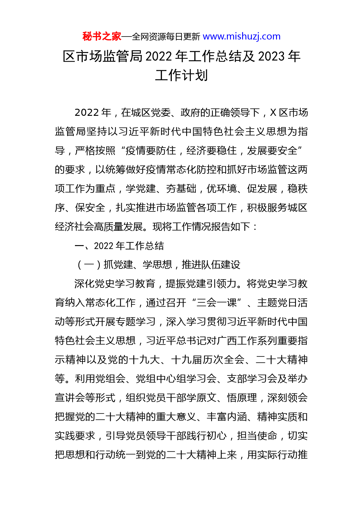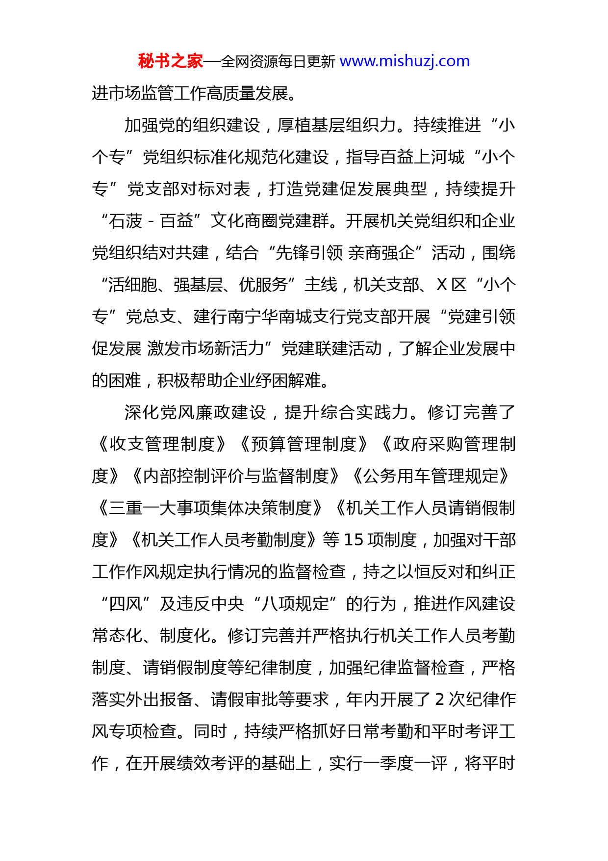 秘书之家—全网资源每日更新www.mishuzj.com区市场监管局2022年工作总结及2023年工作计划2022年,在城区党委、政府的正确领导下,X区市场监管局坚持以习近平新时代中国特色社会主义思想为指导,严格按照“疫情要防住,经济要稳住,发展要安全”的要求,以统筹做好疫情常态化防控和抓好市场监管这两项工作为重点,学党建、夯基础,优环境、促发展,稳秩序、保安全,扎实推进市场监管各项工作,积极服务城区经济社会高质量发展。现将工作情况报告如下:一、2022年工作总结(一)抓党建、学思想,推进队伍建设深化党史学习教育,提振党建引领力。将党史学习教育纳入常态化工作,通过召开“三会一课”、主题党日活动等形式开展专题学习,深入学习贯彻习近平新时代中国特色社会主义思想,习近平总书记对广西工作系列重要指示精神以及党的十九大、十九届历次全会、二十大精神等。利用党组会、党组中心组学习会、支部学习会及举办宣讲会等形式,组织党员干部学原文、悟原理,深刻领会把握党的二十大精神的重大意义、丰富内涵、精神实质和实践要求,引导党员领导干部践行初心,担当使命,切实把思想和行动统一到党的二十大精神上来,用实际行动推秘书之家—全网资源每日更新www.mishuzj.com进市场监管工作高质量发展。加强党的组织建设,厚植基层组织力。持续推进“小个专”党组织标准化规范化建设,指导百益上河城“小个专”党支部对标对表,打造党建促发展典型,持续提升“石菠-百益”文化商圈党建群。开展机关党组织和企业党组织结对共建,结合“先锋引领亲商强企”活动,围绕“活细胞、强基层、优服务”主线,机关支部、X区“小个专”党总支、建行南宁华南城支行党支部开展“党建引领促发展激发市场新活力”党建联建活动,了解企业发展中的困难,积极帮助企业纾困解难。深化党风廉政建设,提升综合实践力。修订完善了《收支管理制度》《预算管理制度》《政府采购管理制度》《内部控制评价与监督制度》《公务用车管理规定》《三重一大事项集体决策制度》《机关工作人员请销假制度》《机关工作人员考勤制度》等15项制度,加强对干部工作作风规定执行情况的监督检查,持之以恒反对和纠正“四风”及违反中央“八项规定”的行为,推进作风建设常态化、制度化。修订完善并严格执行机关工作人员考勤制度、请销假制度等纪律制度,加强纪律监督检查,严格落实外出报备、请假审批等要求,年内开展了2次纪律作风专项检查。同时,持续严格抓好日常考勤和平时考评工作,在开展绩效考评的基础上,实行一季度一评,将平时秘书之家—全网资源每日更新www.mishuzj.com考评与年度考评相结合,抓严抓实考勤考评工作,弘扬实干务实作风,推进机关作风进一步转变。强化干部能力培养,提高队伍战斗力。全年组织、参加各级各类教育培训600余人次;积极开展“党建领航+”主题活动,发挥党员先锋模范作用,组织党员干部投身疫情防控最前沿,到富德村、邕津村、仁德村、安平村4个网格点开展疫情防控志愿服务常态化,严防“最后一公里”。同时,组织党员干部驻守在沙井收费站、南扶二级路卡点守护X区入邕货物安全,驻守期间,共查验运输车辆872辆,重点排查进口货品冷链运输车32辆,确保入邕货品证件齐全、安全放心。(二)抓改革、强服务,激发市场活力行政审批改革扎实推进。先后推出“四减一增”举措,通过减环节、减材料、减成本、减时间及增加银行开户事项,企业开办环节压缩到2个,申请材料精简到5份,开办时间压缩至0.5个工作日以内,并由政府财政补贴企业公章刻制。截至2022年11月16日,X区实有市场主体56854户,实有企业17809户,2022年新增市场主体7838户,其中新增企业1645户;变更登记市场主体10574户,其中企业2992户;注销市场主体4641户,其中企业611户;办理简易注销市场主体1026户,其中企业482户;迁入市场主体888户,迁出市场主体795秘书之家—全网资源每日更新www.mishuzj.com户。免费发放1327套(5308枚)实体印章,减免费用17.707万元。事中事后监管统筹推进。坚持放管结合、并重,以“双随机、一公开”监管为基本手段、以重点监管为补充、以信用监管为基础的新型监管机制初步形成,《制订X区部门联合随机抽查事项清单(第二版)》,覆盖事前事中事后的全链条企业信用监管有效实施。2021年度企业年报应报16479户,截年报率93.63%;个体年报应报33853户,年报率74.82%;农民专业合作社年报应报171户,年报率97.08%。开展单部门双随机抽查81批次,抽查检查对象1756户,完成检查并公示结果1756户;完成12个类别联合抽查任务,涉及完成抽查检查并公示结果63户。全年共归集市场监管双公示数据3261条,其中行政许可数据2576条,行政处罚信息41条、抽查检查644条,全部在国家企业信息公示系统公示。知识产权服务稳步提升。开展专利资助金工作,激励区域知识产权数量与质量双提升,共拨付经费2109875元。全年新增专利授权量326件(其中发明专利授权量125件,实用新型专利授权量161件,外观设计专利授权量40件);商标申请2792件,注册1785件,有效注册数共12336件,有效注册数增长21.6%。对广西南宁华能环保科技有限公司等重点企业开展知识产权保护直通车秘书之家—全网资源每日更新www.mishuzj.com服务8次。查办商标侵权案件7起,罚没0.32万元,没收侵犯注册商标专用权服装一批。质