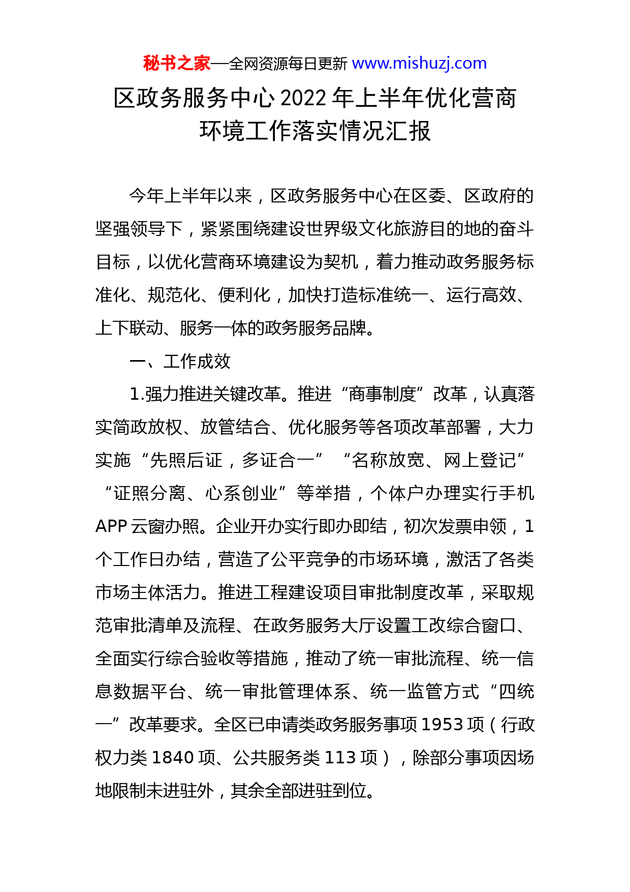 秘书之家—全网资源每日更新www.mishuzj.com区政务服务中心2022年上半年优化营商环境工作落实情况汇报今年上半年以来,区政务服务中心在区委、区政府的坚强领导下,紧紧围绕建设世界级文化旅游目的地的奋斗目标,以优化营商环境建设为契机,着力推动政务服务标准化、规范化、便利化,加快打造标准统一、运行高效、上下联动、服务一体的政务服务品牌。一、工作成效1.强力推进关键改革。推进“商事制度”改革,认真落实简政放权、放管结合、优化服务等各项改革部署,大力实施“先照后证,多证合一”“名称放宽、网上登记”“证照分离、心系创业”等举措,个体户办理实行手机APP云窗办照。企业开办实行即办即结,初次发票申领,1个工作日办结,营造了公平竞争的市场环境,激活了各类市场主体活力。推进工程建设项目审批制度改革,采取规范审批清单及流程、在政务服务大厅设置工改综合窗口、全面实行综合验收等措施,推动了统一审批流程、统一信息数据平台、统一审批管理体系、统一监管方式“四统一”改革要求。全区已申请类政务服务事项1953项(行政权力类1840项、公共服务类113项),除部分事项因场地限制未进驻外,其余全部进驻到位。秘书之家—全网资源每日更新www.mishuzj.com2.全力优化营商环境。推动涉企经营许可事项实行“证照分离”改革,对纳入“证照分离”改革范围的事项,采取直接取消、备案、告知承诺和优化准入服务等4种方式进行分类管理,落实证照分离工作,压缩审批时限、精简审批材料、优化审批流程,为企业进入市场提供更大便利。聚焦群众“房易交,证难拿”的痛点,联合相关部门推出“一码管地”、“多规合一”、“多测合一”、“多验合一”等举措,推动新建商品房“交房即交证”改革,有效化解房产办证历史遗留问题。积极开展减证便民工作,实现清理单位、清理事项、清理材料三个全覆盖,从证明需求单位角度梳理群众和企业办理依申请行政权力事项和公共服务事项时需提交的各类证明及其盖章环节。坚决取消不合法、不合理以及为规避责任、转嫁矛盾而要求提供的各种申请材料。3.着力建设清廉大厅。政务大厅作为直接服务群众和市场主体的窗口,服务态度和水平事关营商环境好坏,事关全区经济发展。我们以“清廉大厅”建设为载体,制定了《窗口服务行为规范》《首问责任制》《限时办结制》《窗口延时服务制度》等一系列的管理制度,实行全过程监督、问效和考评机制。定时巡查和不定时检查,发现不作为、慢作为、乱作为、假作为等问题,发布督查通报。同时,开展一系列育廉、讲廉、学廉、颂廉活动,推进清秘书之家—全网资源每日更新www.mishuzj.com廉思想入脑入心,增强窗口工作人员“不想腐”的思想。4.着力推进基层政务“一门式”全覆盖工作。一是开展全区基层政务“一门式”全覆盖工作督查工作,把工作存在难点和堵点,列出问题清单,逐一整改,把与群众密切相关的服务事项审批权限下放到村(社区),全面深化事项梳理,规范设置业务办理项,优化事项办理流程,提升基层政务服务能力。二是根据国家、省、市的最新要求,梳理完善已下放事项的办事指南,重新印制办事指南并发送乡镇、街道、村和社区。三是重新建立基层政务服务(一门式)全覆盖工作微信群,及时指导解决村、社区在办理过程中存在的疑问和困难。二、工作亮点(一)聚焦企业群众“办不成事”的痛点,推行“办不成事”反映窗口服务新机制。为解决企业群众办事过程中遇到的各种“疑难杂症”,给企业群众顺畅办事提供兜底服务,区政务服务大厅设立“办不成事”窗口,专门受理企业群众“办不成的事”,根据诉求事项具体情况,分类别、分层级,为企业群众答疑解惑,全力调度相关审批窗口为企业群众办成事。通过“办不成事”反映窗口,倒逼相关部门不断改善服务态度、提升服务质量。截至6月,已协调解决办成难事17件,答疑解惑50余次。(二)聚焦企业群众对优质高效服务的盼点,推行区秘书之家—全网资源每日更新www.mishuzj.com领导和部门负责人“走流程、解难题、优服务”体验办事新方式。5月13日以来,区委区政府领导,区税务、市场监督管理局、医保局、自然资源局、住建局、行政执法局、交通局、发改局等部门“一把手”,分别以申请人、审批服务窗口工作人员的身份,全流程体验办理本部门政务服务高频事项,共体验办理事项36项。通过体验办理,“一把手”站在企业群众、审批服务窗口工作人员的角度,发现了办事过程中存在的一批难点、痛点、堵点,一些问题得到迅速解决。下段,我区将针对“一把手”体验办理中发现的问题,进一步减材料、减环节、减时限、优流程,让企业群众办事更简便、高效。(三)聚焦企业群众节假日无处办事的难点,推行“节假日不打烊”政务服务新模式。为有效破解特殊群体办事“工作日没空办、节假日没处办”的难题,政务服务大厅实行节假日预约服务的“不打烊”政务服务新模式。一是免费邮政速递,助力“最多跑一次”。为落实“最多跑一次”的服务承诺,在政务大厅开设免费邮政速递服务窗口,负责向企业群众免费寄送证件、批文等办理结果,避免群众因领取证照等多跑路,为企业群众提供实实在在的便利。二是延时服务,不让群众白跑腿。为避免群众因工作人员下班而需多跑