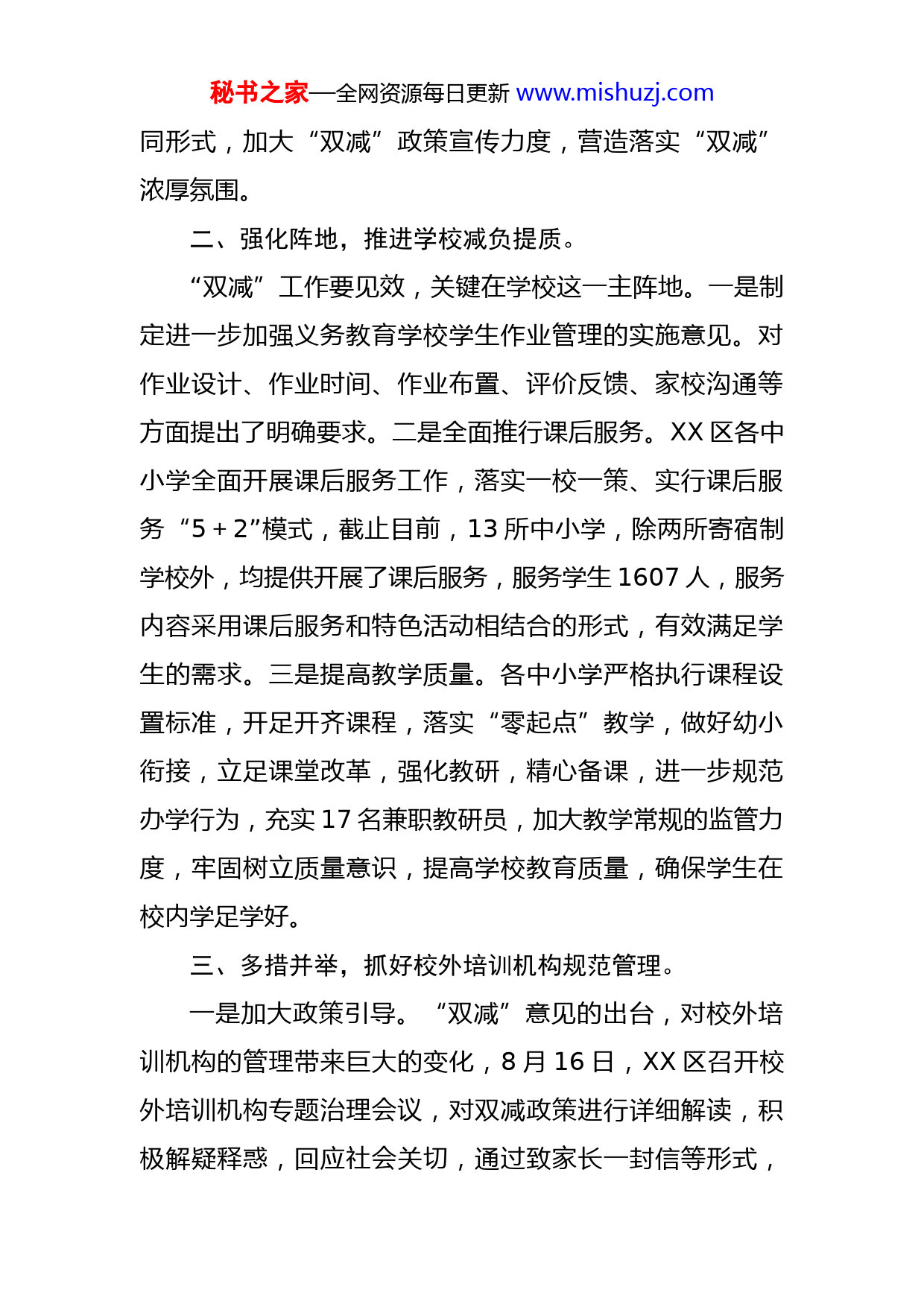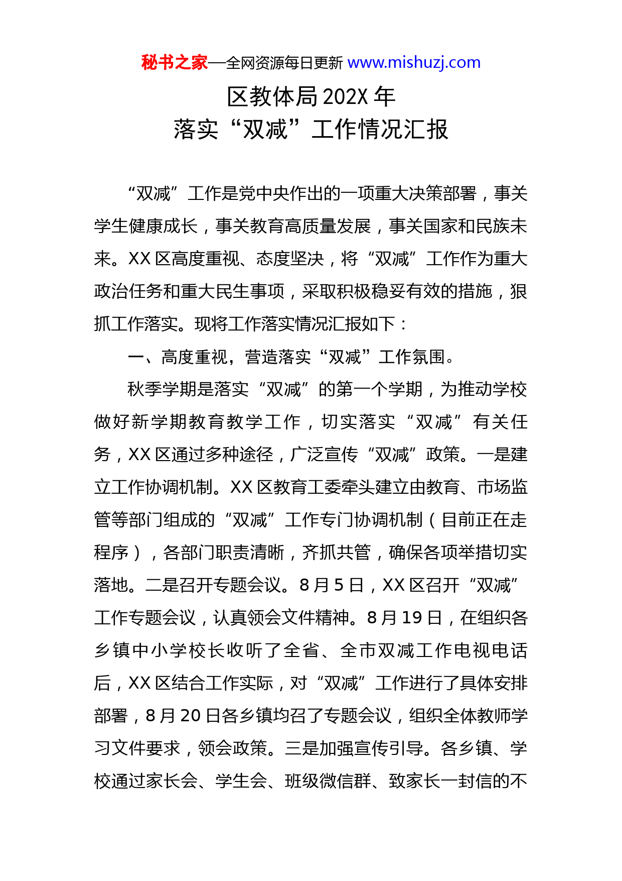 秘书之家—全网资源每日更新www.mishuzj.com区教体局202X年落实“双减”工作情况汇报“双减”工作是党中央作出的一项重大决策部署,事关学生健康成长,事关教育高质量发展,事关国家和民族未来。XX区高度重视、态度坚决,将“双减”工作作为重大政治任务和重大民生事项,采取积极稳妥有效的措施,狠抓工作落实。现将工作落实情况汇报如下:一、高度重视,营造落实“双减”工作氛围。秋季学期是落实“双减”的第一个学期,为推动学校做好新学期教育教学工作,切实落实“双减”有关任务,XX区通过多种途径,广泛宣传“双减”政策。一是建立工作协调机制。XX区教育工委牵头建立由教育、市场监管等部门组成的“双减”工作专门协调机制(目前正在走程序),各部门职责清晰,齐抓共管,确保各项举措切实落地。二是召开专题会议。8月5日,XX区召开“双减”工作专题会议,认真领会文件精神。8月19日,在组织各乡镇中小学校长收听了全省、全市双减工作电视电话后,XX区结合工作实际,对“双减”工作进行了具体安排部署,8月20日各乡镇均召了专题会议,组织全体教师学习文件要求,领会政策。三是加强宣传引导。各乡镇、学校通过家长会、学生会、班级微信群、致家长一封信的不秘书之家—全网资源每日更新www.mishuzj.com同形式,加大“双减”政策宣传力度,营造落实“双减”浓厚氛围。二、强化阵地,推进学校减负提质。“双减”工作要见效,关键在学校这一主阵地。一是制定进一步加强义务教育学校学生作业管理的实施意见。对作业设计、作业时间、作业布置、评价反馈、家校沟通等方面提出了明确要求。二是全面推行课后服务。XX区各中小学全面开展课后服务工作,落实一校一策、实行课后服务“5+2”模式,截止目前,13所中小学,除两所寄宿制学校外,均提供开展了课后服务,服务学生1607人,服务内容采用课后服务和特色活动相结合的形式,有效满足学生的需求。三是提高教学质量。各中小学严格执行课程设置标准,开足开齐课程,落实“零起点”教学,做好幼小衔接,立足课堂改革,强化教研,精心备课,进一步规范办学行为,充实17名兼职教研员,加大教学常规的监管力度,牢固树立质量意识,提高学校教育质量,确保学生在校内学足学好。三、多措并举,抓好校外培训机构规范管理。一是加大政策引导。“双减”意见的出台,对校外培训机构的管理带来巨大的变化,8月16日,XX区召开校外培训机构专题治理会议,对双减政策进行详细解读,积极解疑释惑,回应社会关切,通过致家长一封信等形式,秘书之家—全网资源每日更新www.mishuzj.com做好舆论引导,让广大家长及学生了解国家对校外培训的管控政策,营造家校共同参与的良好氛围。二是加大部门配合。与政策法规部及时沟通,明确了“不再审批新的面向义务教育阶段学生的学科类校外培训机构,现有学科类培训机构统一登记为非营利性机构”等相关规定;与市场监管、消防、公安等部门通过“双随机、一公开”等形式,加大对违规校外培训机构的查处力度。三是加大风险稳控力度。校外培训机构涉稳风险管控工作涉及社会的稳定,XX区建立健全完善培训机构治理研判会商和风险防控机制,目前,XX区15家校外培训机构总体情况稳定。四、工作打算一是继续完善配套政策。根据上级相关政策,结合XX区实际,不断制定完善切实可行的配套方案,让“双减”工作落实起来有依据。二是继续强化监督检查。加强与有关部门联络协调,继续压实责任,强化督查处罚力度,坚决避免出现不稳定因素,切实维护群众利益,让“双减”工作落实起来有力度。三是学习经验做法。认真学习借鉴各县市区的经验做法,营造“双减”工作的良好社会氛围,让“双减”工作落实起来有榜样。“双减”工作是党中央关心、群众关切、社会关注的重大民生问题,是落实立德树人根本任务,解决学生校内校外负担,进一步深化教育改革的重大举措。XX区将以对教秘书之家—全网资源每日更新www.mishuzj.com育事业高度负责的态度,履职尽责,扎实推进“双减”工作落地见效。