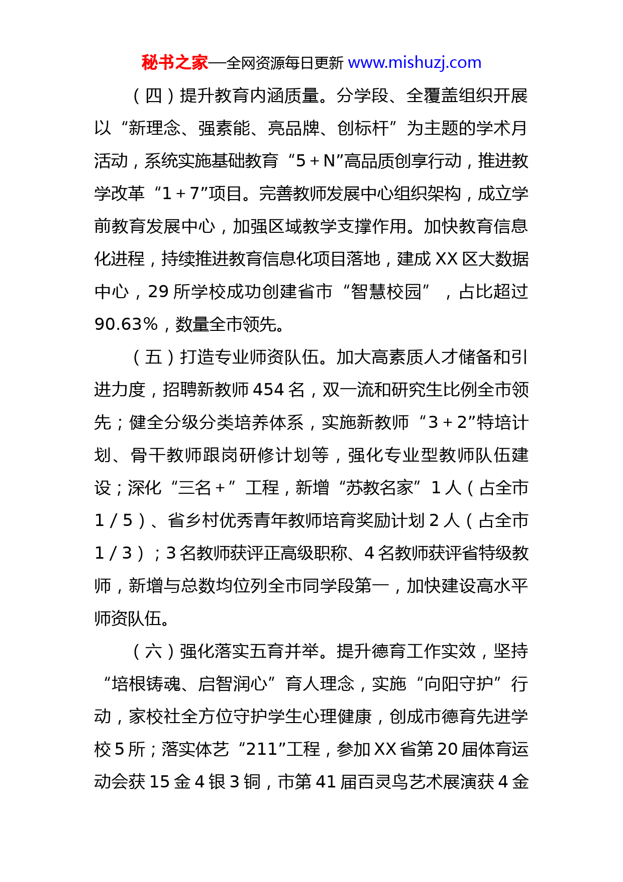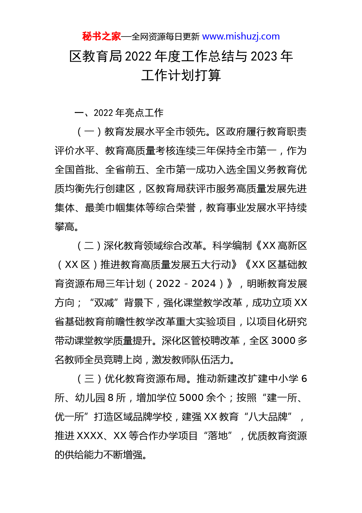秘书之家—全网资源每日更新www.mishuzj.com区教育局2022年度工作总结与2023年工作计划打算一、2022年亮点工作(一)教育发展水平全市领先。区政府履行教育职责评价水平、教育高质量考核连续三年保持全市第一,作为全国首批、全省前五、全市第一成功入选全国义务教育优质均衡先行创建区,区教育局获评市服务高质量发展先进集体、最美巾帼集体等综合荣誉,教育事业发展水平持续攀高。(二)深化教育领域综合改革。科学编制《XX高新区(XX区)推进教育高质量发展五大行动》《XX区基础教育资源布局三年计划(2022-2024)》,明晰教育发展方向;“双减”背景下,强化课堂教学改革,成功立项XX省基础教育前瞻性教学改革重大实验项目,以项目化研究带动课堂教学质量提升。深化区管校聘改革,全区3000多名教师全员竞聘上岗,激发教师队伍活力。(三)优化教育资源布局。推动新建改扩建中小学6所、幼儿园8所,增加学位5000余个;按照“建一所、优一所”打造区域品牌学校,建强XX教育“八大品牌”,推进XXXX、XX等合作办学项目“落地”,优质教育资源的供给能力不断增强。秘书之家—全网资源每日更新www.mishuzj.com(四)提升教育内涵质量。分学段、全覆盖组织开展以“新理念、强素能、亮品牌、创标杆”为主题的学术月活动,系统实施基础教育“5+N”高品质创享行动,推进教学改革“1+7”项目。完善教师发展中心组织架构,成立学前教育发展中心,加强区域教学支撑作用。加快教育信息化进程,持续推进教育信息化项目落地,建成XX区大数据中心,29所学校成功创建省市“智慧校园”,占比超过90.63%,数量全市领先。(五)打造专业师资队伍。加大高素质人才储备和引进力度,招聘新教师454名,双一流和研究生比例全市领先;健全分级分类培养体系,实施新教师“3+2”特培计划、骨干教师跟岗研修计划等,强化专业型教师队伍建设;深化“三名+”工程,新增“苏教名家”1人(占全市1/5)、省乡村优秀青年教师培育奖励计划2人(占全市1/3);3名教师获评正高级职称、4名教师获评省特级教师,新增与总数均位列全市同学段第一,加快建设高水平师资队伍。(六)强化落实五育并举。提升德育工作实效,坚持“培根铸魂、启智润心”育人理念,实施“向阳守护”行动,家校社全方位守护学生心理健康,创成市德育先进学校5所;落实体艺“211”工程,参加XX省第20届体育运动会获15金4银3铜,市第41届百灵鸟艺术展演获4金秘书之家—全网资源每日更新www.mishuzj.com2银,创历史新高;促进学生健康成长,中小学生体质健康合格率98.35%、优良率57.74%,保持全市领先。(七)扎实推进双减工作。开展课后服务,全区中小学学生综合参与率达96.4%,教师参与率达96.9%,投入300万元,引进第三方机构开设非文化课类学生社团近2000个,优化升级课后服务课程体系。推进校外培训机构治理攻坚行动,义务教育阶段学科类培训机构压减率保持100%,民办义务教育在校生比例控制在5%以内。(八)校园安全持续稳定。深化教育系统安全生产专项整治三年行动、常态化推进校园疫情防控,加强智慧技防校园建设,组织开展多形式、多渠道、全方位的安全检查30余次,安全培训6次,安全宣教23次,全年累计创成新一轮“平安校园”18所、校园安全标准化建设达标校30所。(九)各类教育全面发展。支持区内高中高水平发展,加快推动XX高中(XX分校)建设;鼓励科技职业学院探索实施“双元制”改革,校企融合育人服务区域发展;深化国际教育,2个课题成功入选第二批XX省“十四五”基础教育职业教育对外合作交流重点建设项目。二、存在问题短板(一)教育资源供给矛盾依然突出。随着我区产业发展和城市化进程的加快,学生入园、入学需求持续增长,秘书之家—全网资源每日更新www.mishuzj.com学校布局滞后、学位供需紧张等问题仍将存在,XX、XX、XX等地部分地区学前教育资源配置率仍需进一步优化,“新市民”子女入学矛盾相对突出。对标高新区建设“具有全球竞争力的现代化国际化创新型城区”的目标愿景,教育发展空间格局与未来城区规划结合不够紧密,需进一步优化调整。(二)教育品牌影响力有待提升。近年来,全区教育事业以“实现区域教育既有高原又有高峰”为目标,引进优质教育“八大系列品牌”(“上海世外”“大桥”“金桥”“锡师”“连元街”“高中附属”“实幼”“外国语”),逐步打造形成优质教育“六大核心圈”,为教育事业高质量发展注入强大动能,但与区域现代化建设走在前列的定位、新时代教育高质量发展的要求和人民群众对更加优质教育资源的期盼相比,XX教育品牌不响不亮的问题仍然存在,还需坚持质量立教、内涵发展,促进各校在教研、课程、师资、质量等方面协同提高,整体提升教育发展水平,打响区域教育品牌。三是教育对全区的支撑作用还需加强。目前,全区市级以上优质学校数量不多,在全国范围内具有较高知名度的名校、名校长、名师依然缺乏,国家级教学成果仍需培育,“标杆”性教育品牌尚未形成,教育对区域产业经济发展的推动支撑作用还未充分彰显。职业教育在推进“产秘书之家—全网资源每日更新www.mishuzj.com城融合”上的效应不足,虽然今年以XX科技职业学院为试点单位,研究实施“双元制”校企协同育人特色模式,为高新区产业发展培养高素质的技能人才,但产业专业就业“三业”无缝联通的人才培