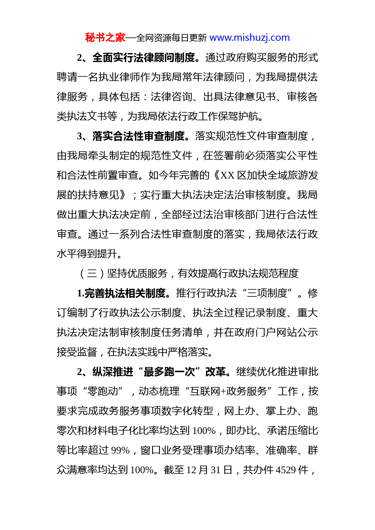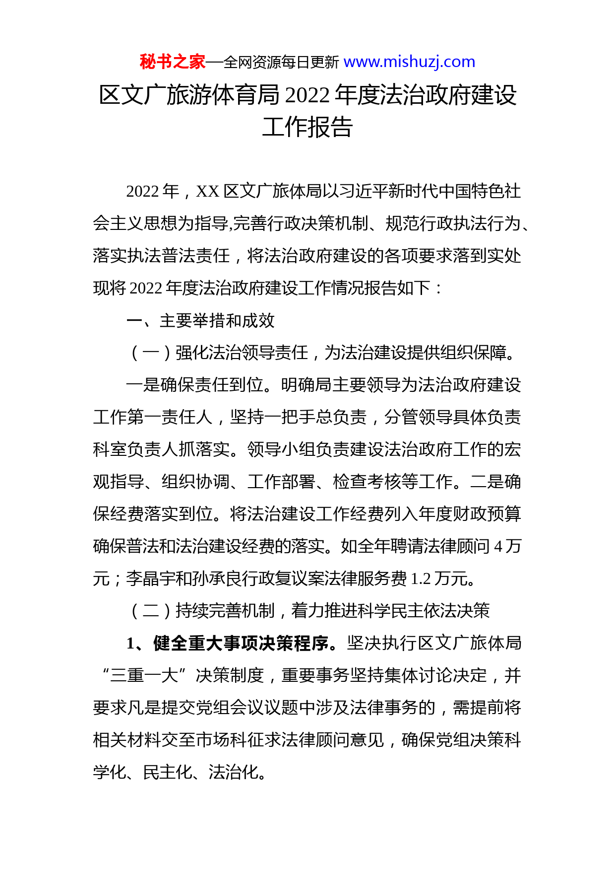 秘书之家—全网资源每日更新www.mishuzj.com区文广旅游体育局2022年度法治政府建设工作报告2022年,XX区文广旅体局以习近平新时代中国特色社会主义思想为指导,完善行政决策机制、规范行政执法行为、落实执法普法责任,将法治政府建设的各项要求落到实处现将2022年度法治政府建设工作情况报告如下:一、主要举措和成效(一)强化法治领导责任,为法治建设提供组织保障。一是确保责任到位。明确局主要领导为法治政府建设工作第一责任人,坚持一把手总负责,分管领导具体负责科室负责人抓落实。领导小组负责建设法治政府工作的宏观指导、组织协调、工作部署、检查考核等工作。二是确保经费落实到位。将法治建设工作经费列入年度财政预算确保普法和法治建设经费的落实。如全年聘请法律顾问4万元;李晶宇和孙承良行政复议案法律服务费1.2万元。(二)持续完善机制,着力推进科学民主依法决策1、健全重大事项决策程序。坚决执行区文广旅体局“三重一大”决策制度,重要事务坚持集体讨论决定,并要求凡是提交党组会议议题中涉及法律事务的,需提前将相关材料交至市场科征求法律顾问意见,确保党组决策科学化、民主化、法治化。秘书之家—全网资源每日更新www.mishuzj.com2、全面实行法律顾问制度。通过政府购买服务的形式聘请一名执业律师作为我局常年法律顾问,为我局提供法律服务,具体包括:法律咨询、出具法律意见书、审核各类执法文书等,为我局依法行政工作保驾护航。3、落实合法性审查制度。落实规范性文件审查制度,由我局牵头制定的规范性文件,在签署前必须落实公平性和合法性前置审查。如今年完善的《XX区加快全域旅游发展的扶持意见》;实行重大执法决定法治审核制度。我局做出重大执法决定前,全部经过法治审核部门进行合法性审查。通过一系列合法性审查制度的落实,我局依法行政水平得到提升。(三)坚持优质服务,有效提高行政执法规范程度1.完善执法相关制度。推行行政执法“三项制度”。修订编制了行政执法公示制度、执法全过程记录制度、重大执法决定法制审核制度任务清单,并在政府门户网站公示接受监督,在执法实践中严格落实。2、纵深推进“最多跑一次”改革。继续优化推进审批事项“零跑动”,动态梳理“互联网+政务服务”工作,按要求完成政务服务事项数字化转型,网上办、掌上办、跑零次和材料电子化比率均达到100%,即办比、承诺压缩比等比率超过99%,窗口业务受理事项办结率、准确率、群众满意率均达到100%。截至12月31日,共办件4529件,秘书之家—全网资源每日更新www.mishuzj.com其中行政许可事项1030件、其他行政备案3499件。3、扎实履行“双随机”抽查机制。制定本部门“双随机”年度抽查计划,重点抽查包括文化市场、体育市场、旅游市场等三大类监督检查事项,抽查情况按要求及时上报,强化事中事后监管,不断提升监管、服务水平。4、严格规范公正文明执法。机构改革后,我局执法范围涵盖文化、广电、旅游、体育等行业,面对新情况新问题,我局统筹考虑,科学分工。截至12月31日,执法大队巡查出动检查18574人人次,检查文旅体场所9084家次,办理一般程序案件26起,罚款117500元,没收非法所得12169.84元;受理举报1879件;与公安、消防、市场监管、应急管理等部门开展文旅联合执法12次,开展疫情防控、安全生产和法律法规宣讲14次,发现各类安全隐患347处,整改347处;加大重点领域执法力度,围绕“扫黄打非”工作,开展意识形态领域专项执法,没收非法出版物218册,取缔1处无证销售出版物场所;全年共接到游客投诉276件(其中96123接到57件,12345收到219),结案269件,办理旅游行政处罚案件2件,市场良好率达100%。(四)强化法治思维,聚力提升依法行政观念能力1、提升行业从业人员法律意识。结合“三服务”工作开展送法律企业活动,组织普法宣传教育,落实“谁主管谁负责”、“谁执法谁普法”、“谁服务谁普法”普法责秘书之家—全网资源每日更新www.mishuzj.com任:一是按照行业分类,组织各类文化旅游市场经营业主法治培训。先后组织开展全区网吧、娱乐场所、旅游企业等经营业主法治培训2期,培训人员180余人次。2、广泛开展法治文艺进基层活动。结合宪法日、3.15消费者权益保护日、3.18全国文化市场日、知识产权保护日等时机开展相关法律法规宣传,并共计向群众发放各类法律宣传单3000余张。区图书馆向读者推送法学故事。区文化馆结合文艺节目将法律知识穿插于活动中,提高人民群众的法律意识。二、存在不足及原因2022年我局法治政府建设工作虽然取得了一定的成绩,但仍然存在一些薄弱环节和问题,离上级的要求还存在一定的差距,依然存在以下问题:(一)法治宣传形式创新不够。在宣传方式、宣传工具、宣传途径上还停留在较为传统的展板展览、橱窗展示以及文艺现场演出上,开展新媒体环境下的各类法治宣传教育不足。(二)执法监管合力有待提升。机构改革后,各部门职能均有所调整,市级与区级执法部门,行业主管部门与执法部门之间的协调机制仍需进一步完善,以便提高衔接配合力度,提升执法质量,形成监管合力。三、下步工作重点秘书之家—全网资源每日更新www.mishuzj.com我局将大力推进依法行政,加快建设法治政府,将政府工作全面纳入法治轨道。一是进一步加强组织领导。以文
