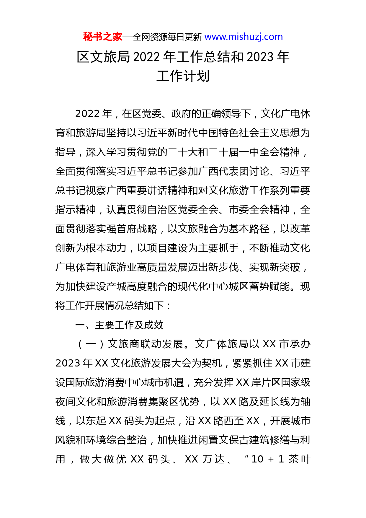 秘书之家—全网资源每日更新www.mishuzj.com区文旅局2022年工作总结和2023年工作计划2022年,在区党委、政府的正确领导下,文化广电体育和旅游局坚持以习近平新时代中国特色社会主义思想为指导,深入学习贯彻党的二十大和二十届一中全会精神,全面贯彻落实习近平总书记参加广西代表团讨论、习近平总书记视察广西重要讲话精神和对文化旅游工作系列重要指示精神,认真贯彻自治区党委全会、市委全会精神,全面贯彻落实强首府战略,以文旅融合为基本路径,以改革创新为根本动力,以项目建设为主要抓手,不断推动文化广电体育和旅游业高质量发展迈出新步伐、实现新突破,为加快建设产城高度融合的现代化中心城区蓄势赋能。现将工作开展情况总结如下:一、主要工作及成效(一)文旅商联动发展。文广体旅局以XX市承办2023年XX文化旅游发展大会为契机,紧紧抓住XX市建设国际旅游消费中心城市机遇,充分发挥XX岸片区国家级夜间文化和旅游消费集聚区优势,以XX路及延长线为轴线,以东起XX码头为起点,沿XX路西至XX,开展城市风貌和环境综合整治,加快推进闲置文保古建筑修缮与利用,做大做优XX码头、XX万达、“10+1茶叶秘书之家—全网资源每日更新www.mishuzj.com街”、XX、XX、XX公园、XX市非物质文化遗产展示中心、XX等一批重大项目,力争2023年6月前打造集旅游目的地、文化展示地、商业繁华地于一体的文旅商业新地标。目前XX码头景区提升改造项目已于10月份启动建设,完成绿化提升改造用地开挖以及管网改造安装;XX民族剧院落成投入使用;XX完成直播场所改造并试运营,XX市集全新升级并对外开放,文创研学馆正在施工,房车露营基地年底前完工;XX非遗园区建成木结构特色牌楼,一期建筑外立面翻新、景观绿化施工、新增绿植以及亮化美化已完成;XX市非物质遗产展示中心项目可研获得批复,完成勘察设计和展呈设计;XX公园工业长廊(二期)已经完成招投标,预计年内完成建设;XX极地海洋世界完成展馆装修改造重新营业;XX勇士拳击场正在进行赛场隔音和水电施工,计划12月份营业;XX奥特莱斯在2022年11月正式开业营运;XX岸和XX路景观亮化提升项目完成方案设计。(二)全域旅游纵深推进。落实落细文旅产业纾困扶持政策,及时拨付XX剧场、XX生态园、XX康养旅游景区等获评A级景区、星级乡村旅游区各级品牌创建奖补资金共计XXX万元;申报XX码头获2023年XX文化旅游发展大会重点推进项目市级奖补资金XXX万元。大力推动景区创A评星工作,XX生态园获评首批自治区中小学劳动教育秘书之家—全网资源每日更新www.mishuzj.com实践基地,XX草原休闲旅游景区成功创建XX市中小学研学基地;XX小学等X个中小学成功申报XX市体育传统特色学校;XX公园创建国家4A级旅游景区,已完成自治区专家组评定验收;推进XX景区申报创建国家级休闲旅游街区,目前已将申报材料报至文化和旅游部评定;XX3座旅游厕所获评国家3A级旅游厕所;XX公园、XX土改博物馆、XX景区旅游厕所获评国家2A级旅游厕所。强“龙头”,带动产业集群发展,XX文化产业集团有限公司获评2021年度XX文化产业龙头企业,新增XX五环星光体育文化发展有限公司规上企业X家、XX区亚克游艇水上俱乐部X家。辖区文化旅游规上其他营利性服务业样本单位1月-10月份营业收入XXXX万元,同比增长-X%;完成固定资产投资任务X亿元。2022年前三季度,XX区累计接待国内外游客XXX万人次,同比增长XX%;旅游总消费XXXX亿元,同比增长-X%。(三)文化艺术繁荣发展。启动城区、镇和村三级应急广播平台建设;完善全民健身路径、篮球架等设施配套;辖区图书馆、文化馆、村史室共XX余个公共文化场所免费向公众开放。推动全民阅读走进景区,打造XX公园畅叙馆综合性书吧,在XXXX景区设立全民阅读示范点,为XX等景区新配置X台歌德电子借阅机,配送书籍XXX册。扶持XX支乡村社区业余文艺队;开展“百姓小舞台·秘书之家—全网资源每日更新www.mishuzj.com和谐大社会”主题文艺演出、“XX读书人”品牌活动、XX民歌湖周周演群众文艺活动XX区专场文艺演出、“奋进新征程走读XX·品阅XX”走读研学活动、行政村乡村风貌提升文化活动等群众性文化活动XXX场,配合完成送戏下基层、进校园XX场。以XX“上岸”为主题创作精品舞蹈节目《春风又绿XX岸》,推送参加XX市基层群众文艺会演和第十届全区基层群众文艺会演广受好评。成功承办2022年首届XX文化旅游消费大夜市(XX主场)暨第X届平话文化旅游节活动、第二届“三月三”少数民族电影展、2022中国—东盟电影文化周活动、“老友相约乐游XX”文化旅游进商圈XX专场系列文旅消费活动,配合举办“璀璨XX·消费GO”夜生活嘉年华等大型节庆活动。(四)文化遗产历久弥新。筑牢红色阵地传承红色基因,实施XX土地改革历史博物馆改造提升项目,博物馆全年接待参观群众一万余人。对XX黄氏庄园、慕村小学旧址进行抢险性保护修缮,文物得到有效保护。充分挖掘平话文化等文化资源,开展“文化和自然遗产日”非物质文化遗产宣传展示活动暨XX老人节民俗活动、“我们的节日·壮族三月三”云对歌和平话山歌进校园等民俗文化传承活动;《龚氏痛症疗法》《XX酸嘢制作技艺》提升申报第九批自治区非遗代表性项目,让文化遗产绽放新时代光彩。(五)古镇保护更加规范。构建完善古镇保护利用机秘书之家—全网资源每日更新www.mishuzj.com制,