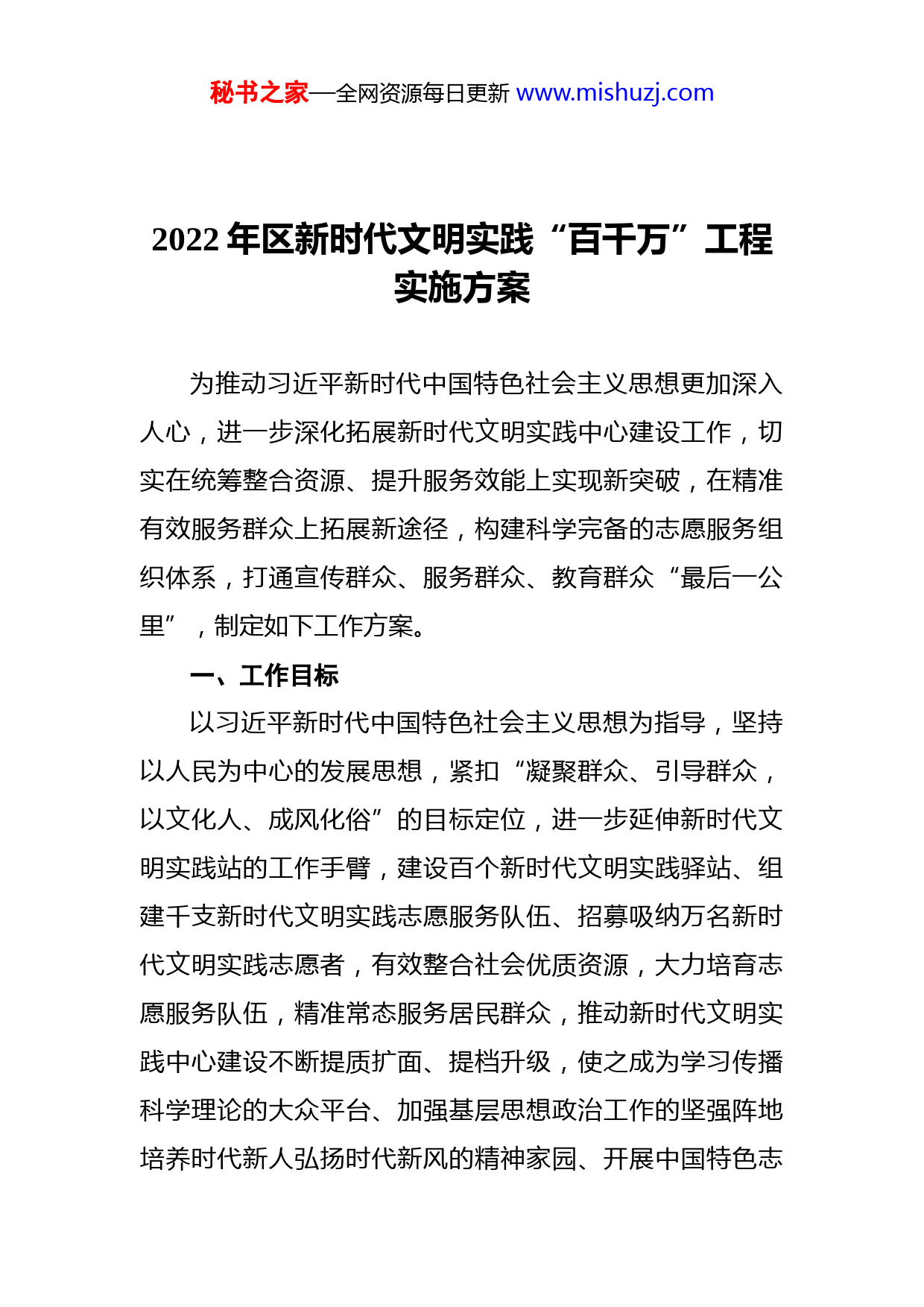 秘书之家—全网资源每日更新www.mishuzj.com2022年区新时代文明实践“百千万”工程实施方案为推动习近平新时代中国特色社会主义思想更加深入人心,进一步深化拓展新时代文明实践中心建设工作,切实在统筹整合资源、提升服务效能上实现新突破,在精准有效服务群众上拓展新途径,构建科学完备的志愿服务组织体系,打通宣传群众、服务群众、教育群众“最后一公里”,制定如下工作方案。一、工作目标以习近平新时代中国特色社会主义思想为指导,坚持以人民为中心的发展思想,紧扣“凝聚群众、引导群众,以文化人、成风化俗”的目标定位,进一步延伸新时代文明实践站的工作手臂,建设百个新时代文明实践驿站、组建千支新时代文明实践志愿服务队伍、招募吸纳万名新时代文明实践志愿者,有效整合社会优质资源,大力培育志愿服务队伍,精准常态服务居民群众,推动新时代文明实践中心建设不断提质扩面、提档升级,使之成为学习传播科学理论的大众平台、加强基层思想政治工作的坚强阵地培养时代新人弘扬时代新风的精神家园、开展中国特色志秘书之家—全网资源每日更新www.mishuzj.com愿服务的广阔舞台。二、基本原则把牢思想主线。牢牢把握学习宣传习近平新时代中国特色社会主义思想这条主线,贴近群众思想实际和生产生活实际,拓展理论常态化进基层的有效途径,突出思想引导、道德教化、文化熏陶,着力建设群众心有所系、情有所寄的精神家园。紧扣工作主题。以凝聚群众、引导群众,以文化人、成风化俗为主题,搭建覆盖广泛的服务站点,突出便利快捷,因地制宜开展经常性、面对面、针对性的文明实践活动,引导广大群众积极投身志愿服务,使“有时间做志愿者、有困难找志愿者”成为广大群众的新追求和新时尚。突出工作特色。充分发挥基层首创精神,大胆探索创新,顺应时代发展的要求,针对不同对象、地域差异等,在制度设计、阵地建设、活动形式等方面探索更多的突破性举措和创新性方法,创新打造一批有特色、有影响的文明实践品牌,以基层创造力激发文明实践的生命力。注重工作实效。针对城乡群众的实际需求,有效搭建群众愿意参与、乐于参与、便于参与的志愿服务平台,宣传群众最想听的内容,开展群众最喜爱的活动,讲解群众最想学的知识,提供群众最需要的服务,解决群众最关心的难题,让文明实践聚民心有人气。秘书之家—全网资源每日更新www.mishuzj.com三、工作任务(一)建设百个新时代文明实践驿站。新时代文明实践驿站是新时代文明实践中心(所、站)的延伸和有益补充,是集便民、利民、惠民于一体的共享公益空间。按照“不另起炉灶、不重复建设”的原则,在有效整合“爱心驿站”“学雷锋志愿者服务站”“便民服务站”等现有资源的基础上,突出便民利民导向,开发利用主次街道可开发空间、小区门房、社区周边服务用房、农贸集市、劳务市场、游客服务中心等重点公共场所,按照“八有”(有阵地、有标识、有志愿者服装、有志愿服务人员、有志愿服务项目或内容、有工作制度或管理办法、有便民服务设施、有活动宣传展示平台)“四必备”(“学习强国”广播站、图书角、宣传资料、志愿者服务登记簿)标准,建设百家各具特色的新时代文明实践驿站,构建点多面广、功能完备、便民利民的文明实践服务圈,让群众就近就便参加志愿服务,参与文明创建,满足群众日益多样化、便民化的服务需求。(二)组建千支新时代文明实践志愿服务队伍。按照“供需匹配、量力而行、就近就便”的原则,以村(社区)为单元,按照平均1家“新时代文明实践驿站”组建10余支志愿服务队伍的标准,广泛发动党员干部群众,组建成立灵活多样、便捷高效、服务精准的志愿服务队伍秘书之家—全网资源每日更新www.mishuzj.com1000余支,常态化开展志愿服务活动,让文明实践志愿服务延伸至每一个角落,辐射到百姓生活的方方面面,真正做到“群众在哪里,文明实践就延伸到哪里”。加大“‘爱我xx’文明劝导”“星光助老”“好媳妇先锋队”等特色志愿服务队伍的培育力度,壮大志愿服务力量,构建上下贯通、供需平衡的文明实践志愿服务队伍体系。同时坚持以群众需求为导向,积极策划设计一批群众急需、特色鲜明、务实管用的志愿服务项目,注重志愿服务项目与志愿服务队特长专长的有效结合,注重志愿者服务能力与群众实际需求的双向对接,推进志愿服务精准化、常态化便利化、品牌化、分众化。(三)招募吸纳万名新时代文明实践志愿者。突出群众主体地位,按照“以人为本、自愿平等、人岗相适”的原则,引导在职党员干部、退役军人、“五老”人员、先进模范和居民群众积极加入志愿服务组织,争做雷锋精神的倡导者、志愿服务的践行者、文明新风的推动者。发挥辖区单位、联建单位、帮扶单位和社会公益组织的志愿服务力量,以随时来、随时做、随时记的方式,就近就便开展“小微”便民利民志愿服务活动,让居民群众在家门口畅享“文明实践便民服务圈”的超值服务,感受新时代文明实践的暖心呵护。同时,依据《xx区文明积分管理办法(试行)》,健全完善志愿者精神褒奖、服务兑换、物质秘书之家—全网资源每日更新www.mishuzj.com奖励等制度机制,增强志愿者自豪感、荣誉感,调动广大志愿者参与文明实践工作的积极性、
