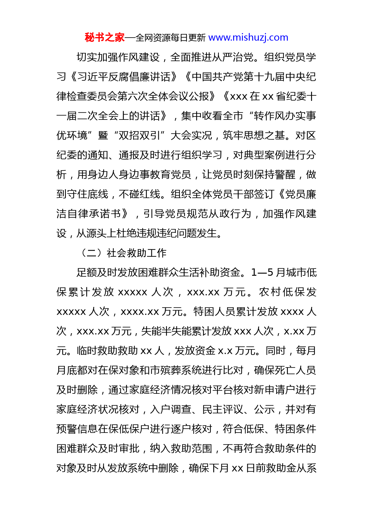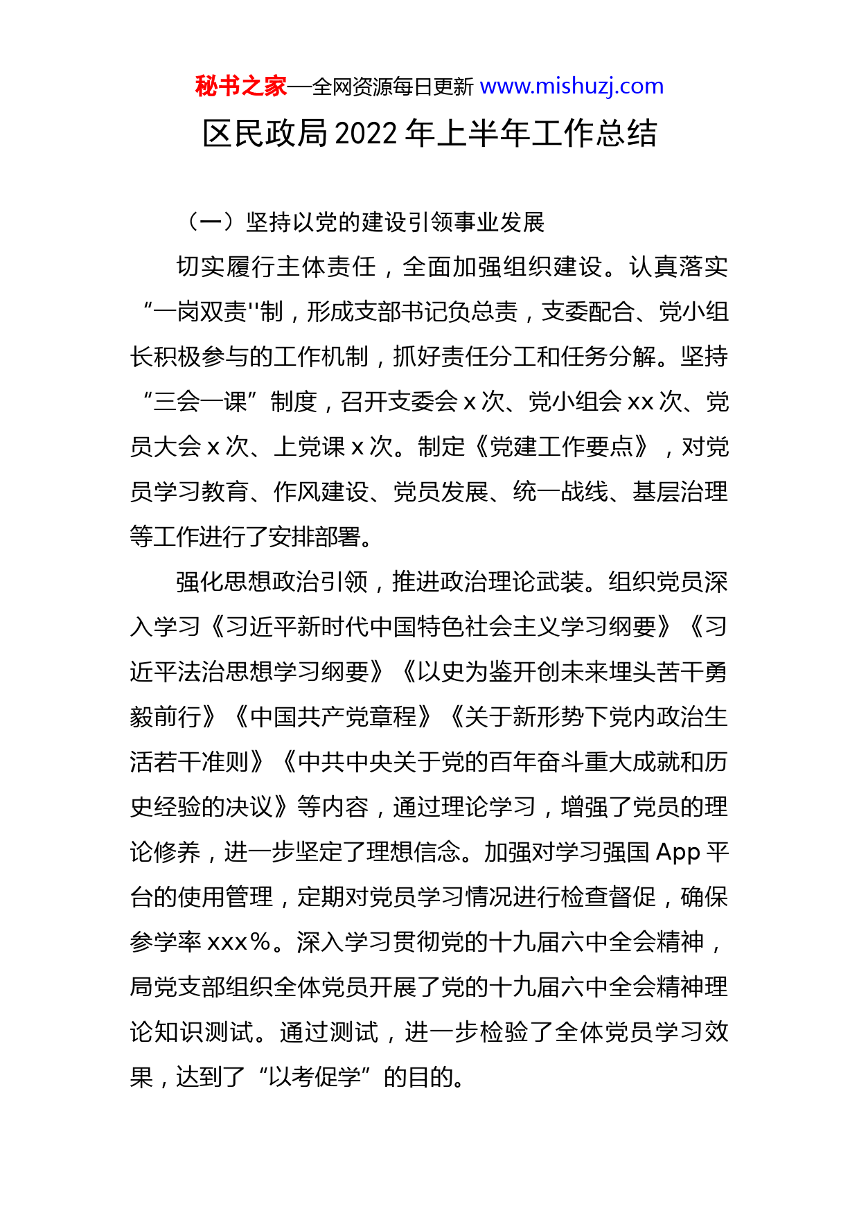 秘书之家—全网资源每日更新www.mishuzj.com区民政局2022年上半年工作总结(一)坚持以党的建设引领事业发展切实履行主体责任,全面加强组织建设。认真落实“一岗双责''制,形成支部书记负总责,支委配合、党小组长积极参与的工作机制,抓好责任分工和任务分解。坚持“三会一课”制度,召开支委会x次、党小组会xx次、党员大会x次、上党课x次。制定《党建工作要点》,对党员学习教育、作风建设、党员发展、统一战线、基层治理等工作进行了安排部署。强化思想政治引领,推进政治理论武装。组织党员深入学习《习近平新时代中国特色社会主义学习纲要》《习近平法治思想学习纲要》《以史为鉴开创未来埋头苦干勇毅前行》《中国共产党章程》《关于新形势下党内政治生活若干准则》《中共中央关于党的百年奋斗重大成就和历史经验的决议》等内容,通过理论学习,增强了党员的理论修养,进一步坚定了理想信念。加强对学习强国App平台的使用管理,定期对党员学习情况进行检查督促,确保参学率xxx%。深入学习贯彻党的十九届六中全会精神,局党支部组织全体党员开展了党的十九届六中全会精神理论知识测试。通过测试,进一步检验了全体党员学习效果,达到了“以考促学”的目的。秘书之家—全网资源每日更新www.mishuzj.com切实加强作风建设,全面推进从严治党。组织党员学习《习近平反腐倡廉讲话》《中国共产党第十九届中央纪律检查委员会第六次全体会议公报》《xxx在xx省纪委十一届二次全会上的讲话》,集中收看全市“转作风办实事优环境”暨“双招双引”大会实况,筑牢思想之基。对区纪委的通知、通报及时进行组织学习,对典型案例进行分析,用身边人身边事教育党员,让党员时刻保持警醒,做到守住底线,不碰红线。组织全体党员干部签订《党员廉洁自律承诺书》,引导党员规范从政行为,加强作风建设,从源头上杜绝违规违纪问题发生。(二)社会救助工作足额及时发放困难群众生活补助资金。1—5月城市低保累计发放xxxxx人次,xxx.xx万元。农村低保发xxxxx人次,xxxx.xx万元。特困人员累计发放xxxx人次,xxx.xx万元,失能半失能累计发放xxx人次,x.xx万元。临时救助救助xx人,发放资金x.x万元。同时,每月月底都对在保对象和市殡葬系统进行比对,确保死亡人员及时删除,通过家庭经济情况核对平台核对新申请户进行家庭经济状况核对,入户调查、民主评议、公示,并对有预警信息在保低保户进行逐户核对,符合低保、特困条件困难群众及时审批,纳入救助范围,不再符合救助条件的对象及时从发放系统中删除,确保下月xx日前救助金从系秘书之家—全网资源每日更新www.mishuzj.com统中成功发放。贯彻落实省民政厅印发《全省民政系统养老服务、社会救助和社会事务领域突出问题专项整治方案》的通知(xx字〔xxxx〕xx号)文件要求,重点整治老弱病残及返贫监测户等特殊群体“脱保””漏保‘‘、救助对象死亡后未及时停发救助金、特困供养人员照护缺失等问题。集中整治保障不及时、综合施策不全面等社会救助政策落实不到位问题;“错保”“政策保”等社会救助对象保障不精准问题;门难进、脸难看、话难听、事难办等社会救助经办服务形式主义、官僚主义问题;责任不明确,尤其是群众办理救助业务过程中推诿扯皮;镇、街道、开发区社会救助经办机构责任不落实不到位导致群众诉求不能及时回应,特困供养对象失能半失能人员集中供养不到位等。目前我区结合社会救助对象复核工作,整治工作有序开展,截止x月xx日还没有发现以上问题。充分发挥社会救助主动发现机制作用,组织基层干部、社会救助工作协理员对低保户、特困人员、低保边缘户、支出型家庭等低收入群体进行全覆盖走访,特别是分散特困供养人员住房安全、日常照料,患病照料做到时时有人照顾。共走访困难群众xxxx人次,确保困难群众得到及时救助。持续落实《xx区低收入人口认定及救助暂行办法》秘书之家—全网资源每日更新www.mishuzj.com(xx字〔xxxx〕号),依托xx省低保障信息平台,开展低收入审核确认工作,目前低保xxxxA,特困人员xxx人,低保边缘家庭和因病低收入家庭xx人。xxxx年春节慰问情况。“两节”期间积极开展帮扶和走访慰问活动。县领导干部,区直各部门走访慰问了辖区内贫困户、特困户、困难党员等困难群体,共慰问xxx户,资金xx.x万元,及时把党和政府的关怀和温暖送困难群众手中。(三)养老服务工作健全老年人补贴制度,按月发放高龄津贴,实现全覆盖,1—5月累计发放高龄津贴xxx.xxx万元,xxxx累计发放百岁津贴xx.xx万元,百岁老年人xx位。发放上半年特困供养服务机构管理经费xx.xxx万元。购买养老机构老年人意外伤害险x.xxx万元。购买低保、特困、重点优抚对象三类人员意外伤害险xx.xxx万元。一季度社区养老服务中心运营补助发放xx.xx万元。推进特殊困难老年人家庭适老化改造和家庭床位建设,xxxx年对符合条件的xx户特殊困难老年人家庭实施居家适老化改造,对符合条件的xx户中度、重度需长期照护家庭开展家庭床位建设,通过进行无障碍、安全性、适老性、辅具适配、服务签订等,为老年人创造更加安全、便利和舒适的生活和服务。目前xx户招投标工作已完成,预计x月底完成改造。xxxx秘书之家—全网资源每日更新www.mishuzj.com年新增x个社区老年食堂,分别是高岳社区老
