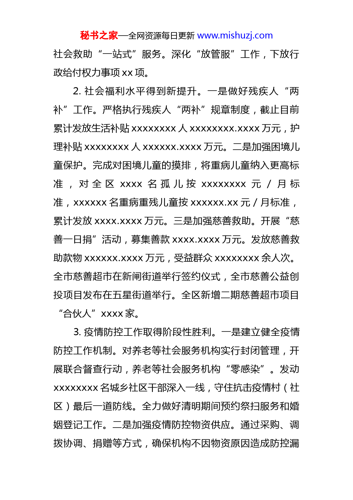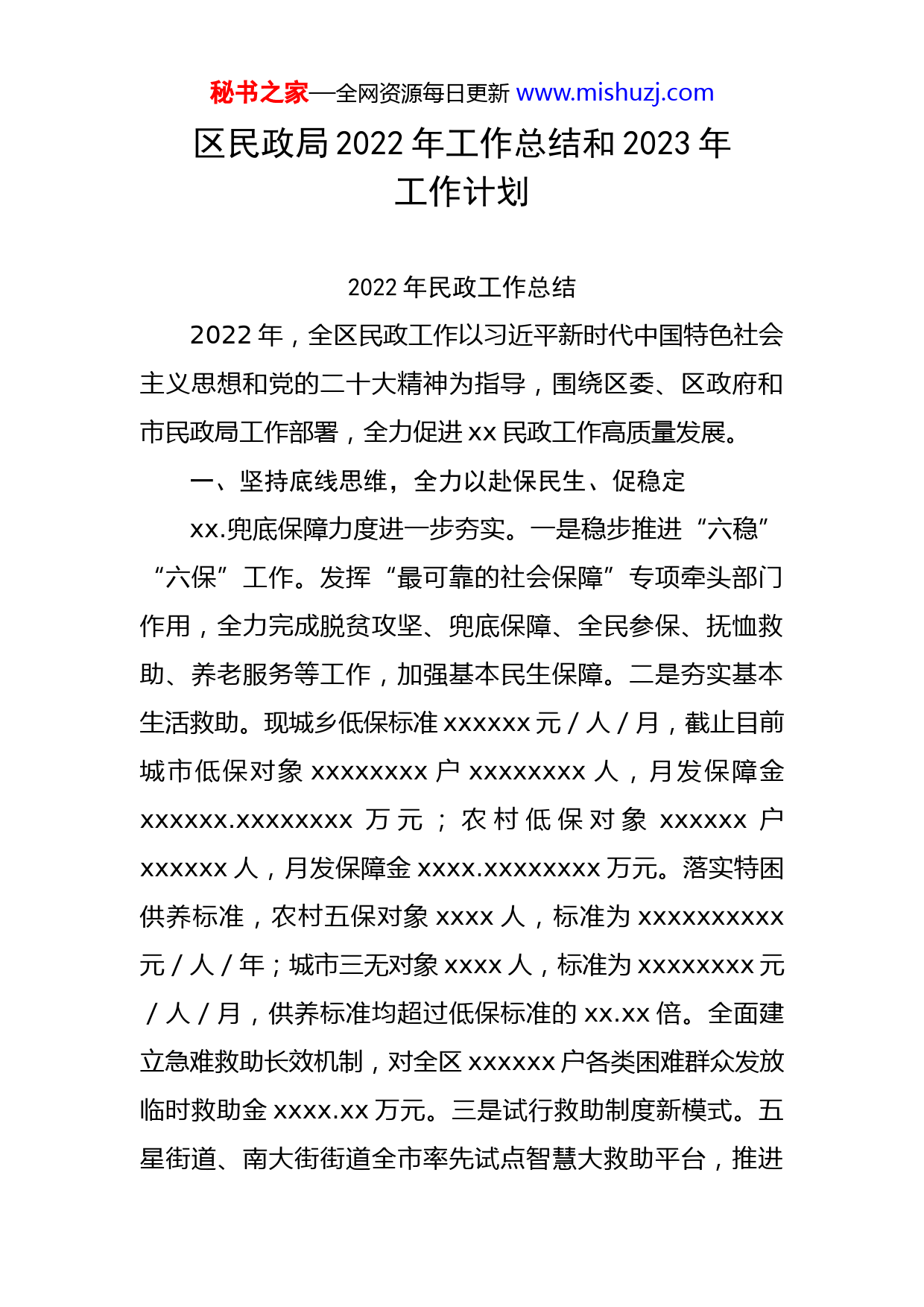 秘书之家—全网资源每日更新www.mishuzj.com区民政局2022年工作总结和2023年工作计划2022年民政工作总结2022年,全区民政工作以习近平新时代中国特色社会主义思想和党的二十大精神为指导,围绕区委、区政府和市民政局工作部署,全力促进xx民政工作高质量发展。一、坚持底线思维,全力以赴保民生、促稳定xx.兜底保障力度进一步夯实。一是稳步推进“六稳”“六保”工作。发挥“最可靠的社会保障”专项牵头部门作用,全力完成脱贫攻坚、兜底保障、全民参保、抚恤救助、养老服务等工作,加强基本民生保障。二是夯实基本生活救助。现城乡低保标准xxxxxx元/人/月,截止目前城市低保对象xxxxxxxx户xxxxxxxx人,月发保障金xxxxxx.xxxxxxxx万元;农村低保对象xxxxxx户xxxxxx人,月发保障金xxxx.xxxxxxxx万元。落实特困供养标准,农村五保对象xxxx人,标准为xxxxxxxxxx元/人/年;城市三无对象xxxx人,标准为xxxxxxxx元/人/月,供养标准均超过低保标准的xx.xx倍。全面建立急难救助长效机制,对全区xxxxxx户各类困难群众发放临时救助金xxxx.xx万元。三是试行救助制度新模式。五星街道、南大街街道全市率先试点智慧大救助平台,推进秘书之家—全网资源每日更新www.mishuzj.com社会救助“一站式”服务。深化“放管服”工作,下放行政给付权力事项xx项。⒉社会福利水平得到新提升。一是做好残疾人“两补”工作。严格执行残疾人“两补”规章制度,截止目前累计发放生活补贴xxxxxxxx人xxxxxxxx.xxxx万元,护理补贴xxxxxxxx人xxxxxx.xxxx万元。二是加强困境儿童保护。完成对困境儿童的摸排,将重病儿童纳入更高标准,对全区xxxx名孤儿按xxxxxxxx元/月标准,xxxxxx名重病重残儿童按xxxxxx.xx元/月标准,累计发放xxxx.xxxx万元。三是加强慈善救助。开展“慈善一日捐”活动,募集善款xxxx.xxxx万元。发放慈善救助款物xxxxxx.xxxx万元,受益群众xxxxxxxx余人次。全市慈善超市在新闸街道举行签约仪式,全市慈善公益创投项目发布在五星街道举行。全区新增二期慈善超市项目“合伙人”xxxx家。⒊疫情防控工作取得阶段性胜利。一是建立健全疫情防控工作机制。对养老等社会服务机构实行封闭管理,开展联合督查行动,养老等社会服务机构“零感染”。发动xxxxxxxx名城乡社区干部深入一线,守住抗击疫情村(社区)最后一道防线。全力做好清明期间预约祭扫服务和婚姻登记工作。二是加强疫情防控物资供应。通过采购、调拨协调、捐赠等方式,确保机构不因物资原因造成防控漏秘书之家—全网资源每日更新www.mishuzj.com洞。三是开展好疫情防控常态化工作。建立健全常态化疫情防控长效机制,防控迅速到位、封闭管理严实,对xxxx家养老机构xxxxxx名工作人员进行核酸检测,做到“应检尽检”,坚决阻断疫情在养老机构的传播渠道。⒋安全生产专项整治行动取得明显成效。一是建立安全生产长效机制。出台并下发一系列规章制度、文件等,从制度层面增强安全生产底线意识。将安全生产工作纳入对镇(街道)绩效考核目标之中,组织开展多部门参与的安全生产联合大检查,深入养老等社会服务机构查找问题、指出隐患、限期整改。二是加强安全生产保障。投入xx.xx万元对全区养老机构进行新一轮维保工作。加大安全生产教育宣传工作,通过举办“春风行动”集中宣讲、“百团进百万企业”、专题培训等,提升安全生产意识。三是全力推进消防审验工作。建立多部门协作机制,坚持“挂图作战”、逐项推进,完成xx镇敬老院消防审验工作并进行了备案。加强全区无证养老场所整治工作,关停xx镇田园风光养老院,xx街道xx老年公寓(筹)目前在整改中。二、聚焦主责主业,聚精会神提质量、促发展⒈坚持养有所保,在为老服务水平上实现新提升。一是注重体系化建设,构建养老服务新格局。新建标准化居家养老服务站项目xx个,提升改造居家养老服务站xx秘书之家—全网资源每日更新www.mishuzj.com个,全区城乡标准化居家养老服务站分别为xxxx个、xxxx个,占比为xxxx.xxxx%、xxxx.xxxx%。建成投用区级居家养老服务指导中心,新建xx市xx区福乐护养中心,新增护理型床位xxxx张。二是注重精准化服务,拓展适老照护新模式。投入约xxxxxx万元开展居家养老上门服务,目前上门服务人数达xx.xxxx万人,占比xxxx%。投入约xxxxxx万元,为xxxxxx户特殊困难老年人家庭实施适老化改造。三是注重融合化发展,探索医康养护新路径。建成护理型床位xxxxxxxx张,护理型占比达xxxx.xx%。养老机构内设医疗机构xxxx家,与医院联营xx家。建成幸福万嘉护理院、xx玖玖护理中心。幸福天年老年公寓入选全省唯一“高品质养老服务标准化”试点,玖玖江南养护中心入选省“养老护理员实训基地”。xx.坚持多元共治,在基层社会治理创新上实现新跨越。一是深入推进全国全省实验区创建。制订出台社区治理创新实验区实施方案等文件,完成《全国社区治理和服务创新实验区工作方案》初稿,并报送省厅、民政部。建立试点社区,指导街道、社区在“xx+xx•全域化”社区资源整合模式方面开展探索。“‘社区天天乐’——开创多元共治新模式”获评xxxxxxxx—xxxxxxxx年度xx省基层社会治理创新成果。二是稳妥推进城乡社工职业体系建设。出台《xx区专职管理村干部薪酬体系暂行办法》秘书之家—全网资源每日更新www.mishuzj.com《xx区村(社区)党组织书记企业年金制度暂行办法》,全市率先开发xx区