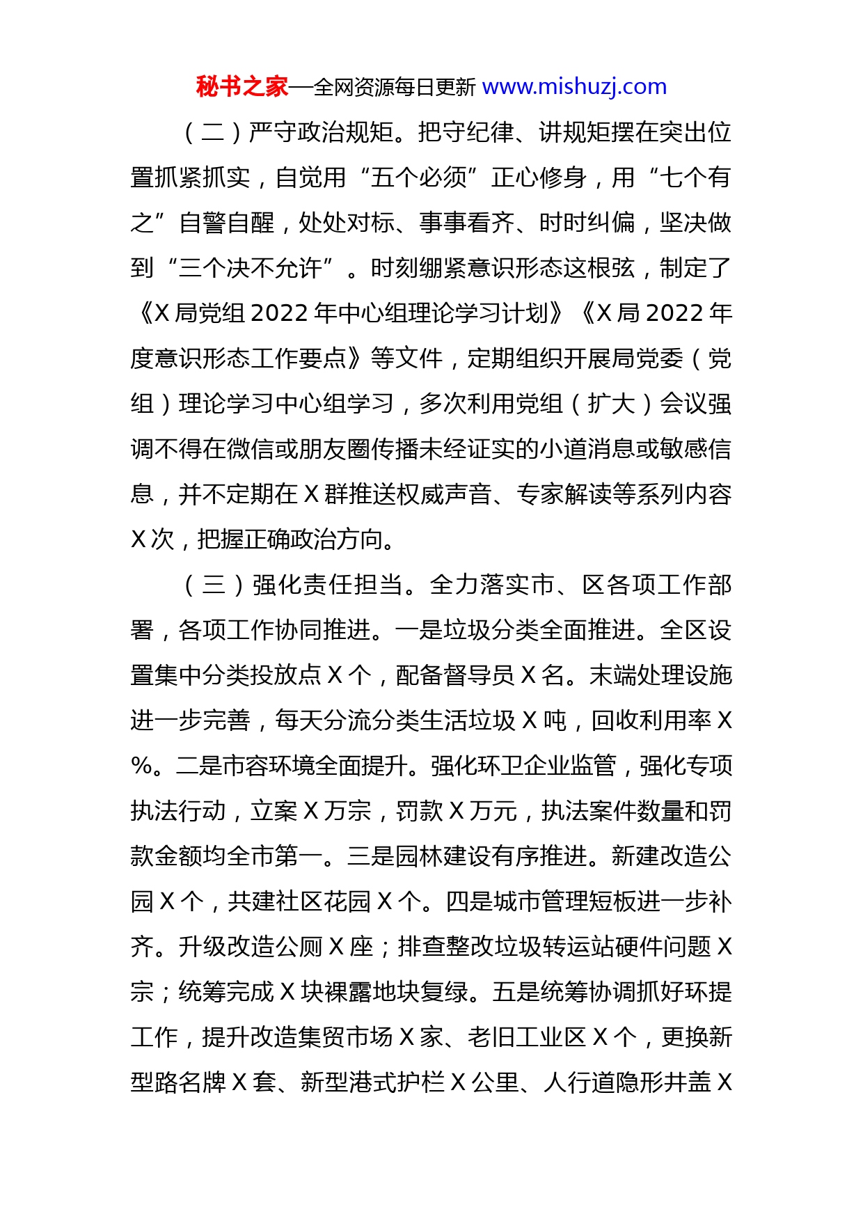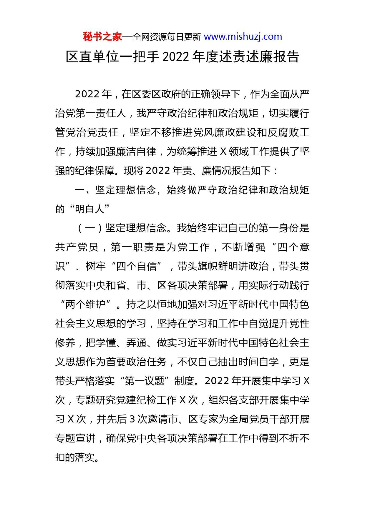秘书之家—全网资源每日更新www.mishuzj.com区直单位一把手2022年度述责述廉报告2022年,在区委区政府的正确领导下,作为全面从严治党第一责任人,我严守政治纪律和政治规矩,切实履行管党治党责任,坚定不移推进党风廉政建设和反腐败工作,持续加强廉洁自律,为统筹推进X领域工作提供了坚强的纪律保障。现将2022年责、廉情况报告如下:一、坚定理想信念,始终做严守政治纪律和政治规矩的“明白人”(一)坚定理想信念。我始终牢记自己的第一身份是共产党员,第一职责是为党工作,不断增强“四个意识”、树牢“四个自信”,带头旗帜鲜明讲政治,带头贯彻落实中央和省、市、区各项决策部署,用实际行动践行“两个维护”。持之以恒地加强对习近平新时代中国特色社会主义思想的学习,坚持在学习和工作中自觉提升党性修养,把学懂、弄通、做实习近平新时代中国特色社会主义思想作为首要政治任务,不仅自己抽出时间自学,更是带头严格落实“第一议题”制度。2022年开展集中学习X次,专题研究党建纪检工作X次,组织各支部开展集中学习X次,并先后3次邀请市、区专家为全局党员干部开展专题宣讲,确保党中央各项决策部署在工作中得到不折不扣的落实。秘书之家—全网资源每日更新www.mishuzj.com(二)严守政治规矩。把守纪律、讲规矩摆在突出位置抓紧抓实,自觉用“五个必须”正心修身,用“七个有之”自警自醒,处处对标、事事看齐、时时纠偏,坚决做到“三个决不允许”。时刻绷紧意识形态这根弦,制定了《X局党组2022年中心组理论学习计划》《X局2022年度意识形态工作要点》等文件,定期组织开展局党委(党组)理论学习中心组学习,多次利用党组(扩大)会议强调不得在微信或朋友圈传播未经证实的小道消息或敏感信息,并不定期在X群推送权威声音、专家解读等系列内容X次,把握正确政治方向。(三)强化责任担当。全力落实市、区各项工作部署,各项工作协同推进。一是垃圾分类全面推进。全区设置集中分类投放点X个,配备督导员X名。末端处理设施进一步完善,每天分流分类生活垃圾X吨,回收利用率X%。二是市容环境全面提升。强化环卫企业监管,强化专项执法行动,立案X万宗,罚款X万元,执法案件数量和罚款金额均全市第一。三是园林建设有序推进。新建改造公园X个,共建社区花园X个。四是城市管理短板进一步补齐。升级改造公厕X座;排查整改垃圾转运站硬件问题X宗;统筹完成X块裸露地块复绿。五是统筹协调抓好环提工作,提升改造集贸市场X家、老旧工业区X个,更换新型路名牌X套、新型港式护栏X公里、人行道隐形井盖X秘书之家—全网资源每日更新www.mishuzj.com个。二、聚焦主责主业,始终做落实全面从严管党治党的“带头人”(一)聚焦主责主业。作为“班长”,我认真落实“书记抓、抓书记”工作要求,全力聚焦主责主业,坚定不移推进全面从严治党管党。一是严格按照区机关党建标准化管理考核要求,结合X工作实际,制定《2020年党建工作内容清单》,细化分解出X项具体工作任务,逐项厘清书记、委员每项责任要求,层层明确分工、部署落实。二是根据组织部有关文件要求,把支部建在具体部门科室上,在全区率先完成支部调整设置,推动党建工作与业务工作一起谋划、落实。三是带头落实双重组织生活制度,不定期列席各个支部“三会一课”,并为全体党员上党课,确保支部组织生活质量。组织参观主题党日和志愿服务活动10余次,切实提升支部组织力和凝聚力。四是从严从实加强党员教育管理,培养讲政治、素质高的“后备军”,2022年发展党员X名,X名同志被确定为发展对象,X名积极分子正在开展政治审查工作。(二)打造专业务实的干部队伍。一是在业务攻坚中锤炼干部。树立重视基层、崇尚实干的作风导向,制定并印发了领导挂点街道方案,每个分管领导每周至少开展1次挂点活动。创文期间,抽调X名干部下沉挂点街道助力秘书之家—全网资源每日更新www.mishuzj.com创文冲刺。二是打造专业型干部队伍。实施固本培元学习计划,按照“每月一次业务技能专题学习、每季度一次跨部门工作经验交流、每半年一次重难点工作专题讲座”工作思路,全年共开展各类培训X次,干部职工累计参加X人次。三是进一步优化干部队伍梯次结构。注重在攻坚克难岗位发现和培养年轻干部,招录急需紧缺专业优秀干部X名,提拔重用干部X名,轮岗交流X人次;抽调干部在急难险重岗位锻炼X人次,同级转非X人次。评选出“标兵党支部”X个、“标兵团队”X个、“优秀共产党员”X名、“先进工作者”X名,大力营造干事创业良好氛围。四是探索建立“清单化”管理模式,以“8大攻坚战+5大基础性工作+4项保障性工作”为思路,梳理出全局重点工作任务X项,“清单化”明确各项工作分管领导、牵头部门、配合部门及完成时限。五是实行“红黄蓝绿通报制度”,每个季度对X项重点工作推进情况进行跟踪,并进行公示,对工作推进不力的部门进行通报批评,以严肃问责倒逼工作责任落实。(三)做好巡察、审计“下半篇文章”。一是切实承担起巡察、审计整改主体责任,把整改工作作为一项重大政治任务抓紧抓实抓好,建立了“党组书记统筹全局、其他分管领导分兵把口、部门负责人切实担负”的工作机制,列明了问题清单,以巡察、审计整改工作为契机,进秘书之家—全网资源每日更新www