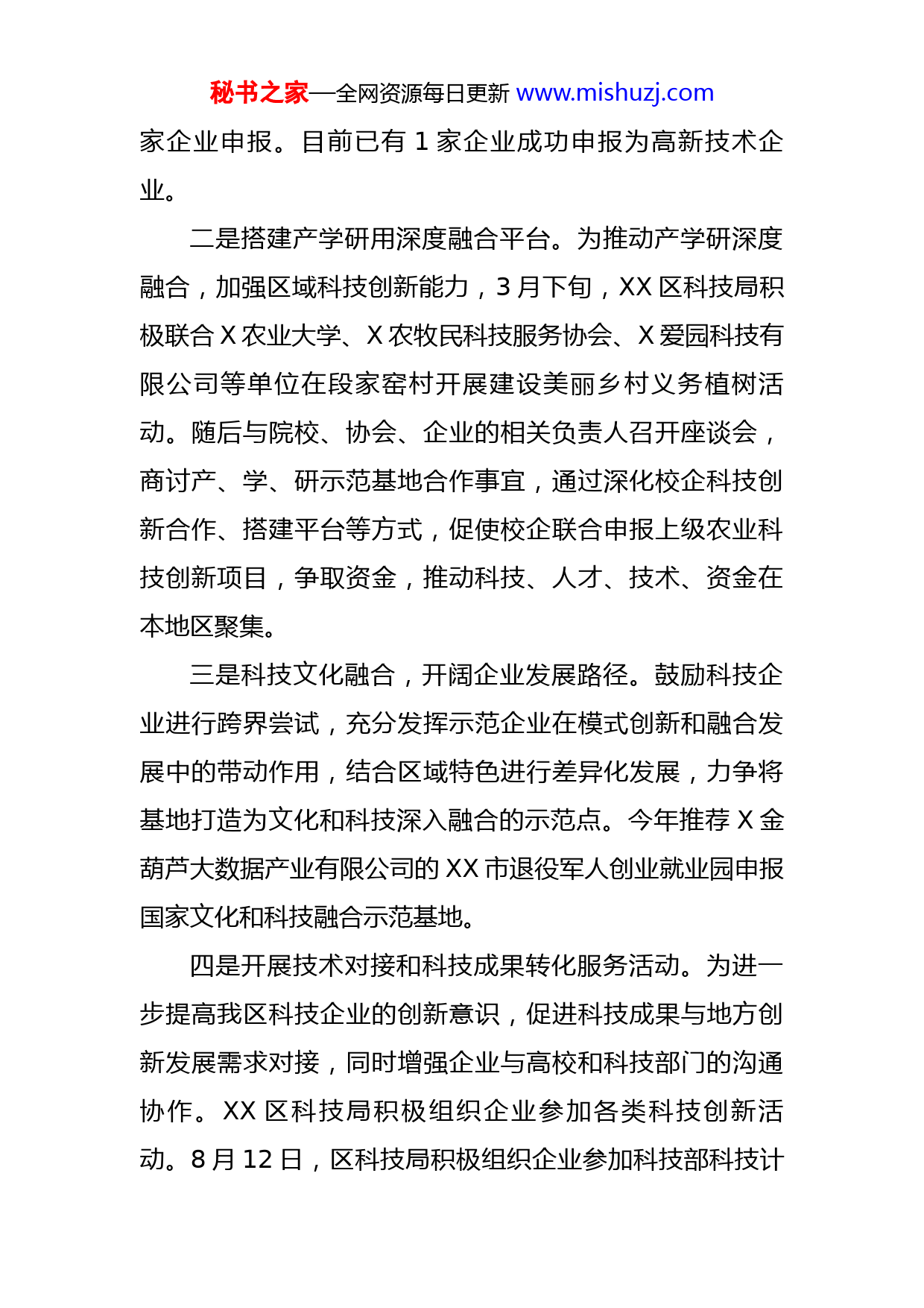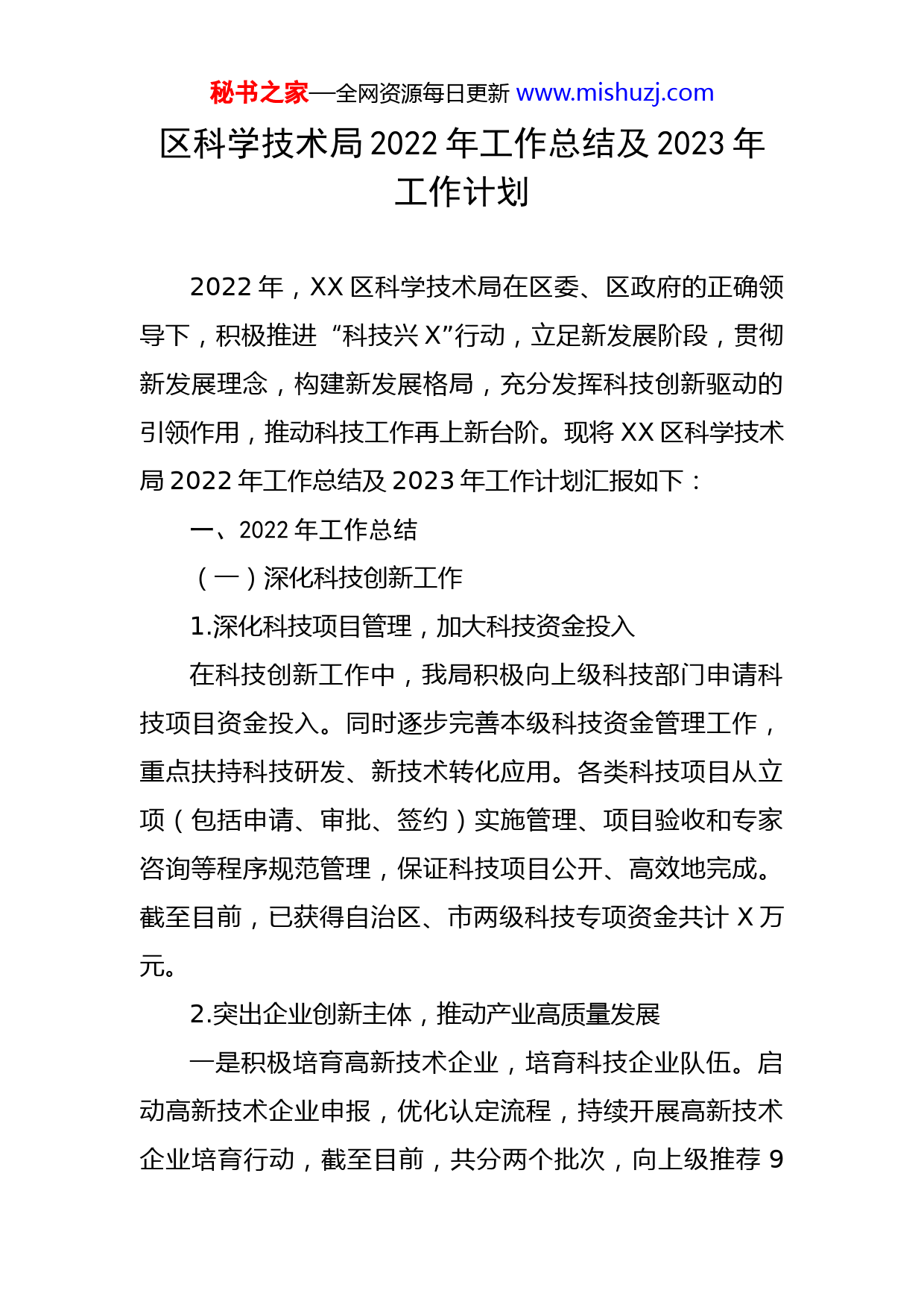 秘书之家—全网资源每日更新www.mishuzj.com区科学技术局2022年工作总结及2023年工作计划2022年,XX区科学技术局在区委、区政府的正确领导下,积极推进“科技兴X”行动,立足新发展阶段,贯彻新发展理念,构建新发展格局,充分发挥科技创新驱动的引领作用,推动科技工作再上新台阶。现将XX区科学技术局2022年工作总结及2023年工作计划汇报如下:一、2022年工作总结(一)深化科技创新工作1.深化科技项目管理,加大科技资金投入在科技创新工作中,我局积极向上级科技部门申请科技项目资金投入。同时逐步完善本级科技资金管理工作,重点扶持科技研发、新技术转化应用。各类科技项目从立项(包括申请、审批、签约)实施管理、项目验收和专家咨询等程序规范管理,保证科技项目公开、高效地完成。截至目前,已获得自治区、市两级科技专项资金共计X万元。2.突出企业创新主体,推动产业高质量发展一是积极培育高新技术企业,培育科技企业队伍。启动高新技术企业申报,优化认定流程,持续开展高新技术企业培育行动,截至目前,共分两个批次,向上级推荐9秘书之家—全网资源每日更新www.mishuzj.com家企业申报。目前已有1家企业成功申报为高新技术企业。二是搭建产学研用深度融合平台。为推动产学研深度融合,加强区域科技创新能力,3月下旬,XX区科技局积极联合X农业大学、X农牧民科技服务协会、X爱园科技有限公司等单位在段家窑村开展建设美丽乡村义务植树活动。随后与院校、协会、企业的相关负责人召开座谈会,商讨产、学、研示范基地合作事宜,通过深化校企科技创新合作、搭建平台等方式,促使校企联合申报上级农业科技创新项目,争取资金,推动科技、人才、技术、资金在本地区聚集。三是科技文化融合,开阔企业发展路径。鼓励科技企业进行跨界尝试,充分发挥示范企业在模式创新和融合发展中的带动作用,结合区域特色进行差异化发展,力争将基地打造为文化和科技深入融合的示范点。今年推荐X金葫芦大数据产业有限公司的XX市退役军人创业就业园申报国家文化和科技融合示范基地。四是开展技术对接和科技成果转化服务活动。为进一步提高我区科技企业的创新意识,促进科技成果与地方创新发展需求对接,同时增强企业与高校和科技部门的沟通协作。XX区科技局积极组织企业参加各类科技创新活动。8月12日,区科技局积极组织企业参加科技部科技计秘书之家—全网资源每日更新www.mishuzj.com划路演行动长三角专场,进一步提高企业的创新意识。8月29日积极组织企业参加上海交大科技合作事项首次对接工作会。3.强化科技创新服务,营造良好创新创业生态一是为企业提供科技政策解读等方面服务。9月上旬,XX区科技局组织召开规上企业研发投入调研座谈会,会议围绕企业研发情况进行座谈,就企业关心的科技成果转化、重大项目申报、产学研合作等问题一一作了交流。随后,各科技企业负责人介绍了各自公司在研发投入的基本情况及相关做法,相互之间交流了研发投入工作的相关意见,并提出了一些建设性意见和建议。会议同时传达了《XX市人民政府关于进一步推动科技创新构建区域创新中心的实施意见》文件精神,区科技局相关工作人员也从业务和政策上进行了讲解、宣传和解读。二是积极组织科技企业参加各类科技创新培训。为更有针对性地做好疫情期间科技项目工作和精准服务,我局积极创新工作方法,结合市科技局培训安排,利用“线上全程直播+线下现场讲解”的模式,连续组织多次科技创新培训会。3月11日组织企业参加市科技局线上举行的“疫情之下的企业创新培训”;9月1日,组织辖区科技企业积极参加“专精特新”企业之路线上培训,助力企业深入了解科技政策,打造企业品牌。9月22日,组织辖区内秘书之家—全网资源每日更新www.mishuzj.com企业参加线上“2022中俄科技创新高峰论坛”,进一步引导科技企业聚焦创新链整体效能,提高科技创新意识。9月27日,在线下召开规上企业研发投入调研座谈会,讲解、宣传和解读了科技创新相关政策。10月中旬,积极组织辖区内企业参加XX科技成果转化公共服务中心举办的高新技术企业知识产权管理及法律事务专项培训活动。增强辖区内科技企业知识产权管理的能力。一系列的培训为科技企业提供了精准化学习渠道,有利于发动企业积极开展科技项目申报,有利于进一步优化营商环境,增强企业的科技创新能力,提升创新管理水平,深受企业的欢迎和认同。三是搭建平台,促进政企银沟通交流。通过深入调研,充分了解企业生产经营、研发创新、人才技术需求等方面的情况。9月下旬,XX区科学技术局在退役军人创业园区举办“听企声,谋发展,民族团结一家亲,同心共筑中国梦”企业专题调研会。参会企业代表负责人就“听企声,谋发展,民族团结一家亲、同心共筑中国梦”作研讨发言。同时,推动银企合作,通过组织银企对接,了解科技企业发展现状、存在的困难及贷款需求,为科技企业蓬勃发展注入更多源头活水。9.强化科技人才队伍建设,赋能乡村振兴细化科技特派员监督管理工作,持续加强科技特派员队伍建设,以农业科技助力乡村振兴。区科技局组织辖区秘书之家—全网资源每日更新www.mishuzj.com科技特派员召开“三服务一促进”科技特派员“组团式”助力乡村振兴培训会。会议通过座谈的方