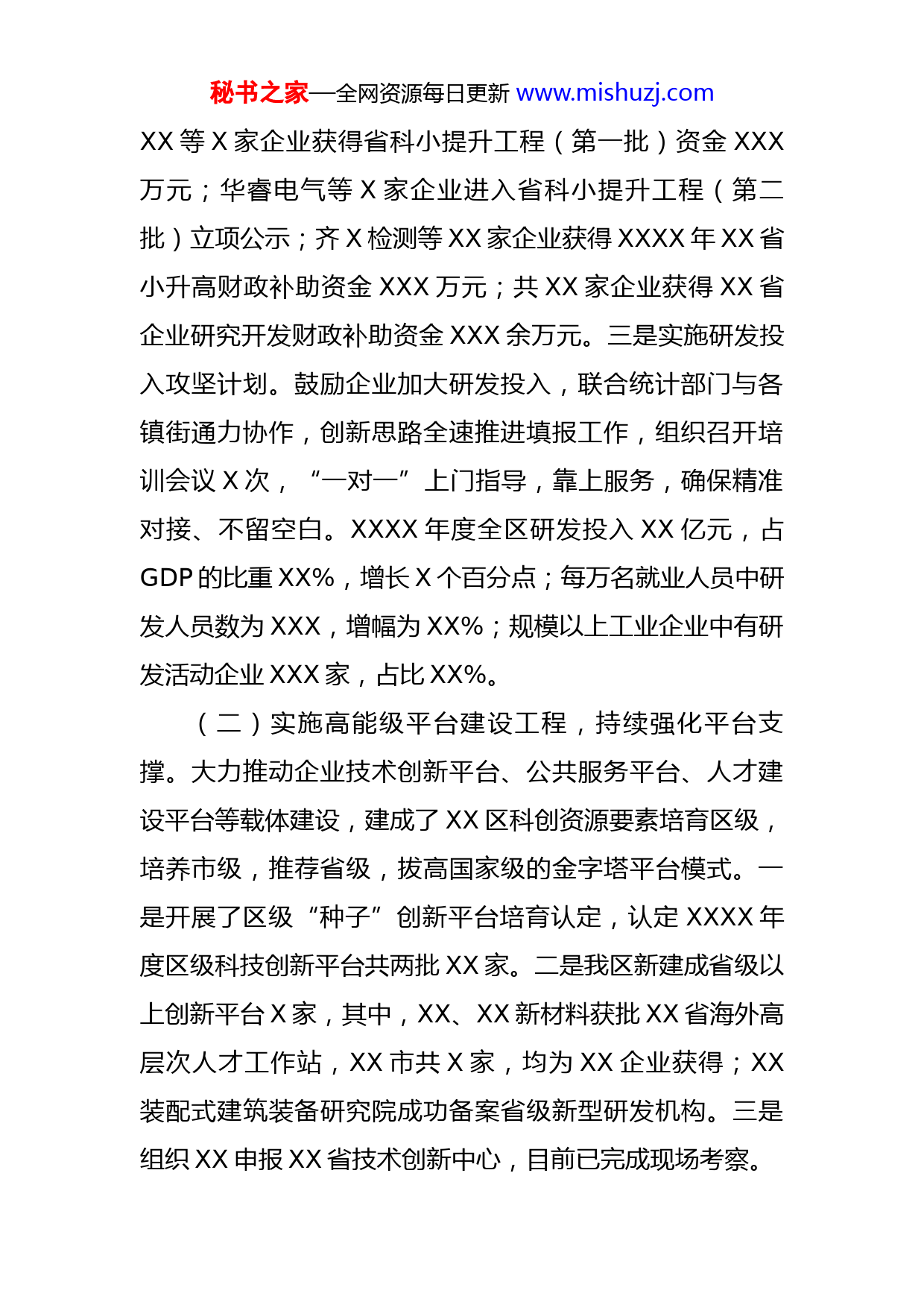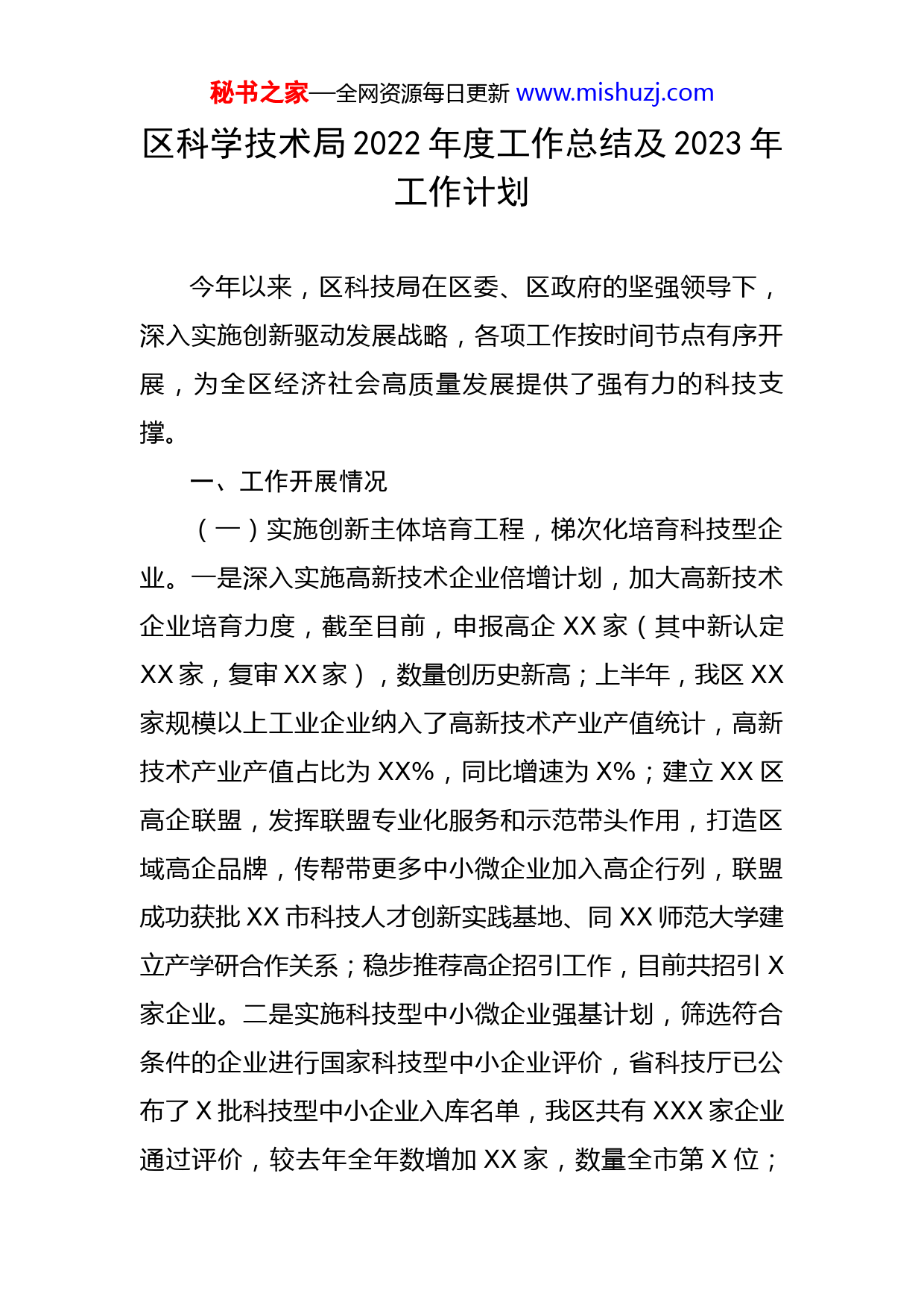 秘书之家—全网资源每日更新www.mishuzj.com区科学技术局2022年度工作总结及2023年工作计划今年以来,区科技局在区委、区政府的坚强领导下,深入实施创新驱动发展战略,各项工作按时间节点有序开展,为全区经济社会高质量发展提供了强有力的科技支撑。一、工作开展情况(一)实施创新主体培育工程,梯次化培育科技型企业。一是深入实施高新技术企业倍增计划,加大高新技术企业培育力度,截至目前,申报高企XX家(其中新认定XX家,复审XX家),数量创历史新高;上半年,我区XX家规模以上工业企业纳入了高新技术产业产值统计,高新技术产业产值占比为XX%,同比增速为X%;建立XX区高企联盟,发挥联盟专业化服务和示范带头作用,打造区域高企品牌,传帮带更多中小微企业加入高企行列,联盟成功获批XX市科技人才创新实践基地、同XX师范大学建立产学研合作关系;稳步推荐高企招引工作,目前共招引X家企业。二是实施科技型中小微企业强基计划,筛选符合条件的企业进行国家科技型中小企业评价,省科技厅已公布了X批科技型中小企业入库名单,我区共有XXX家企业通过评价,较去年全年数增加XX家,数量全市第X位;秘书之家—全网资源每日更新www.mishuzj.comXX等X家企业获得省科小提升工程(第一批)资金XXX万元;华睿电气等X家企业进入省科小提升工程(第二批)立项公示;齐X检测等XX家企业获得XXXX年XX省小升高财政补助资金XXX万元;共XX家企业获得XX省企业研究开发财政补助资金XXX余万元。三是实施研发投入攻坚计划。鼓励企业加大研发投入,联合统计部门与各镇街通力协作,创新思路全速推进填报工作,组织召开培训会议X次,“一对一”上门指导,靠上服务,确保精准对接、不留空白。XXXX年度全区研发投入XX亿元,占GDP的比重XX%,增长X个百分点;每万名就业人员中研发人员数为XXX,增幅为XX%;规模以上工业企业中有研发活动企业XXX家,占比XX%。(二)实施高能级平台建设工程,持续强化平台支撑。大力推动企业技术创新平台、公共服务平台、人才建设平台等载体建设,建成了XX区科创资源要素培育区级,培养市级,推荐省级,拔高国家级的金字塔平台模式。一是开展了区级“种子”创新平台培育认定,认定XXXX年度区级科技创新平台共两批XX家。二是我区新建成省级以上创新平台X家,其中,XX、XX新材料获批XX省海外高层次人才工作站,XX市共X家,均为XX企业获得;XX装配式建筑装备研究院成功备案省级新型研发机构。三是组织XX申报XX省技术创新中心,目前已完成现场考察。秘书之家—全网资源每日更新www.mishuzj.com(三)实施创新项目牵引工程,加大对上争取力度。积极拓展对上争取路径,持续加大省、市科技计划项目争取力度。一是XX、XX成功入选XX省民营企业创新XXX强名单。XX机械、XX等X家企业入选XX省首批科技小巨人企业。二是XX机械“农业机械核心智能化技术研究与产业化”项目获批XXXX年度XX省重点研发计划,获得资金支持XXX万元;XX成功获批XXXX年XX省中央引导地方科技发展资金项目,将获得最高XXX万元资金支持;XX科技新型研发机构年度绩效评价被评为“优秀”等次,获得补助资金XXX万元。三是做好项目培育。鼓励企业积极参加国家、省创新创业大赛,以赛代训,使项目提档次、上水平,XX等X家企业在省竞技行动大赛上荣获XX省“科创之星”称号(全省共XX家,获奖企业数量占全市总数的XX%以上),其中XX被推荐参加国赛。截至目前,共争取上级资金XXXX万元。四是在抓好对上争取的同时,组织实施区级政策引导类项目,以此来推动实现我区企业家家有平台、处处有创新,目前已立项XXX个,项目资金总投入达到X亿元。(四)实施高层次人才集聚工程,持续强化人才引育留用。一是为我区攀登企业成功选派科技副总XX名,上半年已正式开展工作;推荐XX人成功备案省级企业科技特派员。二是组织X家企业申报国家重点人才工程、X家企业秘书之家—全网资源每日更新www.mishuzj.com申报省XX人才项目,其中XX已成功入选XX产业领军人才创业企业类;组织XX申报XX省海外工程师项目,获批支持资金XX万元;XX获批国家重点人才工程省级配套支持资金XXX万元。三是持续加大本土人才培养力度,联合区人才办制定了《XX市XX区科技创新领军人才管理办法》,在全区积极开展科技创新领军人才后备库人选推荐工作。四是指导我区重点企业新增引进外国专家XX人,提前半年完成全年任务。(五)实施大院大所招引工程,促进产学研协同创新。一是承办了全市大院大所招引工作现场推进会、举办了XX区产学研对接活动暨“助企攀登”XX师范大学专场,组织企业参加XX招引暨产学研合作对接会;成功招引XX等X家大院大所与我区企业签约,并开展实体化运作。二是实现全区XX家攀登工程企业与高校院所产学研合作关系全覆盖,居XX市前列。(六)实施科技成果转化提速工程,促进科技金融对接。一是成立XX区科技金融成果转化促进会,组织科技型企业、科技中介机构、技术经纪人等入会,科技金融成果转化促进会组织了企业和银行开展对接活动X次。二是科技成果转化更加畅通,XXXX年度,省科技进步奖一等奖X项(XX),省科技进步奖二等奖X项(XX),获奖数量全市排名第一;XXXX年度,XX机械申报项目被评为省科技秘书之家—全网资源每日更新www.mishuzj.com进步奖二等奖,标志着我区在农机智能化上走在了全省乃至全国的前列。三是以增值服务推动企业开展技术交易,截