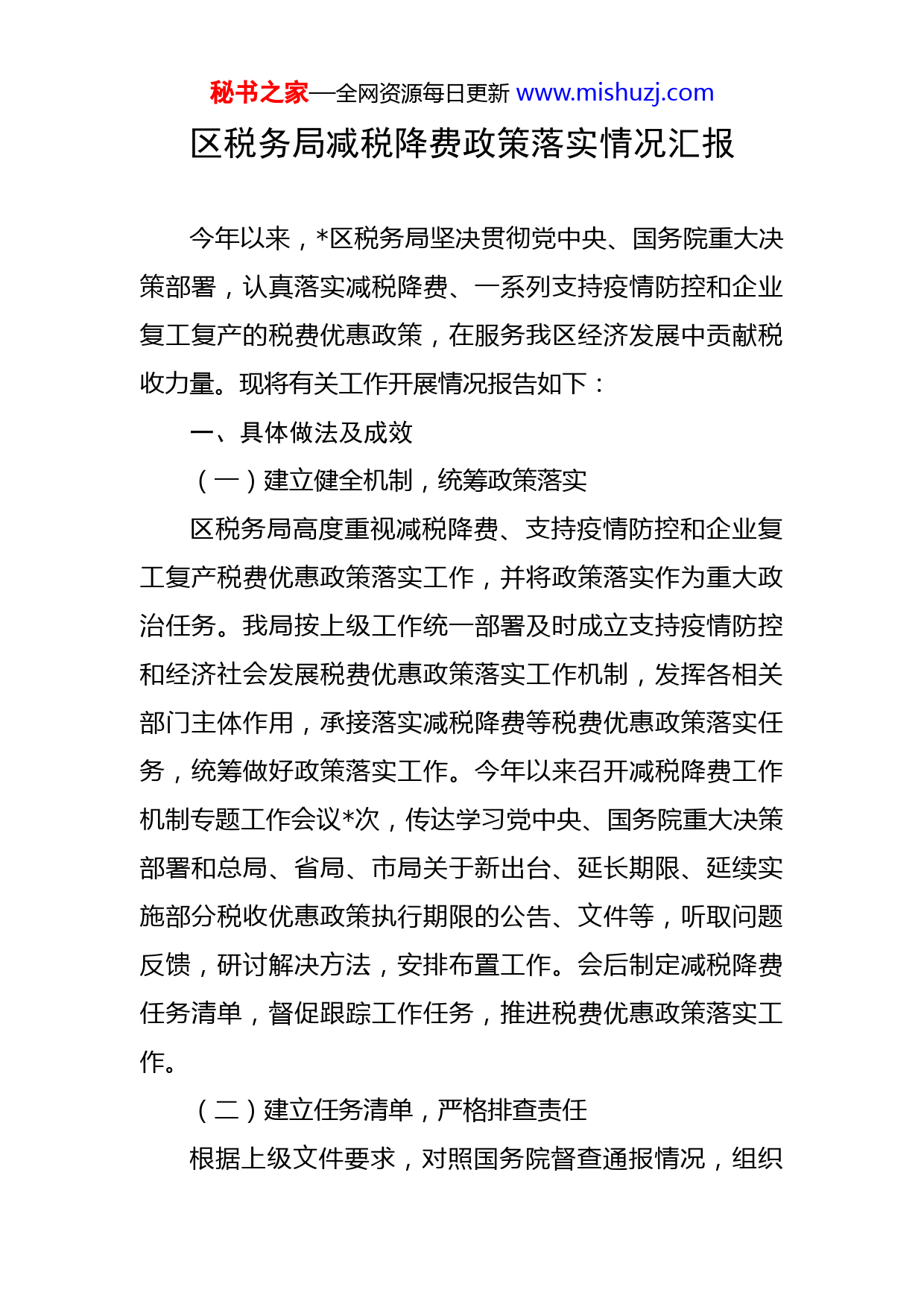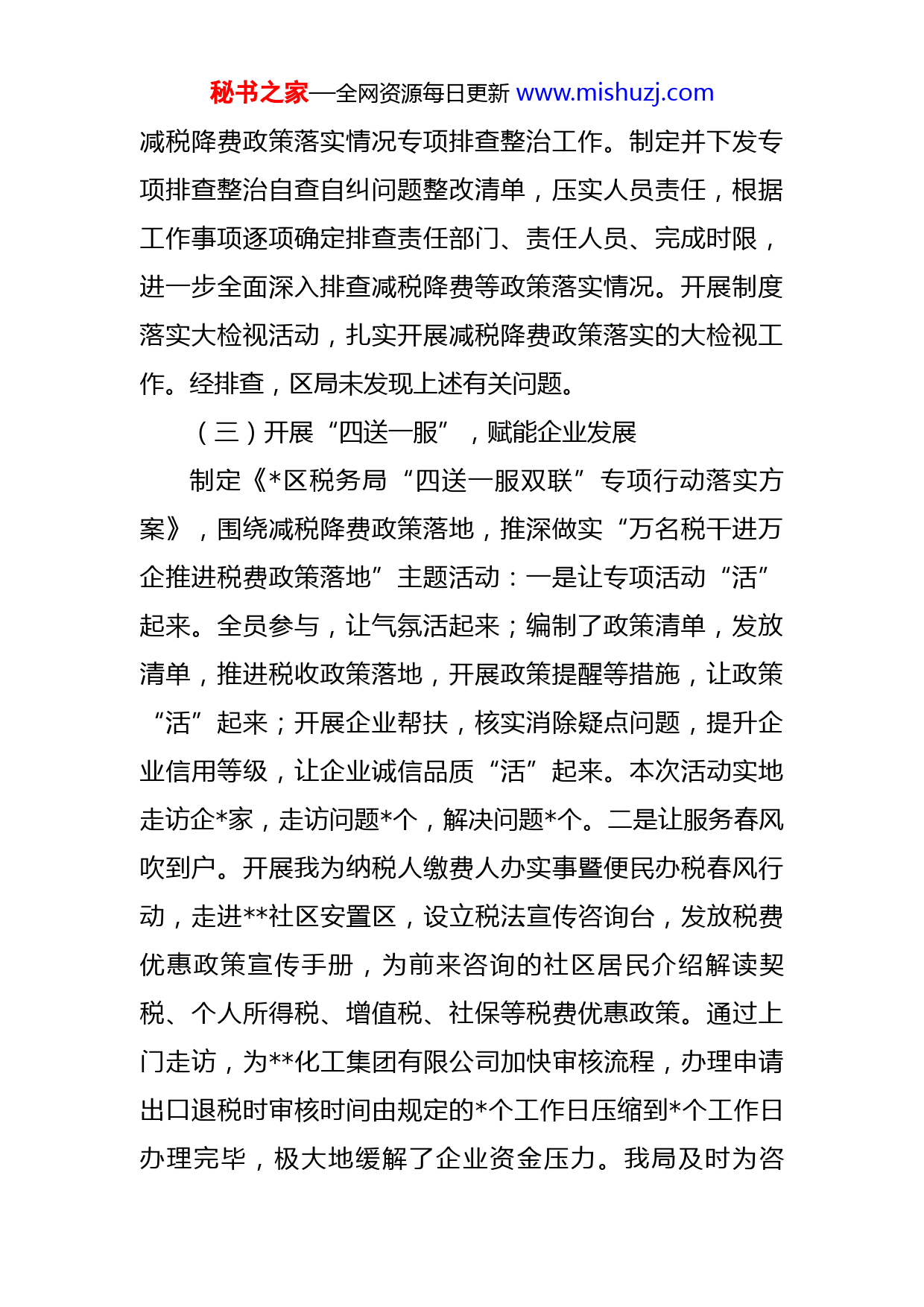 秘书之家—全网资源每日更新www.mishuzj.com区税务局减税降费政策落实情况汇报今年以来,区税务局坚决贯彻党中央、国务院重大决策部署,认真落实减税降费、一系列支持疫情防控和企业复工复产的税费优惠政策,在服务我区经济发展中贡献税收力量。现将有关工作开展情况报告如下:一、具体做法及成效(一)建立健全机制,统筹政策落实区税务局高度重视减税降费、支持疫情防控和企业复工复产税费优惠政策落实工作,并将政策落实作为重大政治任务。我局按上级工作统一部署及时成立支持疫情防控和经济社会发展税费优惠政策落实工作机制,发挥各相关部门主体作用,承接落实减税降费等税费优惠政策落实任务,统筹做好政策落实工作。今年以来召开减税降费工作机制专题工作会议次,传达学习党中央、国务院重大决策部署和总局、省局、市局关于新出台、延长期限、延续实施部分税收优惠政策执行期限的公告、文件等,听取问题反馈,研讨解决方法,安排布置工作。会后制定减税降费任务清单,督促跟踪工作任务,推进税费优惠政策落实工作。(二)建立任务清单,严格排查责任根据上级文件要求,对照国务院督查通报情况,组织秘书之家—全网资源每日更新www.mishuzj.com减税降费政策落实情况专项排查整治工作。制定并下发专项排查整治自查自纠问题整改清单,压实人员责任,根据工作事项逐项确定排查责任部门、责任人员、完成时限,进一步全面深入排查减税降费等政策落实情况。开展制度落实大检视活动,扎实开展减税降费政策落实的大检视工作。经排查,区局未发现上述有关问题。(三)开展“四送一服”,赋能企业发展制定《区税务局“四送一服双联”专项行动落实方案》,围绕减税降费政策落地,推深做实“万名税干进万企推进税费政策落地”主题活动:一是让专项活动“活”起来。全员参与,让气氛活起来;编制了政策清单,发放清单,推进税收政策落地,开展政策提醒等措施,让政策“活”起来;开展企业帮扶,核实消除疑点问题,提升企业信用等级,让企业诚信品质“活”起来。本次活动实地走访企家,走访问题个,解决问题个。二是让服务春风吹到户。开展我为纳税人缴费人办实事暨便民办税春风行动,走进社区安置区,设立税法宣传咨询台,发放税费优惠政策宣传手册,为前来咨询的社区居民介绍解读契税、个人所得税、增值税、社保等税费优惠政策。通过上门走访,为化工集团有限公司加快审核流程,办理申请出口退税时审核时间由规定的个工作日压缩到个工作日办理完毕,极大地缓解了企业资金压力。我局及时为咨秘书之家—全网资源每日更新www.mishuzj.com询、申请企业办理了税收减免手续,为科技有限公司等四户企业办理房产税、土地使用税困难减免万元。三是部门联手解难题。市轻工房地产开发有限公司开发小区项目,因历史遗留原因,按正常程序不能为该项目拆迁安置户办理不动产登记手续,在此次专项行动期间,区税务局采取“一事一议”“一案一策”的方法,容缺为户安置户办理契税完税手续,方便了安置户到不动产部门办理房产证件。进一步激发企业经济发展活力,保障企业和群众的利益,区税务局联合区财政局走访企业调研减税降费政策效果,联合调研组深入辖区各行业具有代表性的户小微企业中,走访企业负责人和财务负责人,了解经营和减税降费情况,聚焦减税降费政策措施实施效果,确保各项减税降费政策措施落地生根,直达快享见实效,切实增强企业和人民群众的获得感和满意度。(四)做好宣传辅导,精准落实政策一是强化政策宣传解读,线上线下多渠道开展宣传。利用网站、微信、电话、电子税务局平台等渠道,“一类一策、一户一策”精准辅导,加强政策宣传,线下发放《重点群体创业就业税费优惠政策》、《税费优惠政策文件汇编》和《支持民营经济发展税收优惠政策汇编》多册,邮寄《财产行为税合并申报政策汇编》户,线上微信群推送政策条,推送企业多家;通过短信平台对户纳税秘书之家—全网资源每日更新www.mishuzj.com人发送政策辅导短信条,其中:电影行业户、广告业、娱乐业户,研发费用加计扣除户,小规模纳税人户(有税),一般纳税人户(有税)。二是开展税法宣传进校园活动。月税收宣传月期间区局青年税干走进区育新小学,开展“与税‘童’行”活动,将党史教育和税法宣传搬入课堂,让“护税强国”的种子在孩子们的心中生根发芽。用漫画形式讲解“税收带来祖国美”,用趣味问答和一个个税收小故事,点亮每个孩子心中爱国护税的小火种。国庆节前夕,联合司法局、团市委、市教育局、市税务局组成的税宣志愿服务小分队来到市学校大礼堂开展迎国庆税法进校园志愿服务主题活动。税务干部以税收知识普及、互动问答和趣味游戏的形式,激发学生了解税收兴趣,培养青少年诚信纳税意识。三是开展专场税收政策辅导培训。组织开展了房地产企业税收政策辅导培训和享受研发费用加计扣除企业税收政策辅导培训场次,涉及企业多家。四是政策精准对接。区局召集享受研发费用加计扣除家企业代表进行了座谈,倾听了企业心声,了解了企业科技研发情况,辅导了研发费用加计扣除政策,面对面回答了加计扣除问题,现场答疑解惑,解决了企业研发费用不知道如何加计扣除问题。(五)优化办税服务,升级服务质量一是合