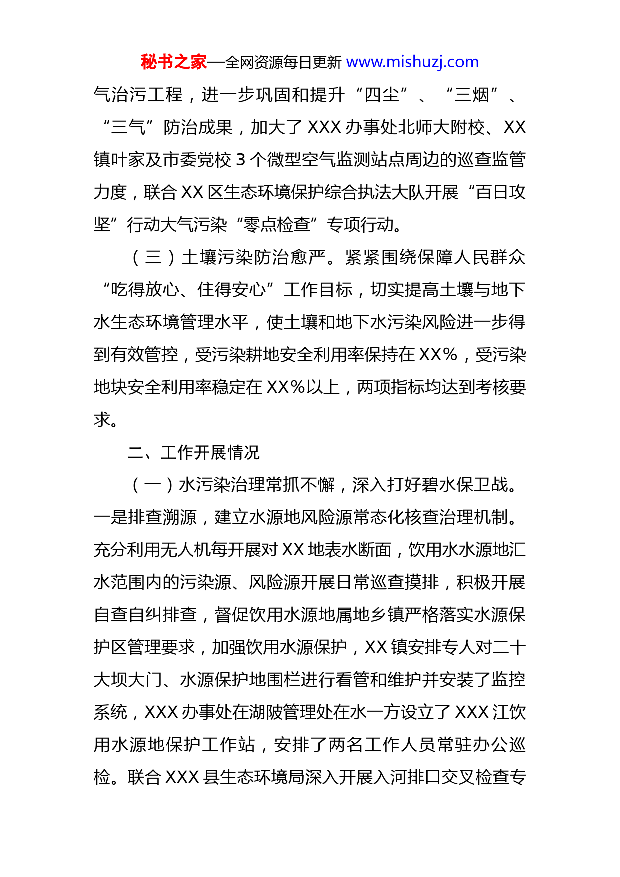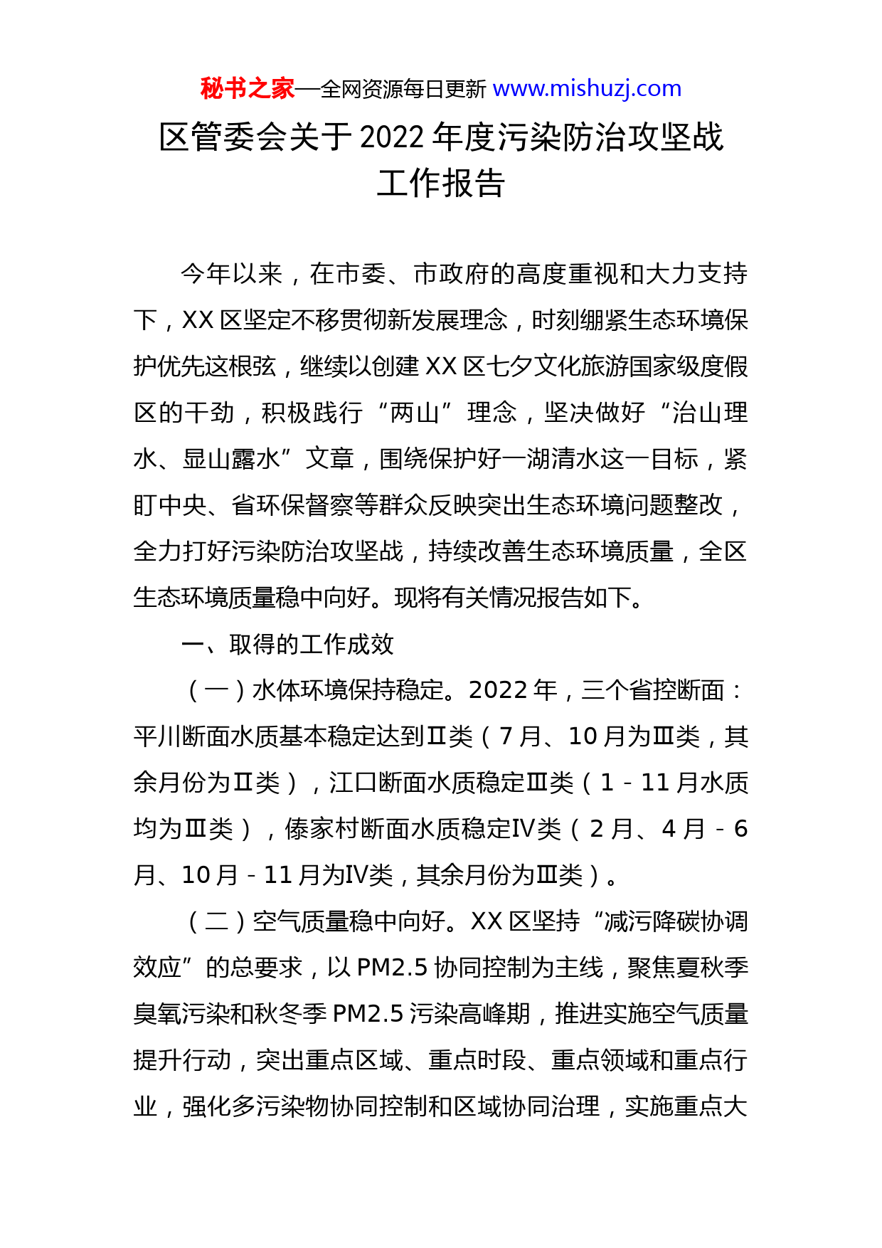 秘书之家—全网资源每日更新www.mishuzj.com区管委会关于2022年度污染防治攻坚战工作报告今年以来,在市委、市政府的高度重视和大力支持下,XX区坚定不移贯彻新发展理念,时刻绷紧生态环境保护优先这根弦,继续以创建XX区七夕文化旅游国家级度假区的干劲,积极践行“两山”理念,坚决做好“治山理水、显山露水”文章,围绕保护好一湖清水这一目标,紧盯中央、省环保督察等群众反映突出生态环境问题整改,全力打好污染防治攻坚战,持续改善生态环境质量,全区生态环境质量稳中向好。现将有关情况报告如下。一、取得的工作成效(一)水体环境保持稳定。2022年,三个省控断面:平川断面水质基本稳定达到Ⅱ类(7月、10月为Ⅲ类,其余月份为Ⅱ类),江口断面水质稳定Ⅲ类(1-11月水质均为Ⅲ类),傣家村断面水质稳定Ⅳ类(2月、4月-6月、10月-11月为Ⅳ类,其余月份为Ⅲ类)。(二)空气质量稳中向好。XX区坚持“减污降碳协调效应”的总要求,以PM2.5协同控制为主线,聚焦夏秋季臭氧污染和秋冬季PM2.5污染高峰期,推进实施空气质量提升行动,突出重点区域、重点时段、重点领域和重点行业,强化多污染物协同控制和区域协同治理,实施重点大秘书之家—全网资源每日更新www.mishuzj.com气治污工程,进一步巩固和提升“四尘”、“三烟”、“三气”防治成果,加大了XXX办事处北师大附校、XX镇叶家及市委党校3个微型空气监测站点周边的巡查监管力度,联合XX区生态环境保护综合执法大队开展“百日攻坚”行动大气污染“零点检查”专项行动。(三)土壤污染防治愈严。紧紧围绕保障人民群众“吃得放心、住得安心”工作目标,切实提高土壤与地下水生态环境管理水平,使土壤和地下水污染风险进一步得到有效管控,受污染耕地安全利用率保持在XX%,受污染地块安全利用率稳定在XX%以上,两项指标均达到考核要求。二、工作开展情况(一)水污染治理常抓不懈,深入打好碧水保卫战。一是排查溯源,建立水源地风险源常态化核查治理机制。充分利用无人机每开展对XX地表水断面,饮用水水源地汇水范围内的污染源、风险源开展日常巡查摸排,积极开展自查自纠排查,督促饮用水源地属地乡镇严格落实水源保护区管理要求,加强饮用水源保护,XX镇安排专人对二十大坝大门、水源保护地围栏进行看管和维护并安装了监控系统,XXX办事处在湖陂管理处在水一方设立了XXX江饮用水源地保护工作站,安排了两名工作人员常驻办公巡检。联合XXX县生态环境局深入开展入河排口交叉检查专秘书之家—全网资源每日更新www.mishuzj.com项行动,对于检查发现的问题,不回避,不护短,第一时间制定整改方案,进行立行立改。二是科学把脉,先进工艺堵水污染防治“漏点”。投入资金XX万元,针对XX村委坝里村公厕化粪池污水未经处理直排问题,已安装两台小型污水处理设备对污水进行处理,其工艺为缺氧—好氧(高效悬浮填料,抗冲击负荷,接触面积增大)—沉淀池—滤布滤池,出水可以达到XXX地标一级排放标准。三是统筹安排,着力补齐水污染攻坚治理“弱点”。利用环湖一公里专项债券资金,投入约XX万元实施完成了XX区环湖农村污水设施提升改造项目,该项目主要涉及环湖四个乡镇办XX个农村生活污水处理设施及终端的提升改造;实施了XXX市职教园区一体化提升泵站建设项目,项目资金XXX万元,投入资金X万元,实施完成了X家路口雨污管混接修复项目,全长约XX米。四是深化监管,着力提升污染治理模式创新“亮点”。一方面持续开展水质监测工作,在2021年投入XXX万元的基础上,2022年又投入相应资金,聘请第三方监测机构,对全区地表水断面、农村污水处理设施、入河(湖)排口及重点企业外排口分月、分季度进行水质监测与分析;另一方面,将全区已投入使用的XX座农村生活污水处理终端纳入第三方专业机构统一运维管护,委托XXX市长天科技有限公司对全区农村污水处理设施进行专业运维管护,形成运维工作“专业秘书之家—全网资源每日更新www.mishuzj.com化、常态化、科学化”模式,有效解决了农村污水处理终端“重建轻管”,农村生活污水治理得到进一步加强。五是建立渔业结构调整机制,重构XX水生态食物系统。加大投放鲢鱼苗,控制湖体藻密度,提升湖体自净能力。从2021年1月到2022年6月,共投放了鲢鱼苗XX万斤、鳙鱼苗XX万斤。加大鳙鱼捕捞力度,减少鳙鱼数量,提高湖体浮游动物数量,控制湖体藻密度。从2021年1月到2022年7月共捕捞鳙鱼XXX万斤。因鲢鱼在XX不能自主繁殖,性成熟以后要及时捕捞,否则就会因难产死亡,所以从2021年1月到2022年7月共捕捞了鲢鱼XX万斤。聘请中国科学院水生生物研究所对XX水体鲢鱼、鳙鱼资源量开展专项调查,于2022年6月在XX水面开展了第一次鲢、鳙资源调查,鲢鳙比为1:1.08,2022年12月进行第二次鲢、鳙资源调查,鲢鳙比为2.65:1.XX渔业结构已向有利于控制湖体藻密度方向调整,将进一步降低水华发生风险,改善水质。六是建立湖泊污染协控机制,强化应急群防力量。严格实施XX船舶污染物接收转运处置联单制并加强监督管理,确保船舶污染物处理闭环管理,有效防止造成二次污染,保护水体环境。加强各岛工作用船日常的监督检查工作,确保各船舶对XX水域不造成污染。针对码头湖面各类船只可能出现的少量油污,已制定油污处理工作方案,督促检查所有船舶加装了油水分离器,备秘书之家—全网资源