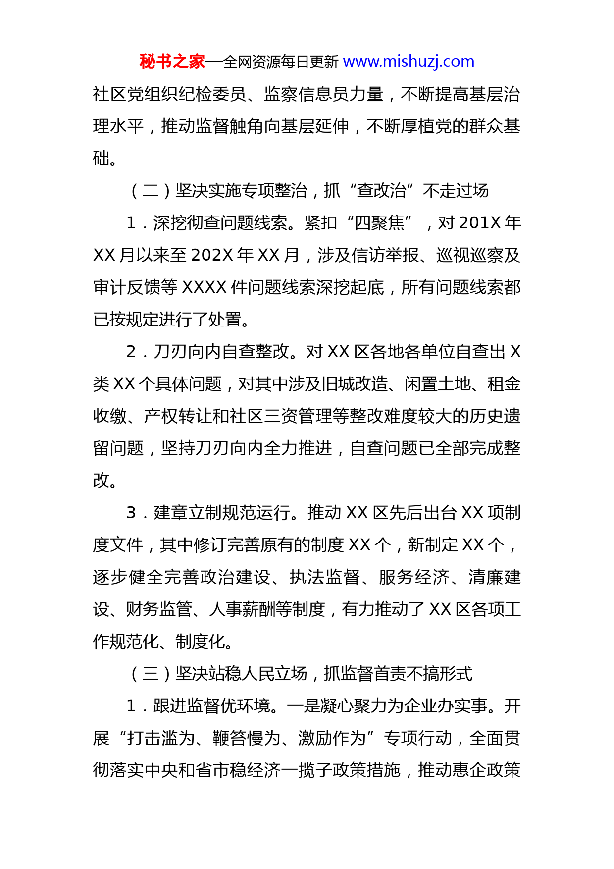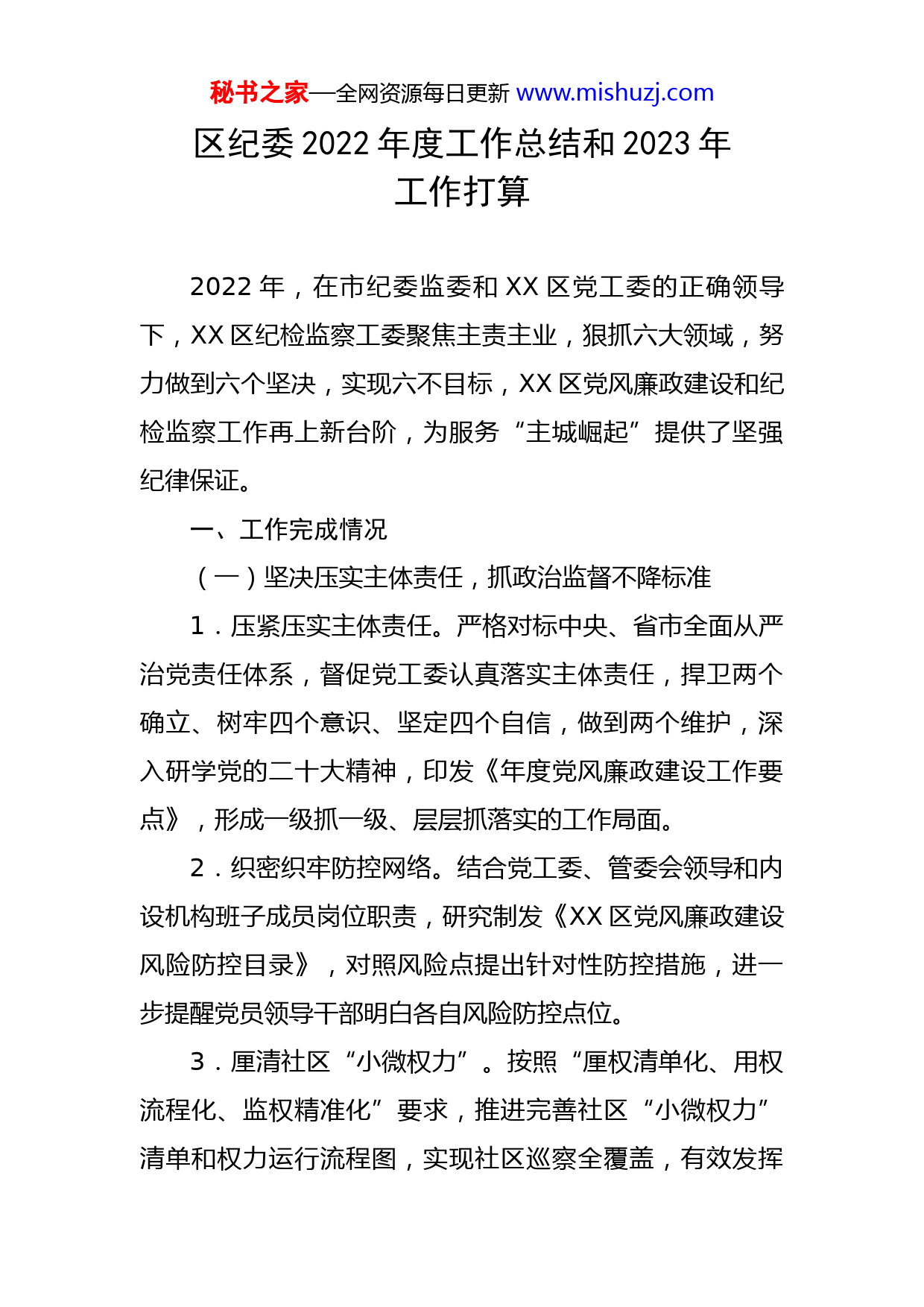 秘书之家—全网资源每日更新www.mishuzj.com区纪委2022年度工作总结和2023年工作打算2022年,在市纪委监委和XX区党工委的正确领导下,XX区纪检监察工委聚焦主责主业,狠抓六大领域,努力做到六个坚决,实现六不目标,XX区党风廉政建设和纪检监察工作再上新台阶,为服务“主城崛起”提供了坚强纪律保证。一、工作完成情况(一)坚决压实主体责任,抓政治监督不降标准1.压紧压实主体责任。严格对标中央、省市全面从严治党责任体系,督促党工委认真落实主体责任,捍卫两个确立、树牢四个意识、坚定四个自信,做到两个维护,深入研学党的二十大精神,印发《年度党风廉政建设工作要点》,形成一级抓一级、层层抓落实的工作局面。2.织密织牢防控网络。结合党工委、管委会领导和内设机构班子成员岗位职责,研究制发《XX区党风廉政建设风险防控目录》,对照风险点提出针对性防控措施,进一步提醒党员领导干部明白各自风险防控点位。3.厘清社区“小微权力”。按照“厘权清单化、用权流程化、监权精准化”要求,推进完善社区“小微权力”清单和权力运行流程图,实现社区巡察全覆盖,有效发挥秘书之家—全网资源每日更新www.mishuzj.com社区党组织纪检委员、监察信息员力量,不断提高基层治理水平,推动监督触角向基层延伸,不断厚植党的群众基础。(二)坚决实施专项整治,抓“查改治”不走过场1.深挖彻查问题线索。紧扣“四聚焦”,对201X年XX月以来至202X年XX月,涉及信访举报、巡视巡察及审计反馈等XXXX件问题线索深挖起底,所有问题线索都已按规定进行了处置。2.刀刃向内自查整改。对XX区各地各单位自查出X类XX个具体问题,对其中涉及旧城改造、闲置土地、租金收缴、产权转让和社区三资管理等整改难度较大的历史遗留问题,坚持刀刃向内全力推进,自查问题已全部完成整改。3.建章立制规范运行。推动XX区先后出台XX项制度文件,其中修订完善原有的制度XX个,新制定XX个,逐步健全完善政治建设、执法监督、服务经济、清廉建设、财务监管、人事薪酬等制度,有力推动了XX区各项工作规范化、制度化。(三)坚决站稳人民立场,抓监督首责不搞形式1.跟进监督优环境。一是凝心聚力为企业办实事。开展“打击滥为、鞭笞慢为、激励作为”专项行动,全面贯彻落实中央和省市稳经济一揽子政策措施,推动惠企政策秘书之家—全网资源每日更新www.mishuzj.com落地见效。截至目前,推动协调XX家省级以上专精特新企业获得奖补资金XXX万元,XX家工业企业、XX家商贸流通企业申报用电补贴XXX万元。二是凝心聚力为企业解难题。推动开展“下基层察民情解民忧暖民心”、“联企业送政策解难题稳主体”等活动,走访市场主体XXX家,收集企业问题XXX条,累计解决问题XXX条,帮助XX家受犯罪侵害企业挽回损失XXX万元。三是凝心聚力为企业育沃土。督促召开XX区营商环境考核评价工作部署会,认真分析XX个填报指标,督促责任单位主动与市直部门对接,确保全省营商环境考核评价排名靠前。2.协同联动治“群腐”。一是核查惠民政策落实情况。联合XX区财政局对惠农惠民政策补贴资金进行核查,对发现的问题及时交办督促整改。联合XXX社会XX管理局、XX工作部对大数据比对反馈的XX条问题进行核查,都按规定进行了处置。二是整治教育领域突出问题。对XX起反映中小学乱收费的问题线索进行调查核实,督促对辖区内XX所中小学、幼儿园周边划定食品摊贩禁售区。三是严肃查处违纪违法行为。对某社区XX名干部收取物业管理费不上集体账的问题进行严肃处理;督促XX区公安分局处置1起XX贷长期欠款不还问题;对1家民营医院反映的问题线索进行调查核实,并按规定进行处置。3.督干结合战疫情。一是常态开展监督检查。对交通秘书之家—全网资源每日更新www.mishuzj.com场站、商超宾馆、集贸市场等重点场所检查XXX余次,巡查办事处疫情防控措施落实XXX余次,全覆盖督查XX个社区,交办问题XXX余件次,均督促整改到位。二是突击驻点攻坚克难。XX月份,在第X轮疫情防控最艰难时刻,XX工委X名同志突击驻守疫情最为严重的封控区域,既当监督员又当战斗员,连续XX昼夜协助社区打好疫情攻坚战。疫情过后,主动请缨参加突击队XXX余人次支援社区全员核酸、扩面扫楼等任务。三是敏感节点专项督查。中秋国庆、二十大召开期间,联合XX办公室、XX工作部开展疫情防控、安全生产、信访维稳专项督查,发现问题XXX余个,均已督促整改,确保了重点敏感时段社会面的绝对稳定。4.驰而不息纠“四风”。一是对“四风”问题深挖彻查。对交办的“五一端午”、“中秋国庆”问题线索践行调查核实,运用“第一种形态”处理对交办问题整改不力、严管不到位的直接、分管责任人。严肃处理XX起某社区纪检委员涂某收受微信红包问题。二是对关键节点明察暗访。今年以来,对XX东站、XX分局及派出所、XX处及社区等单位,累计开展节假日明察暗访XX余次,在QQ、微信群发送廉洁信息XX余条,督促各单位及时开展节前廉洁警示教育,推动党风政风不断向上向善。三是对隐形变异纠树并举。准确把握新形势下“四风”的规律特点,盯秘书之家—全网资源每日更新www.mishuzj.com紧“四风”隐形变异,继续在常和长、严和实、深和细上下功夫,严防在方式途径上玩花样、在公款上做文章、在管理服务对象上打主意,坚持抓早抓小,防