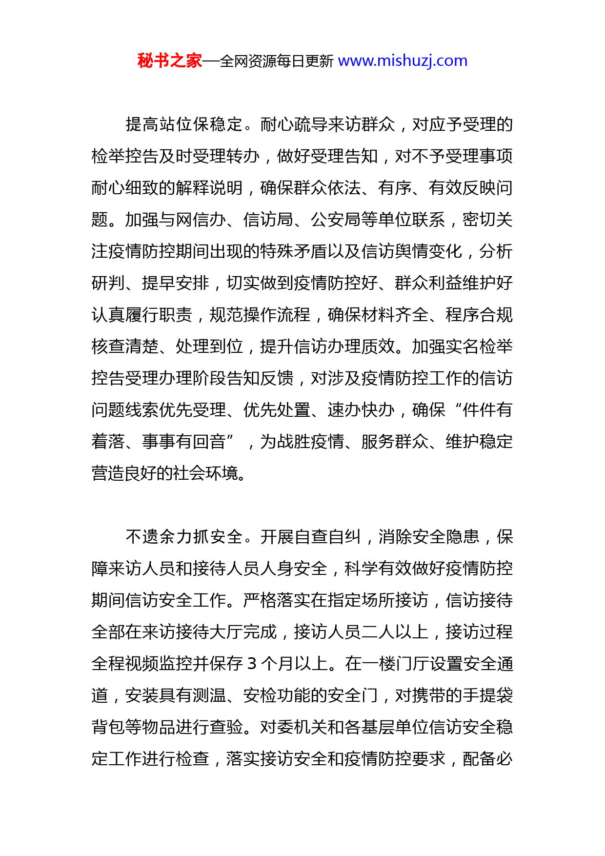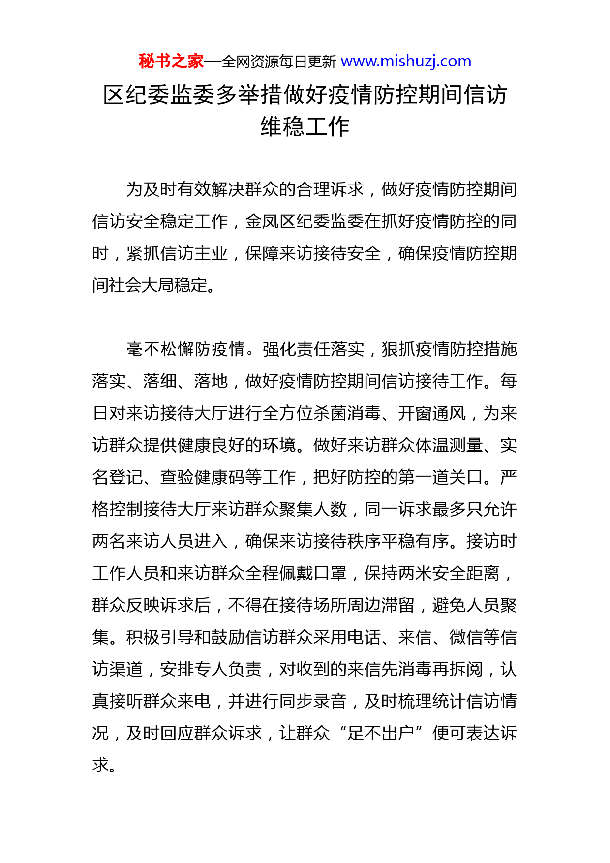 秘书之家—全网资源每日更新www.mishuzj.com区纪委监委多举措做好疫情防控期间信访维稳工作为及时有效解决群众的合理诉求,做好疫情防控期间信访安全稳定工作,金凤区纪委监委在抓好疫情防控的同时,紧抓信访主业,保障来访接待安全,确保疫情防控期间社会大局稳定。毫不松懈防疫情。强化责任落实,狠抓疫情防控措施落实、落细、落地,做好疫情防控期间信访接待工作。每日对来访接待大厅进行全方位杀菌消毒、开窗通风,为来访群众提供健康良好的环境。做好来访群众体温测量、实名登记、查验健康码等工作,把好防控的第一道关口。严格控制接待大厅来访群众聚集人数,同一诉求最多只允许两名来访人员进入,确保来访接待秩序平稳有序。接访时工作人员和来访群众全程佩戴口罩,保持两米安全距离,群众反映诉求后,不得在接待场所周边滞留,避免人员聚集。积极引导和鼓励信访群众采用电话、来信、微信等信访渠道,安排专人负责,对收到的来信先消毒再拆阅,认真接听群众来电,并进行同步录音,及时梳理统计信访情况,及时回应群众诉求,让群众“足不出户”便可表达诉求。秘书之家—全网资源每日更新www.mishuzj.com提高站位保稳定。耐心疏导来访群众,对应予受理的检举控告及时受理转办,做好受理告知,对不予受理事项耐心细致的解释说明,确保群众依法、有序、有效反映问题。加强与网信办、信访局、公安局等单位联系,密切关注疫情防控期间出现的特殊矛盾以及信访舆情变化,分析研判、提早安排,切实做到疫情防控好、群众利益维护好认真履行职责,规范操作流程,确保材料齐全、程序合规核查清楚、处理到位,提升信访办理质效。加强实名检举控告受理办理阶段告知反馈,对涉及疫情防控工作的信访问题线索优先受理、优先处置、速办快办,确保“件件有着落、事事有回音”,为战胜疫情、服务群众、维护稳定营造良好的社会环境。不遗余力抓安全。开展自查自纠,消除安全隐患,保障来访人员和接待人员人身安全,科学有效做好疫情防控期间信访安全工作。严格落实在指定场所接访,信访接待全部在来访接待大厅完成,接访人员二人以上,接访过程全程视频监控并保存3个月以上。在一楼门厅设置安全通道,安装具有测温、安检功能的安全门,对携带的手提袋背包等物品进行查验。对委机关和各基层单位信访安全稳定工作进行检查,落实接访安全和疫情防控要求,配备必秘书之家—全网资源每日更新www.mishuzj.com要的口罩、消毒液、急救药品。定期检查镇街信访安全稳定工作,结合当前疫情防控形势和工作实际提出整改意见确定来访接待工作紧急联系人,严格执行报告制度,明确各部门职责和处置流程,确保突发事件发生后快速反应、准确应对、果断处置。制定完善疫情防控预案,如来访人出现发热、咳嗽等异常情况,立即启动疫情防控预案,最大限度地减少损失和影响。