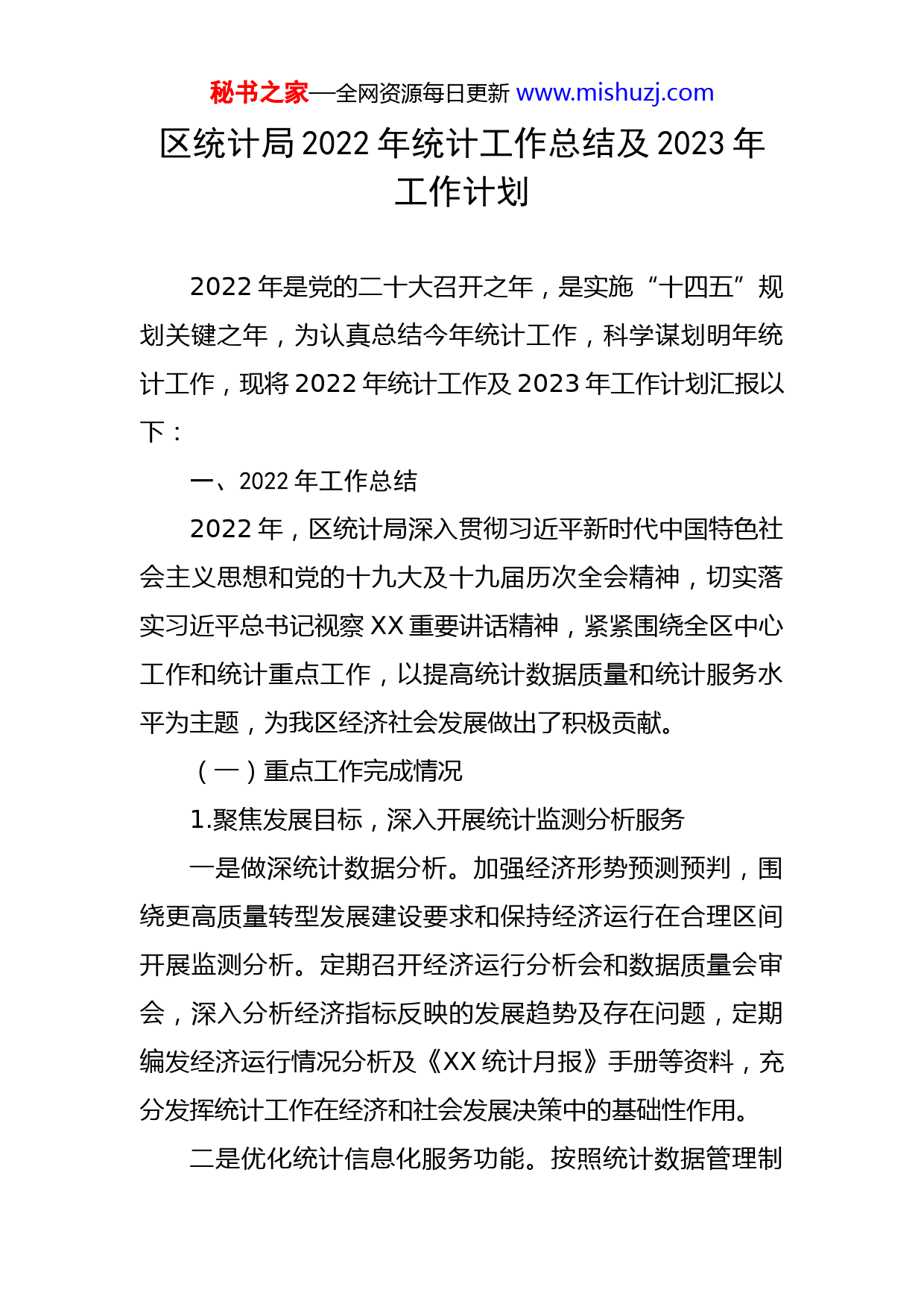 秘书之家—全网资源每日更新www.mishuzj.com区统计局2022年统计工作总结及2023年工作计划2022年是党的二十大召开之年,是实施“十四五”规划关键之年,为认真总结今年统计工作,科学谋划明年统计工作,现将2022年统计工作及2023年工作计划汇报以下:一、2022年工作总结2022年,区统计局深入贯彻习近平新时代中国特色社会主义思想和党的十九大及十九届历次全会精神,切实落实习近平总书记视察XX重要讲话精神,紧紧围绕全区中心工作和统计重点工作,以提高统计数据质量和统计服务水平为主题,为我区经济社会发展做出了积极贡献。(一)重点工作完成情况1.聚焦发展目标,深入开展统计监测分析服务一是做深统计数据分析。加强经济形势预测预判,围绕更高质量转型发展建设要求和保持经济运行在合理区间开展监测分析。定期召开经济运行分析会和数据质量会审会,深入分析经济指标反映的发展趋势及存在问题,定期编发经济运行情况分析及《XX统计月报》手册等资料,充分发挥统计工作在经济和社会发展决策中的基础性作用。二是优化统计信息化服务功能。按照统计数据管理制秘书之家—全网资源每日更新www.mishuzj.com度要求,区统计部门定期依法对外提供和发布全区经济社会统计数据。每月按季度召开新闻发布会,按年度发布《XX区国民经济和社会发展统计公报》。积极参与区“两会”有关会议材料的准备工作,为“两会”提供了有特色的统计服务。三是常态化开展统计监测预警。统筹做好一套表联网直报监测、预警、评估等工作。在网报前、网报中、网报后主动开展抽查、检查、实地查询,将辖区重点企业、新入库企业、疑似问题企业纳入统计监控重点。每月网报结束后立即组织开展实地走访,今年共走访企业321家,深入了解企业生产经营情况、存在的问题和发展规划,指导统计资料整理工作。四是扎实做好“四上企业”申报工作。通过名录库推送的企业信息进行分析研判,及时排查拟达标企业提交主管部门跟踪关注;同时深入基层做好“四上”企业摸底排查工作,及时跟进招商引资重点项目建设,确保符合标准的企业、项目按时纳入统计。加强对申报材料的质量管控,提高申报的时效性、准确性和完整性。2.夯实统计基础,提高统计质量一是全力完成联网直报工作和日常统计调查。统筹做好月报、季报、年报等日常重点工作,组织实施好工业、投资、建筑业、批零和住餐业、房地产、服务业、能源等秘书之家—全网资源每日更新www.mishuzj.com一套表联网直报工作,做好住户、人口、劳动力、科技等领域各项常规统计调查。配合上级部门完成抽查、检查、实地查询等工作,确保统计数据质量。二是稳步推进统计基层基础规范化。建立局领导班子、专业负责人联系服务基层工作制度和领导班子包保非公党建重点企业工作制度,按照规范化建设标准和要求定期对镇街、部门、企业开展科学指导和精准服务。今年通过送政策、送理论、送培训、“送统计辅导服务包”等方式及时对新入库76家企业、统计力量薄弱31家企业上门指导,开展对XX街道统计人员集中培训,进一步夯实统计基层基础。三是做好住户调查样本轮换工作。向各调查点发放宣传条幅、海报、折页、致住户的一封信等宣传物资,在XX市XX广场、XX、居民广场等地滚动播放大样本轮换宣传片。在8月26日、9月16日、10月19日分别开展了摸底阶段建筑物清查培训、摸底阶段e调查软件操作培训以及开户培训。对全区18个调查点进行了全覆盖式的走访指导、跟踪督查,确保大样本轮换摸底环节的顺利进行。3.聚焦数据质量,统计监督常态化一是统计法治规范化。常态化开展统计法律法规进党校,开办全区综合统计知识业务培训班,定期邀请市局统计业务专家授课,提升宣传质效。充分利用统计年报会、秘书之家—全网资源每日更新www.mishuzj.com专业培训会等,对统计专业人员、基层统计站和企业报表人员进行法律法规、专业知识的培训,提高统计人员职业道德和专业水平。二是落实专项纠治要求。围绕“四个必查”“三个一批”,扎实开展统计造假不收手不收敛问题专项纠治。通过督查整改、执法检查、双随机检查、入退库检查、数据质量核查、基础规范化检查等对线索进行深挖细查。今年,共执法检查17家企业,其中入退库专项执法检查1家,检查入库单位119家;退库单位81家,立案1家。三是积极开展统计法治宣传。结合“统计开放日”、国家宪法日和《统计法》颁布纪念日广泛开展统计法治宣传教育。充分利用街道和社区“法治广场”宣传阵地,营造法治文化氛围。统计局负责人通过《法治XX》栏目就统计知识与群众进行3期次的网上互动交流,精心制作法治漫画和法治动漫微视频作品参加XX省第七届“法润XX共筑美好XX”和第十八届全国法治动漫微视频作品征集活动。四是加强制度机制建设。严格落实源头统计数据审核,制订实施数据采集审核报送、统计资料管理、数据质量责任追究、统计业务岗位责任、统计工作保密、统计人员考核、统计法治宣传等制度。落实统计部门与纪检监察和组织部门的协调联动机制,建立区统计违法典型案例通秘书之家—全网资源每日更新www.mishuzj.com报机制,切实营造依法统计、依法治统的良好环境。4.以政治建设为统领,锻造高素质统计队伍一是坚持为民宗旨,凝