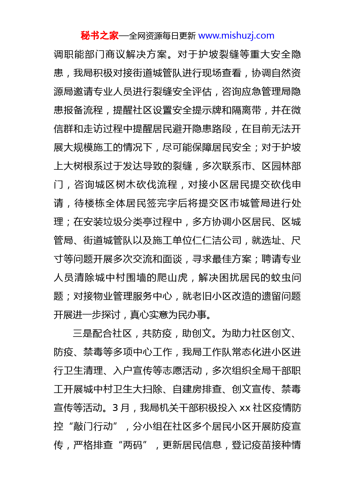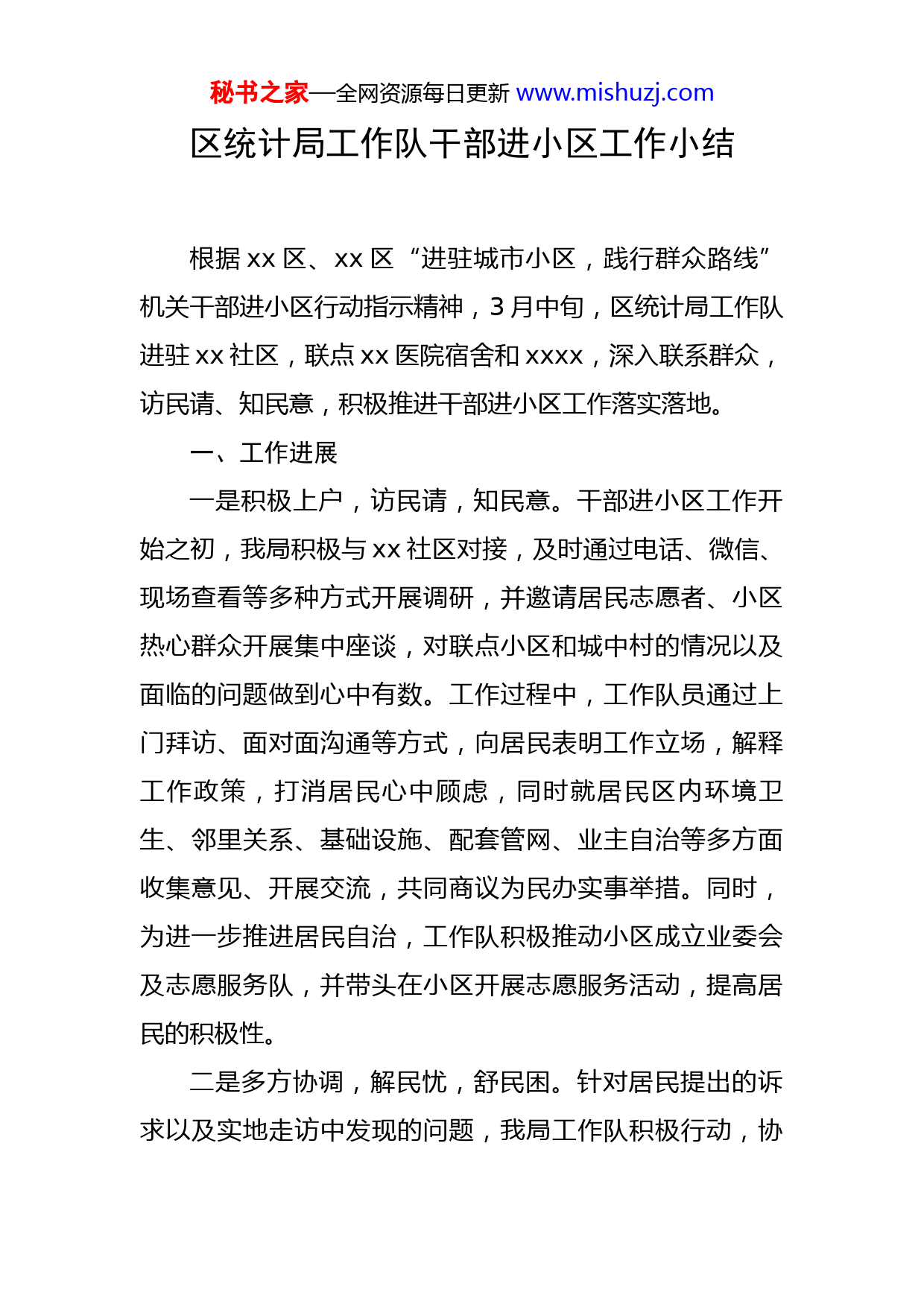 秘书之家—全网资源每日更新www.mishuzj.com区统计局工作队干部进小区工作小结根据xx区、xx区“进驻城市小区,践行群众路线”机关干部进小区行动指示精神,3月中旬,区统计局工作队进驻xx社区,联点xx医院宿舍和xxxx,深入联系群众,访民请、知民意,积极推进干部进小区工作落实落地。一、工作进展一是积极上户,访民请,知民意。干部进小区工作开始之初,我局积极与xx社区对接,及时通过电话、微信、现场查看等多种方式开展调研,并邀请居民志愿者、小区热心群众开展集中座谈,对联点小区和城中村的情况以及面临的问题做到心中有数。工作过程中,工作队员通过上门拜访、面对面沟通等方式,向居民表明工作立场,解释工作政策,打消居民心中顾虑,同时就居民区内环境卫生、邻里关系、基础设施、配套管网、业主自治等多方面收集意见、开展交流,共同商议为民办实事举措。同时,为进一步推进居民自治,工作队积极推动小区成立业委会及志愿服务队,并带头在小区开展志愿服务活动,提高居民的积极性。二是多方协调,解民忧,舒民困。针对居民提出的诉求以及实地走访中发现的问题,我局工作队积极行动,协秘书之家—全网资源每日更新www.mishuzj.com调职能部门商议解决方案。对于护坡裂缝等重大安全隐患,我局积极对接街道城管队进行现场查看,协调自然资源局邀请专业人员进行裂缝安全评估,咨询应急管理局隐患报备流程,提醒社区设置安全提示牌和隔离带,并在微信群和走访过程中提醒居民避开隐患路段,在目前无法开展大规模施工的情况下,尽可能保障居民安全;对于护坡上大树根系过于发达导致的裂缝,多次联系市、区园林部门,咨询城区树木砍伐流程,对接小区居民提交砍伐申请,待楼栋全体居民签完字后将提交区市城管局进行处理;在安装垃圾分类亭过程中,多方协调小区居民、区城管局、街道城管队以及施工单位仁仁洁公司,就选址、尺寸等问题开展多次交流和面谈,寻求最佳方案;聘请专业人员清除城中村围墙的爬山虎,解决困扰居民的蚊虫问题;对接物业管理服务中心,就老旧小区改造的遗留问题开展进一步探讨,真心实意为民办事。三是配合社区,共防疫,助创文。为助力社区创文、防疫、禁毒等多项中心工作,我局工作队常态化进小区进行卫生清理、入户宣传等志愿活动,多次组织全局干部职工开展城中村卫生大扫除、自建房排查、创文宣传、禁毒宣传等活动。3月,我局机关干部积极投入xx社区疫情防控“敲门行动”,分小组在社区多个居民小区开展防疫宣传,严格排查“两码”,更新居民信息,登记疫苗接种情秘书之家—全网资源每日更新www.mishuzj.com况,助力疫情防控落到实处;6月,我局联合金融办和xx社区开展“文明创建我来了,幸福xx我来建”志愿活动,组织40余名小区志愿者参加文明创建志愿宣誓仪式,认领志愿服务岗位,领取志愿者证书,并积极参加志愿活动,为共创幸福小区打下良好的基础;在8月份的创文迎检中,我局工作队员全程全天候协助社区开展工作,逐一对照创文要求认真落实,积极宣传xx创建文明城市成果,清理城中村卫生死角,清除小区楼道牛皮鲜,处理楼道堆砌杂物问题等,得到居民的广泛认同和好评。同时,在创文过程中,我局积极支持党建联点单位xx社区相关工作,进一步推动机关干部进小区深入落实。二、经费使用情况上半年,我局工作队以开展志愿活动和日常走访为主,辅之为居民解决部分小麻烦、为小区志愿者送去节日慰问等,目前已使用经费约4000元。三、存在问题一是开展群众工作经验不足,距离不够近。目前工作队员开展走访形式比较单一,一定程度上存在听指令办事的现象,与居民谈心沟通不深入,很多时候入户走访还带着宣传、排查等相关任务,居民对工作队员还保有一定的距离感。二是自身工作职能与群众诉求无关联,解决问题成果秘书之家—全网资源每日更新www.mishuzj.com有限。老旧小区和城中村存在的问题多为历史遗留问题,居民部分诉求涉及面广、工程量大,街道和社区很长时间也无法解决,工作队虽然开展了大量协调工作,但自身没有相关职能,工作进展不够明显。四、下步打算一是针对居民合理生活诉求继续推进沟通协调。以防患安全隐患为重点,以提升居民幸福感为目标,多管齐下制定问题解决方案。一方面,抓住全区性大行动契机,为联点小区争取机会,尽可能解决部分基础设施不足的问题;另一方面,积极推进居民自治,充分发挥工作队、业主委员会、城中村志愿队等队伍的主观能动性,发动更多居民参与进来,营造共管共治的良好氛围。二是带头开展志愿活动,激发群众积极性和自主性。以业主委员会和居民志愿队为基础,联合社区发动志愿活动,积极带动热心群众投入志愿服务,尽力解决居民急难愁盼的问题,提升小区凝聚力,共创幸福居住环境。三是不断提升工作队员的工作能力和素质。通过多请教、多磨炼、多实践、多参与的方式,积极学习其他工作队的工作方式,向社区工作者多请教,与群众多交谈,与职能部门多沟通,多进行深入思考,不断积累工作经验,提升工作能力,创新工作方法,密切党群关系,切实发挥好“进驻城市小区,践行群众路线”的积极作用。
