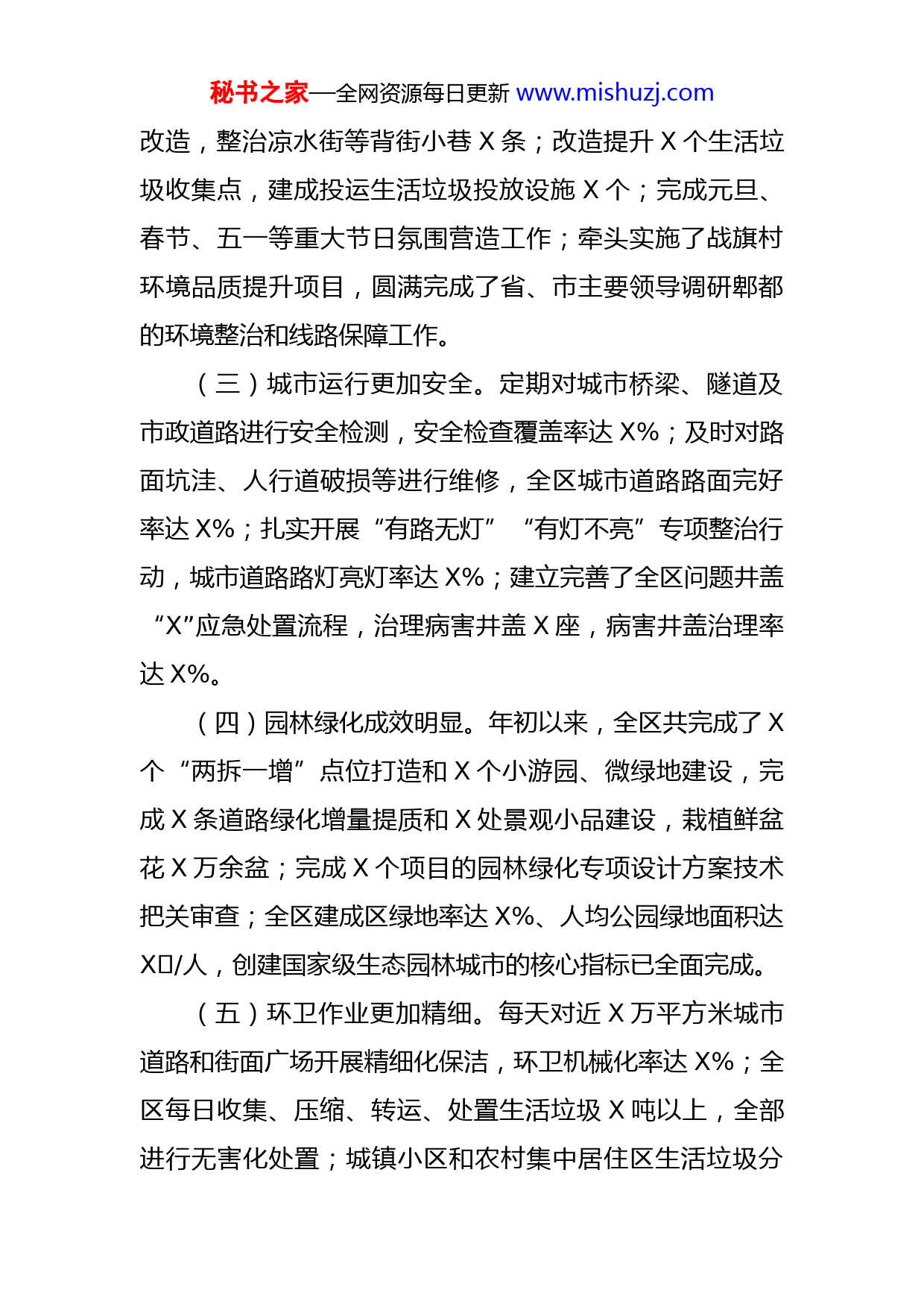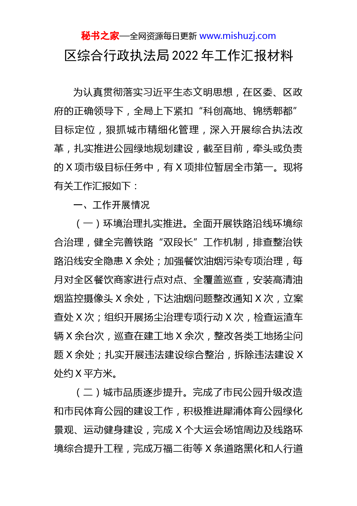 秘书之家—全网资源每日更新www.mishuzj.com区综合行政执法局2022年工作汇报材料为认真贯彻落实习近平生态文明思想,在区委、区政府的正确领导下,全局上下紧扣“科创高地、锦绣郫都”目标定位,狠抓城市精细化管理,深入开展综合执法改革,扎实推进公园绿地规划建设,截至目前,牵头或负责的X项市级目标任务中,有X项排位暂居全市第一。现将有关工作汇报如下:一、工作开展情况(一)环境治理扎实推进。全面开展铁路沿线环境综合治理,健全完善铁路“双段长”工作机制,排查整治铁路沿线安全隐患X余处;加强餐饮油烟污染专项治理,每月对全区餐饮商家进行点对点、全覆盖巡查,安装高清油烟监控摄像头X余处,下达油烟问题整改通知X次,立案查处X次;组织开展扬尘治理专项行动X次,检查运渣车辆X余台次,巡查在建工地X余次,整改各类工地扬尘问题X余处;扎实开展违法建设综合整治,拆除违法建设X处约X平方米。(二)城市品质逐步提升。完成了市民公园升级改造和市民体育公园的建设工作,积极推进犀浦体育公园绿化景观、运动健身建设,完成X个大运会场馆周边及线路环境综合提升工程,完成万福二街等X条道路黑化和人行道秘书之家—全网资源每日更新www.mishuzj.com改造,整治凉水街等背街小巷X条;改造提升X个生活垃圾收集点,建成投运生活垃圾投放设施X个;完成元旦、春节、五一等重大节日氛围营造工作;牵头实施了战旗村环境品质提升项目,圆满完成了省、市主要领导调研郫都的环境整治和线路保障工作。(三)城市运行更加安全。定期对城市桥梁、隧道及市政道路进行安全检测,安全检查覆盖率达X%;及时对路面坑洼、人行道破损等进行维修,全区城市道路路面完好率达X%;扎实开展“有路无灯”“有灯不亮”专项整治行动,城市道路路灯亮灯率达X%;建立完善了全区问题井盖“X”应急处置流程,治理病害井盖X座,病害井盖治理率达X%。(四)园林绿化成效明显。年初以来,全区共完成了X个“两拆一增”点位打造和X个小游园、微绿地建设,完成X条道路绿化增量提质和X处景观小品建设,栽植鲜盆花X万余盆;完成X个项目的园林绿化专项设计方案技术把关审查;全区建成区绿地率达X%、人均公园绿地面积达X㎡/人,创建国家级生态园林城市的核心指标已全面完成。(五)环卫作业更加精细。每天对近X万平方米城市道路和街面广场开展精细化保洁,环卫机械化率达X%;全区每日收集、压缩、转运、处置生活垃圾X吨以上,全部进行无害化处置;城镇小区和农村集中居住区生活垃圾分秘书之家—全网资源每日更新www.mishuzj.com类覆盖率达X%以上,生活垃圾资源化回收利用率达X%,高出全市平均水平X个百分点。(六)沙石收储规范高效。采取“人防+技防”监管模式,对全区各类工地和X台运渣车进行全在线、全覆盖、全时段台账式管理,坚决打击偷采盗挖沙石的违法行为。今年以来,全区未发生一例盗采偷运建筑工地沙石资源事件,已收储沙石约X万立方米,为区财政增收X亿元以上。二、特色亮点工作情况(一)遵循生态文明理念,努力构建全区“二环三廊五片多点”的绿化体系。以创建国家级生态园林城市为工作抓手,坚持“公园增量、蓝绿成网、空间提质、多维筑绿”构建路径,依托我区水网密布、渠系发达、植被充分的生态优势,努力构建我区二环、三廊、五片、多点的绿地总面积达X万余亩的全域园林绿化体系。今年以来,紧紧围绕当前区委、区政府中心工作,先期启动科创新城东西向清水河生态走廊和南北向红星支渠走廊两大绿色生态走廊的打造工作,将菁蓉湖国际科幻公园、清水河公园、望丛湖公园、商周遗址公园、桤木河公园和川派盆景公园等X大公园串联成片,努力打造总规模达X余亩,生态本底良好,植物景观优美、消费场景丰富,彰显郫都历史文化,充分体现习近平生态文明思想的公园城市示范区。秘书之家—全网资源每日更新www.mishuzj.com(二)组建专班强力推进,全面启动“百个公园”X版建设工作。按照市委市政府关于“在全市建设百个公园X版”的安排部署,全面开展我区公园建设攻坚行动。一是大力推进清水河科创新城片区生态修复、菁蓉湖世界科幻公园等X个市、区重大项目尽快进场动工建设;二是组建X个工作专班,具体负责项目推进工作,推行“挂图作战+一线工作”法,采用“每天报告进度,每周调度安排,每月考核通报”,全力推进项目落地落实;三是全力做好重点项目从策划包装到建成投运全过程、全要素服务保障,统筹协调、及时解决项目规划建设各环节各节点存在的问题和困难。(三)化解基础治理难题,综合执法体制改革成效初显。由于有效解决了基层普遍存在的“九龙治水”和“看得见的管不了,管得了的看不见”等治理难题,全区案件办理数量、质量和效率均明显上升。年初以来,先后开展燃气安全、餐饮油烟、扬尘治理、教育“双减”等X次专项执法行动,立案查处X起,办案量较X年同比增长X%。我区综合执法改革经验得到了省委编办、省司法厅充分肯定,目前,正以我区的改革模式为蓝本,制定我省区(市)县综合行政执法体制改革方案。三、下半年工作打算(一)勇于担当作为,强力推进重大项目尽快动工建秘书之家—全网资源每日更新www.mishuzj.com设。一是菁蓉湖世界科幻公园项目。目前,该项目已完成方案设计、用地拆迁、场地平整等工作,预计在X年X月前动