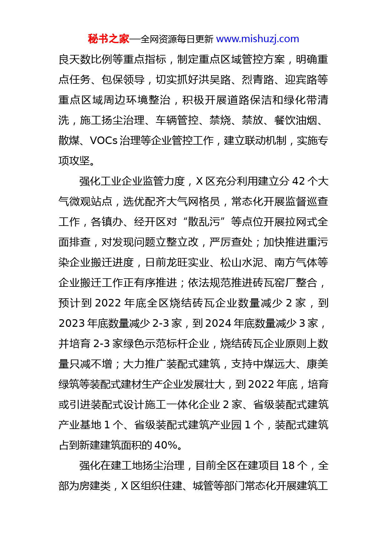 秘书之家—全网资源每日更新www.mishuzj.com区近期大气污染防治工作情况汇报一、X区大气污染防治总体情况2022年以来,X区紧紧大气质量的总体目标,创新工作思路,细化任务举措,各职能部门认真履职尽责,齐抓共管,合力推动突出环境问题整改,全力以赴打好蓝天保卫战;狠抓重点行业减排,强化工业污染治理,集中整治大气、扬尘、燃煤、餐饮油烟、秸秆焚烧等污染问题;发挥“环境监督长制”优势,完善监管“最后一公里”。但是,由于受到天气、产业结构等因素共同影响,今年以来我区大气污染防治形势较为严峻,工作任务艰巨。二、工作开展情况(一)强化领导,迅速行动。近期,区政府主要领导和分管领导高频调度,进一步提高思想认识,强化职能部门密切协作。开展大气污染防治暨治超夜查行动;加大在建工地、工业企业及重点路段的大气污染防治治理力度;对全区重点涉气企业实施“一企一策”,确保污染物达标排放,明确企业能耗和氮氧化物、二氧化硫、烟尘排放量下降指标;积极推动企业落实技改措施,进一步推动企业降低能耗、减少排放。(二)专项工作开展情况强化重点区域精准管控。X区紧盯PM2.5、PM10、优秘书之家—全网资源每日更新www.mishuzj.com良天数比例等重点指标,制定重点区域管控方案,明确重点任务、包保领导,切实抓好洪吴路、烈青路、迎宾路等重点区域周边环境整治,积极开展道路保洁和绿化带清洗,施工扬尘治理、车辆管控、禁烧、禁放、餐饮油烟、散煤、VOCs治理等企业管控工作,建立联动机制,实施专项攻坚。强化工业企业监管力度,X区充分利用建立分42个大气微观站点,选优配齐大气网格员,常态化开展监督巡查工作,各镇办、经开区对“散乱污”等点位开展拉网式全面排查,对发现问题立整立改,严厉查处;加快推进重污染企业搬迁进度,日前龙旺实业、松山水泥、南方气体等企业搬迁工作正有序推进;依法规范推进砖瓦窑厂整合,预计到2022年底全区烧结砖瓦企业数量减少2家,到2023年底数量减少2-3家,到2024年底数量减少3家,并培育2-3家绿色示范标杆企业,烧结砖瓦企业原则上数量只减不增;大力推广装配式建筑,支持中煤远大、康美绿筑等装配式建材生产企业发展壮大,到2022年底,培育或引进装配式设计施工一体化企业2家、省级装配式建筑产业基地1个、省级装配式建筑产业园1个,装配式建筑占到新建建筑面积的40%。强化在建工地扬尘治理,目前全区在建项目18个,全部为房建类,X区组织住建、城管等部门常态化开展建筑工秘书之家—全网资源每日更新www.mishuzj.com地扬尘治理巡查工作,持续开展规划区内建筑工地施工现场标准化管理及建筑垃圾(渣土)专项治理行动。特别是对国控点周边的建筑工地强化管理。2022年以来,约谈违规在建工地1次(三五山山体治理工程),下达责改1份,查处抛洒和扬尘车辆23辆,处罚罚金约1.2万余元;加大对工地扬尘易发点如物料堆、渣土堆等的管理力度,设置防尘网或防尘布,进行喷淋、固化处理。强化道路扬尘治理,区城管等部门持续开展道路扬尘集中整治夜查,针对国控点周边工地检查落实环保相关措施;区城管局增加道路湿扫频次,对烈青路、洪吴路、迎宾路等重点路段开展集中整治专项行动:加大道路保洁清洗力度。区住建局对路牙石、道路绿化带进行高压冲洗,实施烈青路等道路大修,修建更换绿化带苗木。X镇杨庄办镇在道路周边推进人居环境治理工作,清理杂物垃圾350余m³,城区主要道路的扬尘情况已得到基本根治。强化部门协同配合,X区政府牵头组织区住建、城管、生态环境及各镇办开展联合执法行动,加大环境违法行为打击力度;开展大气污染防治专项行动,严查各类渣土道路运输违法行为;严格落实省市关于禁燃、禁放相关要求。三、下一步工作计划一是扛起生态文明建设的政治责任,坚决把思想和行秘书之家—全网资源每日更新www.mishuzj.com动统一到中央、省、市决策部署和工作要求上来,以“五控”措施和“三化”管理为抓手,紧盯环保领域出现的新变化新问题,严格落实相关单位和个人的责任,及时跟进相应的对策措施,努力提升全区大气质量。二是紧扣空气优良天数、量化考核结果和PM2.5浓度“两升一降”两个关键指标,细化大气污染防治攻势行动方案,持续加强工业企业、秸秆禁烧、工地道路扬尘、餐饮油烟等专项治理。科学制定道路交通运输绕行方案,对国控点周边一公里范围内所管辖的主干道、辅路、人行道、背街小巷实施湿扫作业,白天6:00-18:00期间,除去上下班高峰时段,每小时洒水一次,其余时段每两小时洒水一次,同时做好随时启动三公里范围内的作业准备。发挥大气围观站点的作用,调动基层环境监督员、大气网格员的工作积极性,积极进行巡查和自查事件上报工作,力争将问题解决在萌芽状态。三是进一步强化企业管理。要求企业按照环保要求,落实各项排放标准,鼓励企业进行减排降排的技术升级改造。严格要求企业落实大气污染防治预警。对检查抽查中发现预警预案不响应、发现提出问题不整改的企业,将严肃进行处理。四是强化部门协作,进一步压实责任,全区上下将大气污染防治工作作为当前工作的重中之重,将责任夯实到秘书之家—全网资源每日更新www.mishuzj.com位,统筹协调处理大气污染防治问题,加大执法力度,采取查看现场、明察暗访和随机抽查等方式进行环保督
