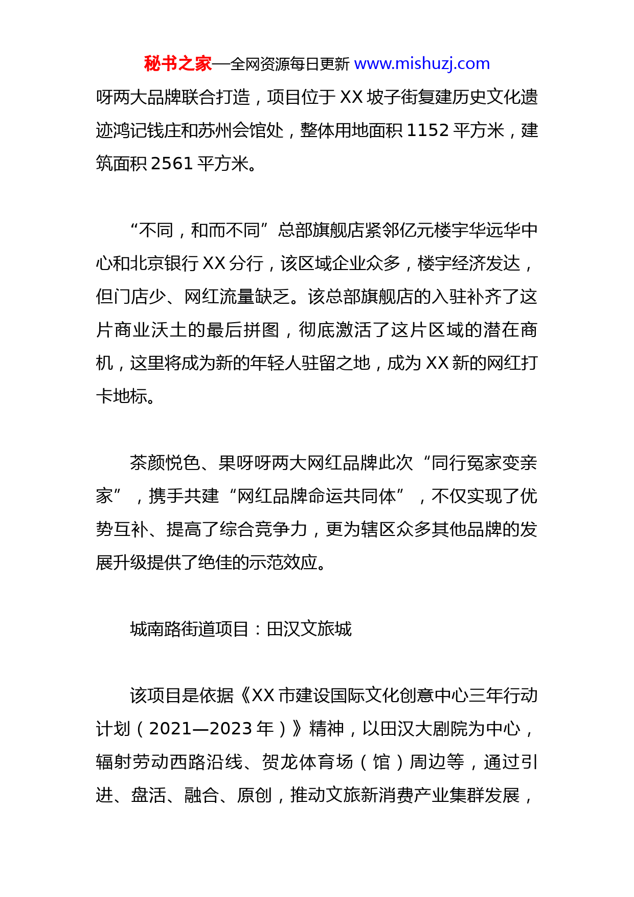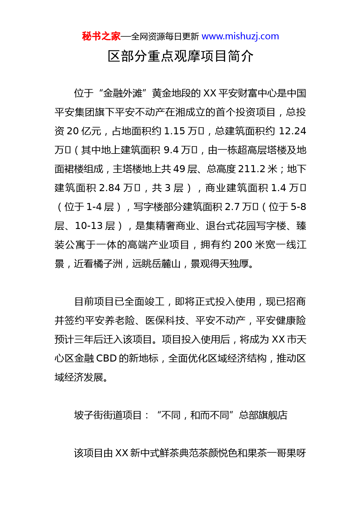 秘书之家—全网资源每日更新www.mishuzj.com区部分重点观摩项目简介位于“金融外滩”黄金地段的XX平安财富中心是中国平安集团旗下平安不动产在湘成立的首个投资项目,总投资20亿元,占地面积约1.15万㎡,总建筑面积约12.24万㎡(其中地上建筑面积9.4万㎡,由一栋超高层塔楼及地面裙楼组成,主塔楼地上共49层、总高度211.2米;地下建筑面积2.84万㎡,共3层),商业建筑面积1.4万㎡(位于1-4层),写字楼部分建筑面积2.7万㎡(位于5-8层、10-13层),是集精奢商业、退台式花园写字楼、臻装公寓于一体的高端产业项目,拥有约200米宽一线江景,近看橘子洲,远眺岳麓山,景观得天独厚。目前项目已全面竣工,即将正式投入使用,现已招商并签约平安养老险、医保科技、平安不动产,平安健康险预计三年后迁入该项目。项目投入使用后,将成为XX市天心区金融CBD的新地标,全面优化区域经济结构,推动区域经济发展。坡子街街道项目:“不同,和而不同”总部旗舰店该项目由XX新中式鲜茶典范茶颜悦色和果茶一哥果呀秘书之家—全网资源每日更新www.mishuzj.com呀两大品牌联合打造,项目位于XX坡子街复建历史文化遗迹鸿记钱庄和苏州会馆处,整体用地面积1152平方米,建筑面积2561平方米。“不同,和而不同”总部旗舰店紧邻亿元楼宇华远华中心和北京银行XX分行,该区域企业众多,楼宇经济发达,但门店少、网红流量缺乏。该总部旗舰店的入驻补齐了这片商业沃土的最后拼图,彻底激活了这片区域的潜在商机,这里将成为新的年轻人驻留之地,成为XX新的网红打卡地标。茶颜悦色、果呀呀两大网红品牌此次“同行冤家变亲家”,携手共建“网红品牌命运共同体”,不仅实现了优势互补、提高了综合竞争力,更为辖区众多其他品牌的发展升级提供了绝佳的示范效应。城南路街道项目:田汉文旅城该项目是依据《XX市建设国际文化创意中心三年行动计划(2021—2023年)》精神,以田汉大剧院为中心,辐射劳动西路沿线、贺龙体育场(馆)周边等,通过引进、盘活、融合、原创,推动文旅新消费产业集群发展,秘书之家—全网资源每日更新www.mishuzj.com重构侯家塘商圈,全新打造的文旅超级新IP暨文产新业态街区项目。项目以盘活资源为重点,以培育文旅全产业为核心,辖区内盘活有最大的KTV星辰汇城市客厅,经营面积1万平方米,投资5200万元;最大的游泳馆康之泉活水馆,经营面积10000平方米,投资5000万元;最大的啤酒超市LIGHT,经营面积1000平方米,投资800余万元。项目周边楼宇林立,金融、文化产业集聚,有渤海银行XX分行、中信证券湖南分公司、中广天择传媒等重点金融文化企业,嘉盛国际广场、恒力卡瑞尔等重点商务楼宇。叮叮mall、先导童心mall、湖南国美电器等商场名店云集,尽显现代都市繁华。2021年完成投资2.5亿元、盘活资产6万余平方米、实现税收2000余万元。“全域全链消费”格局初步成型,田汉文旅城已成为新时期高端消费和商务服务业的核心地带。项目未来将打造以田汉大剧院为龙头的音乐剧街区,塑造“看剧劳动西”品牌。以叮叮mall为中心连通田汉地下商业街经济带,构建“食、游、购、娱、体、展、演”等一体的沉浸式消费新业态圈,实现人流量同比上升30%。秘书之家—全网资源每日更新www.mishuzj.com赤岭路街道项目:芙蓉南路社区公共党群服务中心芙蓉南路社区占地0.83平方公里,共有居民17100余人,社区服务阵地面积1200平方米,现有社区工作人员14人。社区党委下设14个党支部,现有直管党员616人。社区以“党建聚合力”工程为抓手,积极推行党建引领“四民工作法”,按照“1+N+Y”网格管理模式,党员定期上门收集居民群众诉求,在网格治理中用好“收件箱”倾听民声,在共建共治中造好“会商室”议好民事,在管理服务中做好“任务书”解决民忧,在和谐共享中建好“幸福云”凝聚民心,因时、因事、因地制宜,走出了符合基层实际的党建路子。文源街道项目:梅岭村外服厂老旧小区提质改造该项目是铁道学院及周边提质改造第三期,列入了中南大学“为民办实事”活动清单,由铁道学院梅岭村、外服厂两部分构成,涉及房屋25栋692户,投资726万元。秘书之家—全网资源每日更新www.mishuzj.com项目实施中,文源街道坚持拆违先行,成立四方联动攻坚行动组,成功拆除违章,涌现了周爱和等宣讲拆违政策、带头清理楼道等先进典型;坚持街校联动,改造前联合上门入户,设计方案联合征求意见,改造中联合破解难题;坚持问题导向,解决了停车、屋顶墙面渗漏、地面破烂泥泞、地下自来水管老化等问题,并推动了电梯加装。金盆岭街道项目:湖南长株潭跨境电商综合服务中心湖南长株潭跨境电商综合服务中心注册成立于2021年12月,是在天心区政府、天心区商务局、金盆岭街道引导下,由专业跨境电商平台机构运营的长株潭跨境电商企业和产业聚集中心,是贯彻落实“三高四新”战略定位和使命任务、加快推进长株潭产业一体化的重点项目。2021年,金盆岭街道立足于天心区地处长株潭融城核心区的区位优势,以及辖区的楼宇优势、贸易企业聚集优势、电商平台优势,在两个月内,创新谋划、建设了“湖南长株潭跨境电商综合服务中心”。中心依托辖区重点商务楼宇资源,围绕打造内外电子商务贸易综合服务生态这一目标建设布局,预计三至五年将吸引100家大中型跨境秘书之家—全网资源每日更新www.mishuzj.com电商企业入