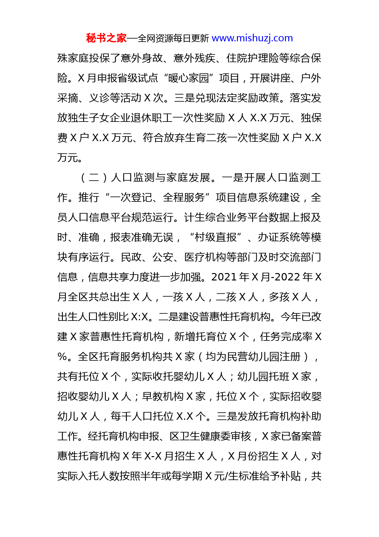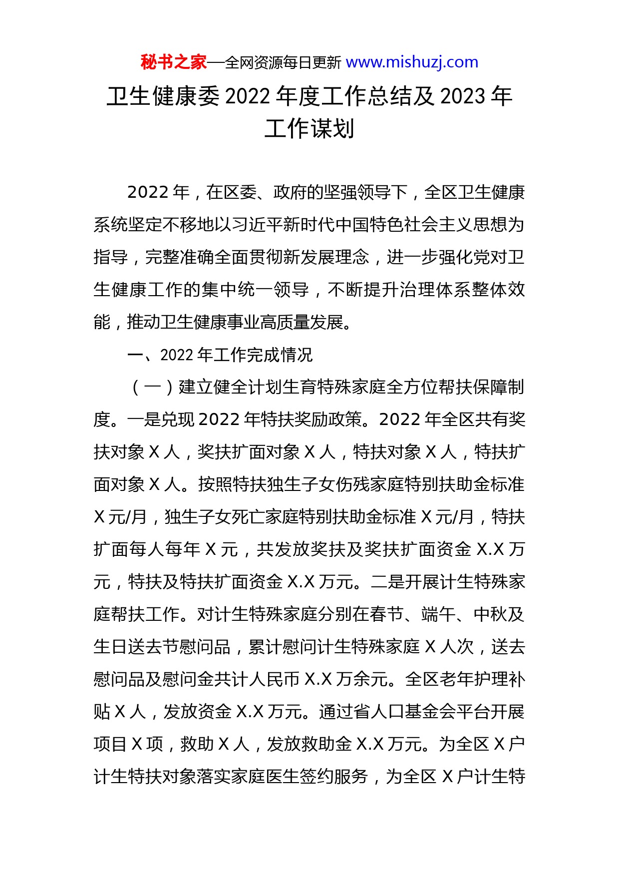 秘书之家—全网资源每日更新www.mishuzj.com卫生健康委2022年度工作总结及2023年工作谋划2022年,在区委、政府的坚强领导下,全区卫生健康系统坚定不移地以习近平新时代中国特色社会主义思想为指导,完整准确全面贯彻新发展理念,进一步强化党对卫生健康工作的集中统一领导,不断提升治理体系整体效能,推动卫生健康事业高质量发展。一、2022年工作完成情况(一)建立健全计划生育特殊家庭全方位帮扶保障制度。一是兑现2022年特扶奖励政策。2022年全区共有奖扶对象X人,奖扶扩面对象X人,特扶对象X人,特扶扩面对象X人。按照特扶独生子女伤残家庭特别扶助金标准X元/月,独生子女死亡家庭特别扶助金标准X元/月,特扶扩面每人每年X元,共发放奖扶及奖扶扩面资金X.X万元,特扶及特扶扩面资金X.X万元。二是开展计生特殊家庭帮扶工作。对计生特殊家庭分别在春节、端午、中秋及生日送去节慰问品,累计慰问计生特殊家庭X人次,送去慰问品及慰问金共计人民币X.X万余元。全区老年护理补贴X人,发放资金X.X万元。通过省人口基金会平台开展项目X项,救助X人,发放救助金X.X万元。为全区X户计生特扶对象落实家庭医生签约服务,为全区X户计生特秘书之家—全网资源每日更新www.mishuzj.com殊家庭投保了意外身故、意外残疾、住院护理险等综合保险。X月申报省级试点“暖心家园”项目,开展讲座、户外采摘、义诊等活动X次。三是兑现法定奖励政策。落实发放独生子女企业退休职工一次性奖励X人X.X万元、独保费X户X.X万元、符合放弃生育二孩一次性奖励X户X.X万元。(二)人口监测与家庭发展。一是开展人口监测工作。推行“一次登记、全程服务”项目信息系统建设,全员人口信息平台规范运行。计生综合业务平台数据上报及时、准确,报表准确无误,“村级直报”、办证系统等模块有序运行。民政、公安、医疗机构等部门及时交流部门信息,信息共享力度进一步加强。2021年X月-2022年X月全区共总出生X人,一孩X人,二孩X人,多孩X人,出生人口性别比X:X。二是建设普惠性托育机构。今年已改建X家普惠性托育机构,新增托育位X个,任务完成率X%。全区托育服务机构共X家(均为民营幼儿园注册),共有托位X个,实际收托婴幼儿X人;幼儿园托班X家,招收婴幼儿X人;早教机构X家,托位X个,实际招收婴幼儿X人,每千人口托位X.X个。三是发放托育机构补助工作。经托育机构申报、区卫生健康委审核,X家已备案普惠性托育机构X年X-X月招生X人,X月份招生X人,对实际入托人数按照半年或每学期X元/生标准给予补贴,共秘书之家—全网资源每日更新www.mishuzj.com计发放托育机构补助XX元。四是举办保育员培训。为提高安心托育“暖民心行动”服务水平,切实加强我区保育员人才队伍建设,区卫生健康委联合教育局、人社局委托黄山求是职业培训学校举办了2022年首期保育员培训班,托幼(育)机构、早教中心X名从业人员参加培训,均通过职业技能等级认定考核取得保育员职业技能等级证书(五级)。五是加强托育机构监管。区卫生健康委联合区公安分局、市场监管局、消防大队、疾控中心、妇计中心、卫生监督对托育机构开展集中督查,各职能部门根据各自职责做好日常监管、业务指导及疫情防控指导。托育机构年内未发生安全生产、疫情防控等事件。六是全面推开村(居)民委员会下设公共卫生委员会工作。根据市卫生健康委、市民政局、市农业农村局、市计生协、市爱卫办《关于全面推开村(居)民委员会下设公共卫生委员会工作的通知》(X函〔2021〕98号)文件要求,2022年X区X个村(社区)均已完成公共卫生委员会建设,截至目前已开展疫情防控宣传、爱国卫生运动、入户核酸检测、家庭医生签约、孕优保健宣传等活动X次。(三)扎实推进老龄工作。一是加快老年医疗服务体系建设。市三院已完成老年医学科建设,全区二级及以上综合医院(中医院)设立老年医学科比例达到X%。组织X名老年医学科医护人员参加全国老年医学人才培训项目的秘书之家—全网资源每日更新www.mishuzj.com学习,为更好地落实和推进老年健康政策,促进健康老龄化打好基础。二是积极推进老年友善医疗机构创建工作。全区X%的综合性医院和基层医疗卫生机构全面开展老年友善医疗机构创建,力争X月底前全部达到验收标准。三是实施优质医养结合示范单位创建工作。X区争创优质医养结合示范区,市三院争创优质医养结合示范机构,潜口镇中心卫生院争创优质医养结合示范中心,近期省医养结合抽查评估组将对我区申报单位进行实地评估。四是深入实施“智慧助老”行动。积极开展“智慧助老”进社区活动,积极向省推荐典型案例。组织实施医疗机构老年人门诊就医便民服务民生工程,2022年全区共招募聘用志愿者X人,其中市三院聘用X名志愿服务人员,新晨医院聘用X名志愿服务人员,1-10月共提供志愿服务X人次,其中服务老年人X人次。五是积极推进银龄安康行动。2022年市下达我区安康险目标任务X人,截至目前为止,我区共承保银龄安康人数X人,保费X万元,承保覆盖率达X%。理赔人数X人,理赔金额X万。为我区完善老年人社会保障渠道,提高老年人及其家庭抗风险能力,构建和谐社会作出了积极的贡献。六是广泛开展打击整治养老诈骗专项行动。区卫生健康委组织各乡镇、社区办、各医疗卫生机构利用门口电子显示屏循环播放防养老诈
