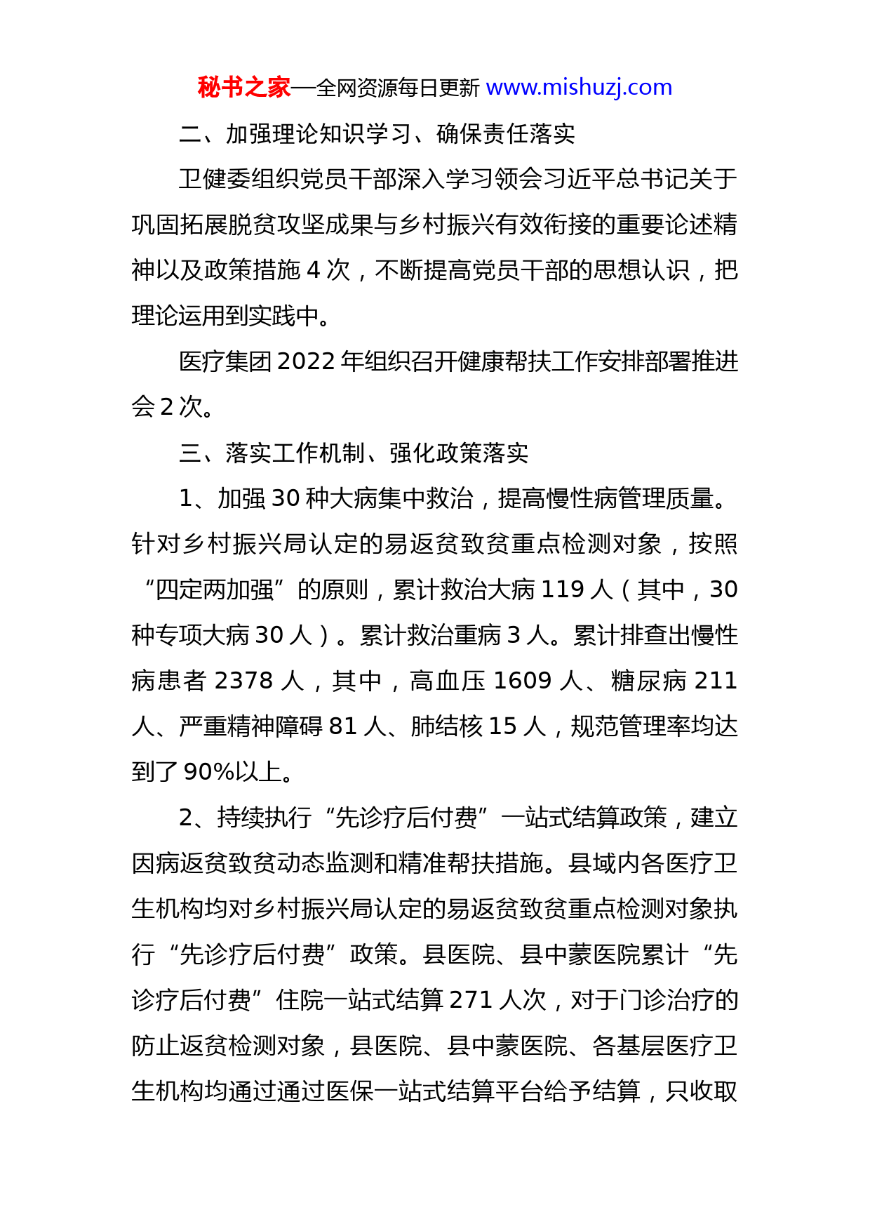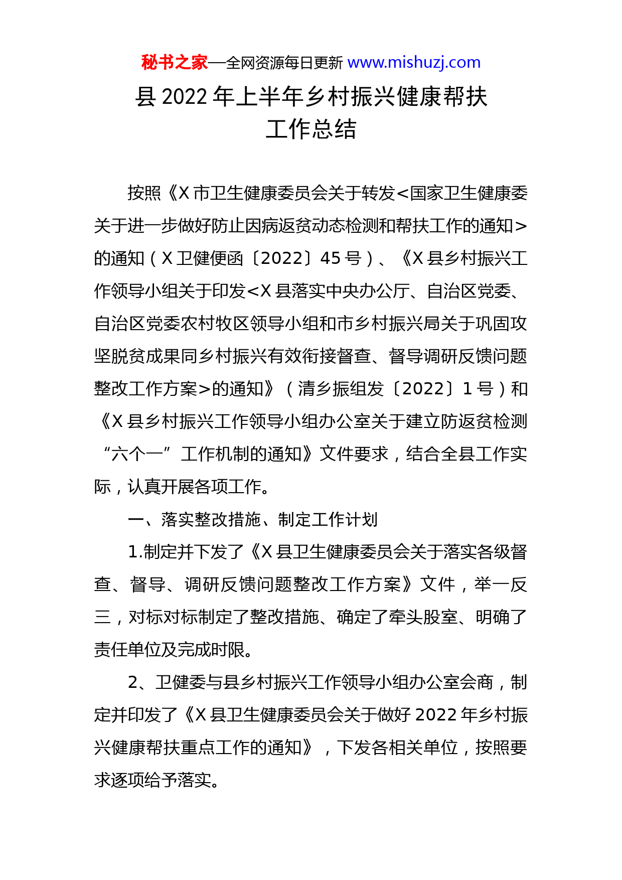 秘书之家—全网资源每日更新www.mishuzj.com县2022年上半年乡村振兴健康帮扶工作总结按照《X市卫生健康委员会关于转发<国家卫生健康委关于进一步做好防止因病返贫动态检测和帮扶工作的通知>的通知(X卫健便函〔2022〕45号)、《X县乡村振兴工作领导小组关于印发的通知》(清乡振组发〔2022〕1号)和《X县乡村振兴工作领导小组办公室关于建立防返贫检测“六个一”工作机制的通知》文件要求,结合全县工作实际,认真开展各项工作。一、落实整改措施、制定工作计划1.制定并下发了《X县卫生健康委员会关于落实各级督查、督导、调研反馈问题整改工作方案》文件,举一反三,对标对标制定了整改措施、确定了牵头股室、明确了责任单位及完成时限。2、卫健委与县乡村振兴工作领导小组办公室会商,制定并印发了《X县卫生健康委员会关于做好2022年乡村振兴健康帮扶重点工作的通知》,下发各相关单位,按照要求逐项给予落实。秘书之家—全网资源每日更新www.mishuzj.com二、加强理论知识学习、确保责任落实卫健委组织党员干部深入学习领会习近平总书记关于巩固拓展脱贫攻坚成果与乡村振兴有效衔接的重要论述精神以及政策措施4次,不断提高党员干部的思想认识,把理论运用到实践中。医疗集团2022年组织召开健康帮扶工作安排部署推进会2次。三、落实工作机制、强化政策落实1、加强30种大病集中救治,提高慢性病管理质量。针对乡村振兴局认定的易返贫致贫重点检测对象,按照“四定两加强”的原则,累计救治大病119人(其中,30种专项大病30人)。累计救治重病3人。累计排查出慢性病患者2378人,其中,高血压1609人、糖尿病211人、严重精神障碍81人、肺结核15人,规范管理率均达到了90%以上。2、持续执行“先诊疗后付费”一站式结算政策,建立因病返贫致贫动态监测和精准帮扶措施。县域内各医疗卫生机构均对乡村振兴局认定的易返贫致贫重点检测对象执行“先诊疗后付费”政策。县医院、县中蒙医院累计“先诊疗后付费”住院一站式结算271人次,对于门诊治疗的防止返贫检测对象,县医院、县中蒙医院、各基层医疗卫生机构均通过通过医保一站式结算平台给予结算,只收取秘书之家—全网资源每日更新www.mishuzj.com个人自付部分。3、积极推进分级诊疗制度建设。为了推进分级诊疗工作,及时印发了《X县医疗集团双向转诊方案》,制定了双向转诊制度,下发了双向转诊流程,与相关单位签订了双向转诊协议。依托医联体、医共体的建立,逐步构建分级、分层、分流的救治机制,基本形成了“村级首诊、乡级复诊、大病进县城、康复回社区”的医疗格局。4、充分利用集团医院人才优势,推进家庭医生团队签约服务工作。由县医院14名西医和中医科专家、乡镇卫生院(社区卫生服务中心)医师和护士、村卫生室(服务站)村医组建了16个县、乡、村三级家庭医生签约服务团队。按照县医院每季度深入基层不低于一次(其中,全年残疾人和卧床不起患者服务率达到100%),乡镇卫生院、社区卫生服务中心入基层不低于每月一次(其中,每季度残疾人和卧床不起患者服务率达到100%),村卫生室、服务站按照随叫随到的原则,进行长期处方、出诊、家庭病床、慢性病随访、老年人管理、妇幼保健、健康教育等履约服务。按照“应签尽签”的原则,签约易返贫致贫重点检测对象7073人,签约率100%。按照“签约一人,履约一人、做实一人”的原则,累计慢性病履约3807人次,帮助代购药品62人次。县医院配合各基层医疗卫生机构对所有脱贫人口和未消除风险边缘易致贫人员、突发秘书之家—全网资源每日更新www.mishuzj.com严重困难户中的高血压、糖尿病患者1820人进行了“两病”认定。5、基层医疗卫生机构财务统一管理,药品(耗材)实行统一采购。县医疗集团建立了统一规划、审核、报销的财务管理机制,有效避免了资源浪费,控制不合理支出。各基层医疗卫生机构药品(耗材、中药饮片)实行统一采购,统一管理,已由医疗集团统一采购9批次,运行良好,有效缓解了药品(耗材)采购困难、品种不全、配送不及时的问题,各基层医疗卫生机构加强了慢性病患者医保目录内用药品种配备,基本能够满足慢性病患者用药需求。6、持续加强“名医工作室”和“中医馆”建设,提高基层服务水平。各基层医疗卫生机构均建立了“名医工作室”和“中医馆”,卫健委统一规划了各基层医疗卫生机构“名医工作室”和“中医馆”的坐诊专家,制定了专家服务补助。累计专家出诊322人次,接诊1448人次,开具处方1017人次。7、加大健康帮扶政策宣传力度。购置了乡村振兴健康帮扶签约服务资料册4000册,对原脱贫攻坚健康扶贫签约服务资料册进行了更换;3月份重新制作并印刷X县乡村振兴健康帮扶政策宣传手册10000份,已经下发各医疗卫生机构,乡村医生通过上门服务的形式,分发到了乡村振兴秘书之家—全网资源每日更新www.mishuzj.com局认定的防止返贫检测户,并进行了解读;有效提高了易返贫致贫重点检测对象对健康帮扶政策了知晓率。四、存在问题一是基层医疗卫生机构专业技术人才短缺,很难破解“招的住、留得下、用的上”的实际问题。二是乡村医生队伍人员老龄化、学历层次不高、服务能力和水平不强等问题依然突出,导致履约服务质量参差不齐。三是医共体建设进度缓慢,各部门协调机制不健