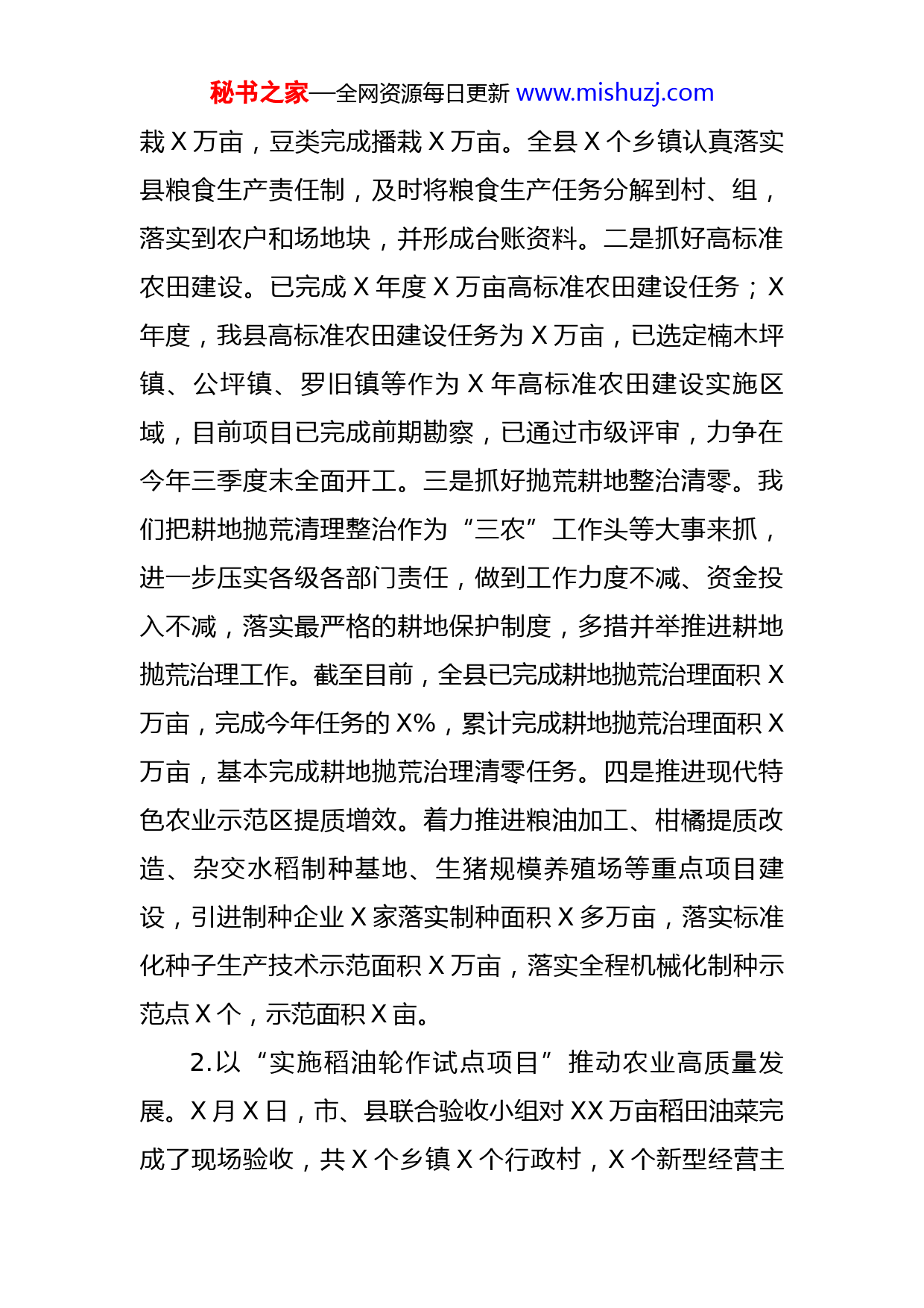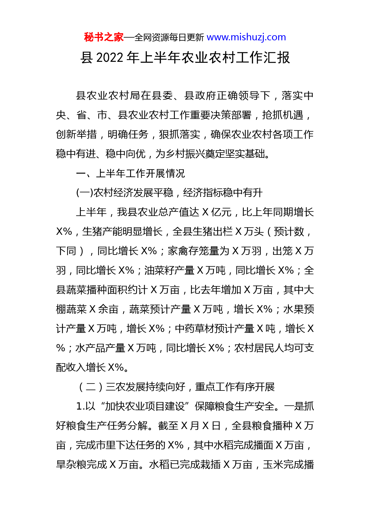 秘书之家—全网资源每日更新www.mishuzj.com县2022年上半年农业农村工作汇报县农业农村局在县委、县政府正确领导下,落实中央、省、市、县农业农村工作重要决策部署,抢抓机遇,创新举措,明确任务,狠抓落实,确保农业农村各项工作稳中有进、稳中向优,为乡村振兴奠定坚实基础。一、上半年工作开展情况(一)农村经济发展平稳,经济指标稳中有升上半年,我县农业总产值达X亿元,比上年同期增长X%,生猪产能明显增长,全县生猪出栏X万头(预计数,下同),同比增长X%;家禽存笼量为X万羽,出笼X万羽,同比增长X%;油菜籽产量X万吨,同比增长X%;全县蔬菜播种面积约计X万亩,比去年增加X万亩,其中大棚蔬菜X余亩,蔬菜预计产量X万吨,增长X%;水果预计产量X万吨,增长X%;中药草材预计产量X吨,增长X%;水产品产量X万吨,同比增长X%;农村居民人均可支配收入增长X%。(二)三农发展持续向好,重点工作有序开展1.以“加快农业项目建设”保障粮食生产安全。一是抓好粮食生产任务分解。截至X月X日,全县粮食播种X万亩,完成市里下达任务的X%,其中水稻完成播面X万亩,旱杂粮完成X万亩。水稻已完成栽插X万亩,玉米完成播秘书之家—全网资源每日更新www.mishuzj.com栽X万亩,豆类完成播栽X万亩。全县X个乡镇认真落实县粮食生产责任制,及时将粮食生产任务分解到村、组,落实到农户和场地块,并形成台账资料。二是抓好高标准农田建设。已完成X年度X万亩高标准农田建设任务;X年度,我县高标准农田建设任务为X万亩,已选定楠木坪镇、公坪镇、罗旧镇等作为X年高标准农田建设实施区域,目前项目已完成前期勘察,已通过市级评审,力争在今年三季度末全面开工。三是抓好抛荒耕地整治清零。我们把耕地抛荒清理整治作为“三农”工作头等大事来抓,进一步压实各级各部门责任,做到工作力度不减、资金投入不减,落实最严格的耕地保护制度,多措并举推进耕地抛荒治理工作。截至目前,全县已完成耕地抛荒治理面积X万亩,完成今年任务的X%,累计完成耕地抛荒治理面积X万亩,基本完成耕地抛荒治理清零任务。四是推进现代特色农业示范区提质增效。着力推进粮油加工、柑橘提质改造、杂交水稻制种基地、生猪规模养殖场等重点项目建设,引进制种企业X家落实制种面积X多万亩,落实标准化种子生产技术示范面积X万亩,落实全程机械化制种示范点X个,示范面积X亩。2.以“实施稻油轮作试点项目”推动农业高质量发展。X月X日,市、县联合验收小组对XX万亩稻田油菜完成了现场验收,共X个乡镇X个行政村,X个新型经营主秘书之家—全网资源每日更新www.mishuzj.com体,项目实施新增稻田油菜面积X万余亩,亩产值X元(按每公斤菜籽X元计),每亩增加纯收入X元,实现了亩均增加纯收入X元以上的目标。3.以“化肥减量问题整改”促进生态绿色发展。贯彻落实全省、全市化肥减量问题整改培训班会议精神、《X省贯彻落实第二轮中央生态环境保护督察通报化肥减量问题整改工作方案》(湘突环改发〔X〕X号)和《X市贯彻落实第二轮中央生态环境保护督察报告整改方案》(怀发电〔X〕X号)等文件精神,围绕“对化肥减量工作部署推进不力”、“农业面源污染管控不力”和“化肥减量数据‘两张皮’”等X个问题着力推进整改。X月X日-X日,县委县政府联合督查组对乡镇化肥减量问题整改情况进行了专项督查,有力推进了工作开展,确保了省市下达的化肥农药减量增效各项技术措施落实,完成各项工作目标。4.以“‘点、线、面’结合”提升农村人居环境整治品质。以“一拆二改三清四化”为总抓手,大力实施“千村美丽、万村整治”和“个十百千”工程,按照市委“六无一全”的要求,着力推进“五治”行动,坚决打赢乡村振兴首胜之仗。一是突出“点”上抓示范。目前正在重点打造公坪镇长泥坪村、罗旧镇曹家坪村、岩桥镇槐花园村、X镇白溪坪村和蚂蝗塘村、洞下场乡古尧村等一批精品示范村,为全县农村人居环境整治工作塑典型、树标杆。二是秘书之家—全网资源每日更新www.mishuzj.com突出“线”上抓特色。紧密结合县域经济发展和区域特色,依托“一线(国道)一圈(县城周边)一中心(集镇)”的规划布局,重点打造五条乡村振兴、人居环境整治提升亮点精品线路:三道坑镇生态旅游线,突出“生态之旅”,彰显区域特色;唯楚酒庄——X镇沙湾村产业园线,突出“农产品加工体验”,彰显城效田园特色;X镇小溪——白溪坪村——洞下场乡古尧村农业产业线,突出“农耕之旅”,彰显产业特色;岩桥镇——罗旧镇——公坪镇国道工业园区线,突出“创业之旅”,彰显创业功能特色;大树坳产业旅游线,突出“民宿采摘之旅”,彰显民族文化特色。三是突出“面”上抓长效。X将机制建设作为农村人居环境整治的关键,通过完善村规民约和门前“三包”制度,引导村民自发开展村庄清洁整治,推进村庄清洁行动常态化、制度化、持续化。5.以“开展农业行政执法‘湘剑’护农行动”守牢农业生产安全底线。聚焦农产品质量安全、品种权保护、农资质量等重点领域,突出农资经营集散地、农村和城乡接合部等重点对象,开展农资打假专项行动、畜禽产品质量安全专项行动、渔政执法行动、农业机械执法行动、宅基地执法行动五大行动。X年上半年共出动执法检查车辆X车次、执法人员X人次,检查农业投入品生产和经营门店X家次,责令整改X