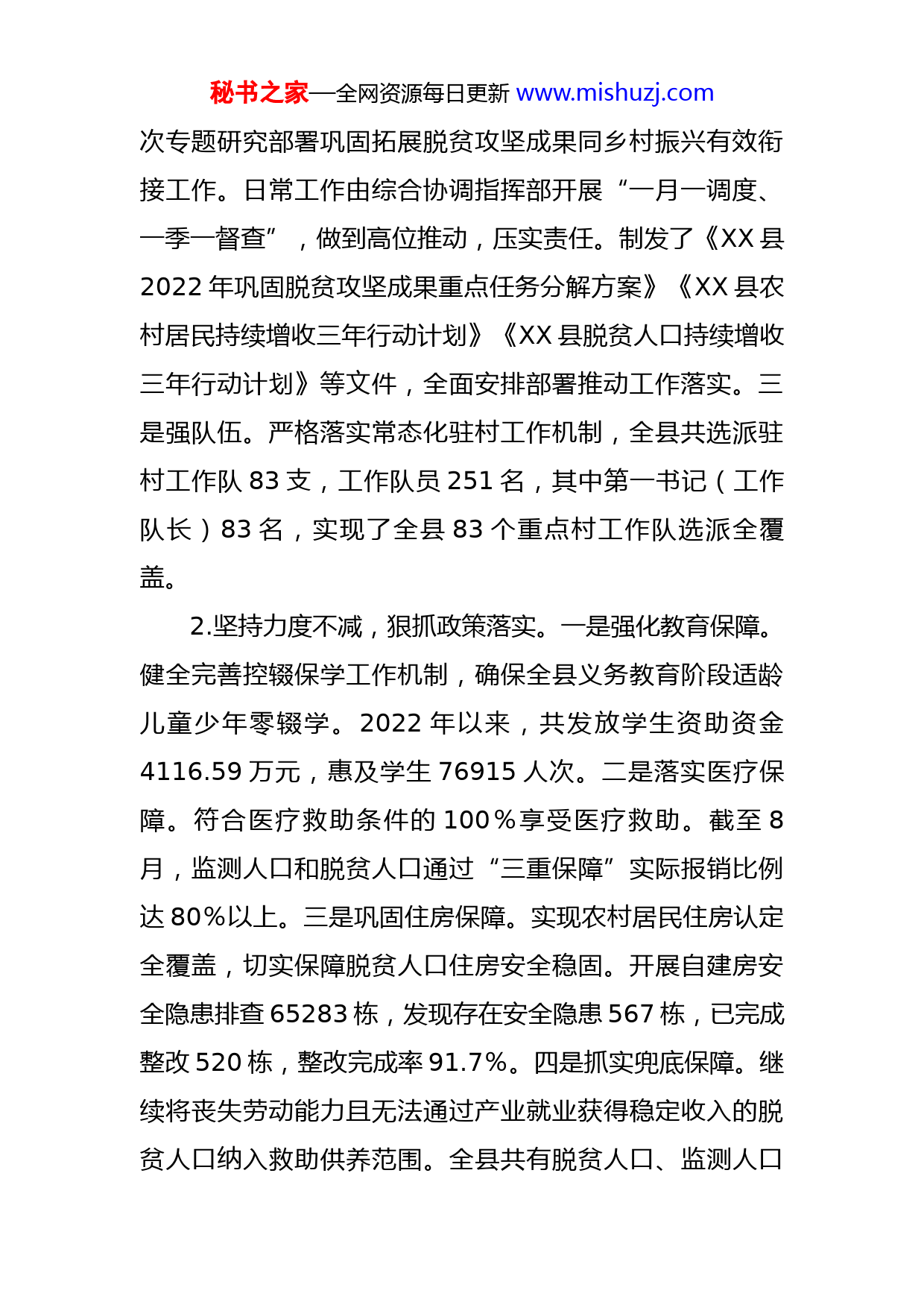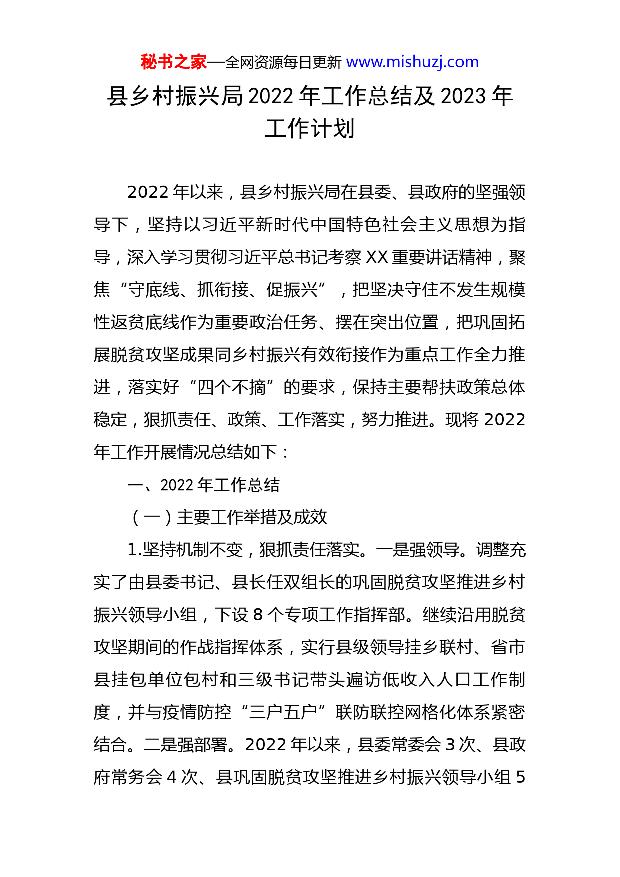 秘书之家—全网资源每日更新www.mishuzj.com县乡村振兴局2022年工作总结及2023年工作计划2022年以来,县乡村振兴局在县委、县政府的坚强领导下,坚持以习近平新时代中国特色社会主义思想为指导,深入学习贯彻习近平总书记考察XX重要讲话精神,聚焦“守底线、抓衔接、促振兴”,把坚决守住不发生规模性返贫底线作为重要政治任务、摆在突出位置,把巩固拓展脱贫攻坚成果同乡村振兴有效衔接作为重点工作全力推进,落实好“四个不摘”的要求,保持主要帮扶政策总体稳定,狠抓责任、政策、工作落实,努力推进。现将2022年工作开展情况总结如下:一、2022年工作总结(一)主要工作举措及成效1.坚持机制不变,狠抓责任落实。一是强领导。调整充实了由县委书记、县长任双组长的巩固脱贫攻坚推进乡村振兴领导小组,下设8个专项工作指挥部。继续沿用脱贫攻坚期间的作战指挥体系,实行县级领导挂乡联村、省市县挂包单位包村和三级书记带头遍访低收入人口工作制度,并与疫情防控“三户五户”联防联控网格化体系紧密结合。二是强部署。2022年以来,县委常委会3次、县政府常务会4次、县巩固脱贫攻坚推进乡村振兴领导小组5秘书之家—全网资源每日更新www.mishuzj.com次专题研究部署巩固拓展脱贫攻坚成果同乡村振兴有效衔接工作。日常工作由综合协调指挥部开展“一月一调度、一季一督查”,做到高位推动,压实责任。制发了《XX县2022年巩固脱贫攻坚成果重点任务分解方案》《XX县农村居民持续增收三年行动计划》《XX县脱贫人口持续增收三年行动计划》等文件,全面安排部署推动工作落实。三是强队伍。严格落实常态化驻村工作机制,全县共选派驻村工作队83支,工作队员251名,其中第一书记(工作队长)83名,实现了全县83个重点村工作队选派全覆盖。2.坚持力度不减,狠抓政策落实。一是强化教育保障。健全完善控辍保学工作机制,确保全县义务教育阶段适龄儿童少年零辍学。2022年以来,共发放学生资助资金4116.59万元,惠及学生76915人次。二是落实医疗保障。符合医疗救助条件的100%享受医疗救助。截至8月,监测人口和脱贫人口通过“三重保障”实际报销比例达80%以上。三是巩固住房保障。实现农村居民住房认定全覆盖,切实保障脱贫人口住房安全稳固。开展自建房安全隐患排查65283栋,发现存在安全隐患567栋,已完成整改520栋,整改完成率91.7%。四是抓实兜底保障。继续将丧失劳动能力且无法通过产业就业获得稳定收入的脱贫人口纳入救助供养范围。全县共有脱贫人口、监测人口秘书之家—全网资源每日更新www.mishuzj.com67642人,其中纳入低保等政策兜底保障10613人。五是确保饮水安全。巩固维护好已建成农村供水工程成果,保障脱贫人口、脱贫村饮水安全,城乡居民已全部实现供水入户,农村饮水管网入户率达100%,现行标准下集中供水率达86.87%,农村自来水普及率达97.1%。3.防止返贫动态监测和帮扶工作开展情况。健全防返贫动态监测机制,常态化开展防止返贫动态监测,确保监测全面精准。截至目前,全县纳入全国防返贫监测信息系统监测对象2768户9829人,已消除风险1737户6686人,未消除风险1031户3143人。脱贫户及监测对象中,人均年收入7000元以下94户328人,7000—10000元共1902户8129人。对排查出来的监测对象,及时制定“一户一方案”,落实帮扶措施,跟进帮扶成效。3.产业发展情况。不断巩固提升“两烟”、甘蔗、蔬菜、咖啡、茶叶、水果、肉牛、XX黄山羊等传统产业。积极培植石斛特色产业,全县石斛种植面积达3.6万亩,实现石斛鲜条产量7500吨,实现产业链产值47亿元,紫皮石斛种植面积及产量占全国的70%以上。81个村(社区)1.6万户6.5万人从事石斛产业,占全县总人口的21.25%,其中覆盖脱贫户5000余户2万余人。XX被列为2022年度XX省“一县一业”中药材产业(石斛)特色县,正在申报“一县一业”示范县,石斛产业已成为XX巩秘书之家—全网资源每日更新www.mishuzj.com固拓展脱贫攻坚成果和推进乡村振兴的支柱产业。2022年争取各级财政衔接资金12576.45万元(其中,中央衔接资金9437.13万元,省级衔接资金2720.5万元,市级衔接资金418.82万元),规划实施项目98个,重点用于促进产业发展的基础设施建设、种养殖业及发展壮大村集体经济。同时,建立稳定的利益联结机制,实现产业帮扶全覆盖,全县有产业发展条件及意愿的脱贫户和“三类对象”“双绑”率分别达96.49%、96.25%,全县种养殖产业共覆盖农户73334户次,其中脱贫户20657户次。农民专业合作社健康有序发展,截至目前,全县登记在册的农民专业合作社396个,注册资金3.65亿元,入社社员7.26万人,覆盖全部乡镇和行政村。4.稳岗就业促收入情况。一是不断加大就业政策宣传力度,抓实转移就业培训,做好就业精准帮扶,推动农村劳动力大规模、高质量转移就业。全县农村劳动力转移就业122758人次,其中脱贫劳动力转移就业23369人次;开展农村劳动力培训31826人次,其中脱贫劳动力培训9592人次。充分发挥创业担保贷款扶持创业的作用,鼓励创业带动就业。全县发放创业担保贷款511户,金额9786万元,带动就业1332人。大力开发就近就地就业岗位,全县开发乡村公益性岗位2357个,带动脱贫劳动力就近就地就业2357人。二是持续扶持搬迁人口就业。搬迁脱秘书之家—全网资源每日更新www.mishuzj.com贫户户均享受2项以上产业扶贫政策支持,带动搬迁农户户