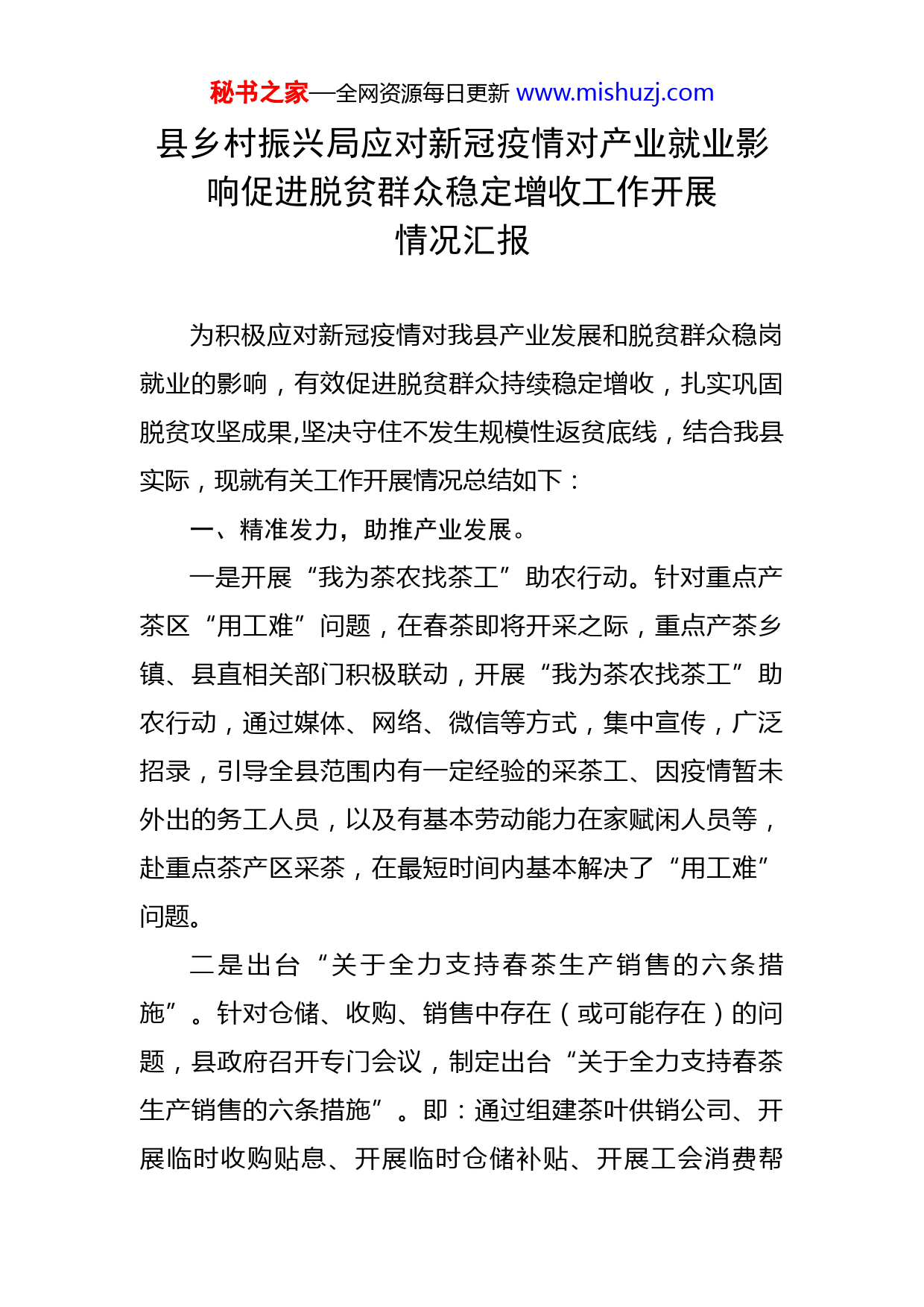 秘书之家—全网资源每日更新www.mishuzj.com县乡村振兴局应对新冠疫情对产业就业影响促进脱贫群众稳定增收工作开展情况汇报为积极应对新冠疫情对我县产业发展和脱贫群众稳岗就业的影响,有效促进脱贫群众持续稳定增收,扎实巩固脱贫攻坚成果,坚决守住不发生规模性返贫底线,结合我县实际,现就有关工作开展情况总结如下:一、精准发力,助推产业发展。一是开展“我为茶农找茶工”助农行动。针对重点产茶区“用工难”问题,在春茶即将开采之际,重点产茶乡镇、县直相关部门积极联动,开展“我为茶农找茶工”助农行动,通过媒体、网络、微信等方式,集中宣传,广泛招录,引导全县范围内有一定经验的采茶工、因疫情暂未外出的务工人员,以及有基本劳动能力在家赋闲人员等,赴重点茶产区采茶,在最短时间内基本解决了“用工难”问题。二是出台“关于全力支持春茶生产销售的六条措施”。针对仓储、收购、销售中存在(或可能存在)的问题,县政府召开专门会议,制定出台“关于全力支持春茶生产销售的六条措施”。即:通过组建茶叶供销公司、开展临时收购贴息、开展临时仓储补贴、开展工会消费帮秘书之家—全网资源每日更新www.mishuzj.com扶、倡议社会消费帮扶、组织各类推介活动等措施,全力解决我县春茶在仓储、收购、销售中存在困难和问题。三是开展“春茶采买消费助农”活动。由县乡村振兴局牵头,联合县财政、农业农村、工商联、总工会以及邮政公司等单位和部门,动员全县广大干部职工、市民群众,以办公采购、工会福利采购、群体团购和个人购买、邮政代购等方式,积极采购我县产茶区茶农、茶企,特别是脱贫村、脱贫户、监测对象以及低收入家庭茶产品,助力茶企销售,茶农增收。截至目前,全县累计帮助脱贫户、监测对象销售春茶达X余斤,销售额超X万元。四是线上线下并重促销。在全面推进线下促销、助销路径的同时,着力做好我县茶产品线上助销活动,通过直播带货平台、电商销售等方式,大力宣传我县优质特色茶产品,不断拓展市场份额,拓宽销售渠道。同时,结合茶旅文化宣传,待疫情防控形势缓解,旅游景点恢复运营后,整合我县茶产品资源进驻旅游区域,通过旅游业带动茶产品销售,进一步促进茶农增收。综上举措,受新冠疫情影响,今年我县农户茶产业总体产量较去年虽有下降,但降幅不到X%。除自驾上门采购数相对减少外,其他采购渠道基本畅通,影响也不是很明显,随着疫情防控形势的进一步趋缓向好,销售渠道的不断解链拓展,“销售难”问题将很快得到解决。秘书之家—全网资源每日更新www.mishuzj.com二、多措并举,强化稳岗就业。一是广泛开展技能培训。年初就开展农民工职业技能培训摸底工作,累计摸排出有相应需求、有培训意愿者X余人,目前已开班培训X人。下一步将加强职业培训券的宣传工作,落实电子社保卡培训券的申领,根据疫情情况,积极组织线上培训,确保每周开班到达X人以上,根据上级脱贫人口培训任务适时组织开展脱贫人口技能培训工作。二是适时发放就业帮扶补贴。X年1-8月共发放就业帮扶补贴X元。其中公益性岗位补贴,共X人次,合计X元。发放X年度公益性岗位人身意外保险补贴,共X人,合计X元。X年度致富带头人一次性创业补助,共X人,发放X元。三是推进脱贫人口及边缘人口稳岗就业。加大对脱贫人口和边缘人口的摸排力度,对务工需求进行分类统计,针对就近就地就业、返岗、外出务工等不同要求采取不同帮扶措施。将调查内容建立完善基础台账,为做好就业服务工作提供第一手资料,截至目前我县脱贫劳动力务工X人,其中跨省务工X人,省内县外务工X人,县内务工X人。四是强化就业帮扶车间监管。目前我县实有就业帮扶车间X家,X,共吸纳就业X人,其中带动脱贫人口就业X秘书之家—全网资源每日更新www.mishuzj.com人,带贫率为X%。根据车间运营情况按程序对X镇X村和X镇X村汽车配件就业帮扶车间取消认定的报告进行审核,分别于X年X月X日和X年X月X日联合相关部门下发取消认定该就业帮扶车间的通知,为保持我县就业帮扶车间的整体规模,带动脱贫人口就业,X年拟增加认定X个就业帮扶车间,现各乡镇正在摸排调研。五是规范乡村公益性岗位监管。截至目前共有在岗公益性岗位X人,其中护林员X人,护路员X人,保洁员X人,护水(河)员X人,保安X人,其他岗位X人。因存在自然减员、退出等情况,乡村公益性岗位的稳定性不够。我县坚持实行动态管理,进一步明确和规范岗位开发管理等相关事项,完善就业帮扶系统内乡村公益岗位的台账信息,确保系统准确性。联合开展乡村公益性岗位核查工作,适量开发增加岗位数,力求我县乡村公益性岗位整体规模不下降。三、强化帮扶,务求帮扶实效。一是强化金融帮扶。坚持引导省级以下财政衔接资金优先支持因疫情影响茶产业发展,公益性岗位开发,经营主体增产增收、稳岗就业,民企、商会、社会组织等采购农特产品以及“稳产业、稳就业、稳收入”项目等。规范推广“一自三合”模式,加大推进小额信贷力度,做到应贷尽贷,截至目前完成X万元,惠及X户脱贫户及监测对秘书之家—全网资源每日更新www.mishuzj.com象,其中当年新增X万元,惠及X户脱贫户及监测对象。二是强化监测帮扶。结合正在开展的防返贫监测帮扶集中排查工作,督促村级组织、驻村工作队、网格员以及帮