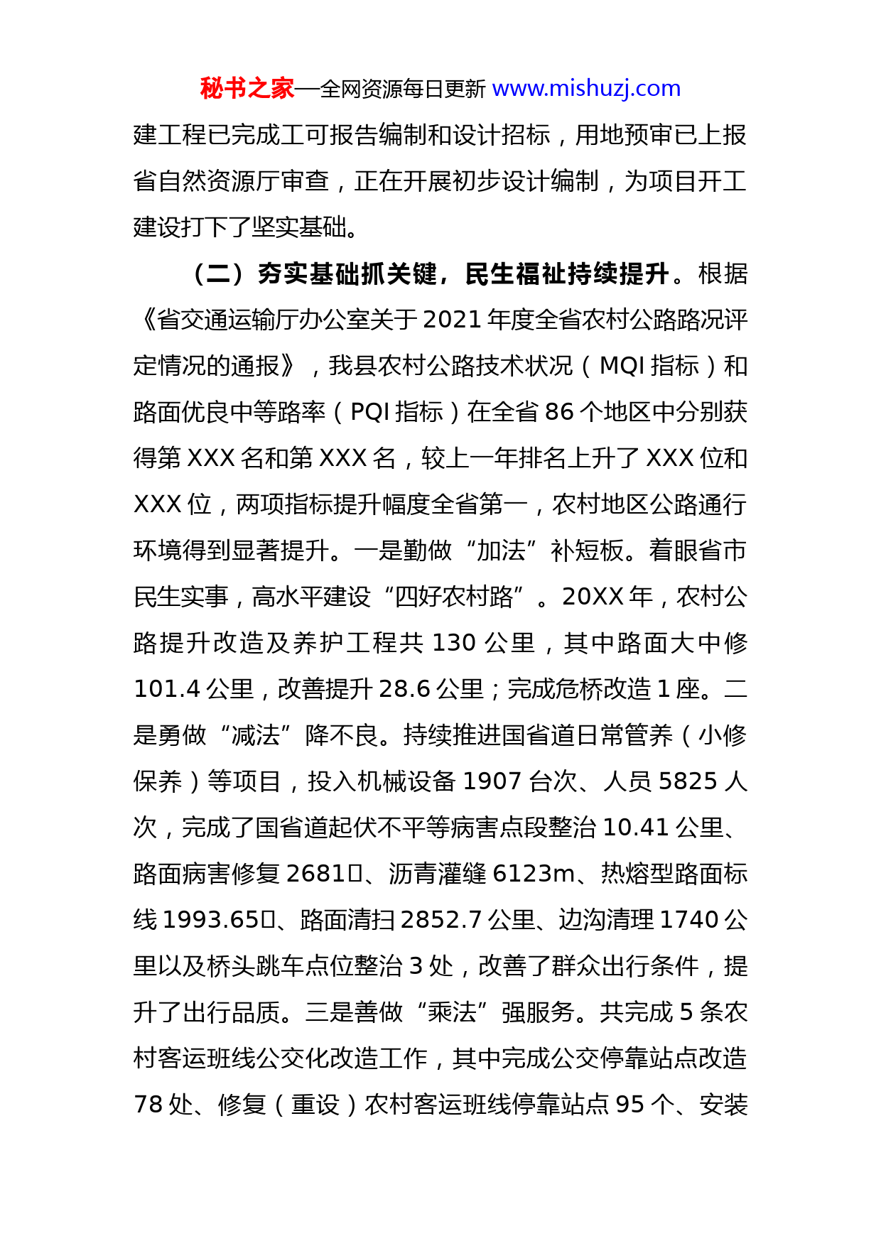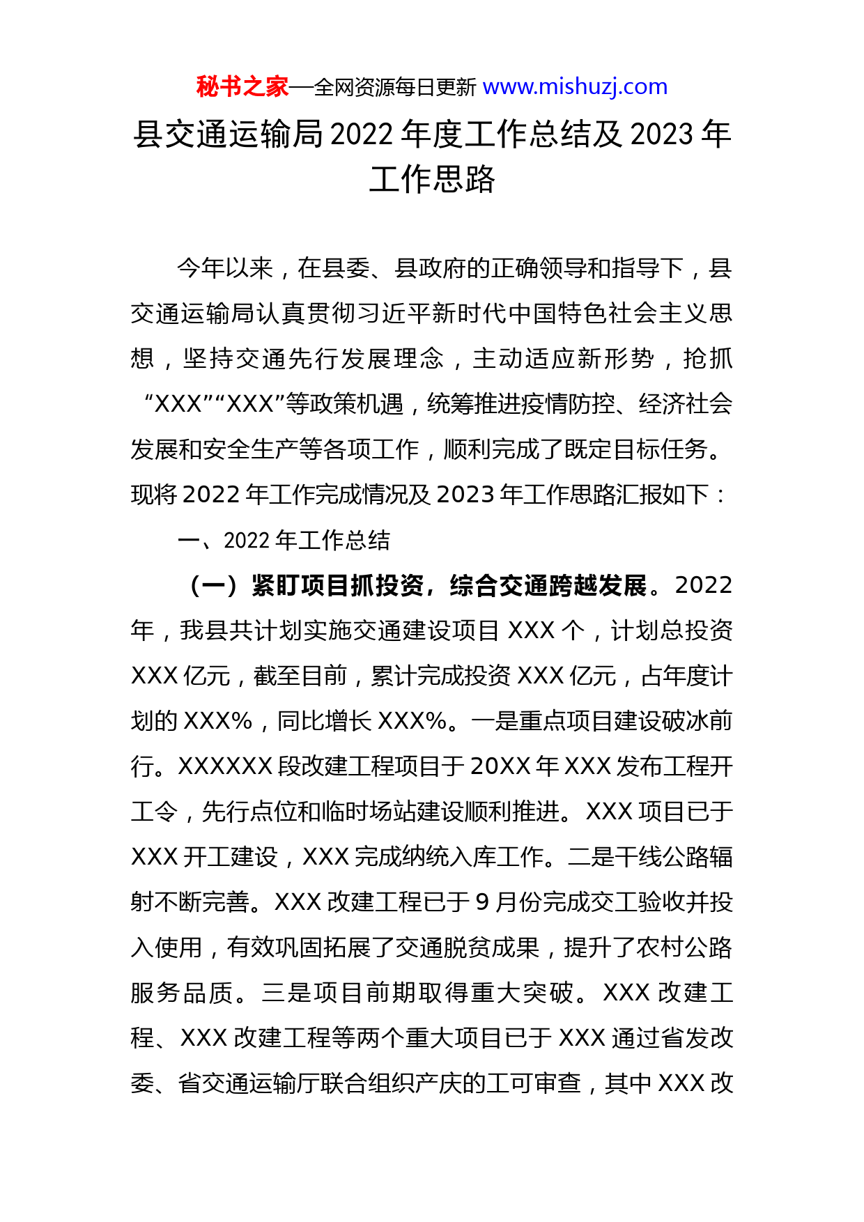 秘书之家—全网资源每日更新www.mishuzj.com县交通运输局2022年度工作总结及2023年工作思路今年以来,在县委、县政府的正确领导和指导下,县交通运输局认真贯彻习近平新时代中国特色社会主义思想,坚持交通先行发展理念,主动适应新形势,抢抓“XXX”“XXX”等政策机遇,统筹推进疫情防控、经济社会发展和安全生产等各项工作,顺利完成了既定目标任务。现将2022年工作完成情况及2023年工作思路汇报如下:一、2022年工作总结(一)紧盯项目抓投资,综合交通跨越发展。2022年,我县共计划实施交通建设项目XXX个,计划总投资XXX亿元,截至目前,累计完成投资XXX亿元,占年度计划的XXX%,同比增长XXX%。一是重点项目建设破冰前行。XXXXXX段改建工程项目于20XX年XXX发布工程开工令,先行点位和临时场站建设顺利推进。XXX项目已于XXX开工建设,XXX完成纳统入库工作。二是干线公路辐射不断完善。XXX改建工程已于9月份完成交工验收并投入使用,有效巩固拓展了交通脱贫成果,提升了农村公路服务品质。三是项目前期取得重大突破。XXX改建工程、XXX改建工程等两个重大项目已于XXX通过省发改委、省交通运输厅联合组织产庆的工可审查,其中XXX改秘书之家—全网资源每日更新www.mishuzj.com建工程已完成工可报告编制和设计招标,用地预审已上报省自然资源厅审查,正在开展初步设计编制,为项目开工建设打下了坚实基础。(二)夯实基础抓关键,民生福祉持续提升。根据《省交通运输厅办公室关于2021年度全省农村公路路况评定情况的通报》,我县农村公路技术状况(MQI指标)和路面优良中等路率(PQI指标)在全省86个地区中分别获得第XXX名和第XXX名,较上一年排名上升了XXX位和XXX位,两项指标提升幅度全省第一,农村地区公路通行环境得到显著提升。一是勤做“加法”补短板。着眼省市民生实事,高水平建设“四好农村路”。20XX年,农村公路提升改造及养护工程共130公里,其中路面大中修101.4公里,改善提升28.6公里;完成危桥改造1座。二是勇做“减法”降不良。持续推进国省道日常管养(小修保养)等项目,投入机械设备1907台次、人员5825人次,完成了国省道起伏不平等病害点段整治10.41公里、路面病害修复2681㎡、沥青灌缝6123m、热熔型路面标线1993.65㎡、路面清扫2852.7公里、边沟清理1740公里以及桥头跳车点位整治3处,改善了群众出行条件,提升了出行品质。三是善做“乘法”强服务。共完成5条农村客运班线公交化改造工作,其中完成公交停靠站点改造78处、修复(重设)农村客运班线停靠站点95个、安装秘书之家—全网资源每日更新www.mishuzj.com刷卡设备12辆、优化公交线路3条。相比去年,我县城乡公交一体化率从2021年底的26.76%提升至59.15%,进一步推进城乡客运一体化改造工作,为群众出行提供优质的运输服务。(三)聚焦监督抓管理,行业治理显著增强。一是平安交通建设统筹发展。圆满完成“春运”“三防”“两会”“节假日”等重点时段安全监管工作,深刻吸取XX郑州7·20特大暴雨灾害事故教训,全面加强安全生产风险隐患排查治理。截至目前,共出动人员169人次,检查企业10家次,船舶121艘次,发现整改隐患17处。二是交通运输执法强势亮剑。坚持以智能化、数字化技术赋能交通执法,利用治超非现场执法设备、“浙运安”危货运输智控平台、水上交通应急指挥平台等,推动交通执法由“大海捞针”式的“粗放型”执法模式,向“定点清除”式的“精准化”执法模式转型,实现执法效能质和量的双提升。截至目前,共出动交通执法人员2410人次,出动执法车780车次,检查车船1430辆(艘)次。共受理案件54件(办结案件53件,未办结1件案件正在走法律程序),治超处理违法案件数84件,共处罚人民币145776元。三是整体智治改革初见成效。结合“大综合一体化”改革,推动交通运输执法力量进一步向一线下沉,构建“金字塔型”队伍体系。目前,共赋权乡镇(街道)事项14个,锁定秘书之家—全网资源每日更新www.mishuzj.com11名执法人员、3名辅助执法人员进行“实时下沉”,共开展“综合查一次”10次,办理赋权乡镇(街道)权力事项案件2件。四是主题教育宣传深入人心。以安全生产宣传教育“七进”和“安全生产月”等活动为载体,深入群众宣传交通安全知识,全行业共组织各种安全宣传活动49次,发放各类宣传资料1660余份,现场解答咨询1500余人次,举办安全、法制教育培训10场,组织观看安全警示教育片7场;以专项整治行动为契机,以“扫黑除恶”等工作为抓手,在运输企业、客货站场、公路沿线等地出动宣传车3台,悬挂横幅44条,张贴公告标语400余份,发放扫黑除恶宣传资料500余份。五是基础矛盾纠纷有效化解。以“事要解决”为核心,以信访案件“攻坚清零”为抓手,全力推动信访积案化解。截至目前,共受理信访举报99件,办结率100%,真正做到“件件有着落、事事有回音”,确保了交通运输行业的和谐与稳定。(四)立足职能抓保障,疫情防控有序推进。严格贯彻落实上级各项疫情防控措施,压紧压实工作责任,全力守好疫情防控阵地。一是加固防控一线,强化交通查控。自3月17日起,我局积极响应疫情联防联控工作机制,迅速安排部署工作人员,联合公安、卫健等多部门在XXX县城出入口、XXX东出入口、XXX入口等服务点开展交通查控工作,采取24小时轮守制,对来XXX车辆进行逐车逐秘书之家—全网资源每日更新www.mishuzj.com人检查