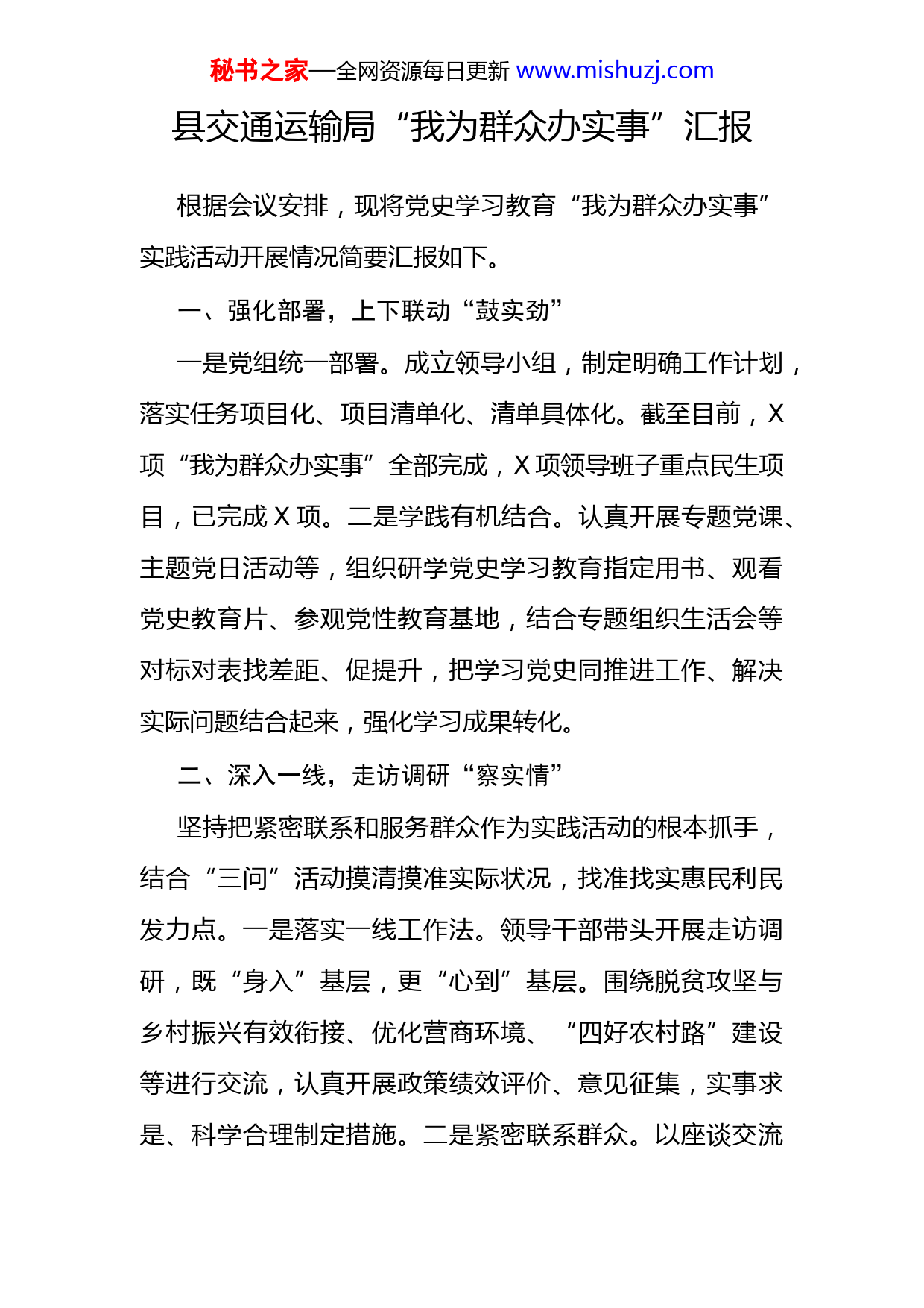 秘书之家—全网资源每日更新www.mishuzj.com县交通运输局“我为群众办实事”汇报根据会议安排,现将党史学习教育“我为群众办实事”实践活动开展情况简要汇报如下。一、强化部署,上下联动“鼓实劲”一是党组统一部署。成立领导小组,制定明确工作计划,落实任务项目化、项目清单化、清单具体化。截至目前,X项“我为群众办实事”全部完成,X项领导班子重点民生项目,已完成X项。二是学践有机结合。认真开展专题党课、主题党日活动等,组织研学党史学习教育指定用书、观看党史教育片、参观党性教育基地,结合专题组织生活会等对标对表找差距、促提升,把学习党史同推进工作、解决实际问题结合起来,强化学习成果转化。二、深入一线,走访调研“察实情”坚持把紧密联系和服务群众作为实践活动的根本抓手,结合“三问”活动摸清摸准实际状况,找准找实惠民利民发力点。一是落实一线工作法。领导干部带头开展走访调研,既“身入”基层,更“心到”基层。围绕脱贫攻坚与乡村振兴有效衔接、优化营商环境、“四好农村路”建设等进行交流,认真开展政策绩效评价、意见征集,实事求是、科学合理制定措施。二是紧密联系群众。以座谈交流秘书之家—全网资源每日更新www.mishuzj.com问卷调查、民意征集等方式听取民声,提高群众参与度,及时公布民生事项进展情况,主动接受群众监督,做到群众意见有回应、群众困难有措施,切实为群众办实事、办好事。三、聚焦问题,靶向施策“出实招”一是结合优化营商环境,助企纾困减负,投资xx余万元实施客运站升级改造项目。修复客运站破损严重的站前广场、停车场等,增设进站口无障碍通道,新增候车大厅电子显示屏、空调、排风扇,更换候车大厅座椅等。二是结合全面乡村振兴,以项目建设为抓手,持续打造“畅、安、舒、美”的公路通行环境,投资xxx万元实施农村公路养护项目XX项,总里程xx公里,投资xxx万元实施生命安全防护工程X项,总里程xxx公里里,共惠及X个乡镇、X个村。三是结合生态环保,深入农村牧区走访调研,针对xx村小油路部分涵洞破损严重,给群众通行、草牧场浇灌和公益林林生态保护造成影响这一问题,投入资金x万余元对破损涵洞、路面进行整修更换,对促进村生态、社会、经济发展起到积极作用。四是结合“干部基层办实事、部门包联惠民生、村企结对共建促振兴”活动,立足帮联村实际,充分发挥我局职能优势,为xx村小油路安装秘书之家—全网资源每日更新www.mishuzj.com安全警示设施,排除安全隐患,调集工程机械清理村河道X公里,清理废旧地膜等白色垃圾X次,共X千余平米。四、创新提升,服务便民“见实效”一是投资xxx万元实施“优化公交线路,改善群众出行条件”民生实事项目,优化x条公交线路,新建站牌xx块。二是聚焦群众反映强烈的操心事、烦心事、揪心事,立足岗位职责做贡献,投入资金xx余万元,对“街长制”非机动车道破损地面进行修复,累积修复面积约xxx余平米。对xx社区XXX平米拆迁空地进行平整、清理,为xx小区安装路灯照明设施和垃圾箱,积极改善社区环境卫生和居住环境。三是深化“放管服”改革,打造便民服务平台。交通运输政务服务和行政审批事项全部实现窗口办理,积极开展行政事项“三减一优”工作,所有审批事项减环节压缩比率为XXX%,减时间压缩比率为XX%,即办件比率为XXXX%,截至目前,窗口累计办件量XXX件,按时办结率XXX%,群众满意度XXX%。四是积极践行以人民为中心的发展思想,组织开展“我帮你”新时代文明实践志愿服务活动X次,设立志愿服务点X处,服务群众XXX余人次。通过一系列活动,进一步激发了广大党员争当先锋模范的工作热情,将为群众做好事、办实事、解难事落到秘书之家—全网资源每日更新www.mishuzj.com实处,为全面加强实干型、服务型基层党组织建设提供了保障。在总结成绩的同时,我们也清醒认识到一些工作同上级要求和群众期盼仍有差距,还存在创新不足、亮点不够等问题,为群众办的实事、好事还不够多。下一步,我局将认真贯彻落实本次会议精神,突出“实”字继续抓好“我为群众办实事”工作,强化对各项目的组织、协调、推动、落实,不断巩固扩大党史学习教育成效,以工作实绩回应民众期盼,以更大作为、更大决心为我县经济社会高质量发展贡献力量。