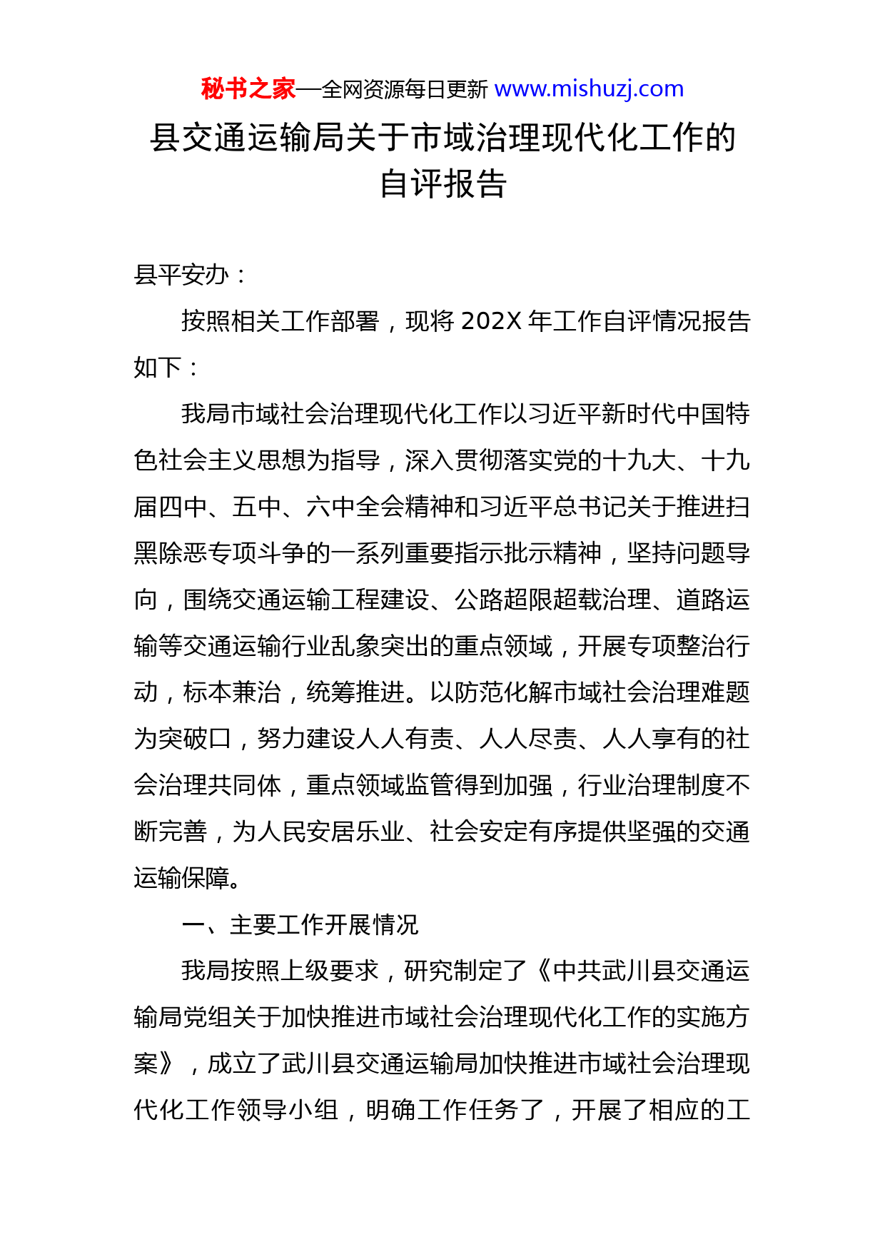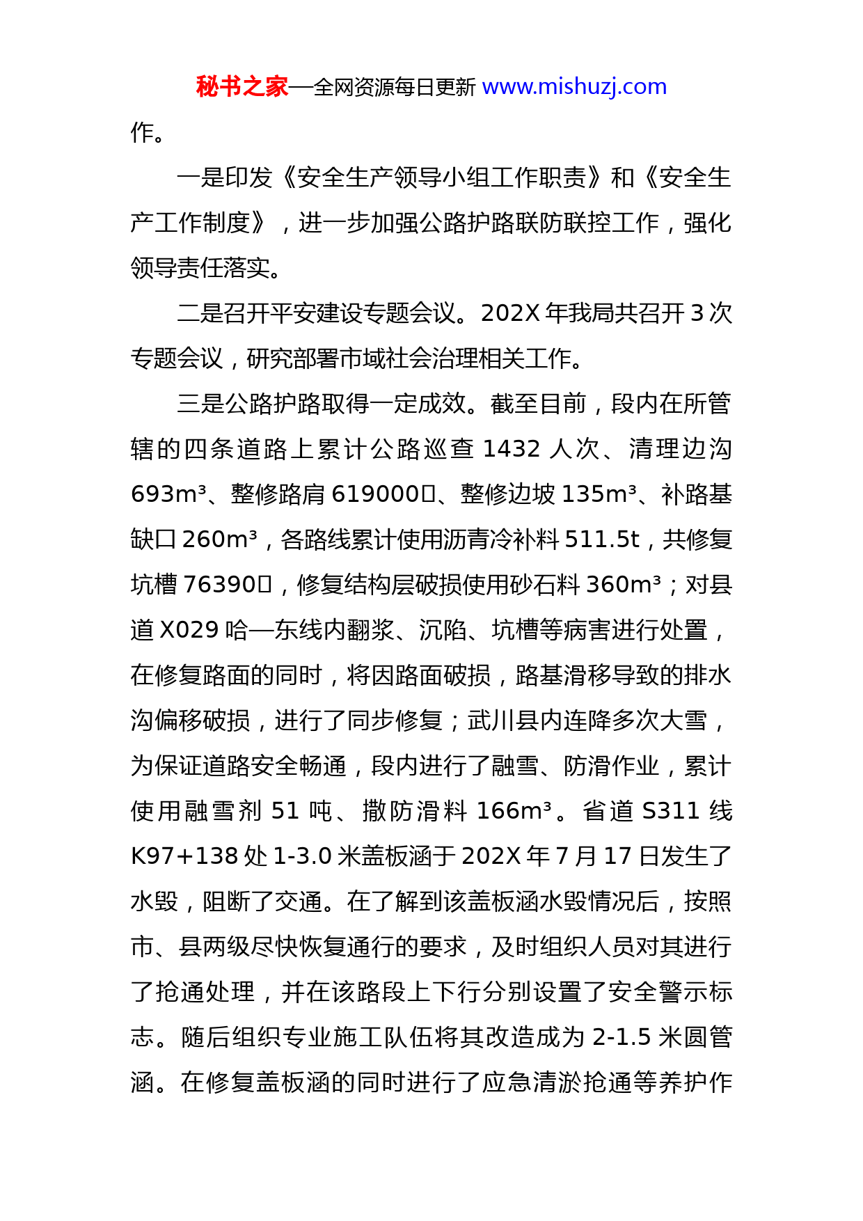 秘书之家—全网资源每日更新www.mishuzj.com县交通运输局关于市域治理现代化工作的自评报告县平安办:按照相关工作部署,现将202X年工作自评情况报告如下:我局市域社会治理现代化工作以习近平新时代中国特色社会主义思想为指导,深入贯彻落实党的十九大、十九届四中、五中、六中全会精神和习近平总书记关于推进扫黑除恶专项斗争的一系列重要指示批示精神,坚持问题导向,围绕交通运输工程建设、公路超限超载治理、道路运输等交通运输行业乱象突出的重点领域,开展专项整治行动,标本兼治,统筹推进。以防范化解市域社会治理难题为突破口,努力建设人人有责、人人尽责、人人享有的社会治理共同体,重点领域监管得到加强,行业治理制度不断完善,为人民安居乐业、社会安定有序提供坚强的交通运输保障。一、主要工作开展情况我局按照上级要求,研究制定了《中共武川县交通运输局党组关于加快推进市域社会治理现代化工作的实施方案》,成立了武川县交通运输局加快推进市域社会治理现代化工作领导小组,明确工作任务了,开展了相应的工秘书之家—全网资源每日更新www.mishuzj.com作。一是印发《安全生产领导小组工作职责》和《安全生产工作制度》,进一步加强公路护路联防联控工作,强化领导责任落实。二是召开平安建设专题会议。202X年我局共召开3次专题会议,研究部署市域社会治理相关工作。三是公路护路取得一定成效。截至目前,段内在所管辖的四条道路上累计公路巡查1432人次、清理边沟693m³、整修路肩619000㎡、整修边坡135m³、补路基缺口260m³,各路线累计使用沥青冷补料511.5t,共修复坑槽76390㎡,修复结构层破损使用砂石料360m³;对县道X029哈—东线内翻浆、沉陷、坑槽等病害进行处置,在修复路面的同时,将因路面破损,路基滑移导致的排水沟偏移破损,进行了同步修复;武川县内连降多次大雪,为保证道路安全畅通,段内进行了融雪、防滑作业,累计使用融雪剂51吨、撒防滑料166m³。省道S311线K97+138处1-3.0米盖板涵于202X年7月17日发生了水毁,阻断了交通。在了解到该盖板涵水毁情况后,按照市、县两级尽快恢复通行的要求,及时组织人员对其进行了抢通处理,并在该路段上下行分别设置了安全警示标志。随后组织专业施工队伍将其改造成为2-1.5米圆管涵。在修复盖板涵的同时进行了应急清淤抢通等养护作秘书之家—全网资源每日更新www.mishuzj.com业,其中省道S311线、县道X030线多次发生道路淤砂导致交通不畅情况,段内累计投入装载机、翻斗车20台班,出动约30人次,累计清理淤砂252m³。按照上级部门指示,为了保证公路行车安全,段内在省道S311线上共安装减速带5道,各类安全标志20块。四是为全面深入学习宣传贯彻新《中华人民共和国安全生产法》。为进一步增强全局的安全生产意识,全面落实“安全第一、预防为主、综合治理”的安全生产工作方针,我局于9月14日上午在局三楼会议室组织全体干部职工集中学习新《安全生产法》。五是为进一步加强交通保护联防联控,我局在清明节期间印发《关于做好清明节期间交通运输安全工作的通知》(〔202X〕—35),对交通安全防范工作的进行安排部署;制定了《“国庆节”期间交通输安全生产工作方案》(武交发〔202X〕111号)、《关于武川县国防交通战备应急情况道路运输保障预案》(武交发〔202X〕140号)、制定了《武川县交通运输安全生产大检查工作方案》(武交发〔202X〕45号)等一系列工作方案。六是制定了公路巡查制度和计划,进一步加强我局农村公路养护、路政及安全管理工作,提高农村公路管养水平,保障农村公路安全畅通。七是加大巡查公路力度。公路段、建养中心按时对公秘书之家—全网资源每日更新www.mishuzj.com路进行巡查并对存在的隐患进行消除。寄递物流安全管理工作并不在我局相关职能职责范围之内。二、存在问题一是今年气候反常,道路水毁较多较频繁,道路安全隐患增多,排查整改压力大,特别是汛期;二是由于交通事业单位改革,原武川县运管局已撤销、人员撤回,而新成立的交通综合行政执法大队人员由地方海事管理中心划转,现划转7人从事局机关办公室、财务室、农村公路建养中心等工作。因此,只能作督查、排查,无法进行道路安全执法,为进一步从事好道路运输安全等相关工作,充实执法队伍,又从公路段借调9人至综合行政执法大队。三是运输企业交通安全防范意识还有待提高。三、下一步工作思路一是对治超工作进行认真总结,分析梳理,防漏补缺。深化治理阶段相关工作,正确履行好交通运输领域执法管理职责。二是促进联动机制,密切部门配合,形成齐抓共管,群防群治。特别是要与交警部门密切协作,对超限超载行为进行严厉打击,确保治超工作真正落实到位。三是大力推进全县交通运输行业治理体系和治理能力秘书之家—全网资源每日更新www.mishuzj.com现代化,着力建设人民满意交通。坚持建设管理双管齐下、新旧业态融合发展,主动适应群众多样化、个性化需求,大力发展绿色交通,完善联程联运的运输服务体系,真正实现“人便其行、货畅其流”。要压实安全责任,强化隐患排查,对交通运输领域的“顽瘴痼疾”一件一件地抓,一抓到底、抓出成效。特此报告