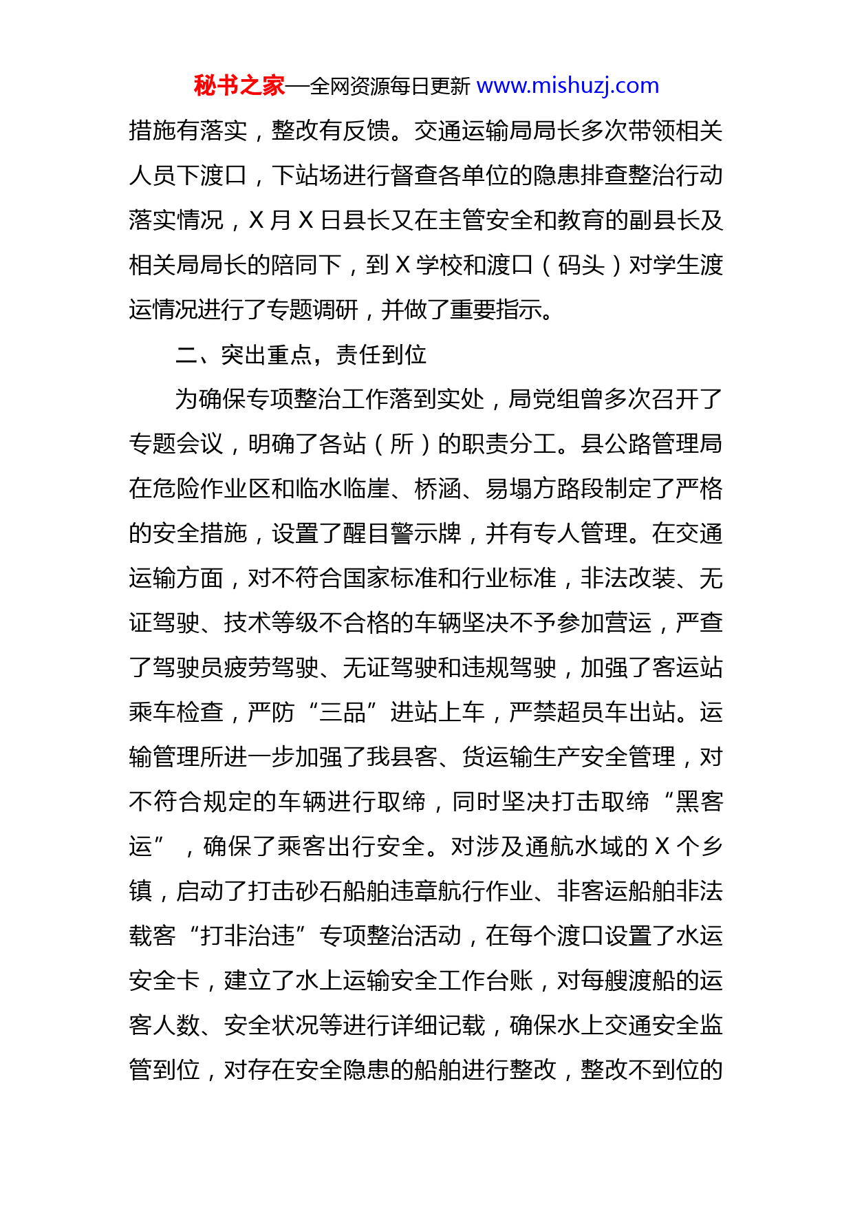 秘书之家—全网资源每日更新www.mishuzj.com县交通运输局水陆交通安全专项整治工作情况汇报我局根据……等文件精神和要求,自隐患排查专项整治启动以来,全面开展了水陆交通运输安全生产隐患排查专项整治工作,在县政府的统一领导和各相关职能部门的配合下,围绕道路秩序明显好转,临水临崖、交通事故频发路段和水上交通运输隐患得到有效治理,交通事故总量明显下降的目标,通过狠抓各项整治措施的落实,取得了阶段性的战果,全县水陆交通运输安全形势稳定,重特大交通事故为零,现将我县水陆交通运输安全生产隐患排查整治工作情况汇报如下:一、领导重视,组织到位为了确保我县水陆交通运输安全生产隐患排查专项整治工作有序推进,进一步加强对水陆交通运输安全生产隐患排查专项整治工作的领导,统一协调和指挥专项整治工作,局及时成立交通运输安全生产隐患排查专项整治活动领导小组。组长由X局长担任,分管安全工作的副局长任副组长,局X股和各站(所)负责人为组员,设立了交通安全专项整治工作领导小组办公室,负责此项工作的督导检查和协调工作。为了使隐患排查专项整治工作顺利开展,局制定下发了……,做到了时间有安排,整治有步骤,秘书之家—全网资源每日更新www.mishuzj.com措施有落实,整改有反馈。交通运输局局长多次带领相关人员下渡口,下站场进行督查各单位的隐患排查整治行动落实情况,X月X日县长又在主管安全和教育的副县长及相关局局长的陪同下,到X学校和渡口(码头)对学生渡运情况进行了专题调研,并做了重要指示。二、突出重点,责任到位为确保专项整治工作落到实处,局党组曾多次召开了专题会议,明确了各站(所)的职责分工。县公路管理局在危险作业区和临水临崖、桥涵、易塌方路段制定了严格的安全措施,设置了醒目警示牌,并有专人管理。在交通运输方面,对不符合国家标准和行业标准,非法改装、无证驾驶、技术等级不合格的车辆坚决不予参加营运,严查了驾驶员疲劳驾驶、无证驾驶和违规驾驶,加强了客运站乘车检查,严防“三品”进站上车,严禁超员车出站。运输管理所进一步加强了我县客、货运输生产安全管理,对不符合规定的车辆进行取缔,同时坚决打击取缔“黑客运”,确保了乘客出行安全。对涉及通航水域的X个乡镇,启动了打击砂石船舶违章航行作业、非客运船舶非法载客“打非治违”专项整治活动,在每个渡口设置了水运安全卡,建立了水上运输安全工作台账,对每艘渡船的运客人数、安全状况等进行详细记载,确保水上交通安全监管到位,对存在安全隐患的船舶进行整改,整改不到位的秘书之家—全网资源每日更新www.mishuzj.com渡口、渡船进行了通报批评。为了加强学生的渡运安全,会同教育局,交警队等部门研究制定了学生安全渡运工作方案,并提交县人民政府常务会研究讨论。三、注重宣传,认识到位为了提高交通系统安全管理人员和从业人员的安全意识,防止产生麻痹松懈思想,局长亲自组织召开了安全会议,分析安全形势,及时传达上级安全生产有关规定,通报安全生产情况及各类事故典型案例,重点通报了X事故。同时加大了安全宣传力度,发放了安全宣传材料,并在运管所、客运站,渡口(码头)、学校门口等显要位置设立安全教育宣传栏,宣传有关法律法规、交通安全生产知识,做到交通安全家喻户晓,人人皆知,形成全社会“关注安全,关爱生命”的安全理念,创造了良好的交通安全环境,营造了浓厚的舆论宣传氛围。四、及时排查,整改到位根据我县山区道路线长面广、坡陡路险和水路线长点多的特点,局安全运输监督股在局分管领导的带领下,组织公路、运管、质监、海事等部门对临水临崖、危险路面、桥涵、易塌方路段、客运站场和水陆交通进行了全面排查,共排查隐患X处,并以增强交通、客运安全意识,消除水陆运输安全隐患为目的,在进行专项整治行动的同时,加大了宣传打击力度,这次行动中,在重点路段、重秘书之家—全网资源每日更新www.mishuzj.com要场所等对交通安全隐患进行了综合治理,严厉打击了“黑车”、“三无”船舶的非法载客的嚣张气焰,进一步完善了安全隐患台账,建立了联合排查整治长效机制,形成了严格规范的交通安全生产法治秩序,有效遏制和防范了重特大交通事故发生,切实维护了人民群众生命财产安全,促进了全县安全生产形势持续稳定发展,取得了很好的效果。五、下阶段工作打算下阶段,我们将在前段工作成效的基础上,把抓好水陆交通安全作为实现全县交通安全生产形势稳定的重要内容,采取更加扎实有效的措施,认真抓好水陆交通运输安全监管工作,努力遏制和预防交通事故的发生,确保全年工作目标的实现,我们将做好以下几方面的工作:一是进一步加强对乡镇道路急弯、陡坡、桥梁等行车危险路段的治理,抓紧完善农村公路交通安全。二是深入开展交通安全宣传教育,积极拓宽交通安全宣传阵地,尤其要以农民、学生、运输企业驾驶人为重点,有针对性的制定宣传方案,增强宣传实效。三是切实加强对水陆交通秩序的动态管控,严厉查处超限、超载、疲劳驾驶、非法载客、违规运输危险化学物品等容易导致重特大交通事故的违法行为。四是严格落实运输企业责任制,对那些安全生产责任不落实、不注重管理教育、违法营运的交通运输企业,责秘书之家—全