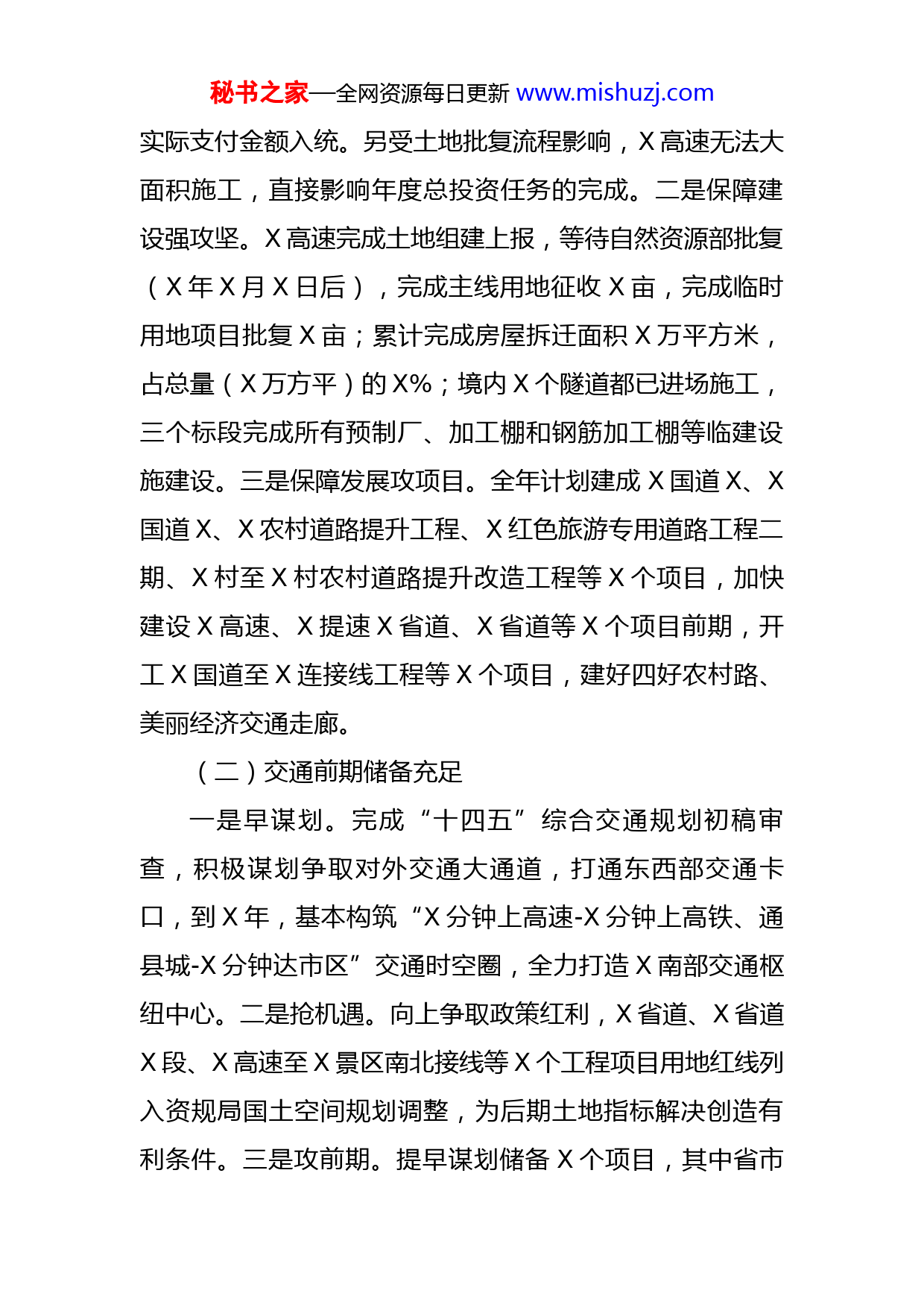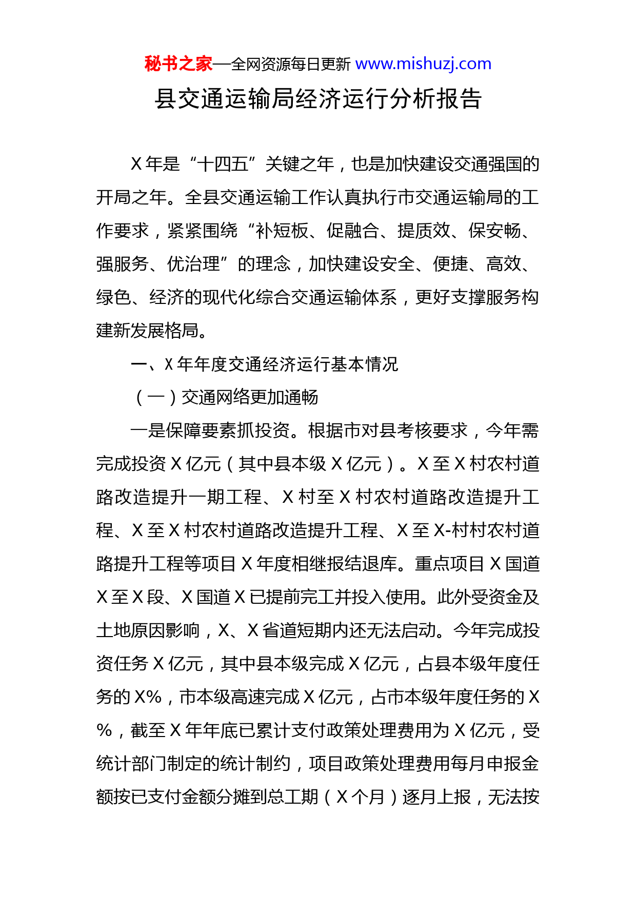 秘书之家—全网资源每日更新www.mishuzj.com县交通运输局经济运行分析报告X年是“十四五”关键之年,也是加快建设交通强国的开局之年。全县交通运输工作认真执行市交通运输局的工作要求,紧紧围绕“补短板、促融合、提质效、保安畅、强服务、优治理”的理念,加快建设安全、便捷、高效、绿色、经济的现代化综合交通运输体系,更好支撑服务构建新发展格局。一、X年年度交通经济运行基本情况(一)交通网络更加通畅一是保障要素抓投资。根据市对县考核要求,今年需完成投资X亿元(其中县本级X亿元)。X至X村农村道路改造提升一期工程、X村至X村农村道路改造提升工程、X至X村农村道路改造提升工程、X至X-村村农村道路提升工程等项目X年度相继报结退库。重点项目X国道X至X段、X国道X已提前完工并投入使用。此外受资金及土地原因影响,X、X省道短期内还无法启动。今年完成投资任务X亿元,其中县本级完成X亿元,占县本级年度任务的X%,市本级高速完成X亿元,占市本级年度任务的X%,截至X年年底已累计支付政策处理费用为X亿元,受统计部门制定的统计制约,项目政策处理费用每月申报金额按已支付金额分摊到总工期(X个月)逐月上报,无法按秘书之家—全网资源每日更新www.mishuzj.com实际支付金额入统。另受土地批复流程影响,X高速无法大面积施工,直接影响年度总投资任务的完成。二是保障建设强攻坚。X高速完成土地组建上报,等待自然资源部批复(X年X月X日后),完成主线用地征收X亩,完成临时用地项目批复X亩;累计完成房屋拆迁面积X万平方米,占总量(X万方平)的X%;境内X个隧道都已进场施工,三个标段完成所有预制厂、加工棚和钢筋加工棚等临建设施建设。三是保障发展攻项目。全年计划建成X国道X、X国道X、X农村道路提升工程、X红色旅游专用道路工程二期、X村至X村农村道路提升改造工程等X个项目,加快建设X高速、X提速X省道、X省道等X个项目前期,开工X国道至X连接线工程等X个项目,建好四好农村路、美丽经济交通走廊。(二)交通前期储备充足一是早谋划。完成“十四五”综合交通规划初稿审查,积极谋划争取对外交通大通道,打通东西部交通卡口,到X年,基本构筑“X分钟上高速-X分钟上高铁、通县城-X分钟达市区”交通时空圈,全力打造X南部交通枢纽中心。二是抢机遇。向上争取政策红利,X省道、X省道X段、X高速至X景区南北接线等X个工程项目用地红线列入资规局国土空间规划调整,为后期土地指标解决创造有利条件。三是攻前期。提早谋划储备X个项目,其中省市秘书之家—全网资源每日更新www.mishuzj.com级层面完成X高速拓宽改建工程工可审查;X省道、X省道X段施工图文本优化工作;县级层面完成X至X建设规模调整报批工作,完成施工招投标;完成X至X景区南、北接线工程施工图设计及审查工作、项目建议书批复、完成环境影响评估报告审查、社会风险评估报告已批复;完成X连接线施工图批复工作,已开工建设;完成X新建工程初步设计审查及批复、施工图审查批复工作,已开工建设;完成X建设工程、X建设工程工可编制及审查工作,完成勘察设计招标工作;完成X景区道路工程初步设计审查及报批、启动设计施工总承包招投标工作;同时有序推进X至X国道西过境连接线工程等X个项目前期工作。(三)交通服务水平再提升一是交通运量值再提升。截至X年X月底,累计道路客运量X万人次、道路货运量X万吨、水路客运量X万人次、港口吞吐量X万吨,除道路客运量与去年相持平外,其余运量较去年有所增长。二是交通出行便捷度再提升。为更好增加居民交通出行便捷度,提升交通服务水平,我局完成X堵点整治,新建城市道路X公里,建成停车位X个,新增优化公交班线X条,完成率X%,投运新能源公交车X辆,完成率X%,新建智能公交电子站牌X块,完成率X%,新建改造城市公交停靠站X个,完成率X%。另外为进一步提高公交出行吸引力,提高群众出行满意度,采秘书之家—全网资源每日更新www.mishuzj.com用“线上+线下”运营模式,开通微公交线路X条,进一步提升人们出行体验。三是交通服务智慧度再提升。推进智慧公交系统开发,系统基础数据录入、安全、经营机务及OA等功能已经基本开发完成,并于X年X月中旬正式投入使用。解决出租车运输证、人员资格证多部门联审联办问题,达成事项网络办理一条龙服务,提升市民满意度。(四)平安交通扎实推进一是狠抓春运工作安全。X年春运期间,完成旅客运输量X万人,客运周转量X万人公里,同比X年春运,旅客运量上升X%,客运周转量下降X%。二是狠抓道路运输安全。深入开展交通建设安全专项整治、危化品专项整治等专项行动,严抓道路运输秩序。截至X月底,全年共出动执法人员X人次,共办结案件X件,其中一般程序案件X件,非现场执法X件。严抓危货车运输工作,保障道路运输安全。建成危货运输车辆公共停车场X个,普通公路超限率控制在X%以下,X年度全市治超工作考核排名第一。淘汰卧铺车辆X辆、X座以上客车X辆,完成X条X公里以上班线清理和评估工作。坚持红线意识和底线思维,着力强化安全监管,截至X月底,未发生安全生产事故,安全形势基本稳定。三是狠抓疫情防控安全。牵头全县防疫工作,筑牢疫情防控防线,组织开展疫情防控应急演练。为保障疫情期间人员流动安全和冷链食品安全,在客运、物秘书之家—全网资源每日更新www.mishuzj.com